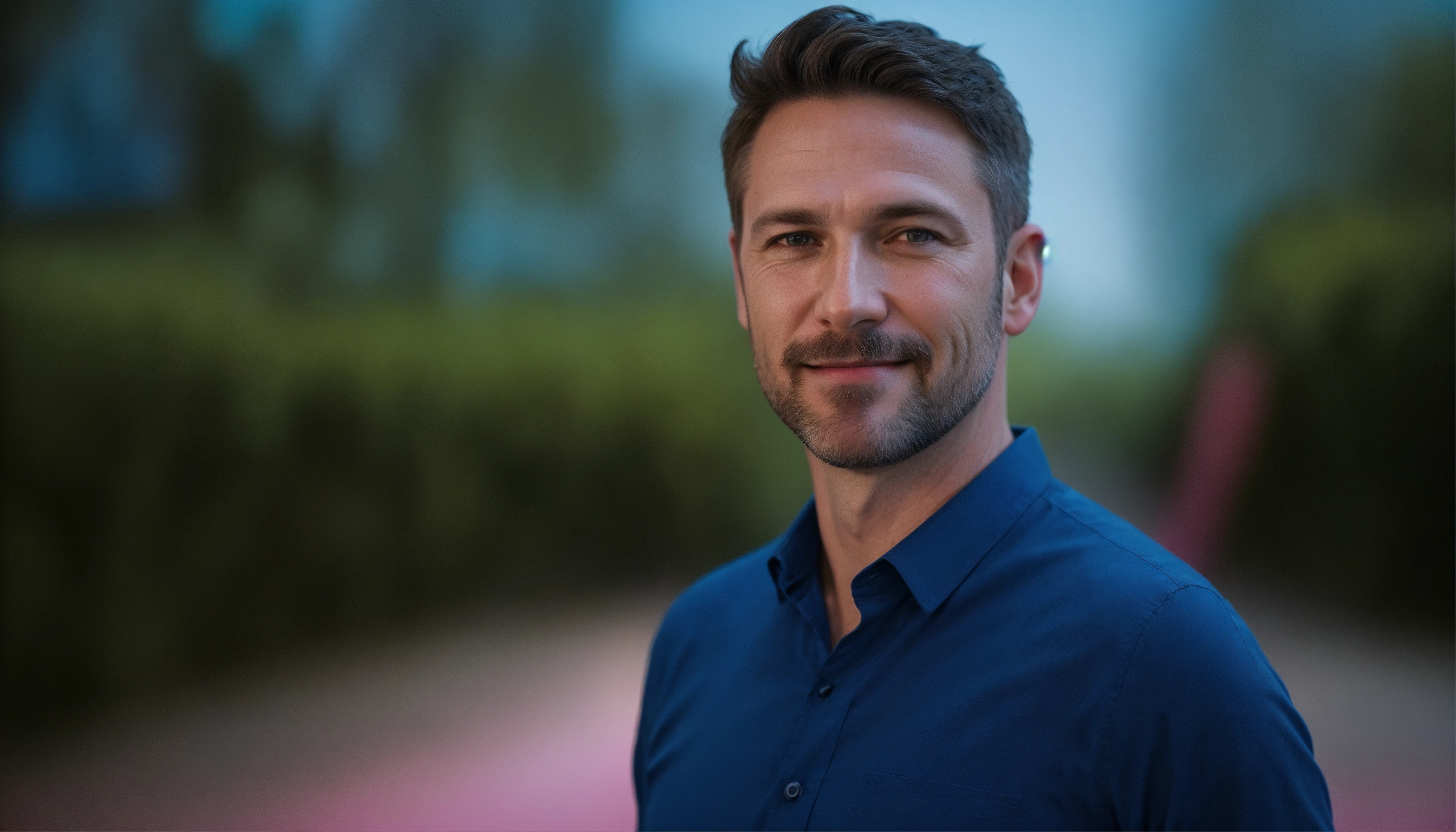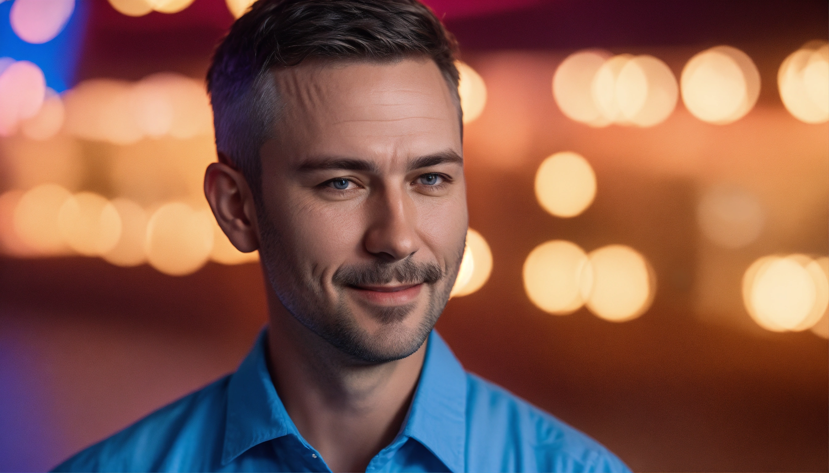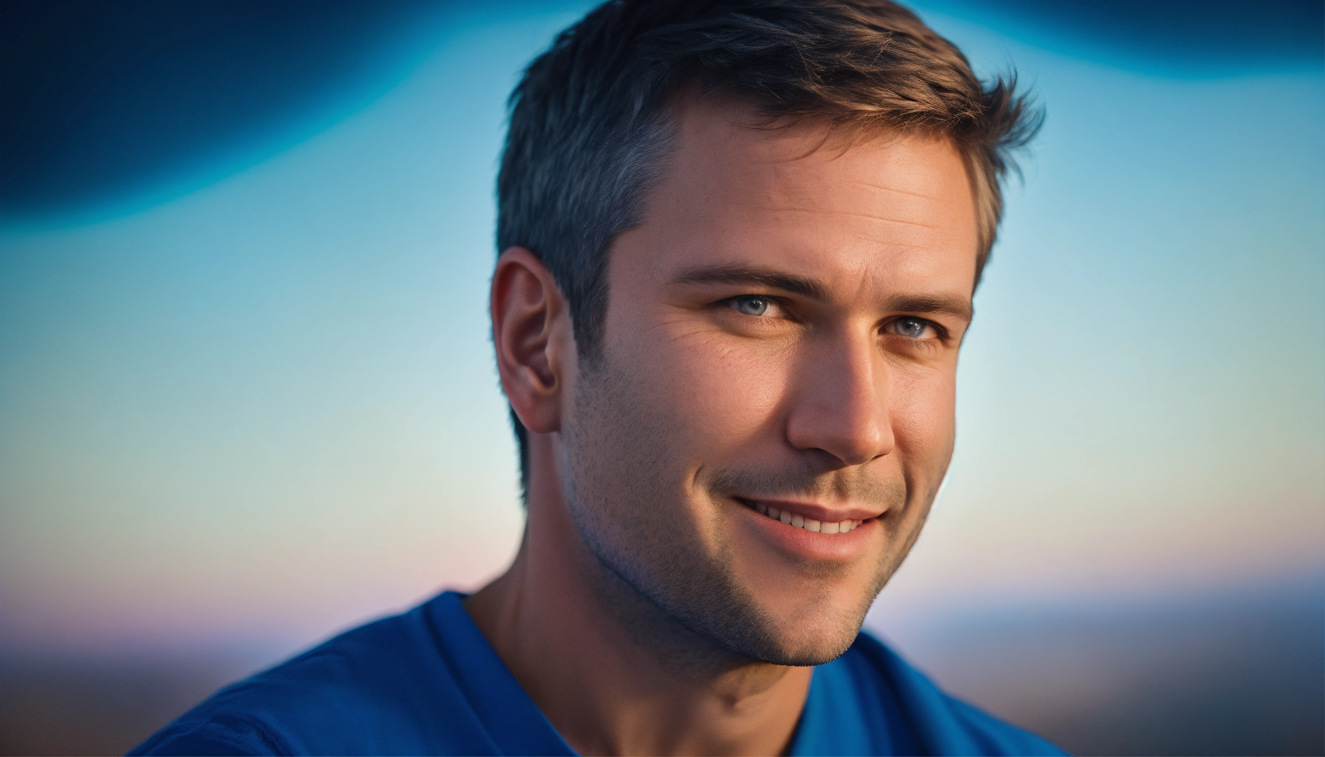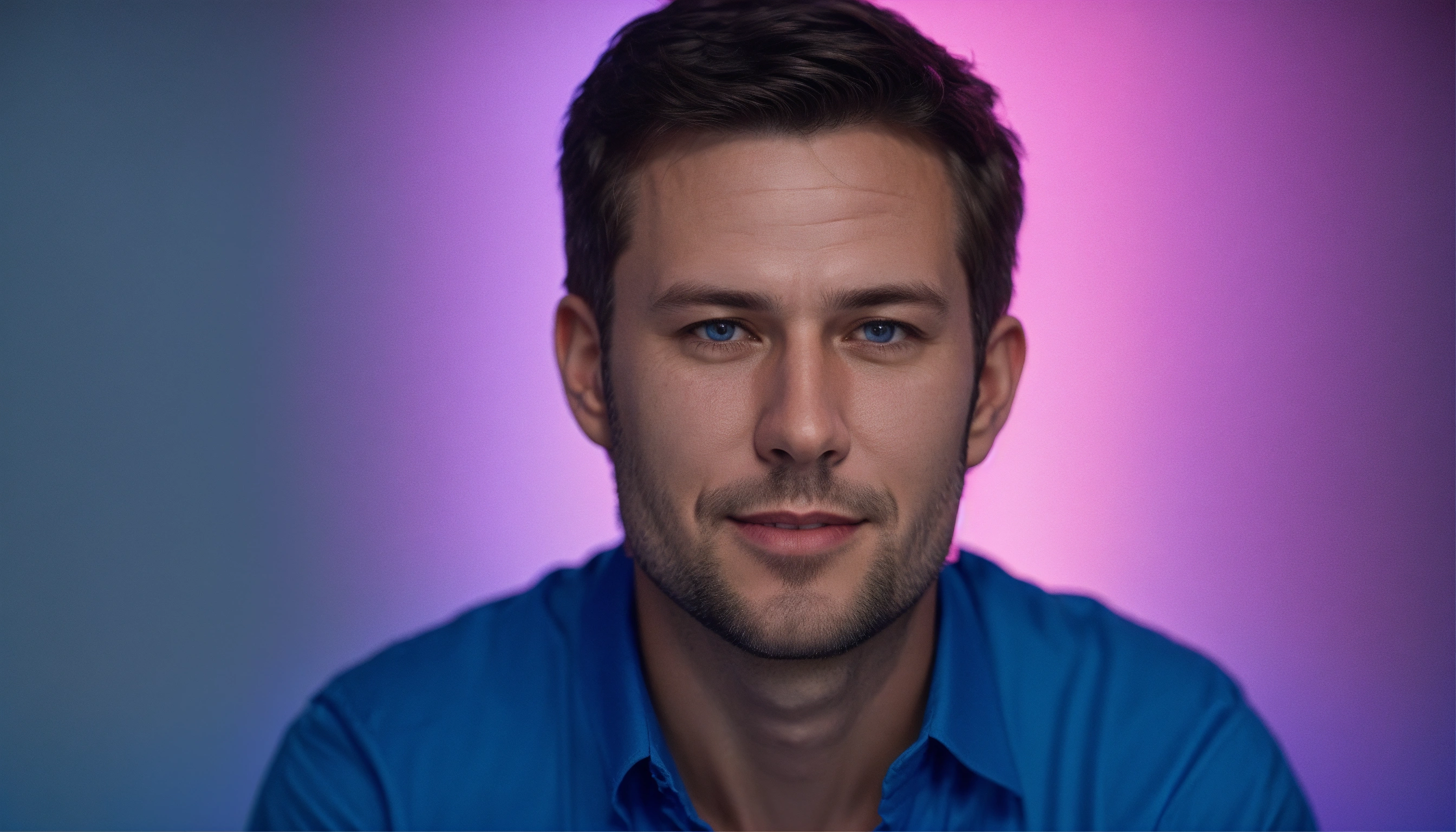 Perfect photo portrait, bust shot, of a 43 yo white man, with gentle smile, dark realistic short hair, wearing a blue cobalt shirt, contrasted skin texture, hyper detailed, front view, blue lighting, blue and pink gradient background, committed to digital science, photo shoot, hyper realistic, leica m10, 85-135mm. subject is on the right of the photo, comprehensive framing