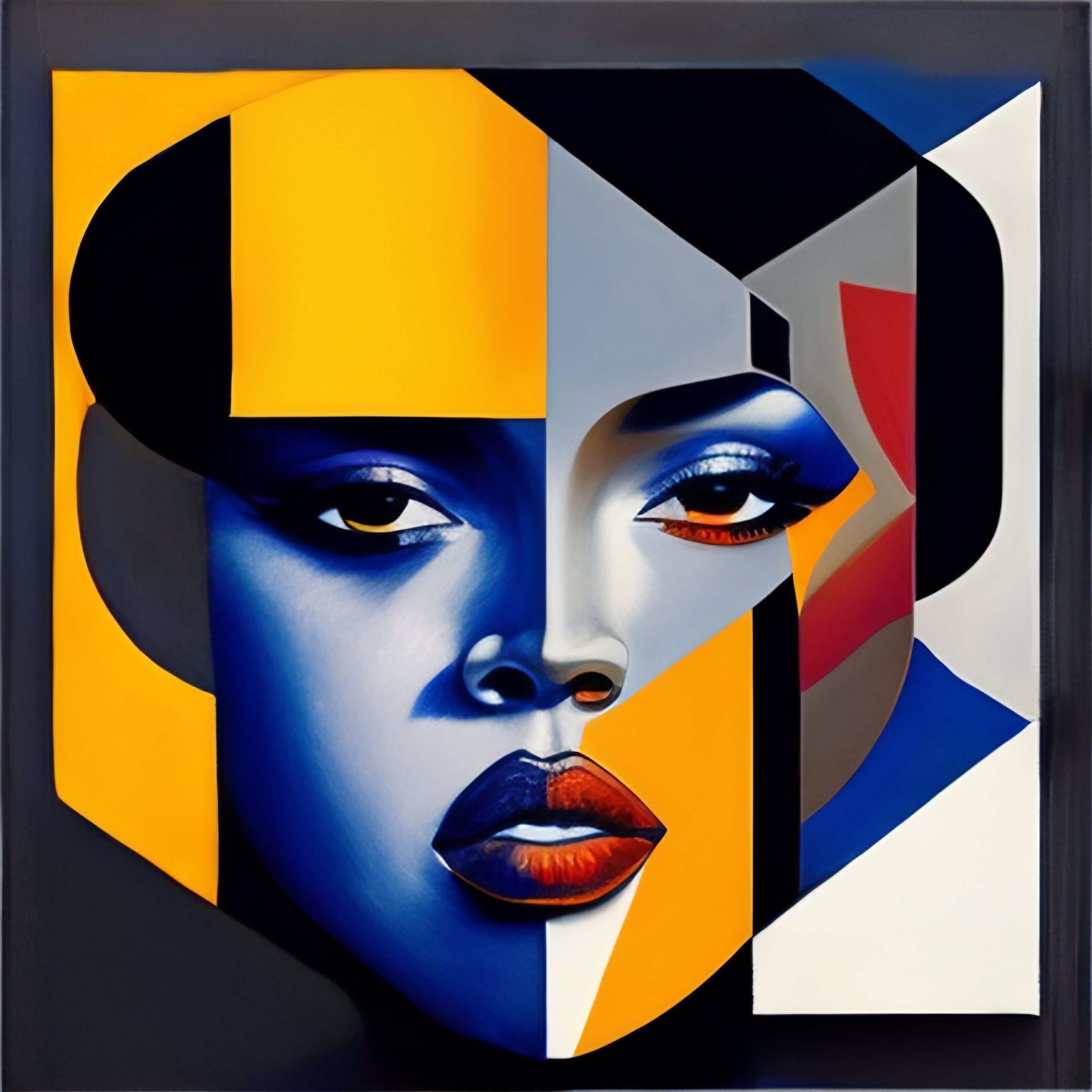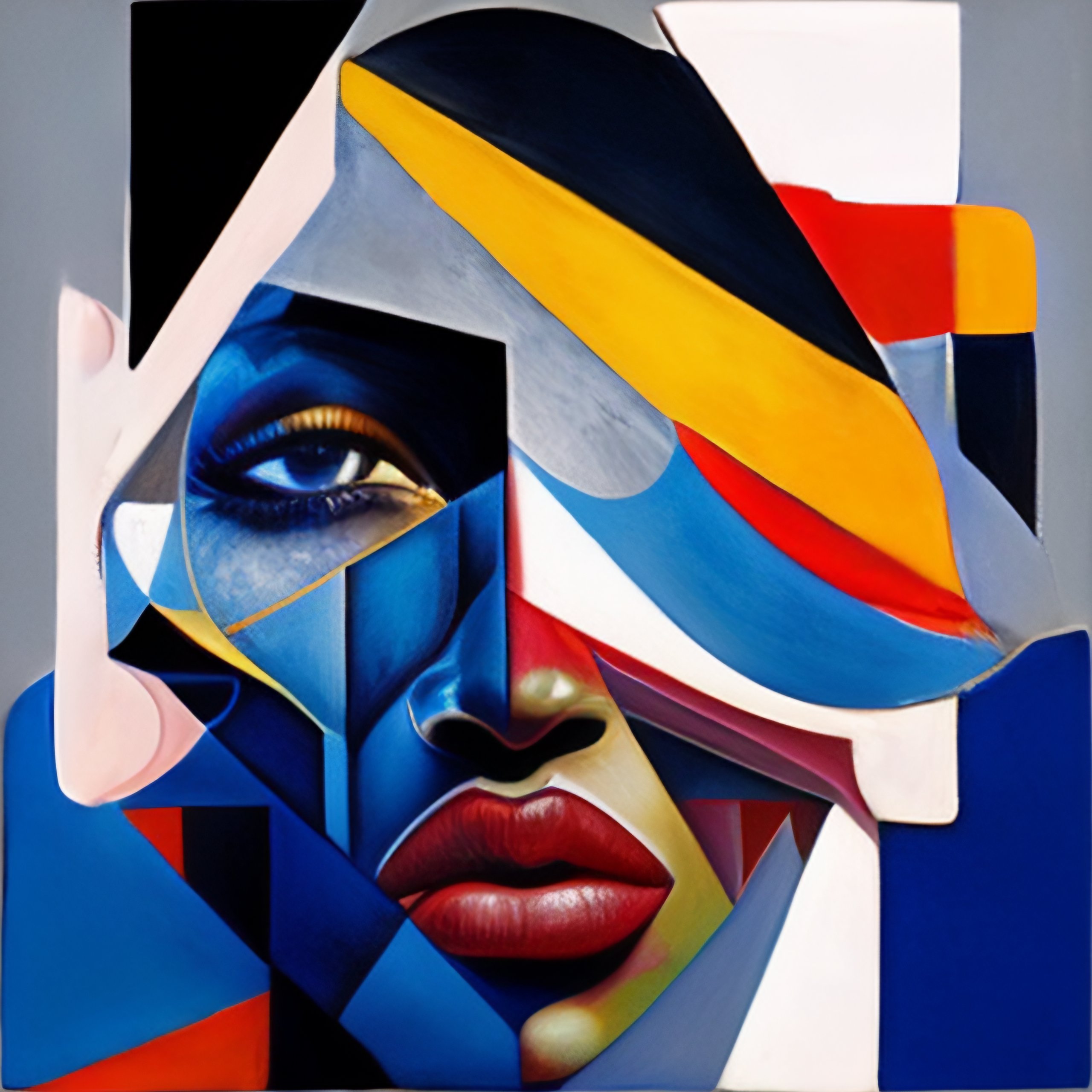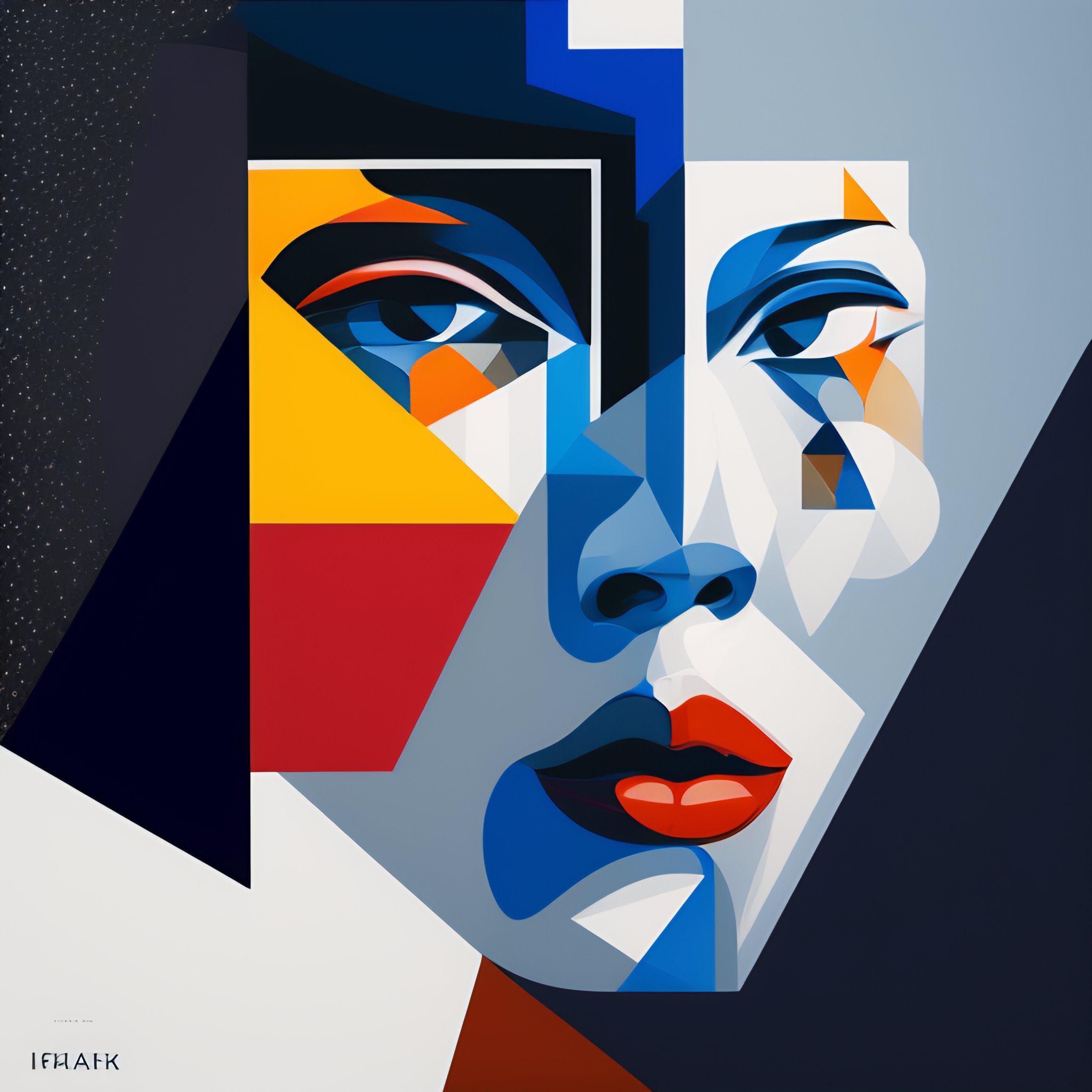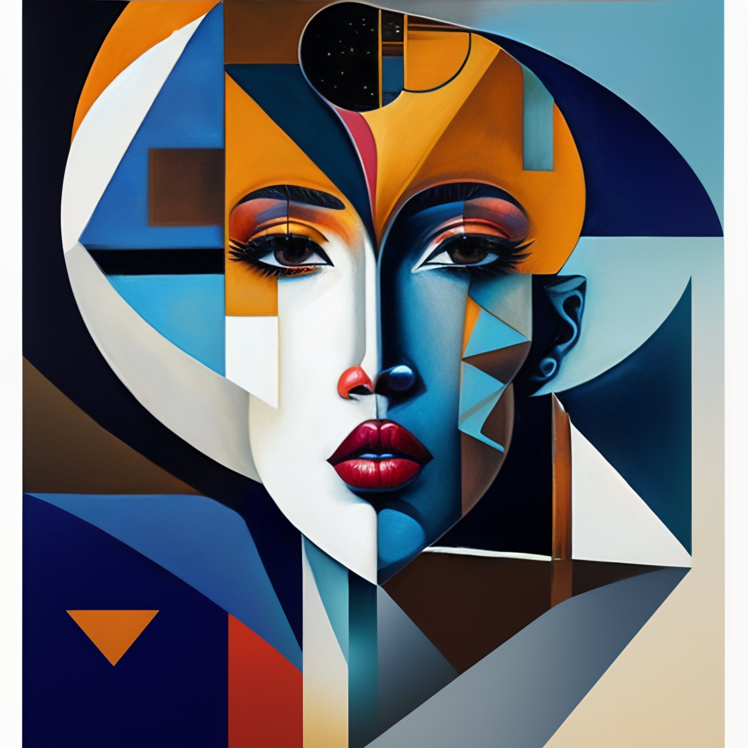 I propose a depiction of a person's face in the style of a cubist painting, with the face broken up into geometric shapes and planes. the background is a deep, dark blue, with stars and celestial bodies scattered throughout the composition. the face is rendered in shades of white, gray, and black, creating a sense of contrast and drama. the overall composition is asymmetrical and chaotic, reflecting the experimental and avant-garde nature of the music within. the style of this cover art would be cubism, with the use of geometric shapes and fragmented forms to convey a sense of disunity and abstraction. the perspective is from the front, with the face taking up the majority of the composition, drawing the viewer in and creating a sense of intimacy. overall, this cover art conveys a sense of innovation and experimentation, making it a unique and intellectually stimulating masterpiece, cover art
