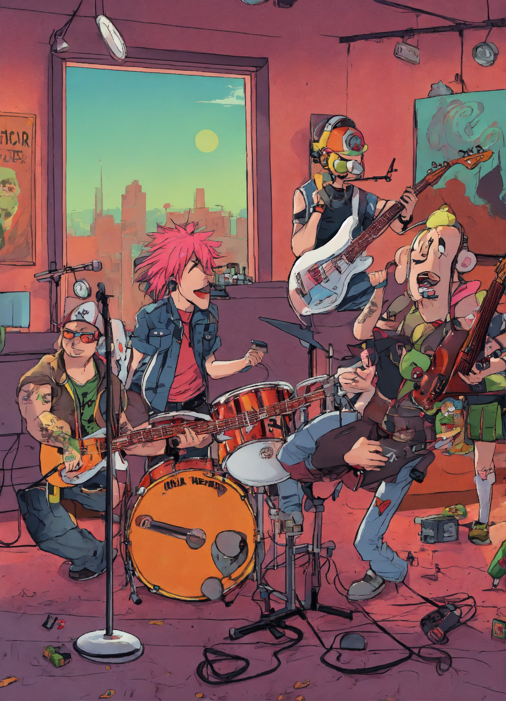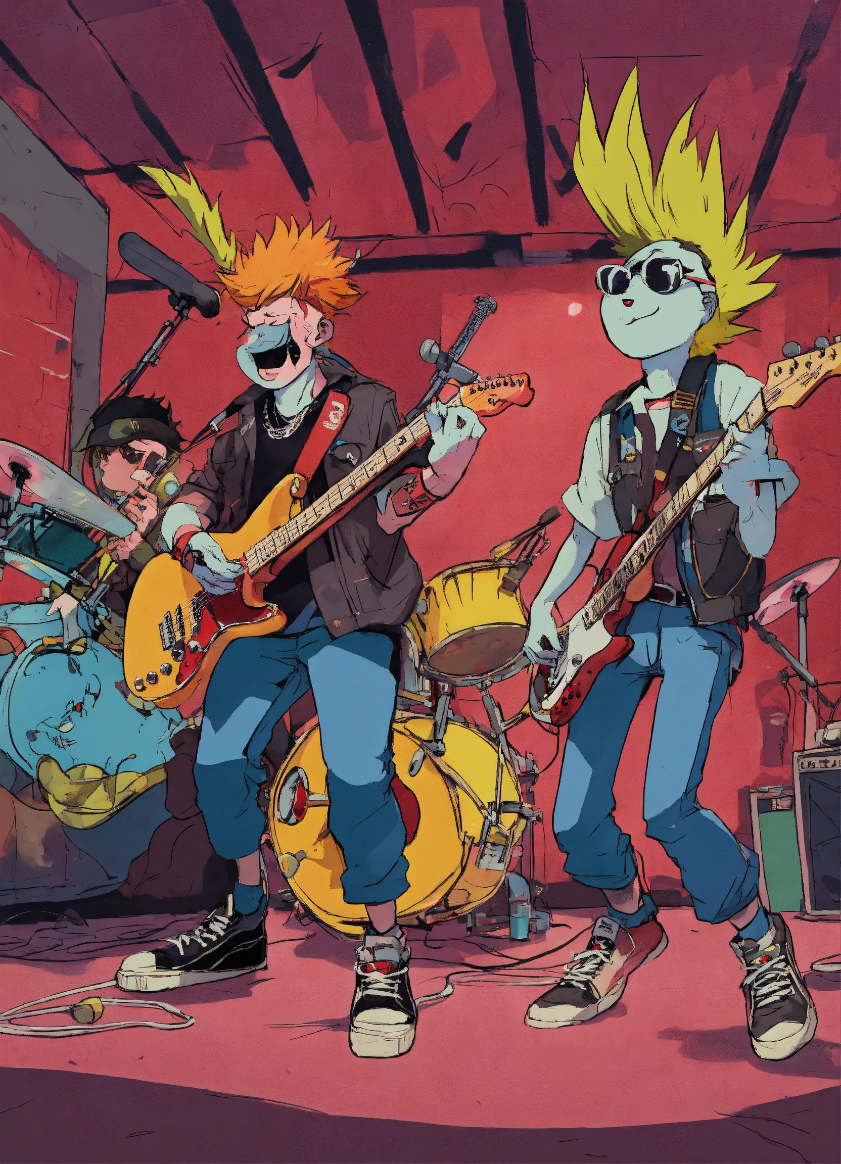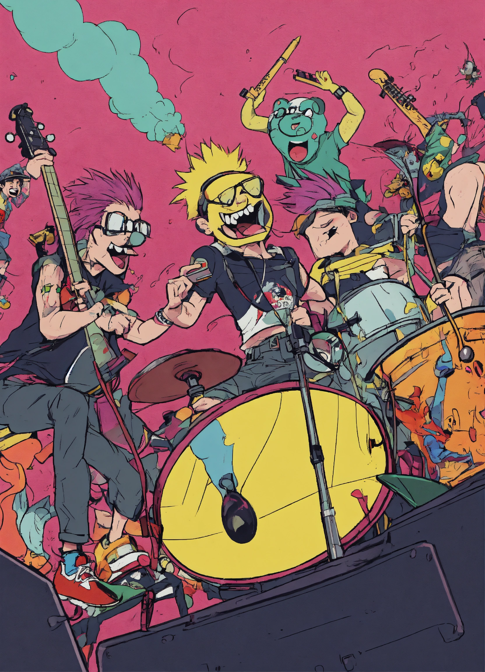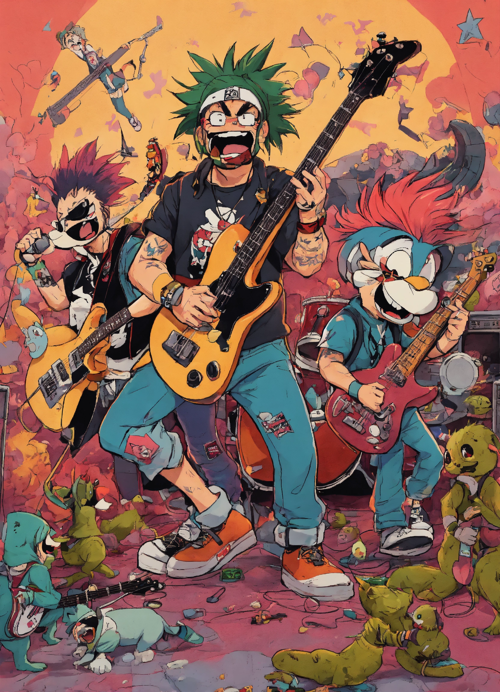 An energetic hardcore punk band consisting of cartoon characters playing various instruments