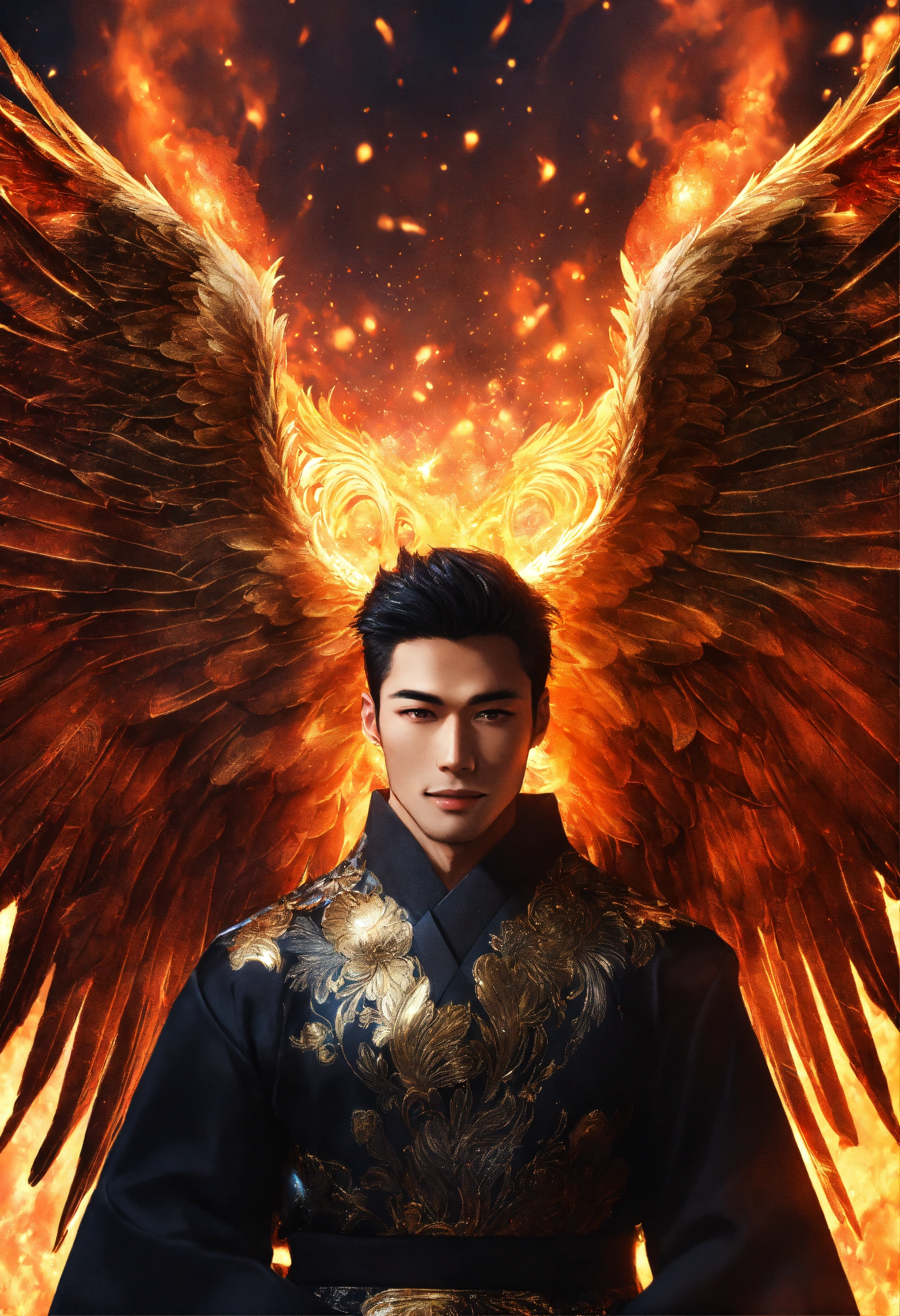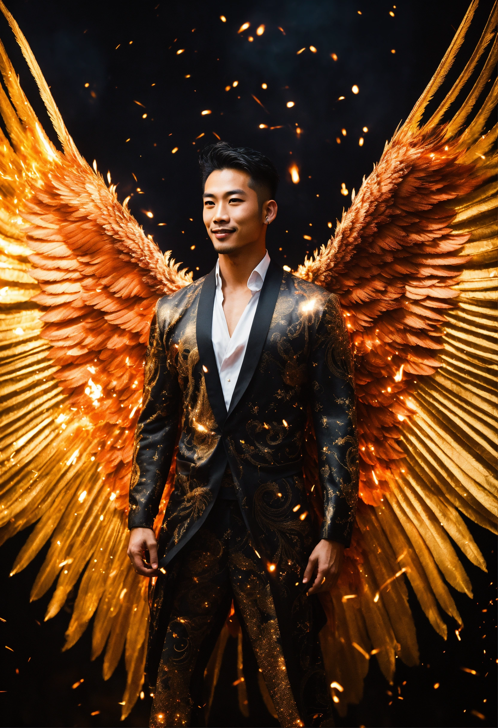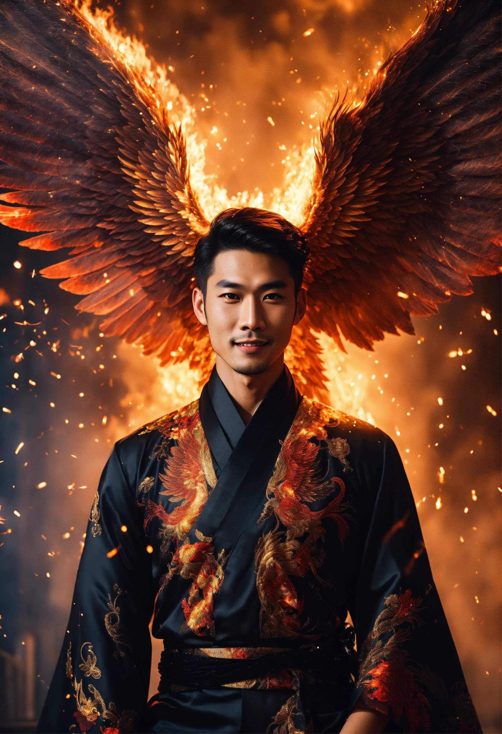 Surrealistic 3/4 photographic portrait of robust fit masculine joyous archangel with massive angel wings, background is swirling explosions of sparks and fire, staring intensely straight ahead directly into camera as if listening intently to me, 25 year old asian supermodel male, extremely handsome, smiling peacefully with black eyes centred towards me, wearing intricate futuristic sparkling black kimono with fiery phoenix bird details, editorial fantasy magazine photo, film grain.