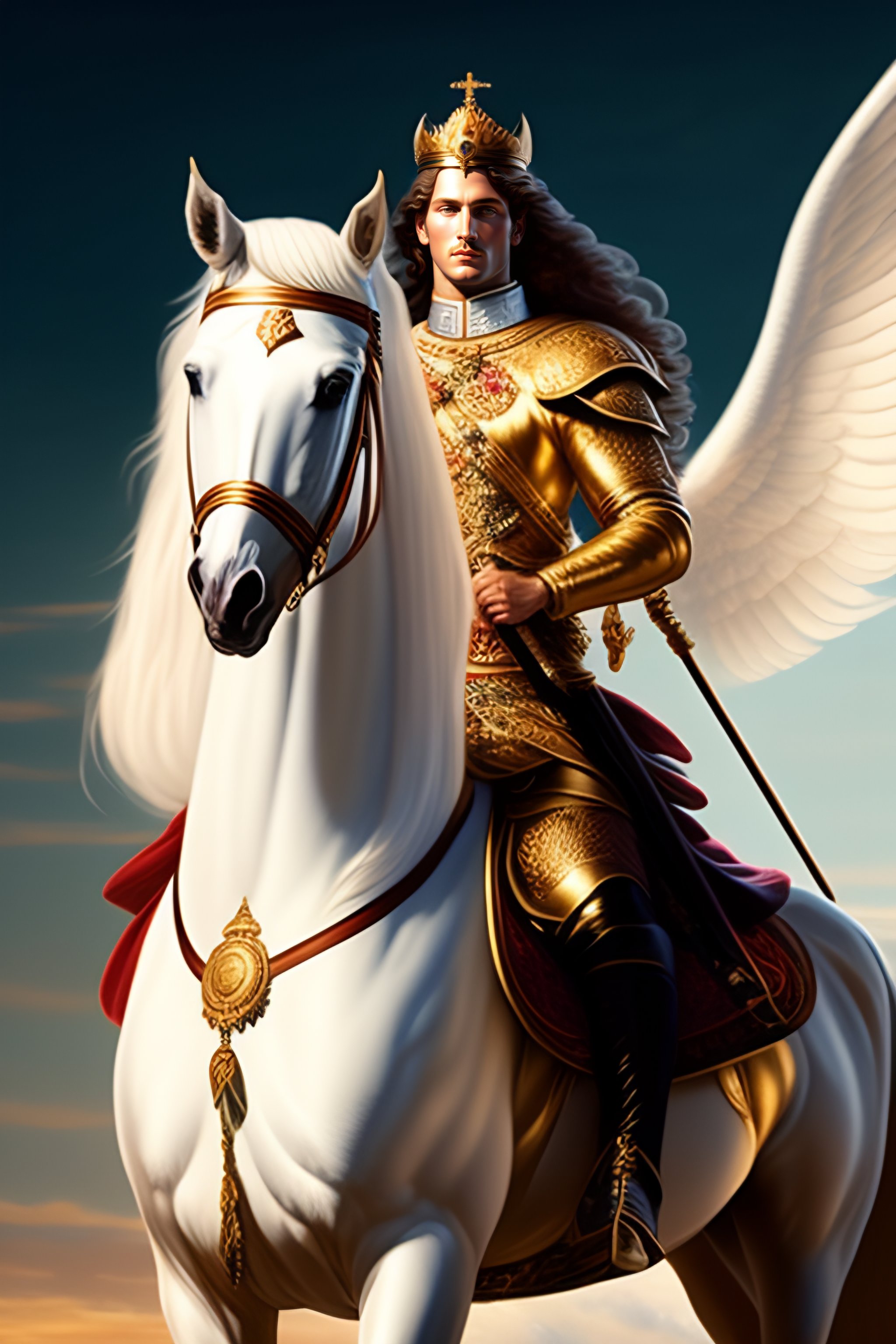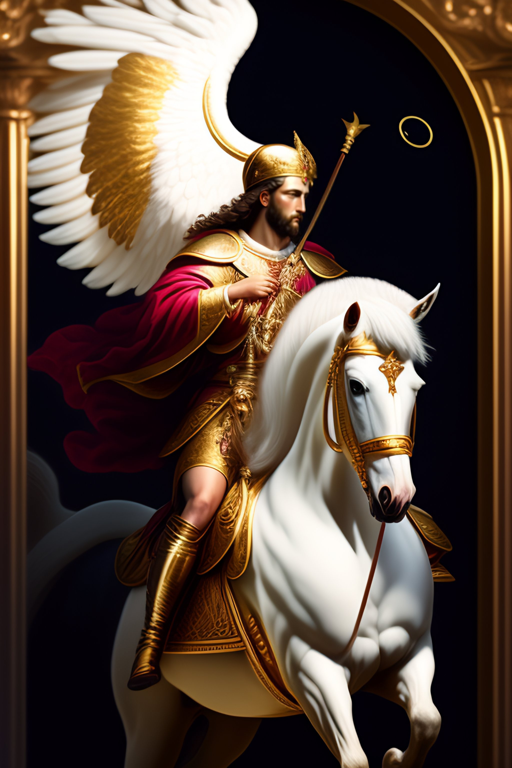 St. michael with medallion on a white horse with a spear