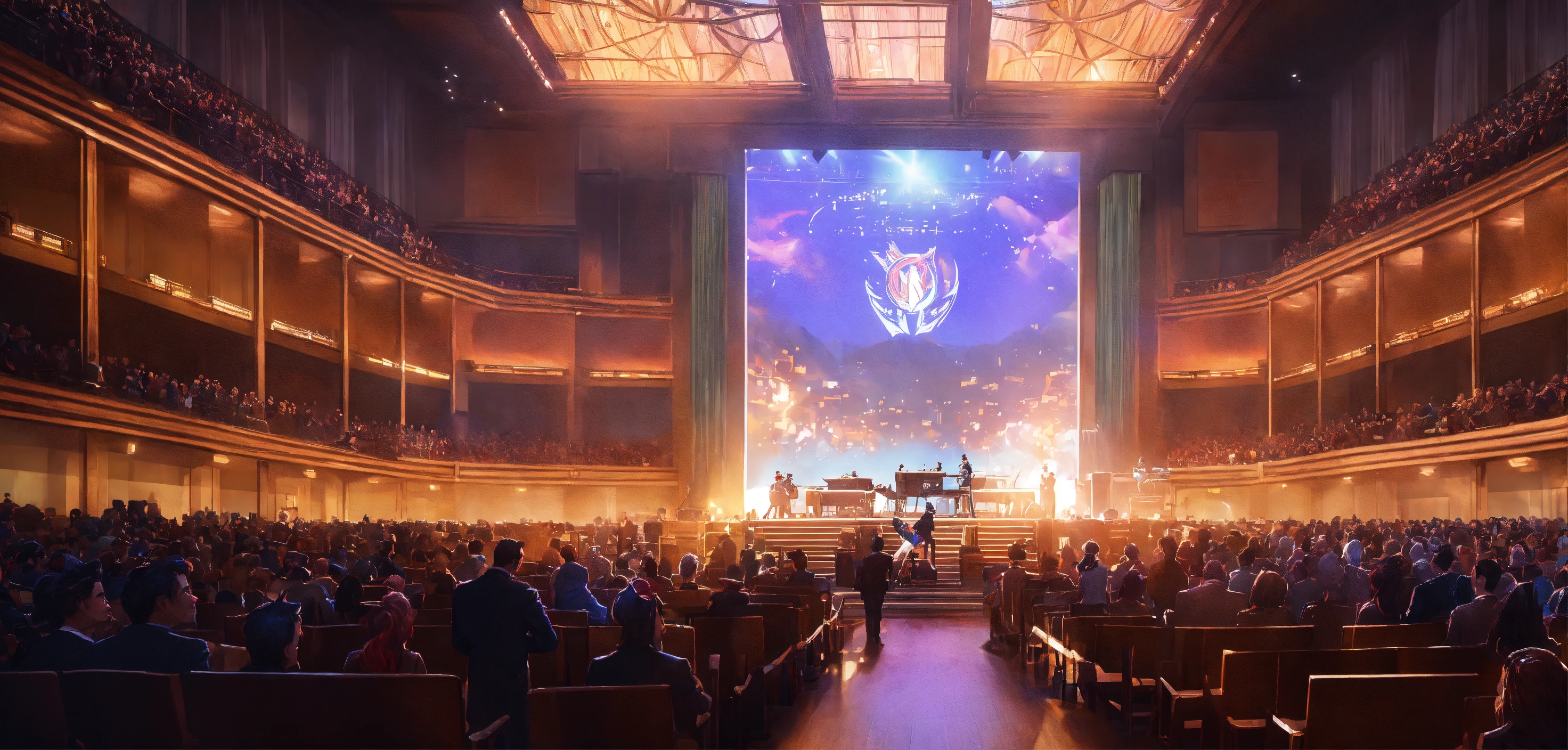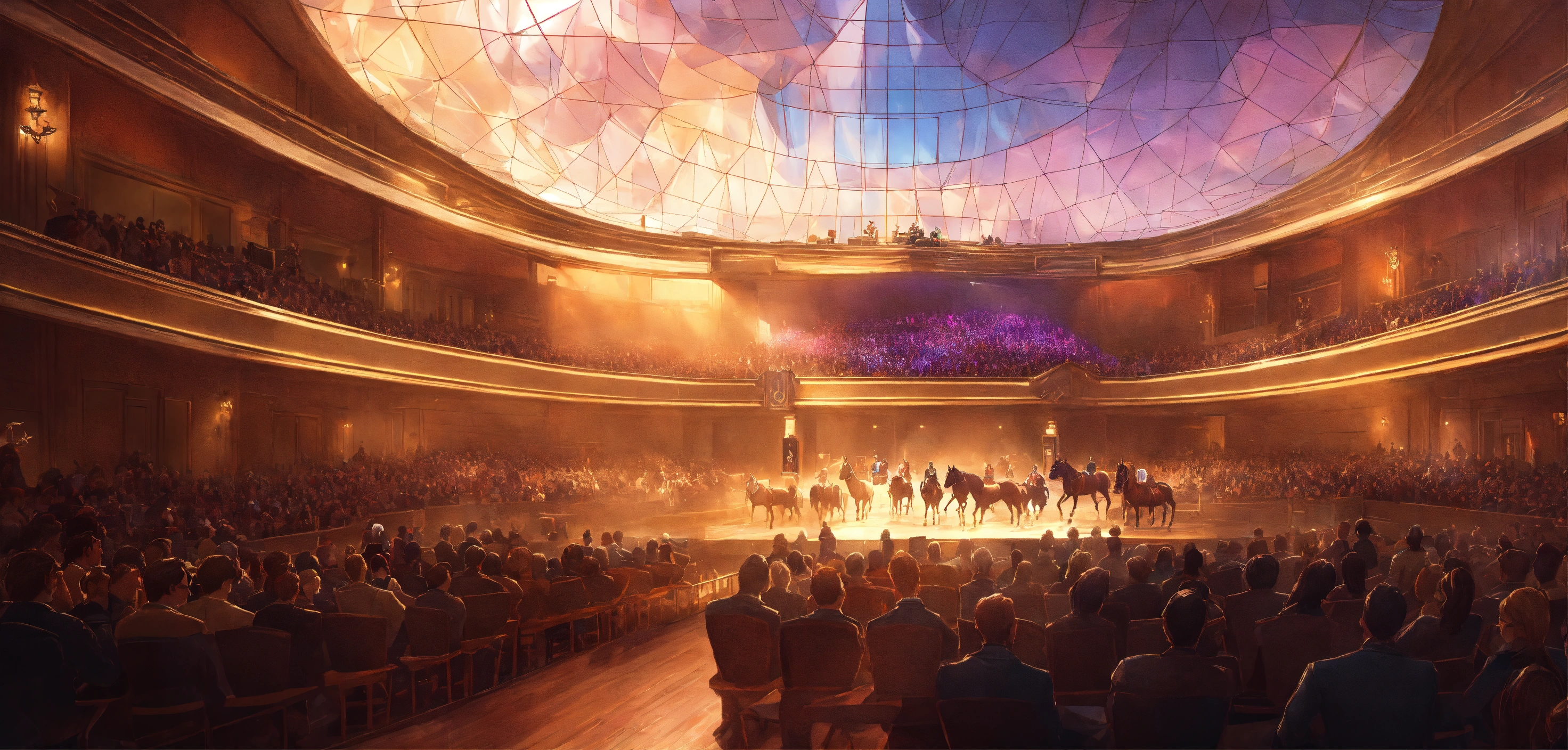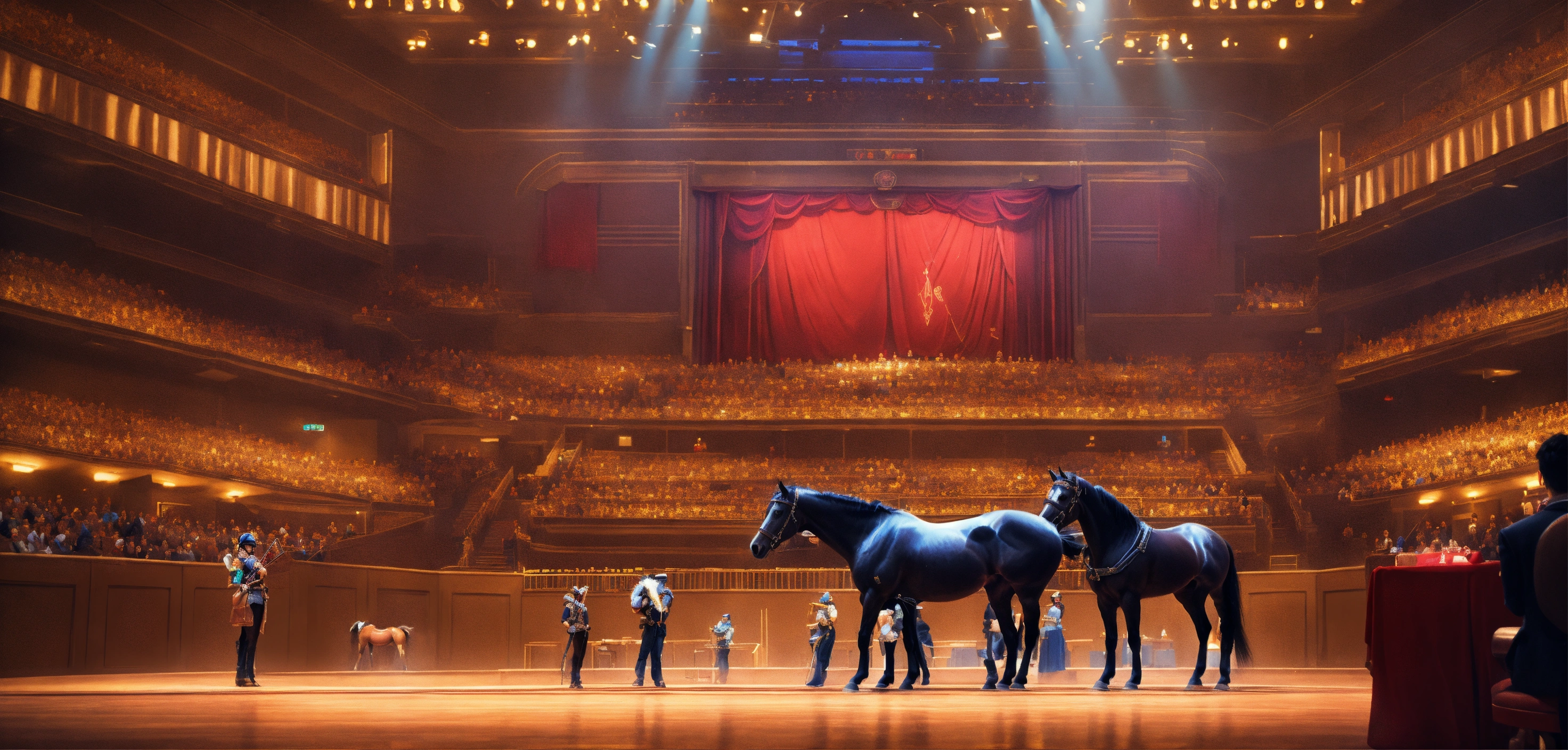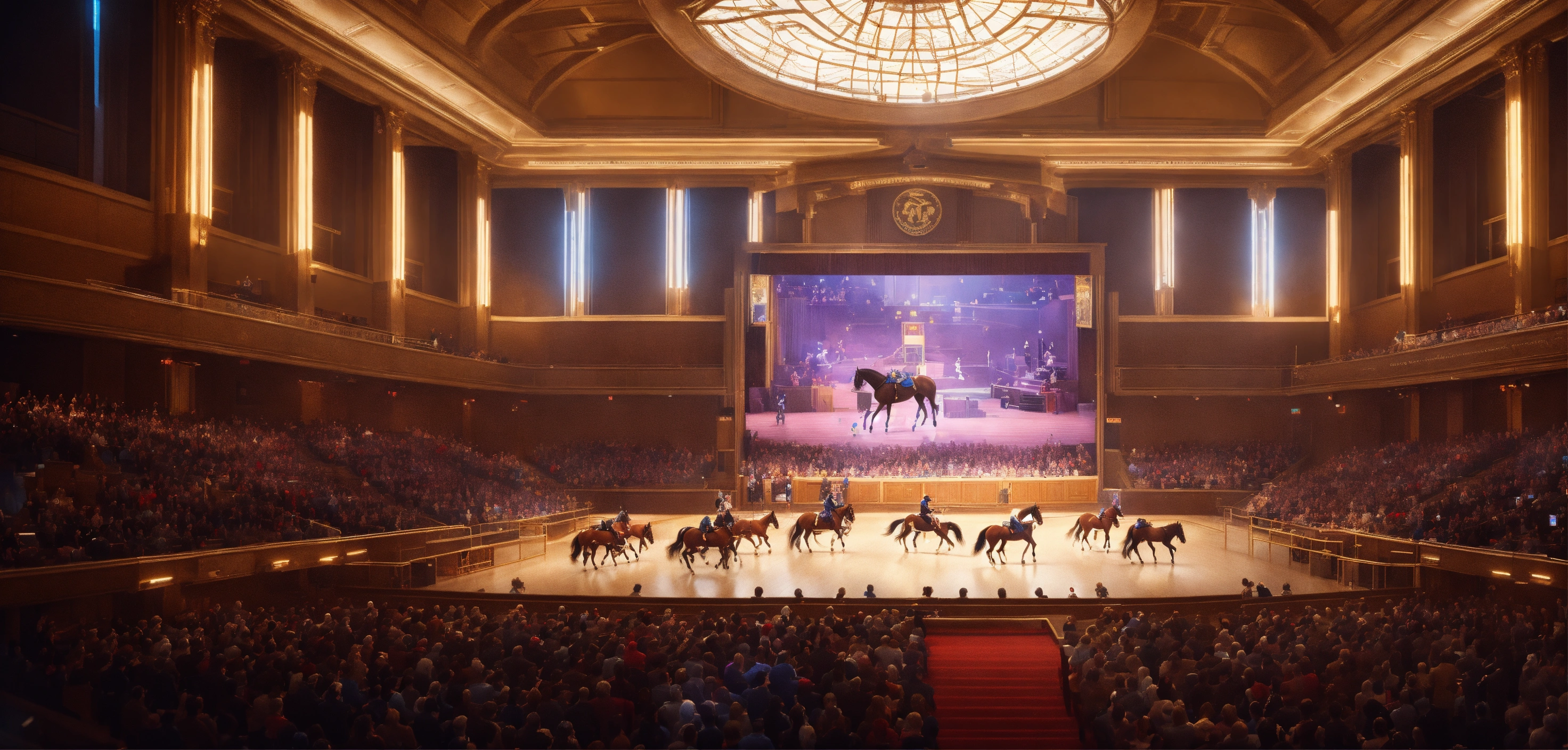 A highly detailed league of legend dynamic illustration of the horse auction in modern concert hall, by joshua raphael, by artgerm, by huyy nguyen, by cj xander, by jennifer wuestling, by diep duong van, by huyy nguyen, by grafit studio, volumetric lighting, 3d render, 4k resolution, trending on artstation, masterpiece, close up frame, cinematic shot, sport competition, epic, keeneland sales, inside hall with stands, lot of armchairs with people, one horse in centre only with light, a windowless hall with a horse stand