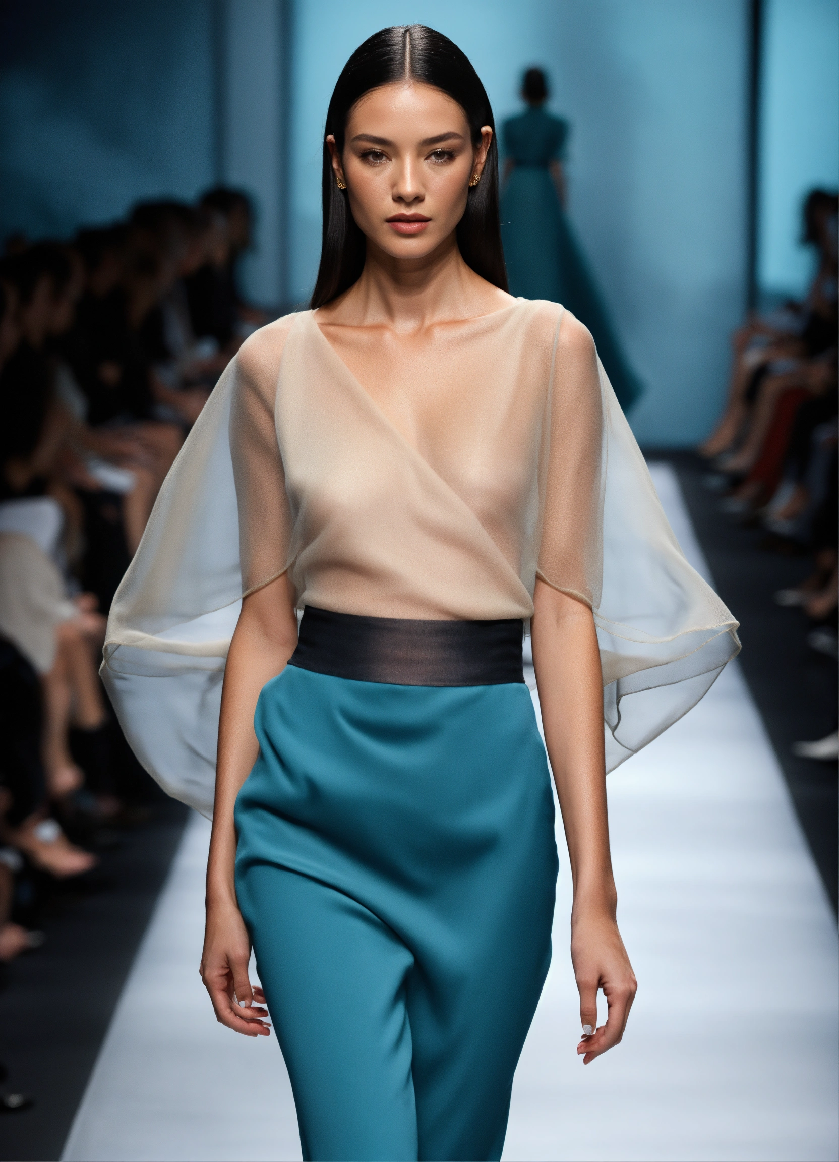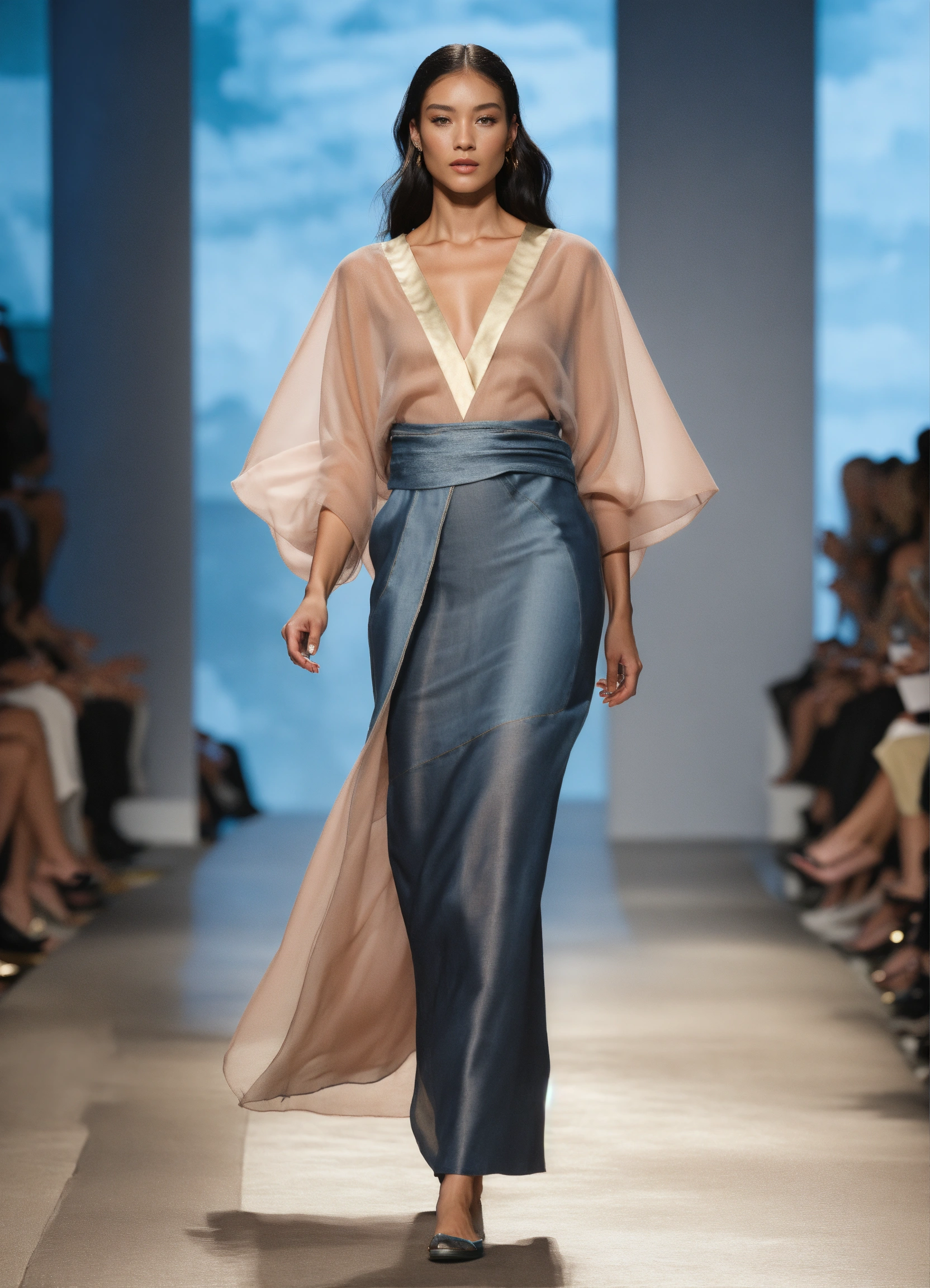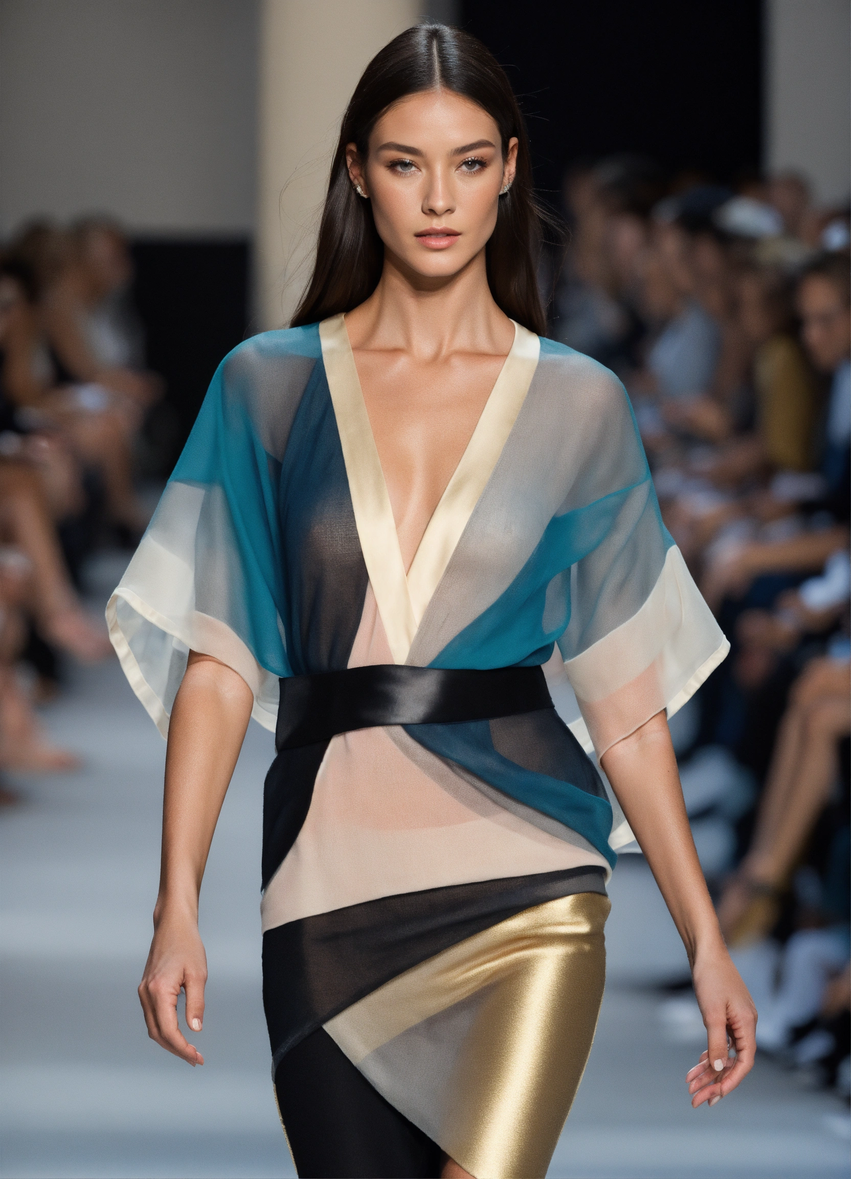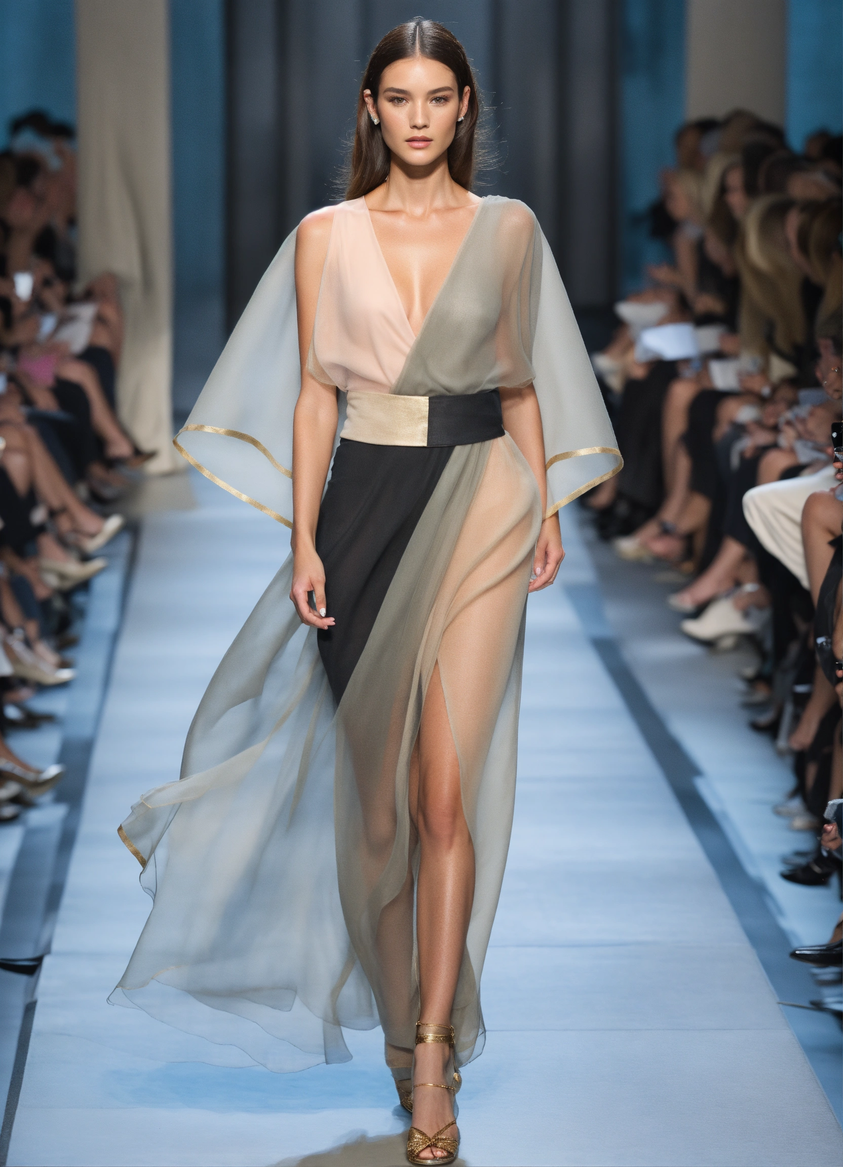 3d realistic photo of female model walking runway during fashion week wearing dolman sleeve donna karan fashion in black, white, blush, grey, beige, stone, gold, denim, blue, teal stiff organza