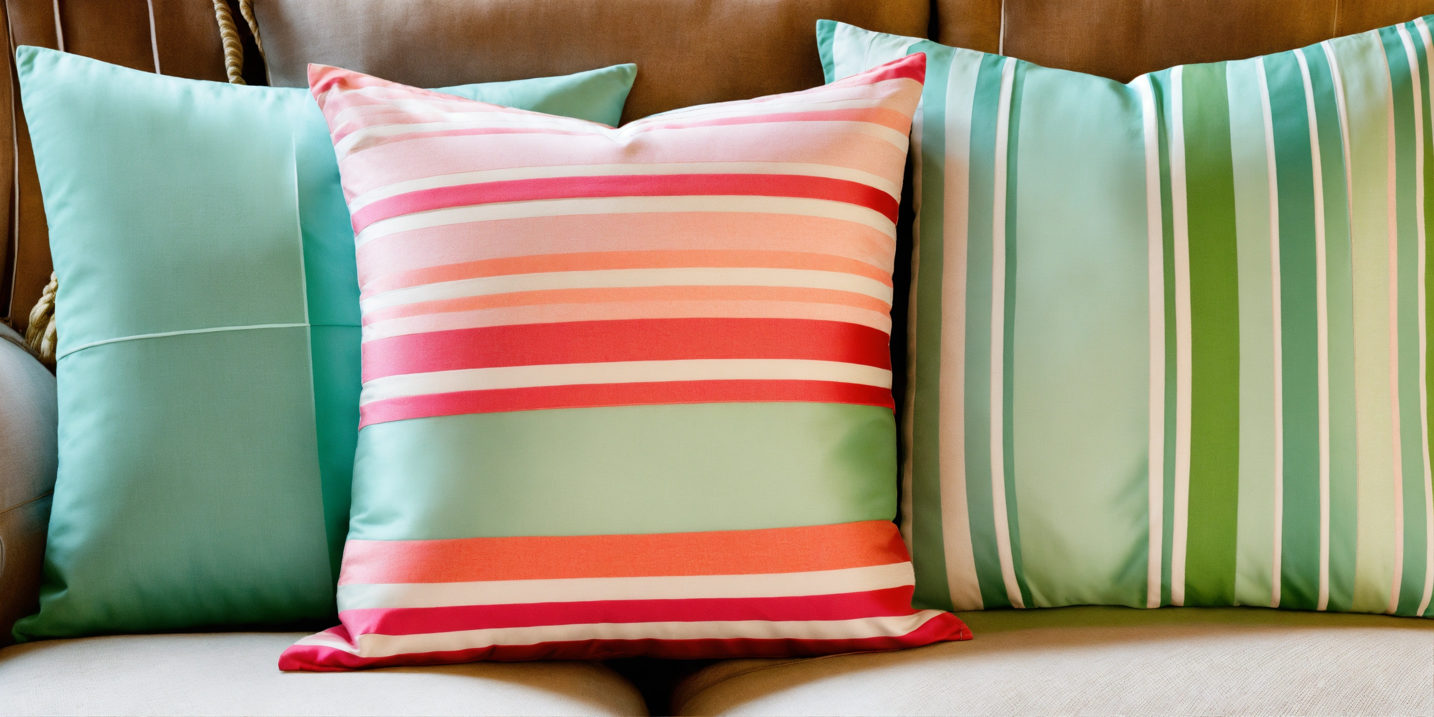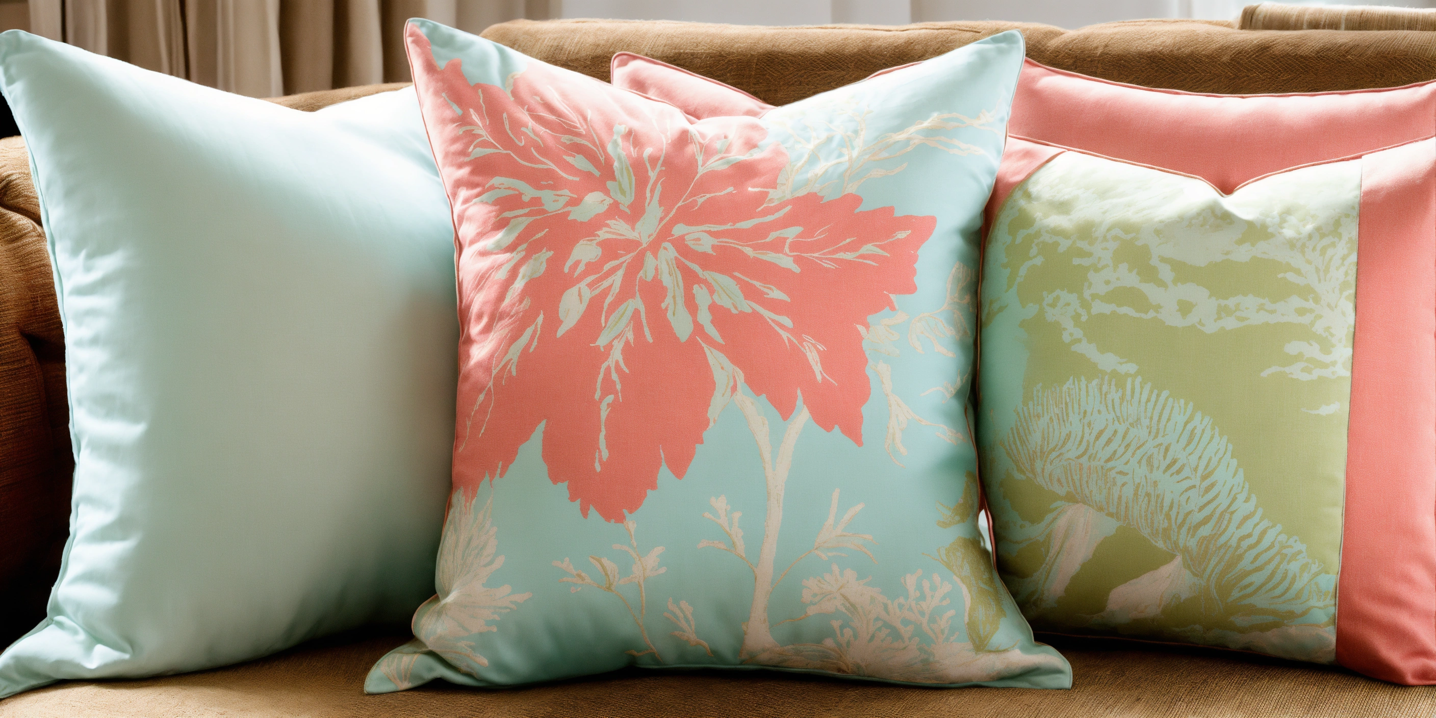 Nautical coastal maritime theme accent pillows in soft light blue, seafoam greens, and coral pinks luxury fabrics