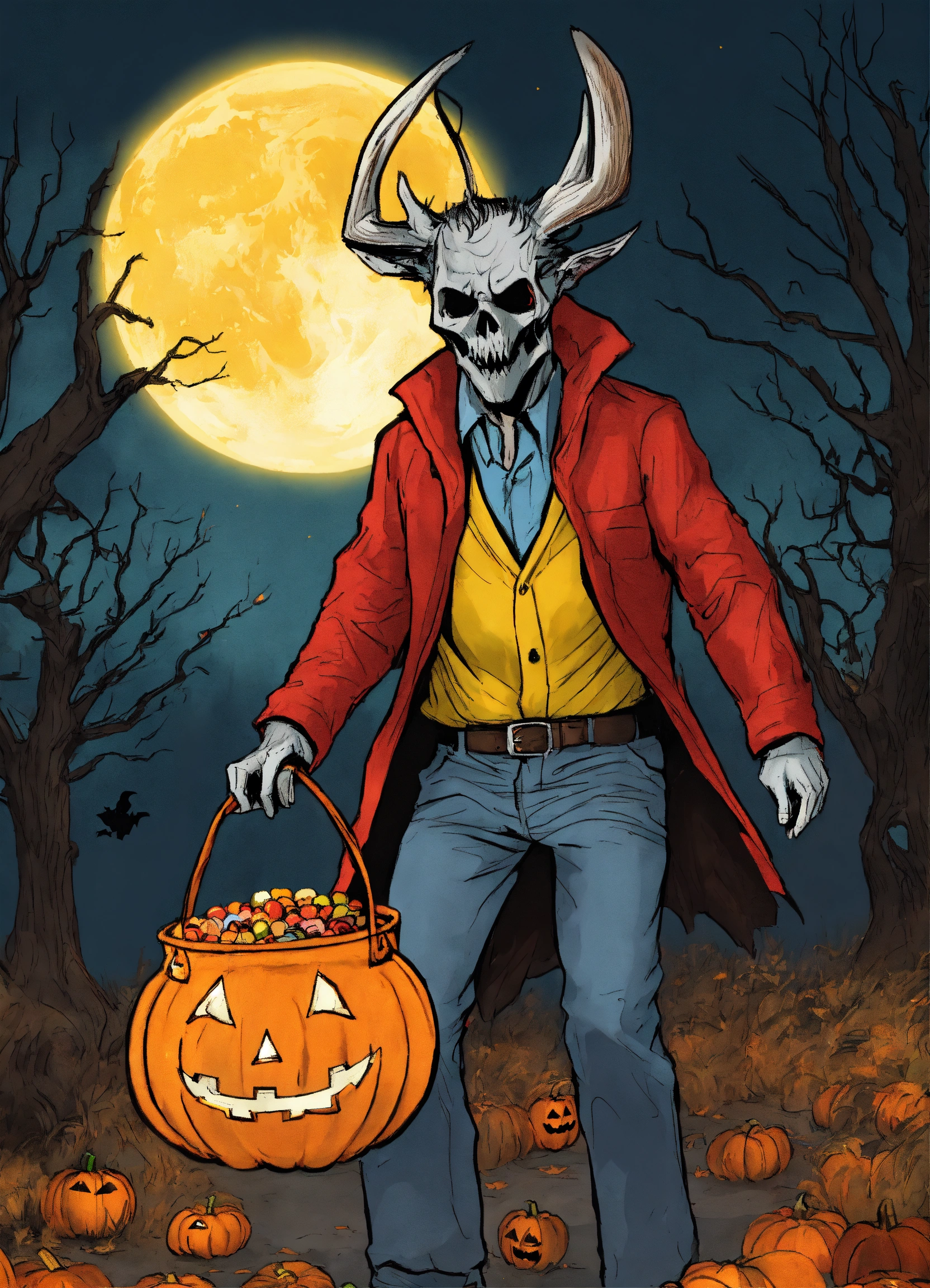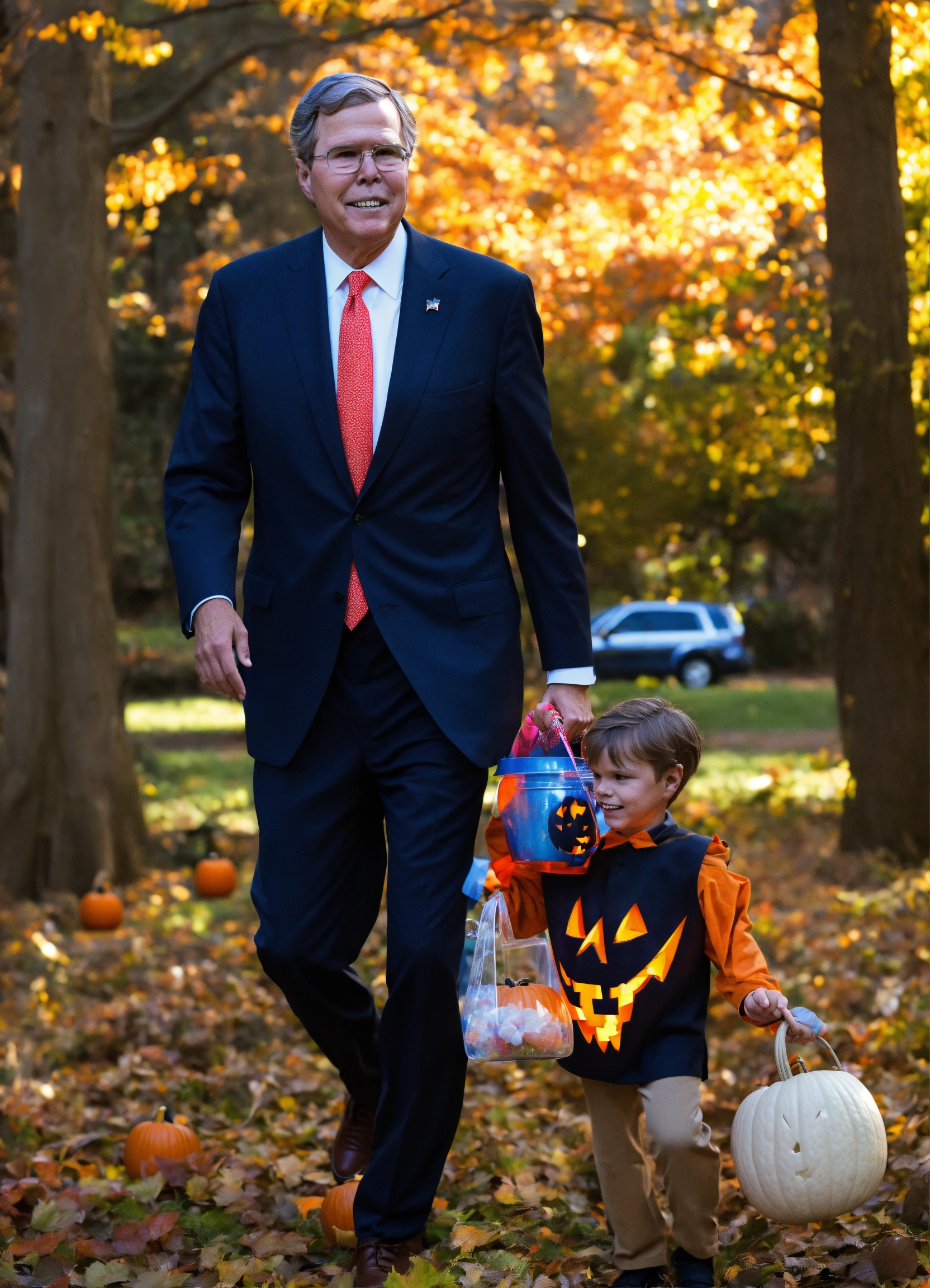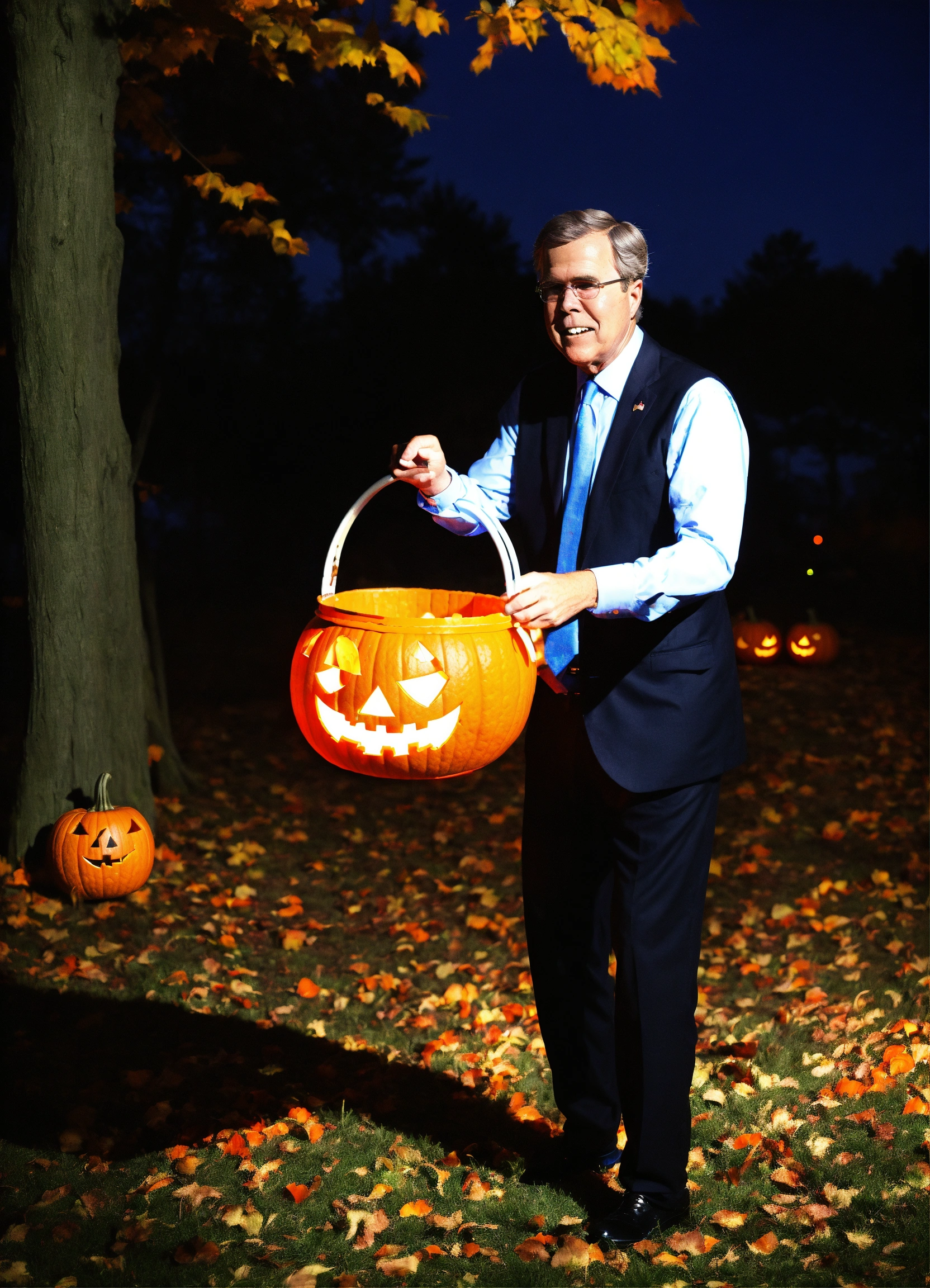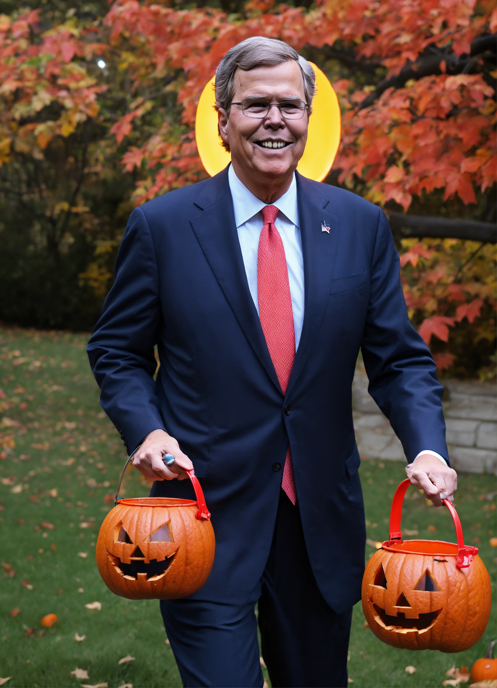 Spooky wendigo jeb bush trick or treating with a jackolantern candy bucket