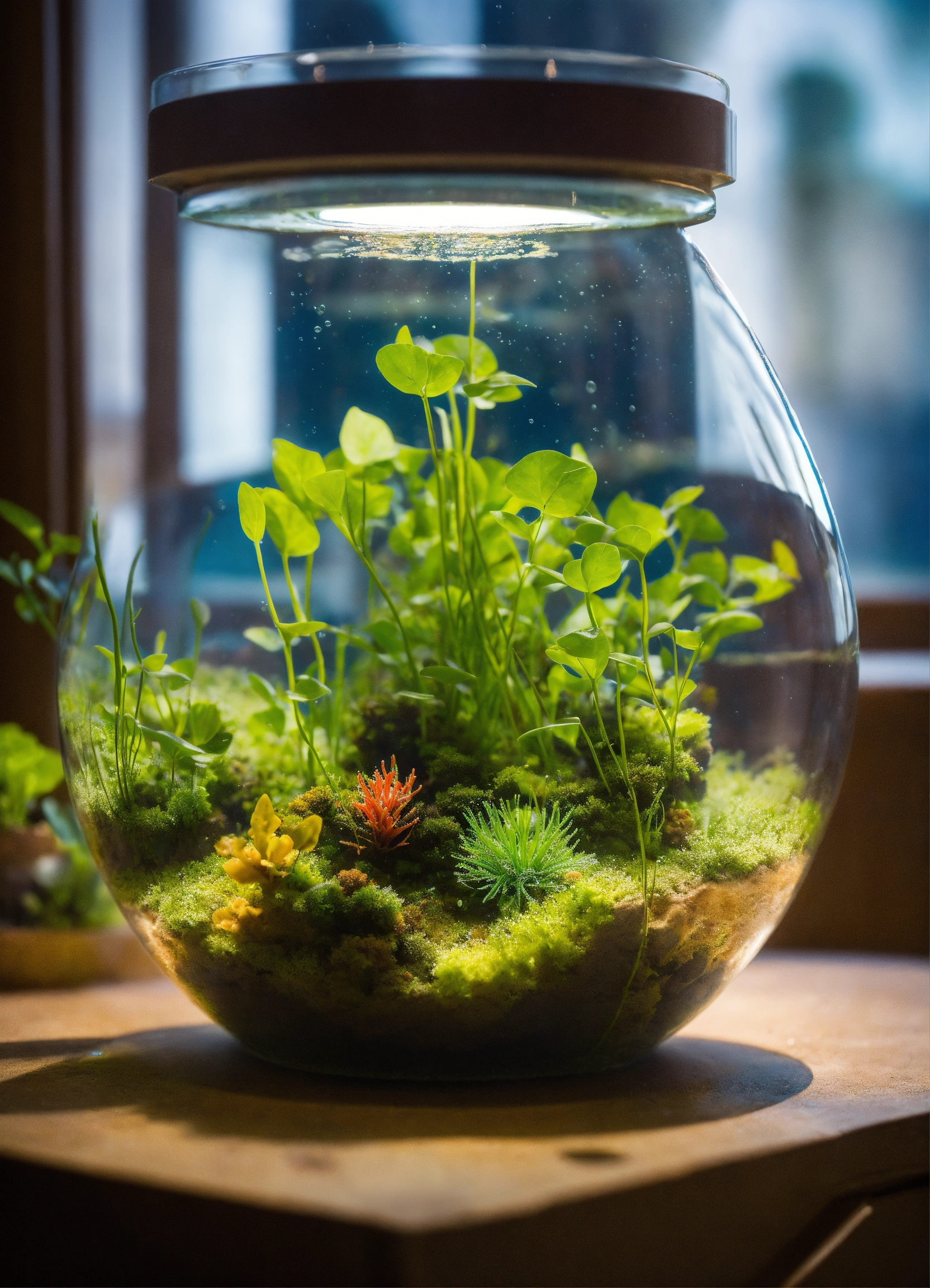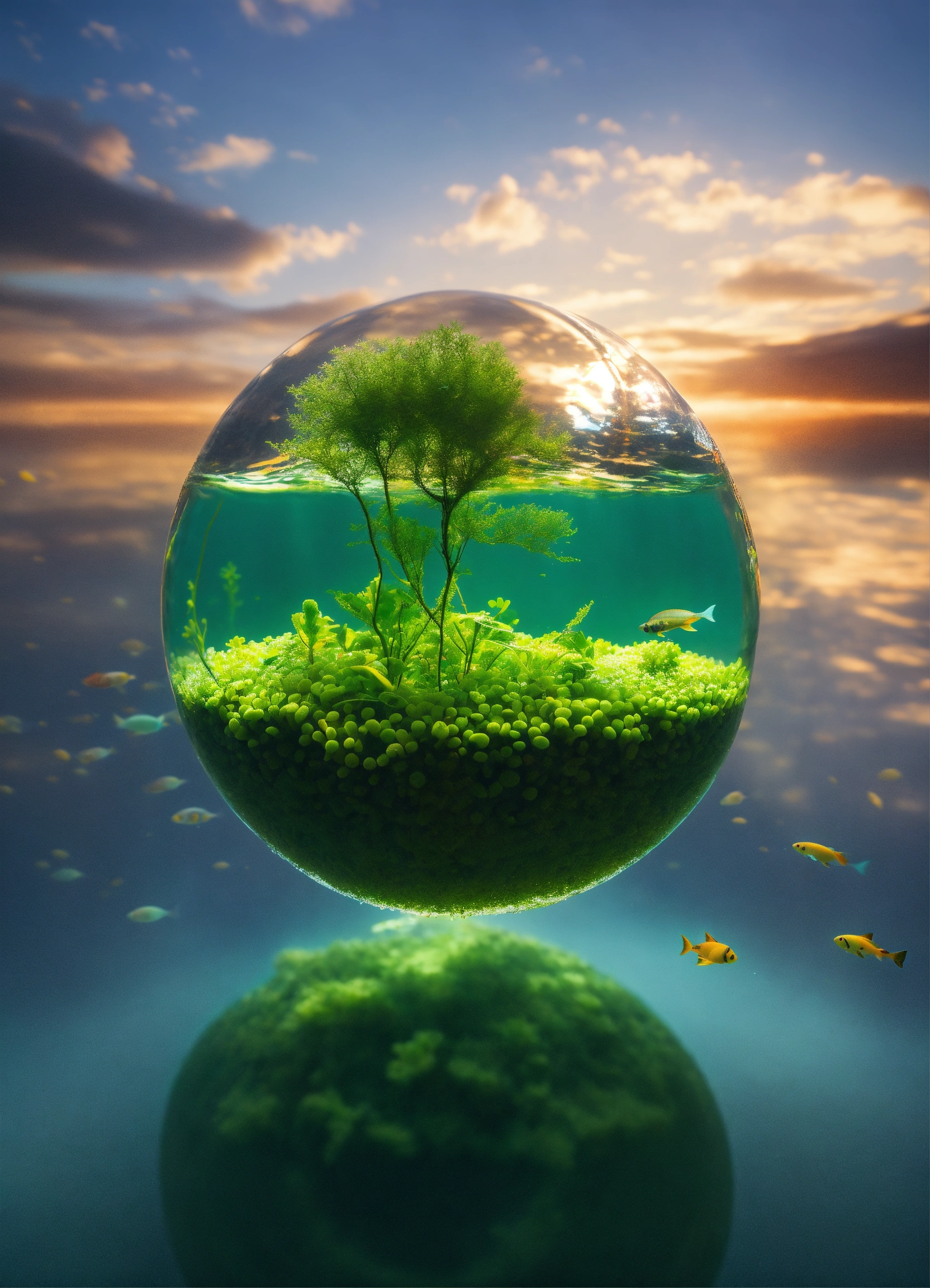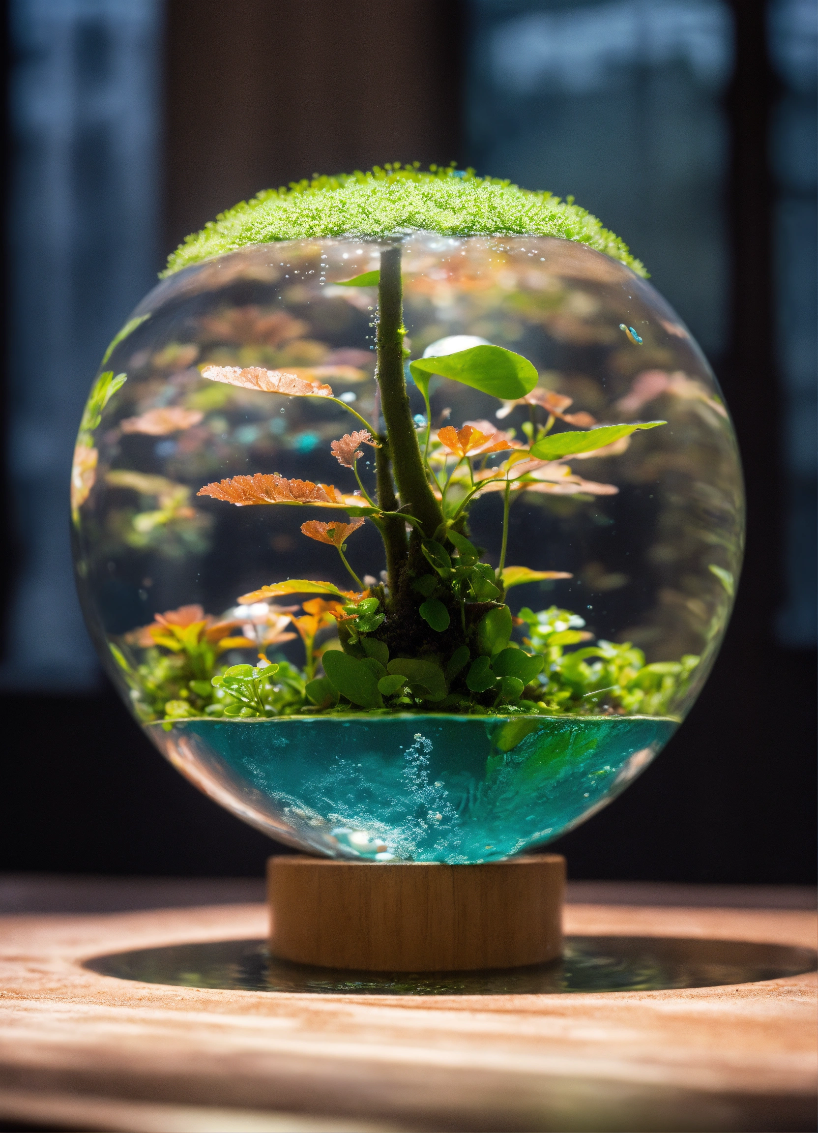The globe transforms into a tiny plant growing underwater, representing the emergence of plant life. it sways gently with the underwater currents