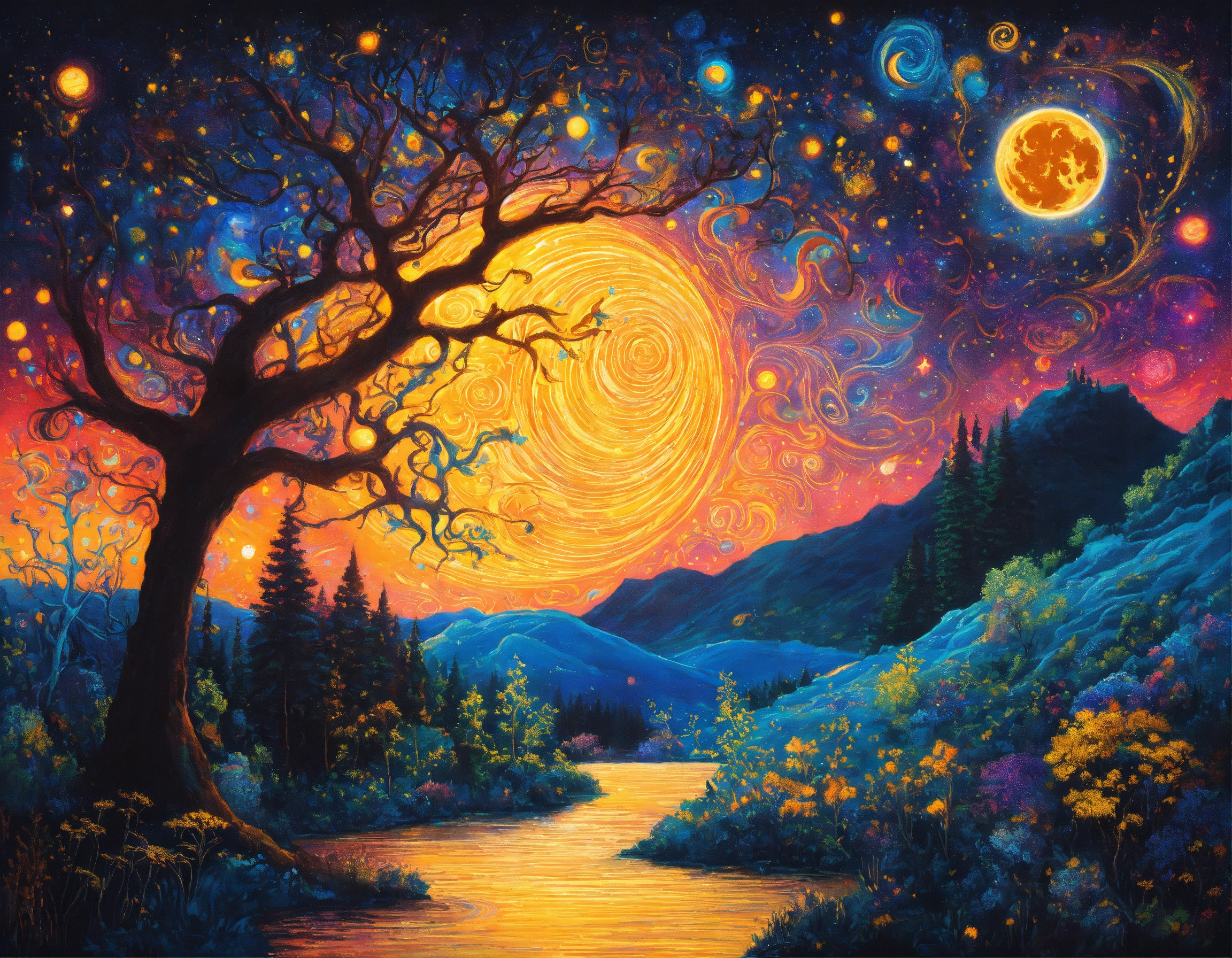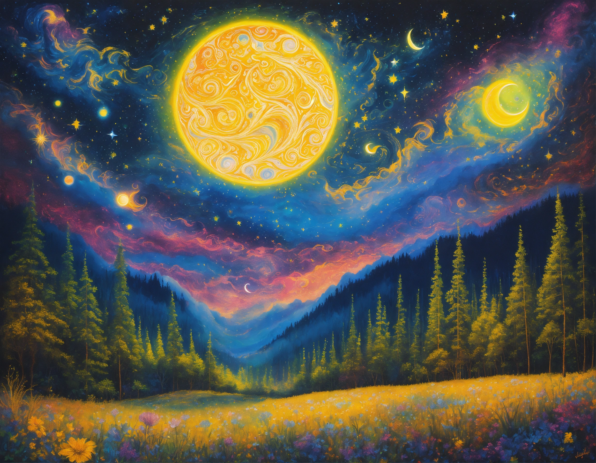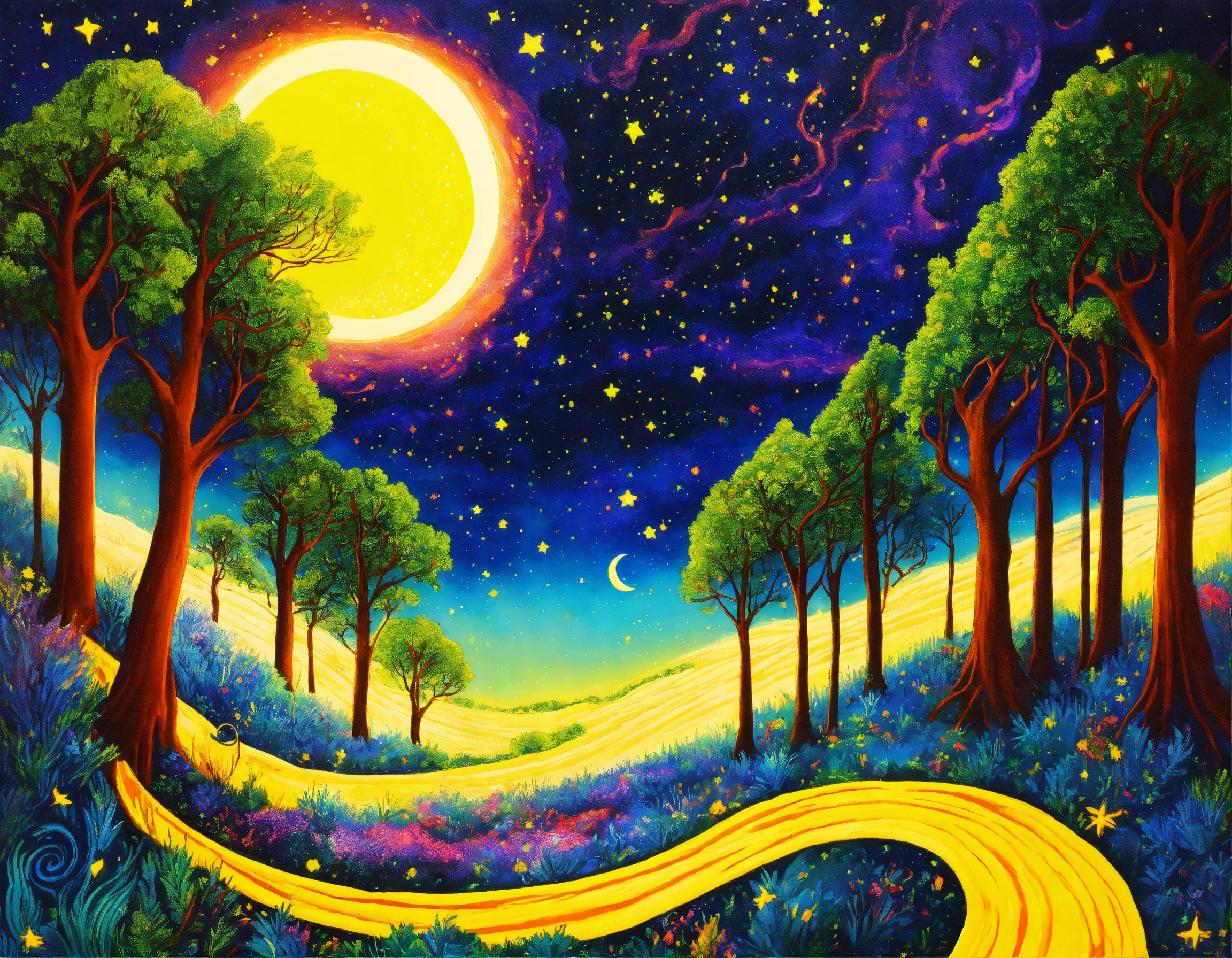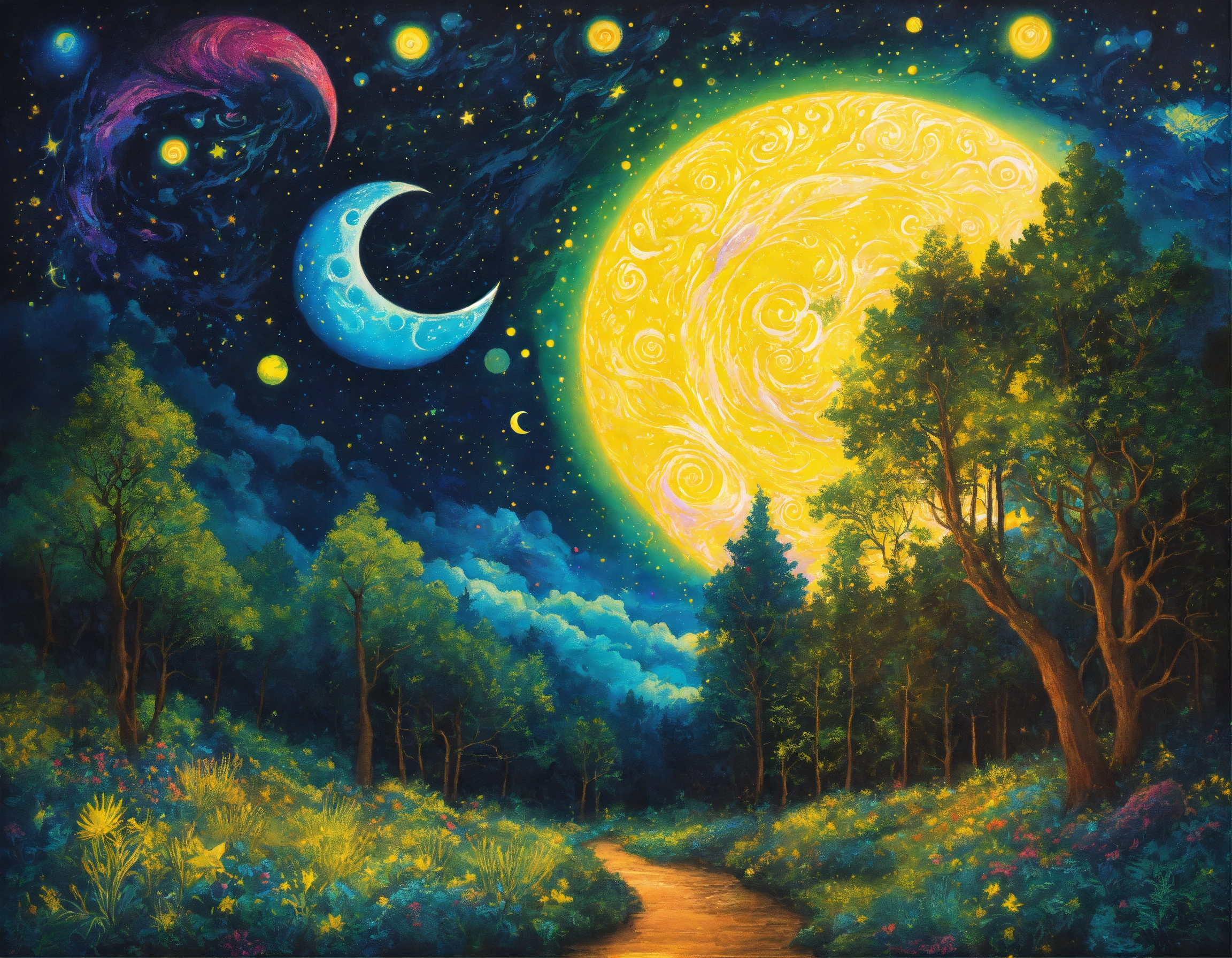 Colorful, sparkling, twinkling, radiant fantasy starry night, galactic swirl sky, bright yellow crescent moon with face swirling and twinkling over a stunning enchanted forest, cosmic celestial bioluminescent stars, intricately detailed, phosphorescent effect, gouache brushstrokes, beautifully colored composition, hyperreal detail, marvelous gouache masterpiece, enchanting and cosmic, surreal and vibrant, celestial night, breathtaking and sparkling, ethereal and mesmerizing, cosmic swirls, bioluminescent magic, celestial forest, sparkling crescent moon, phosphorescent stars, vibrant and intricate, surreal night sky, radiant and detailed, artistic brilliance, gouache artistry, vivid and enchanting, breathtaking composition, otherworldly masterpiece, mysterious