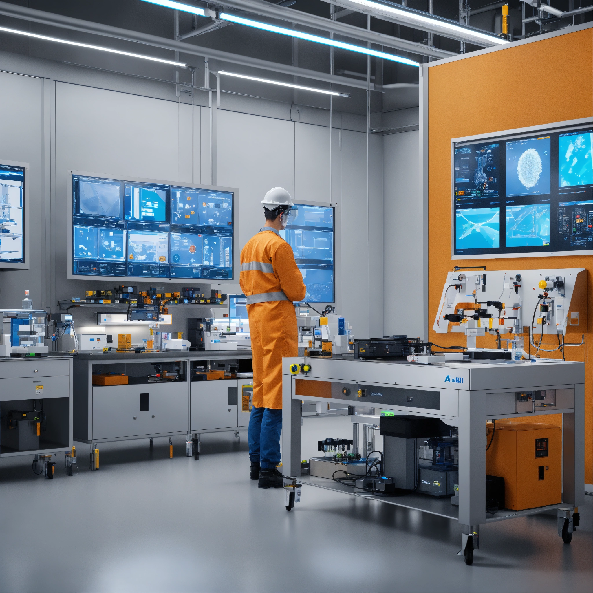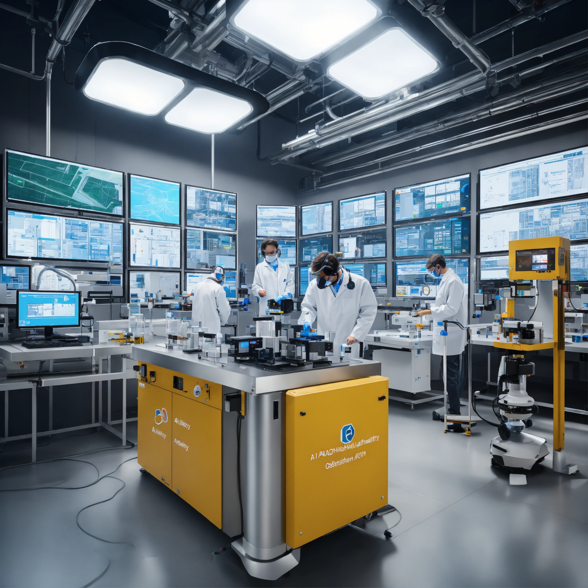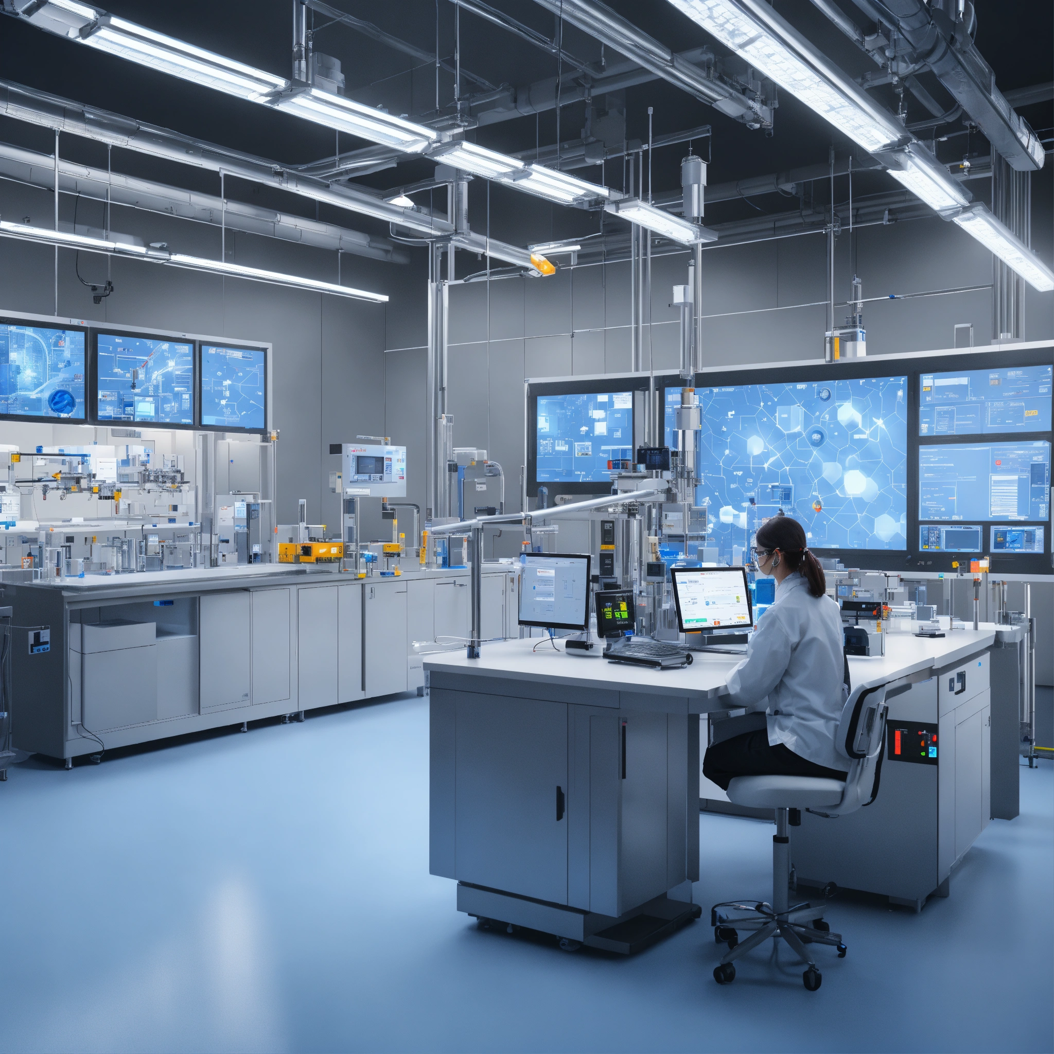 Photorealistic visualization of an advanced laboratory setting, showcasing ai-driven safety systems and industry 5.0 technologies actively promoting occupational health and safety.