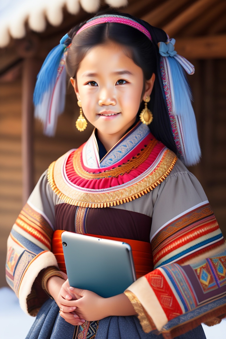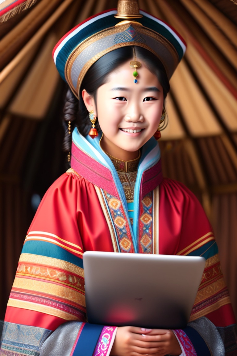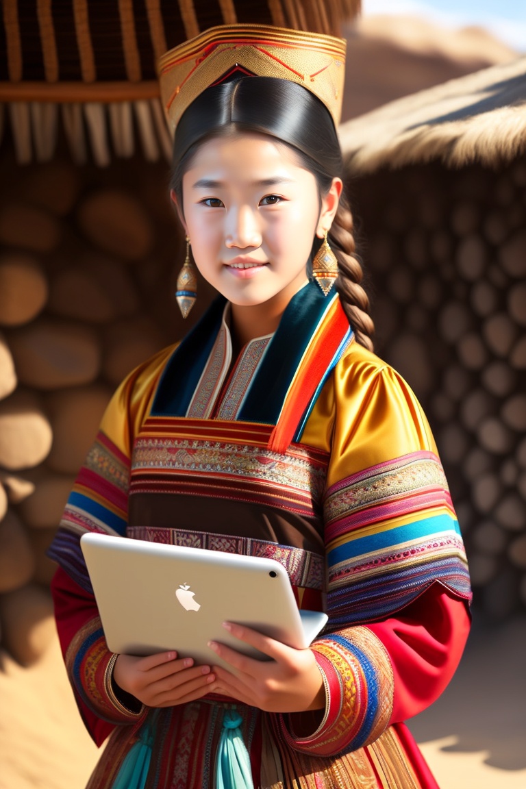 A beautiful girl in kyrgyz national clothes, in kyrgyz national ornaments and with two pigtails holds a macbook in her arms, stands in a kyrgyz yurt