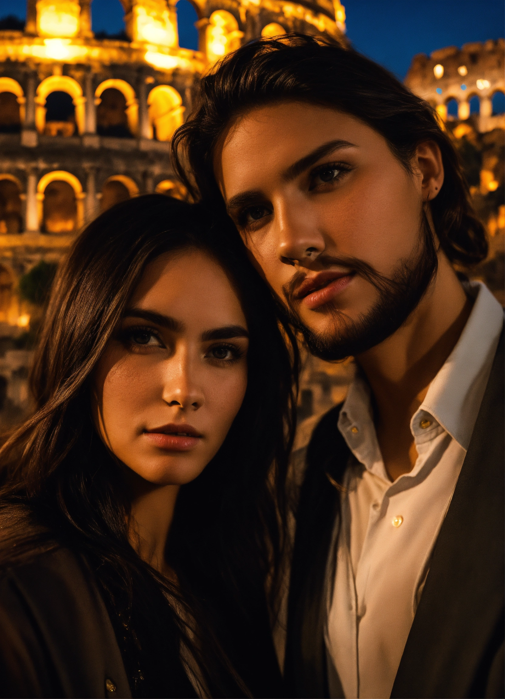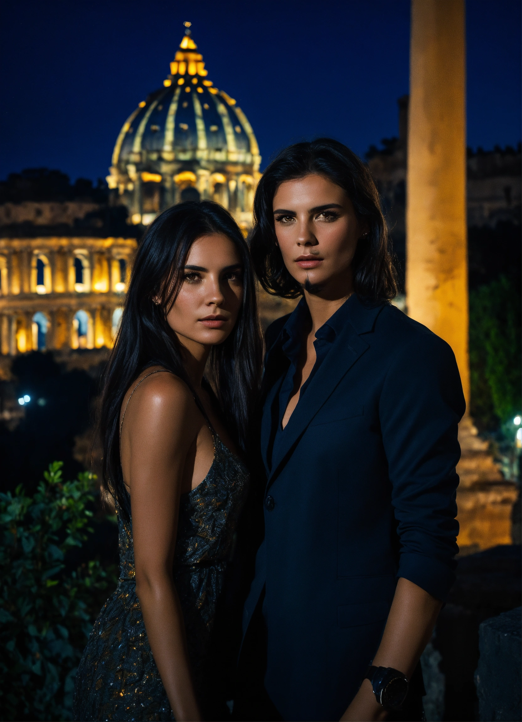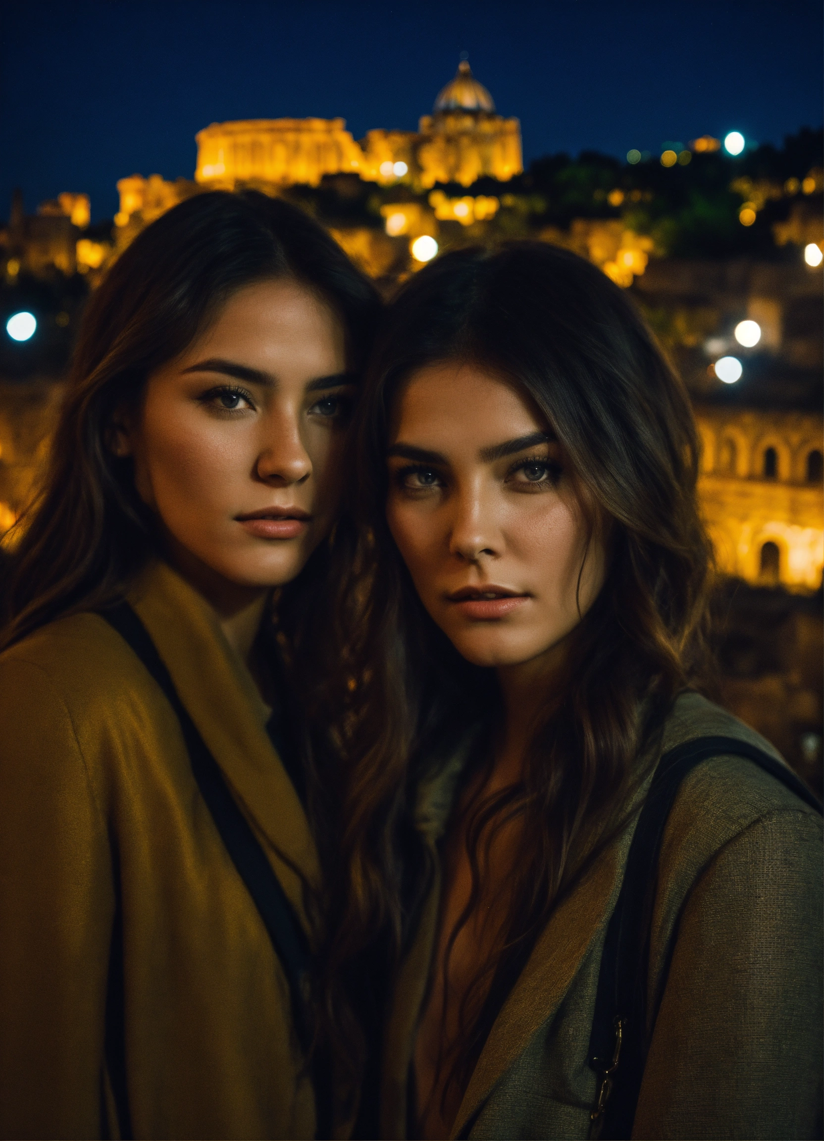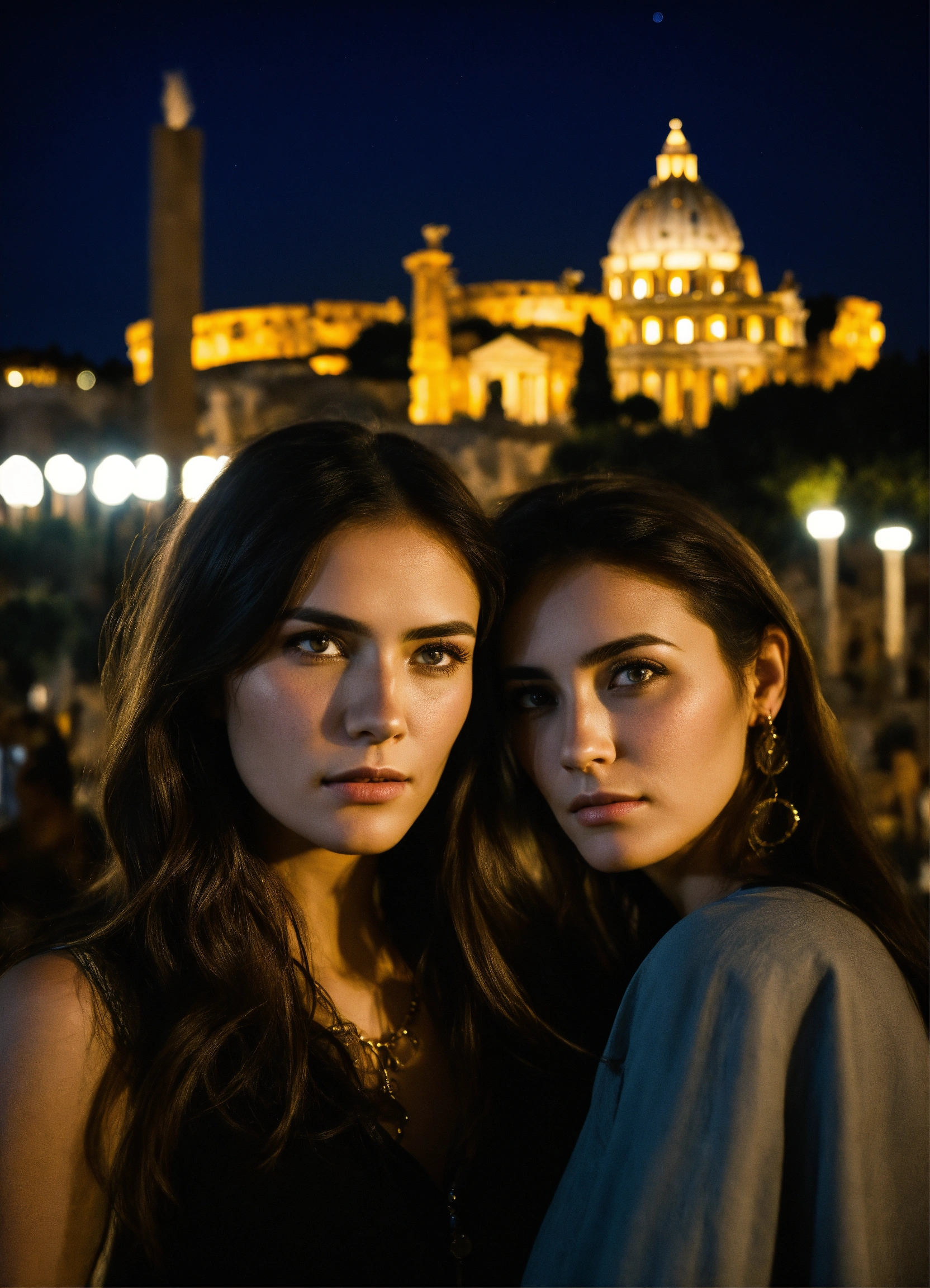 Photo of a modes two women with dark long hair with desire in his eyes, looking into the camera, in front of the forum romanum of rome head left looking in the camera in full view at night as background, realistic, portrait, not painted, very detailed faces, skin with pores, 4k, dark suit, skin not smoothed, looking into the camera, dark shirt. rome skyline in full view at night as background