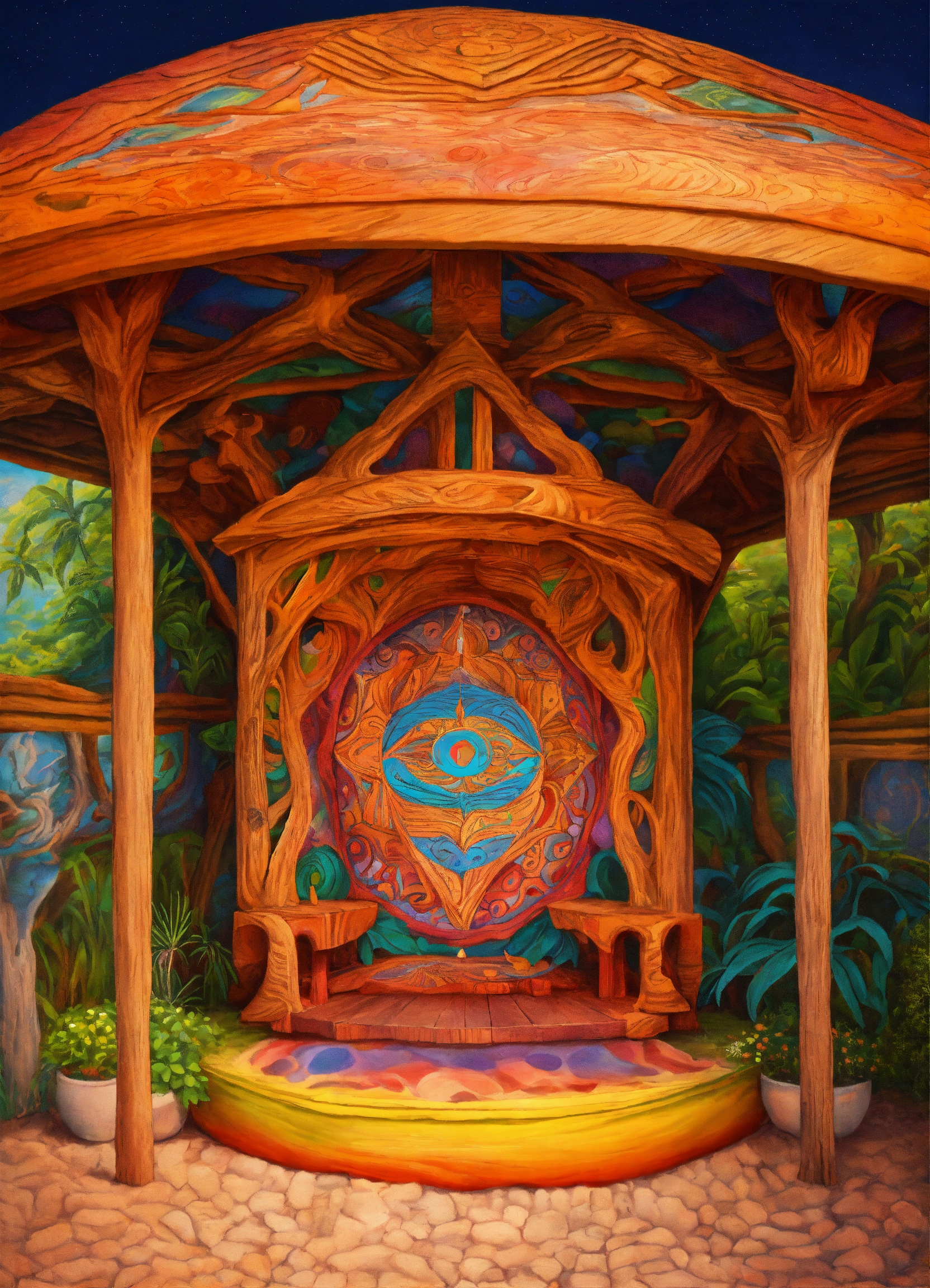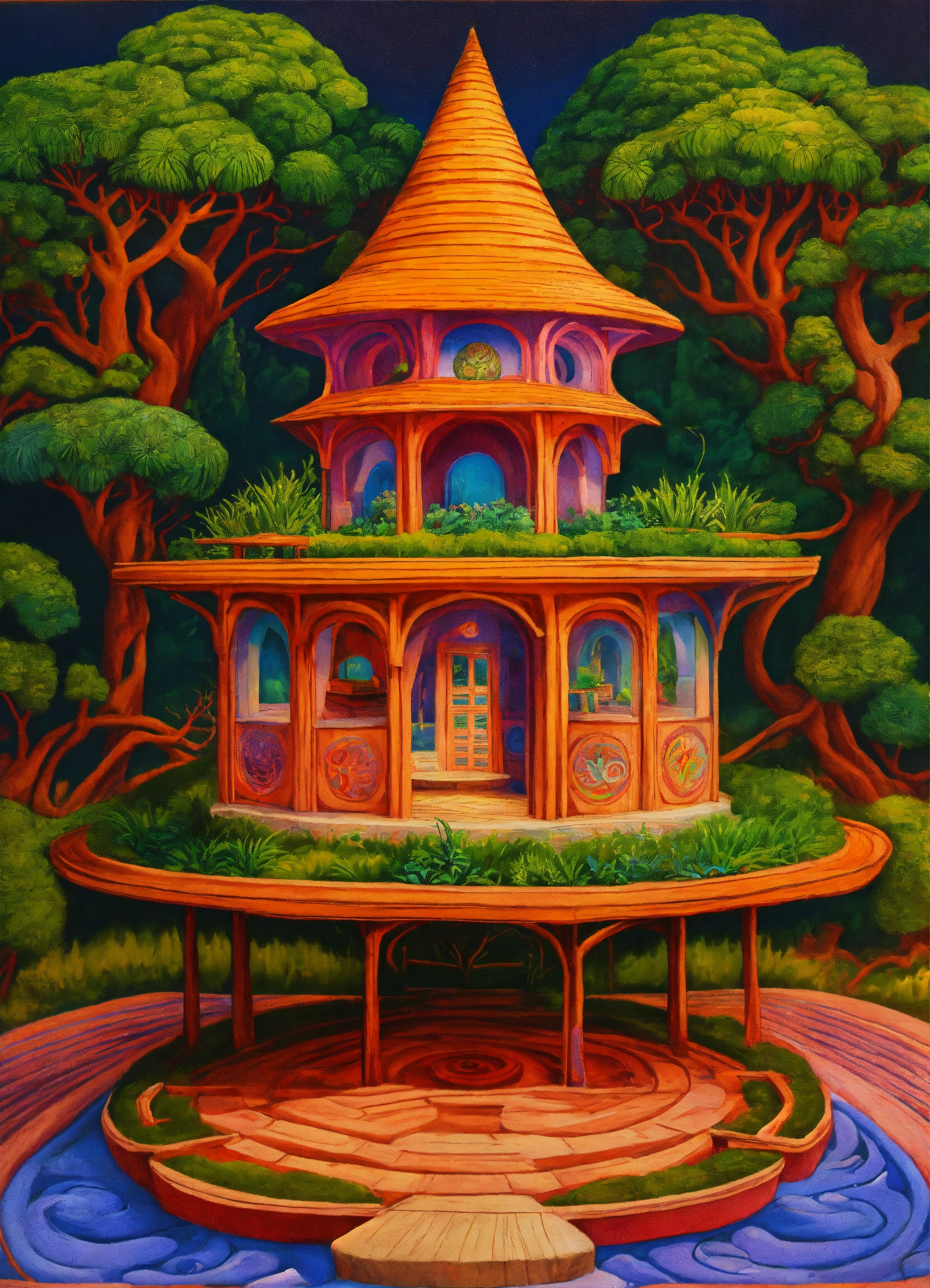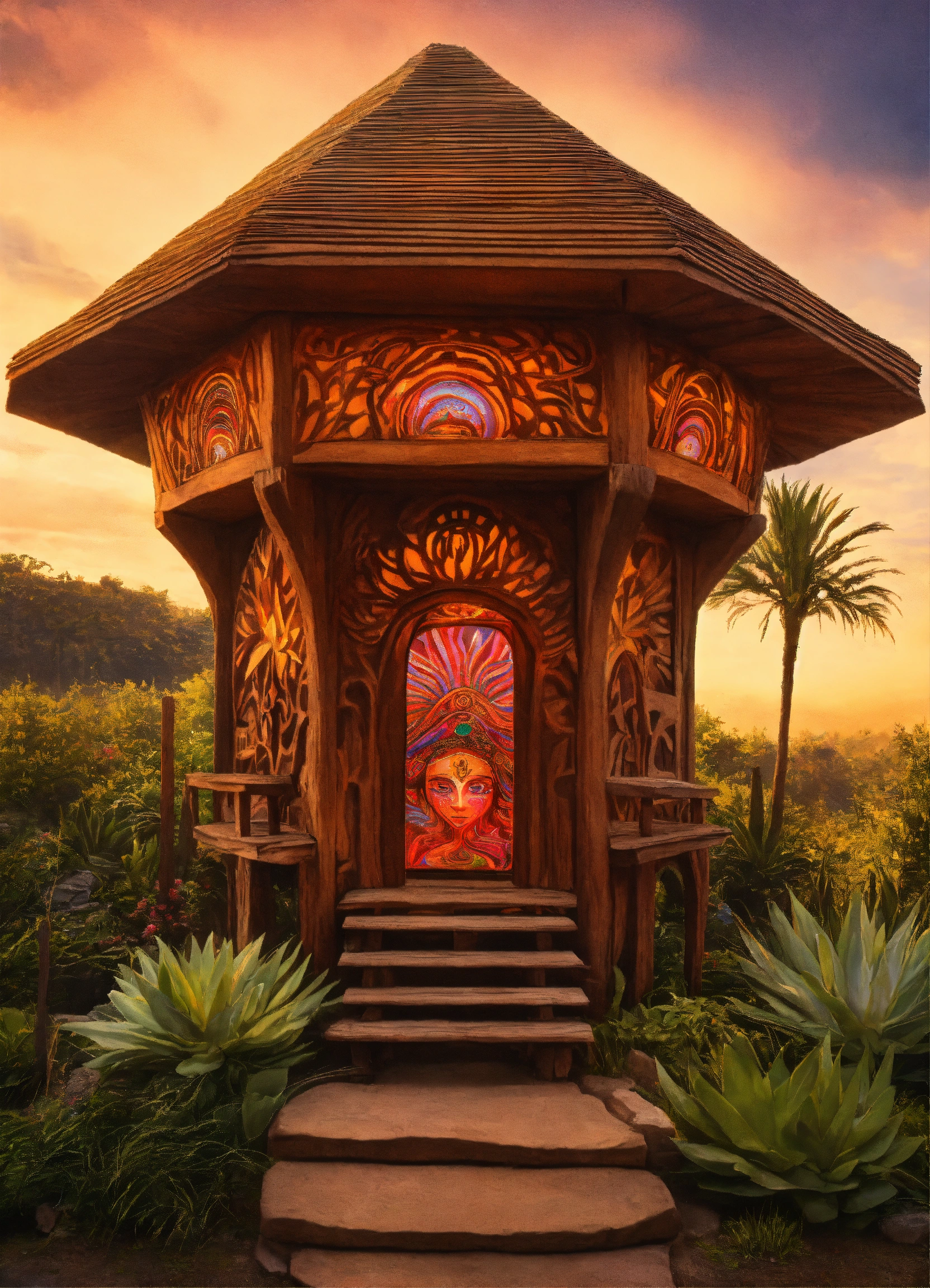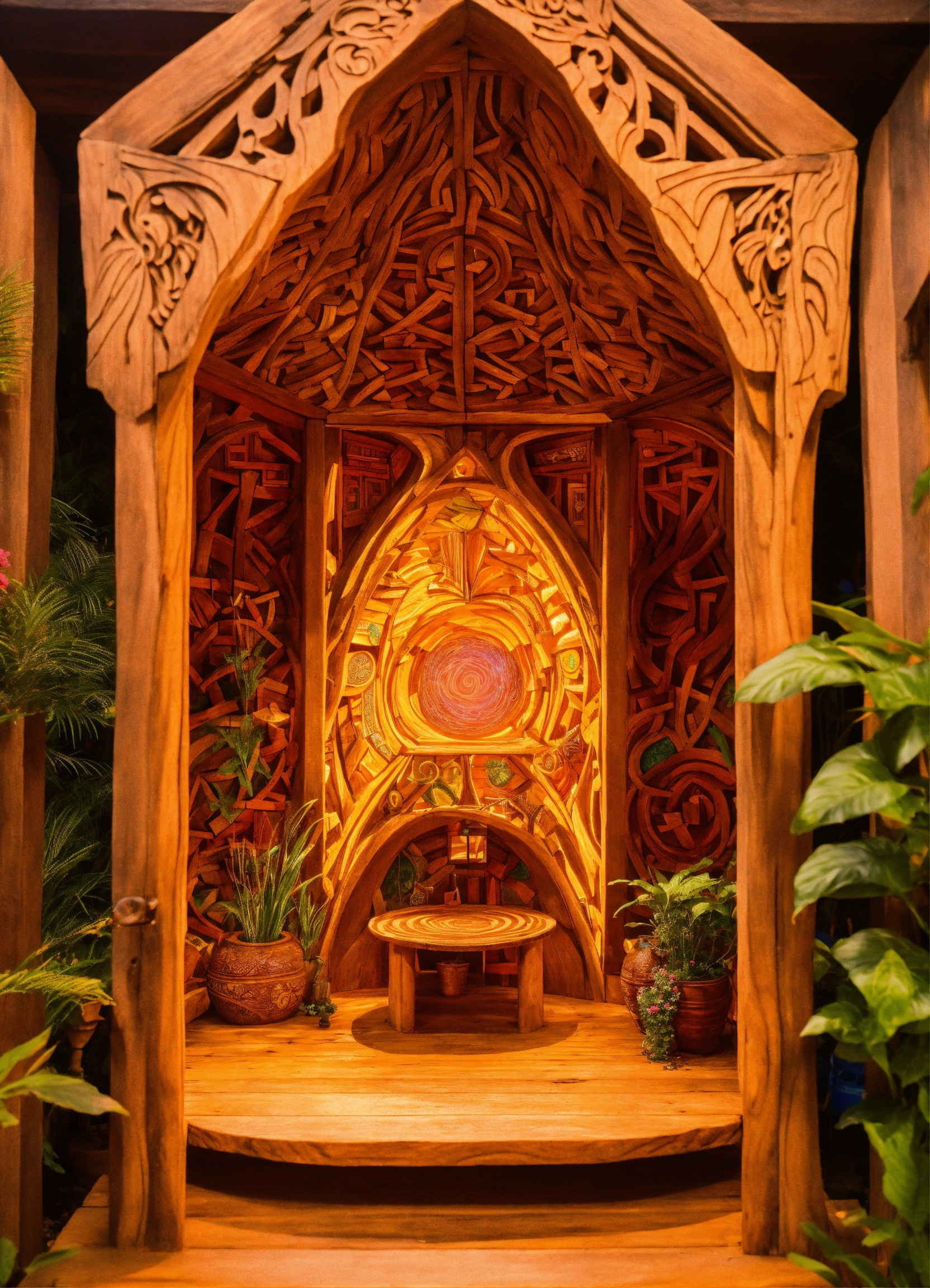 An ancient wooden hand made meditative garden sculptured hut in the style of alex grey