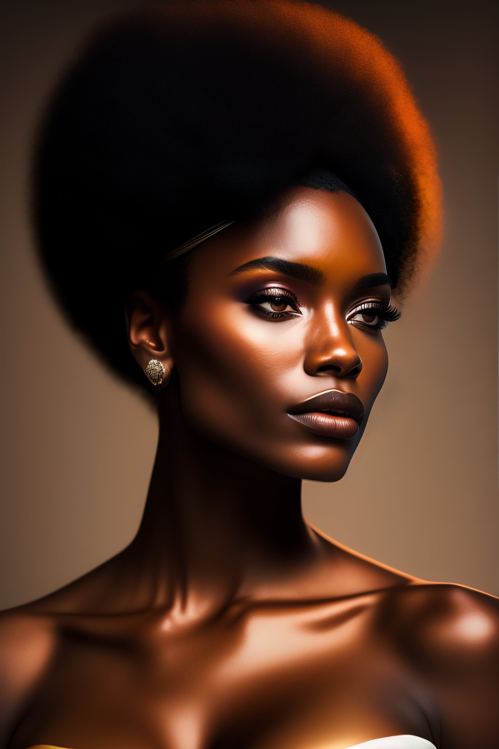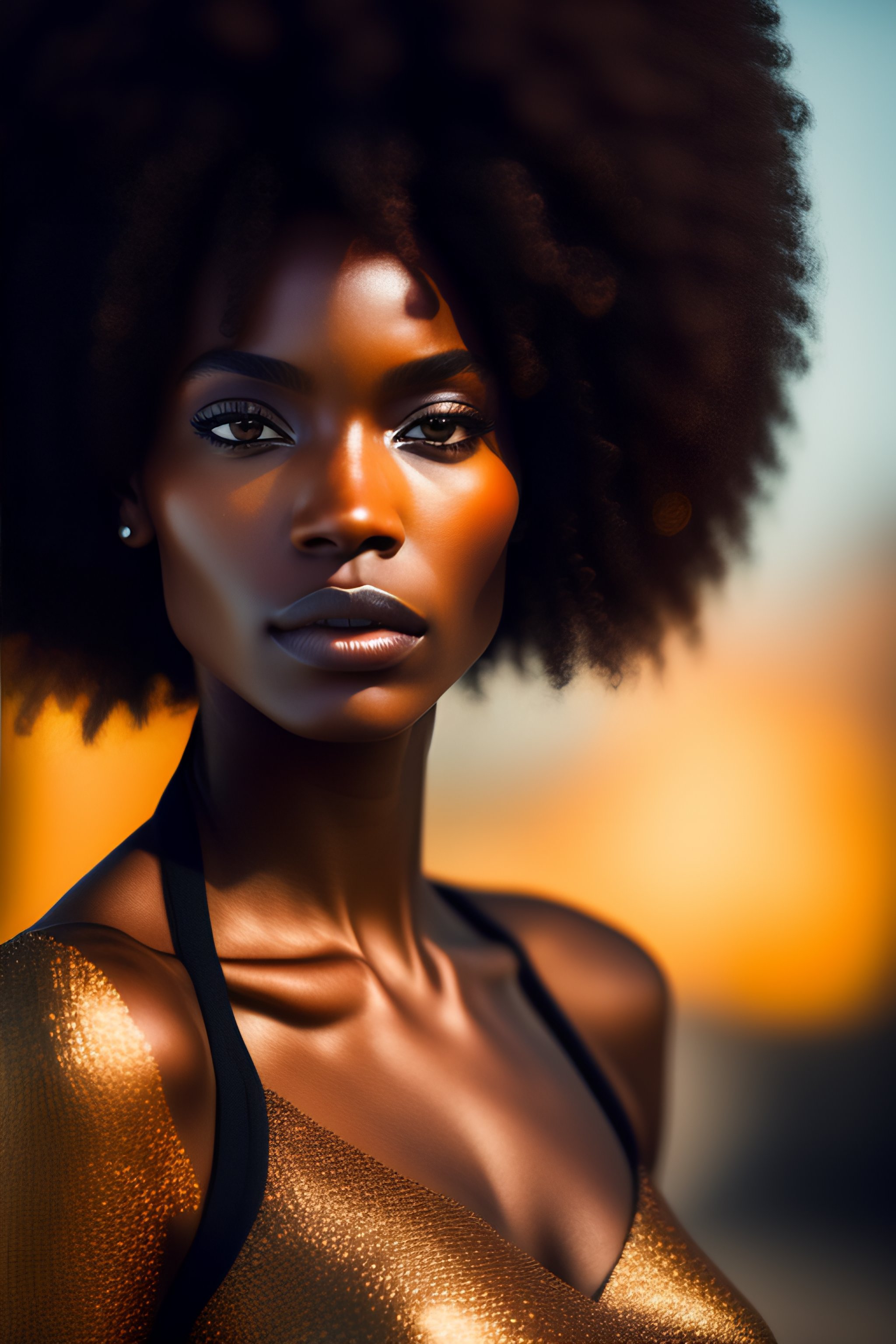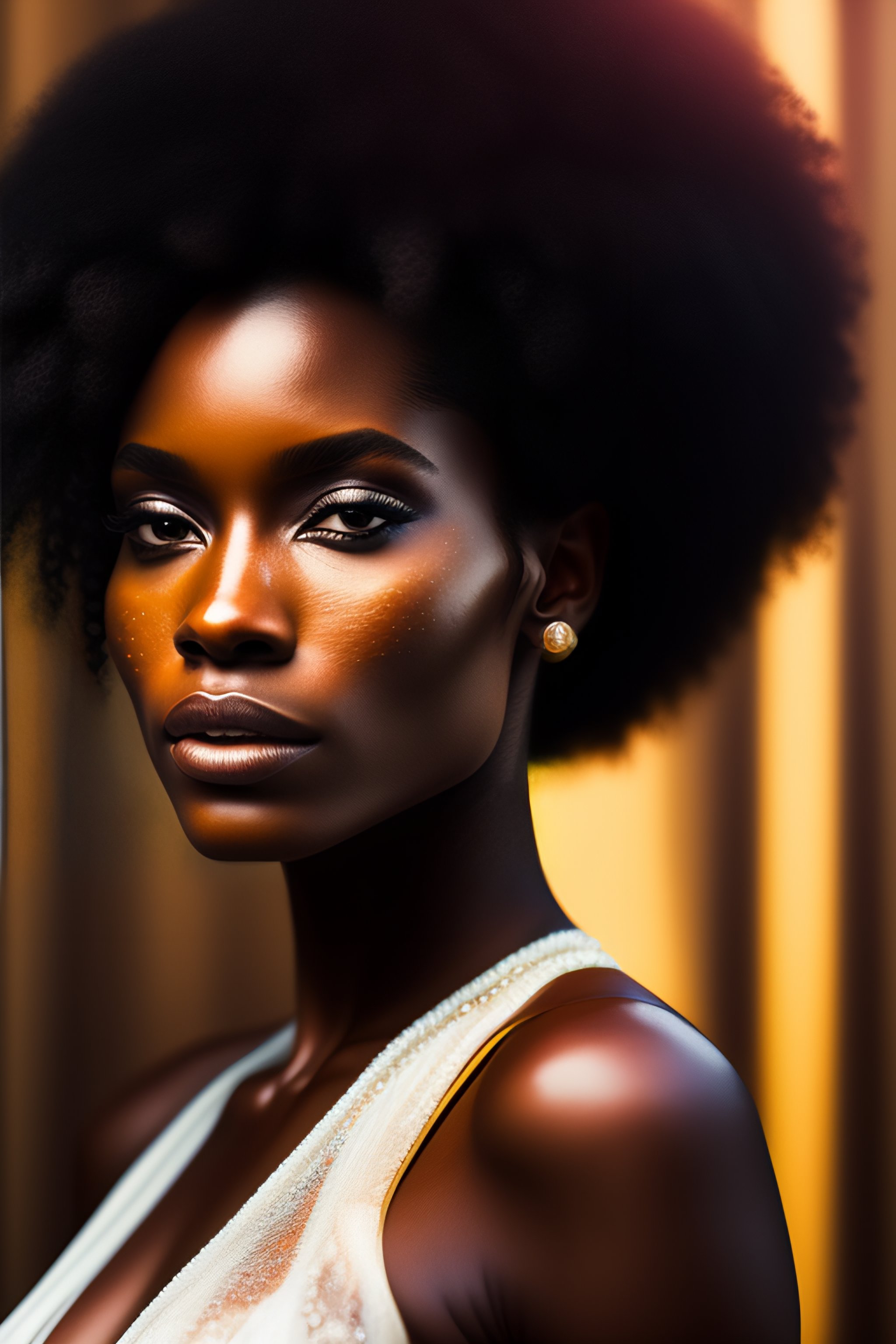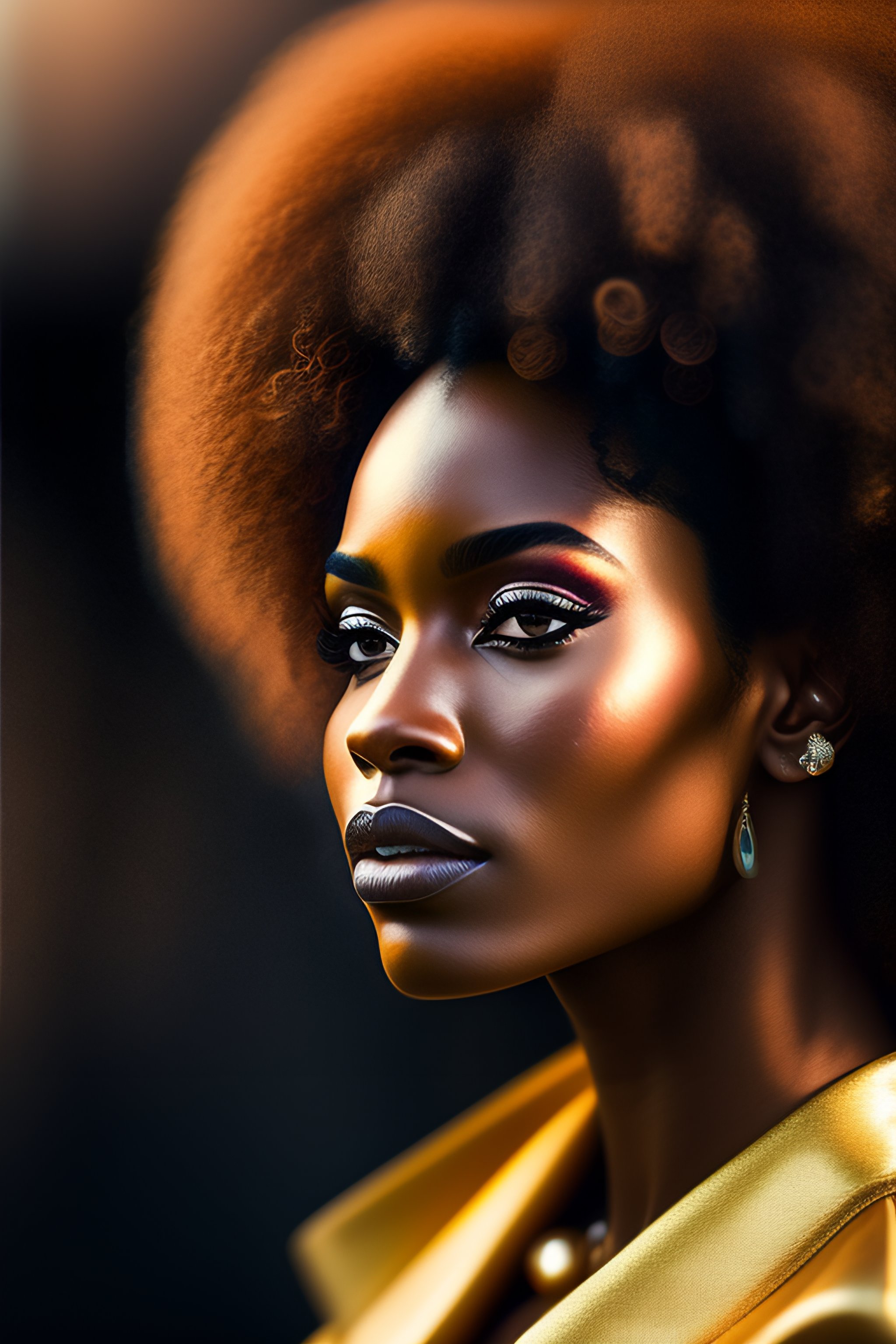 A beautiful and mysterious melanated woman with an afro no blur, close up, details, sharp focus, elegant, highly detailed, e2 in the background