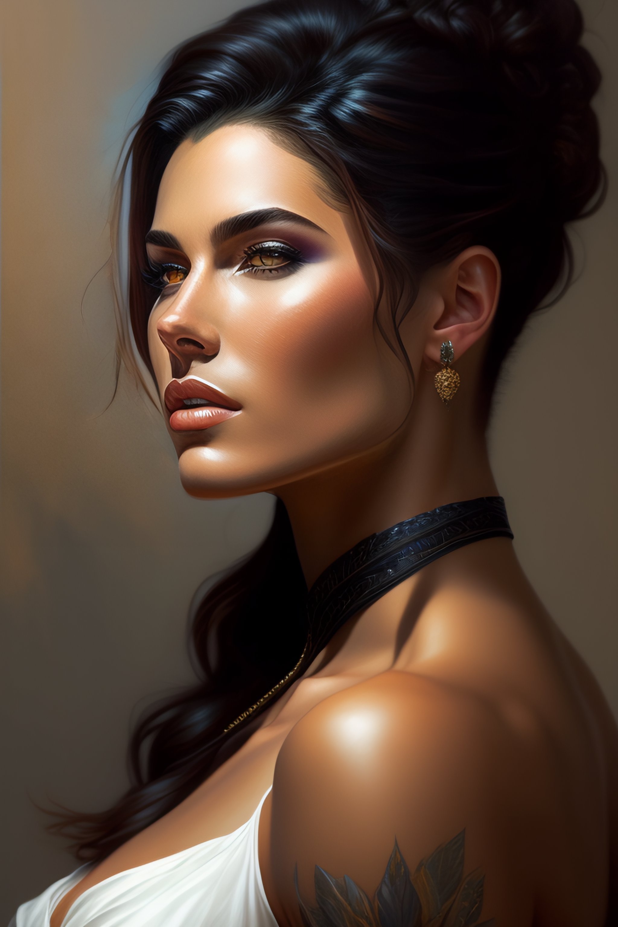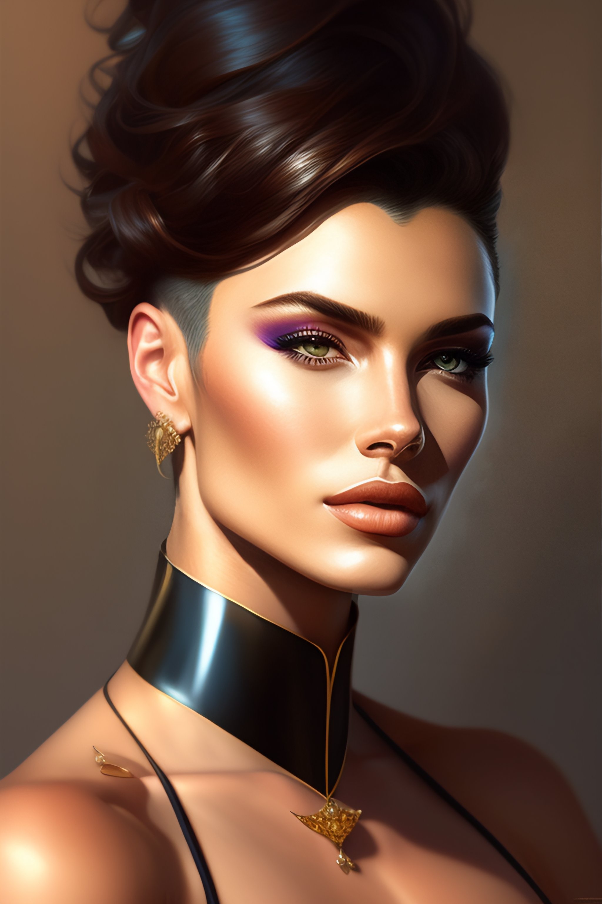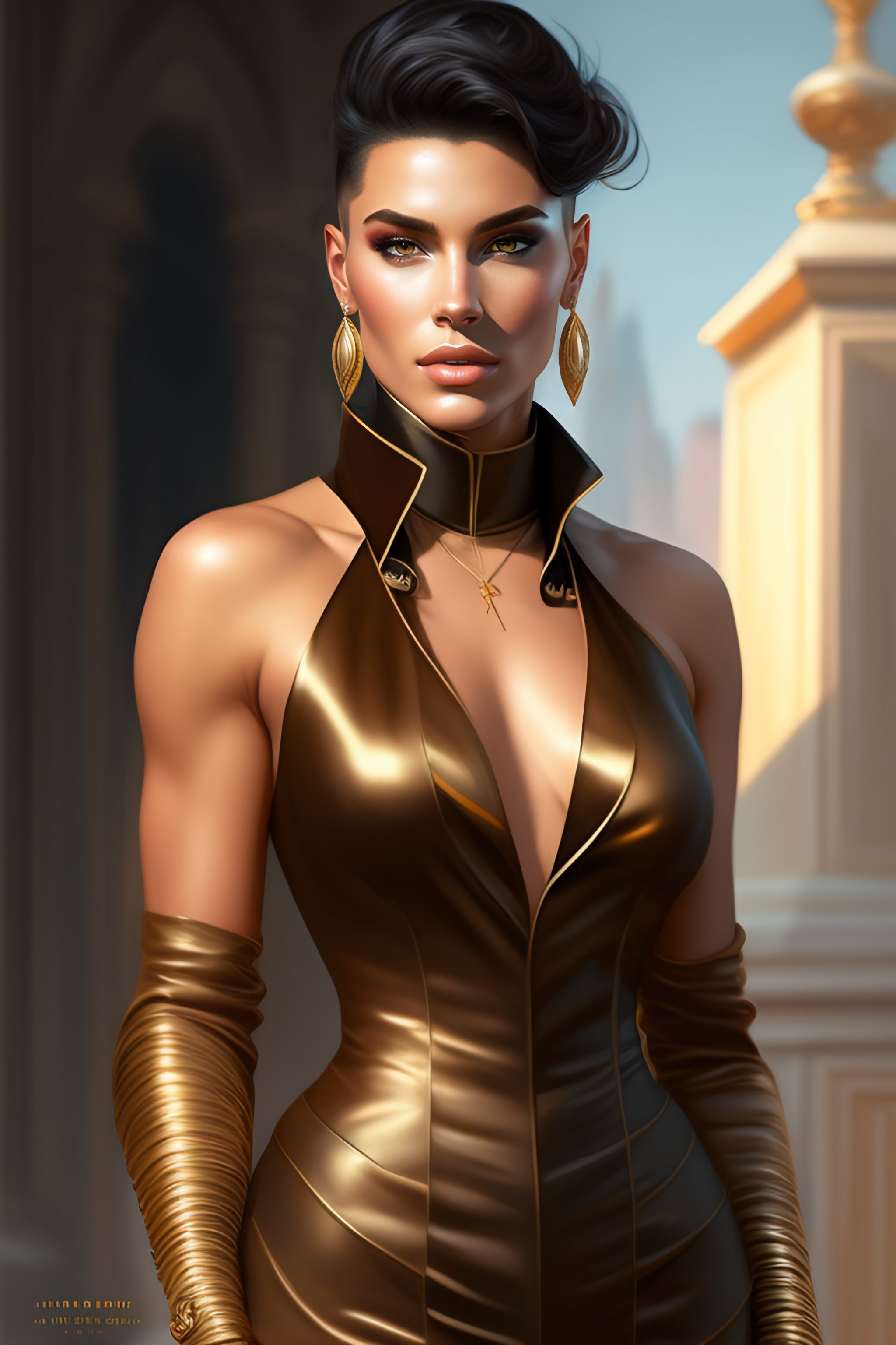 Photorealistic portrait of a young butch professional woman, handsome, male, feminine, upper body, fantasy, fierce, sharp features, intricate, elegant, highly detailed, digital painting, artstation, concept art, matte, sharp focus, illustration, art by artgerm and greg rutkowski and alphonse mucha