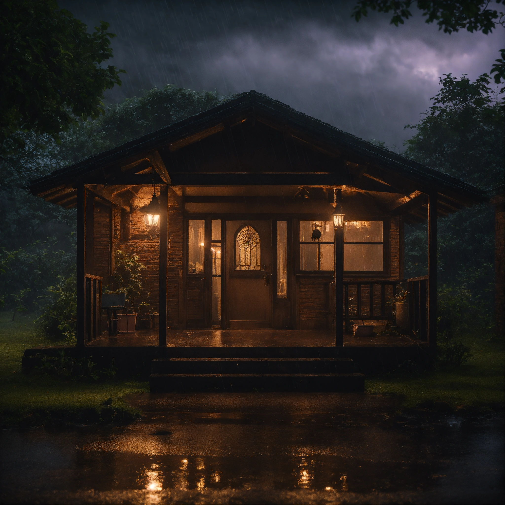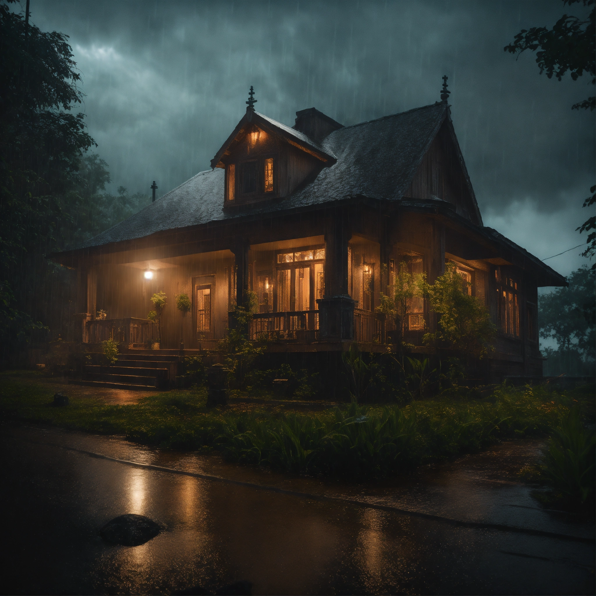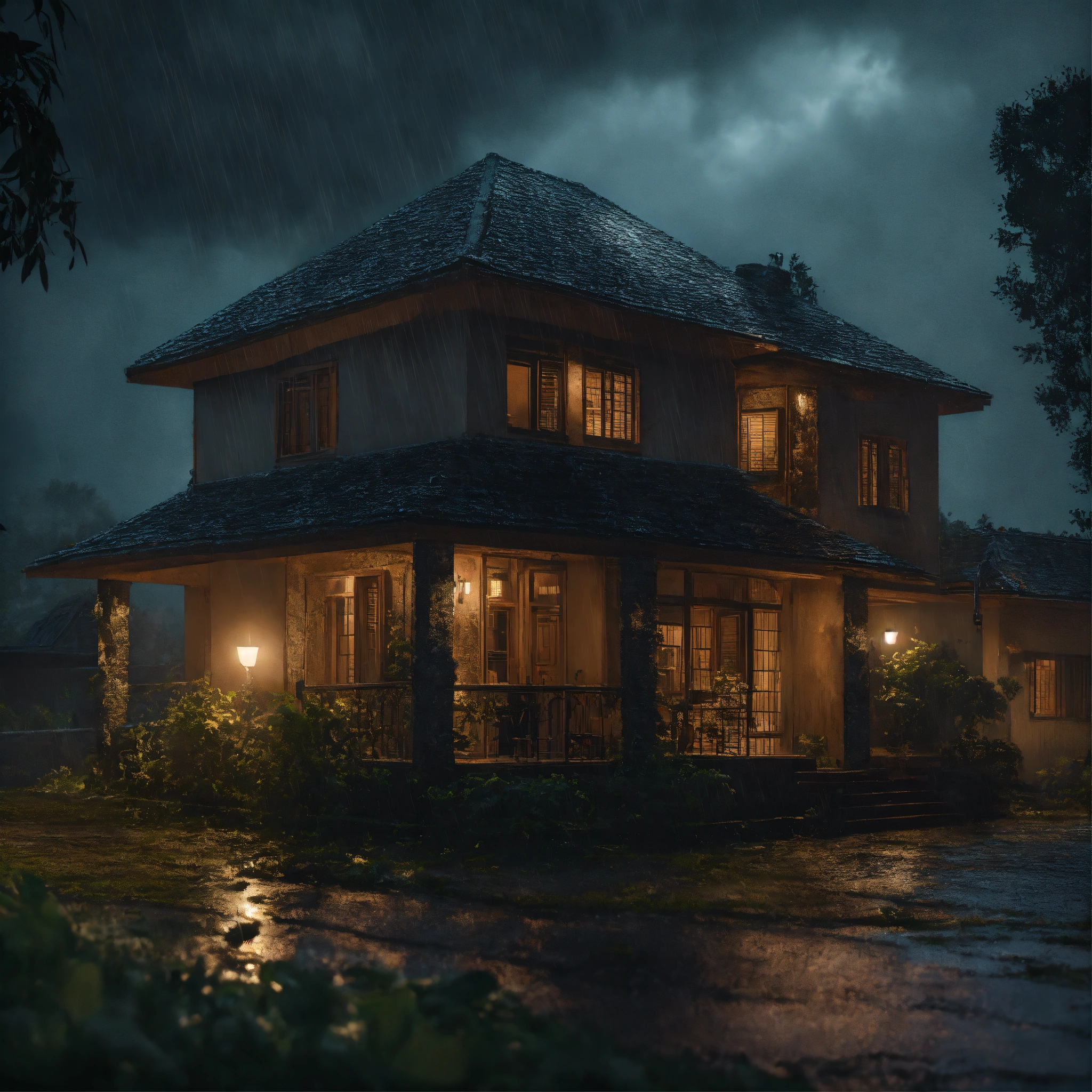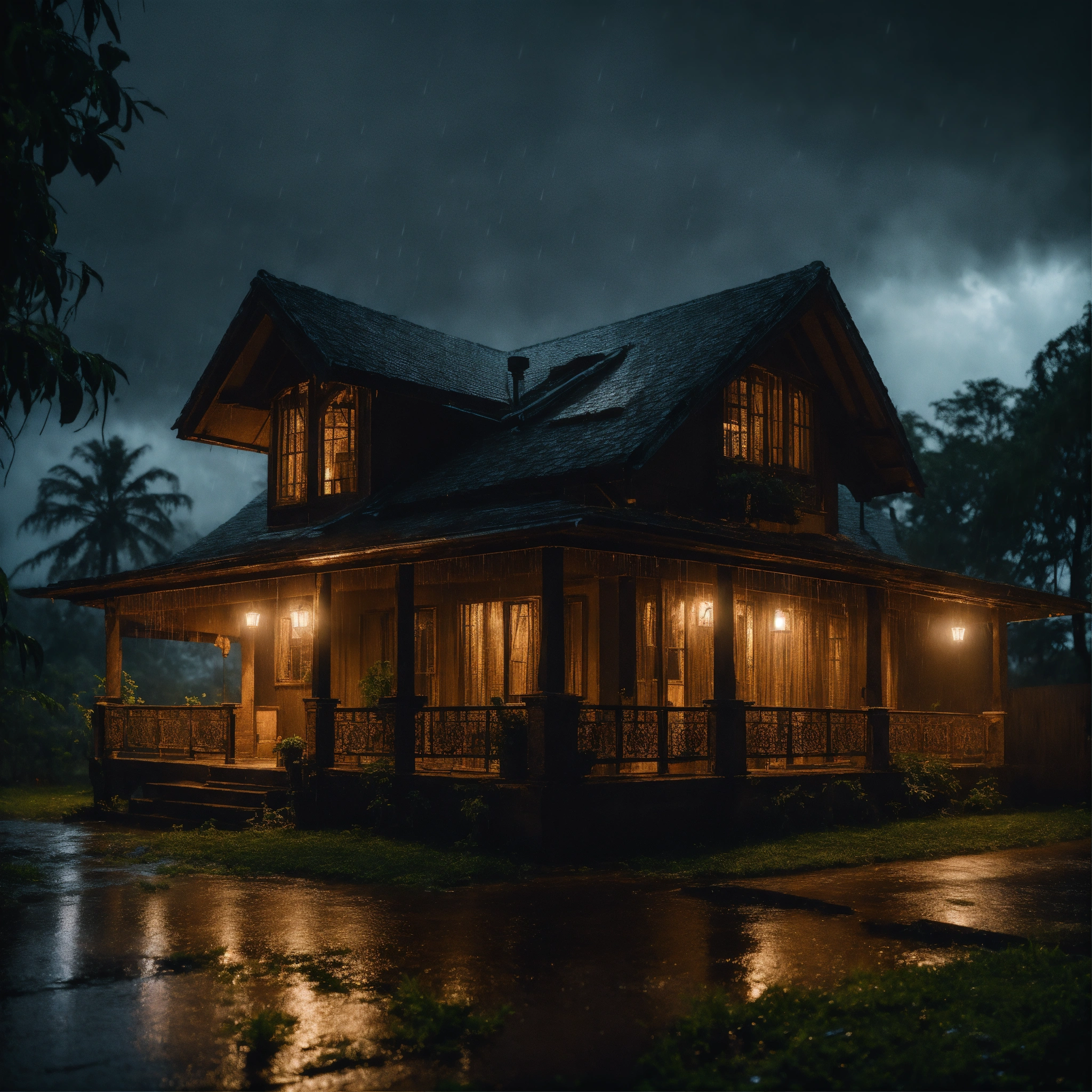 Medium close-up, spooky scary bungalow in heavy rainfall darkness, moody lighting, best quality, full body portrait, real picture, intricate details, depth of field, fujifilm xt3, beautiful lighting, raw photo, 8k uhd, unreal engine 5, ray tracing, extremely detailed, realistic photo, 4k realistic photo.