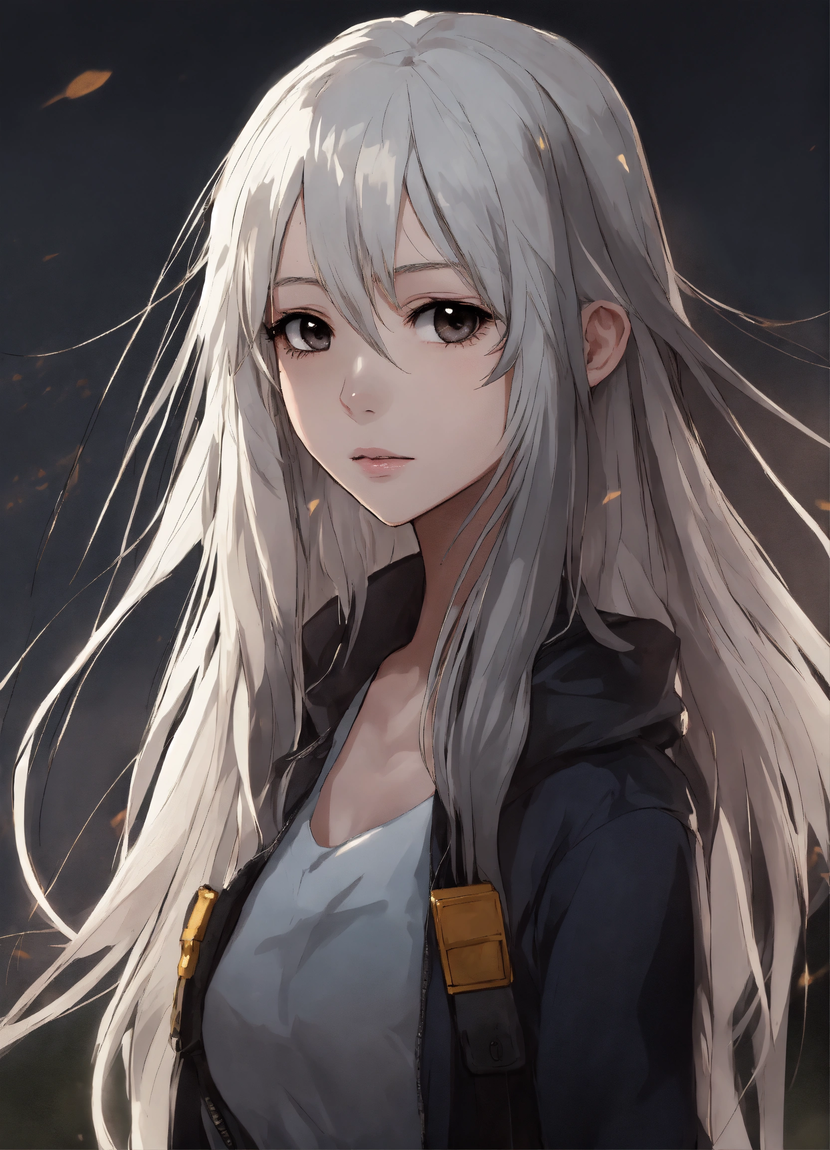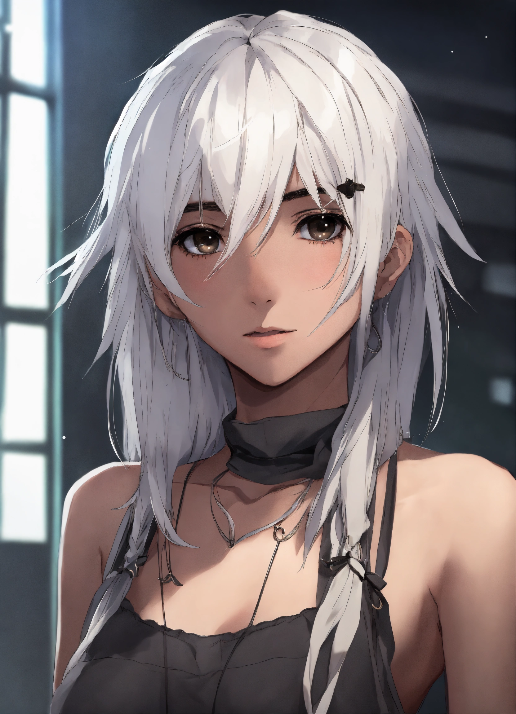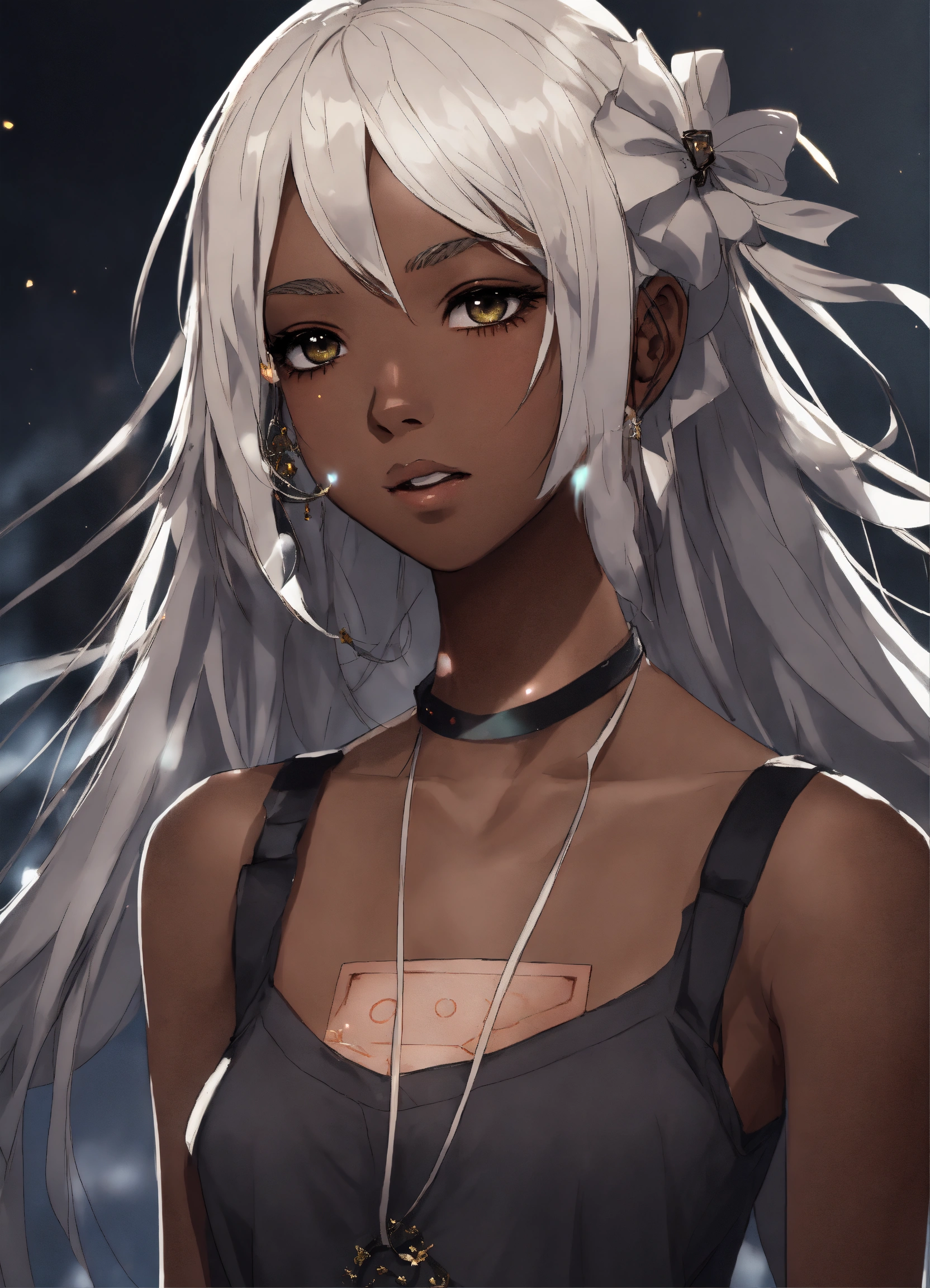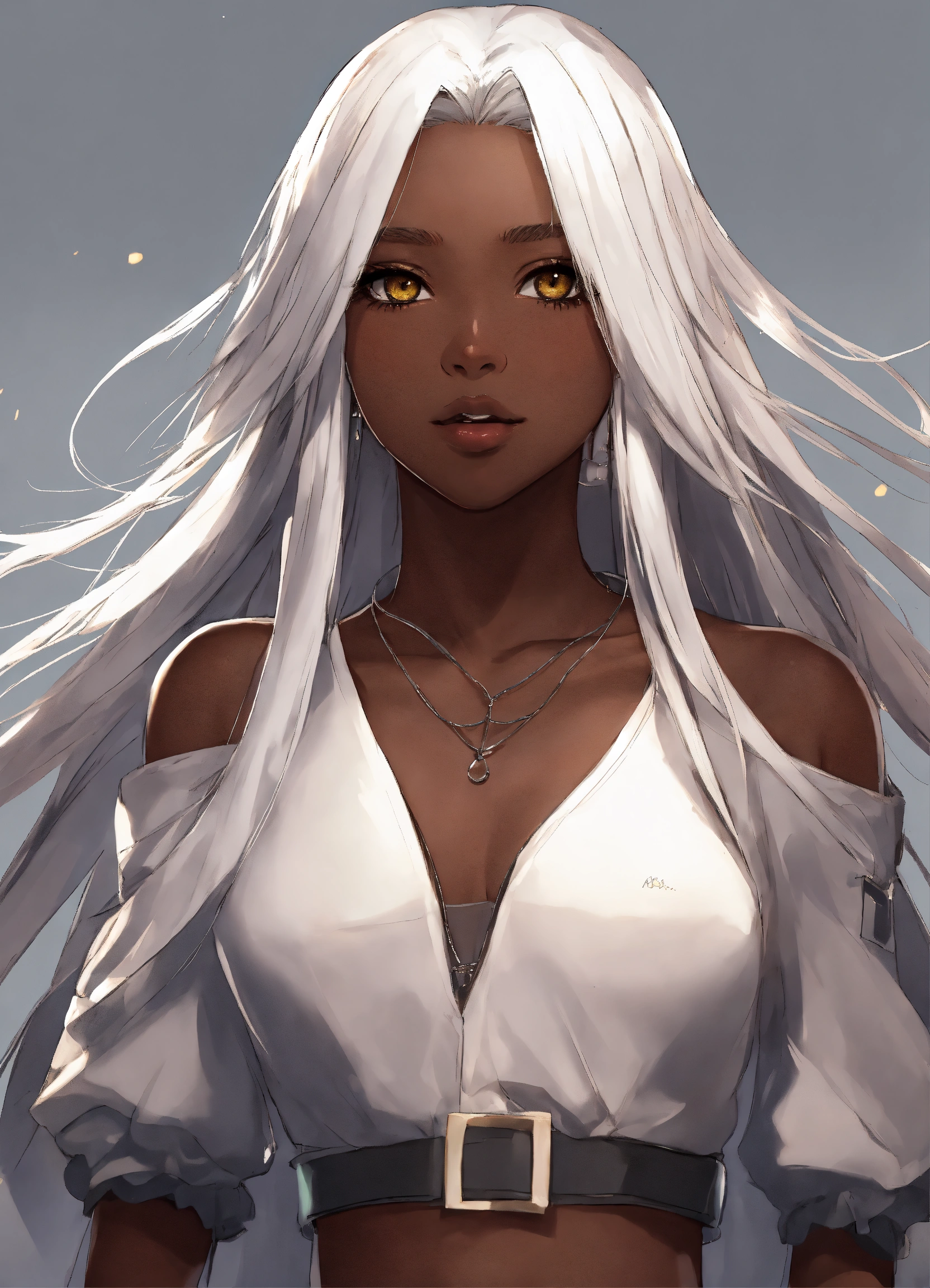 Girl 17 years old, dark skin, white straight hair, black eyes, fragile figure, height 173, anime reskin style