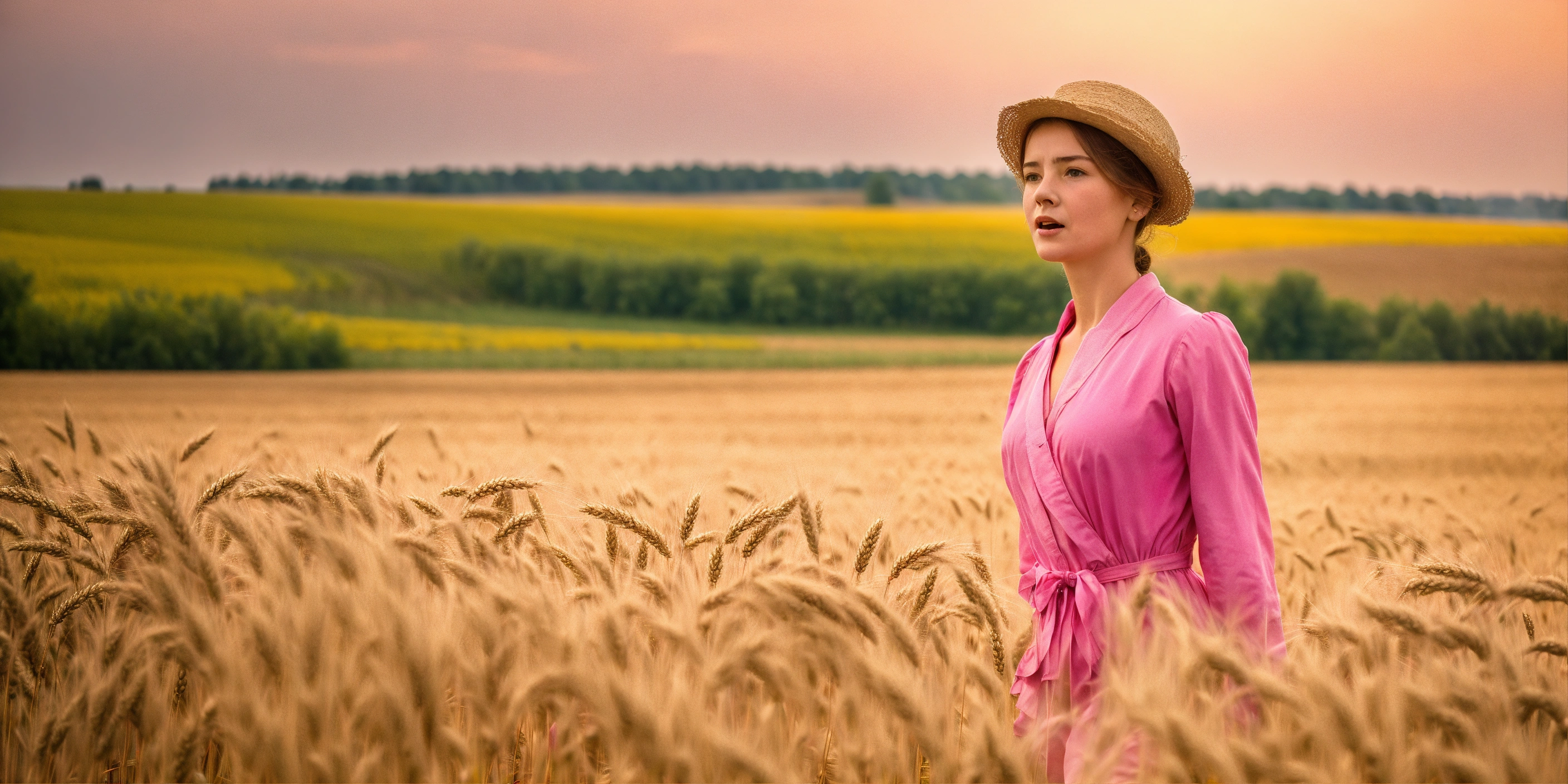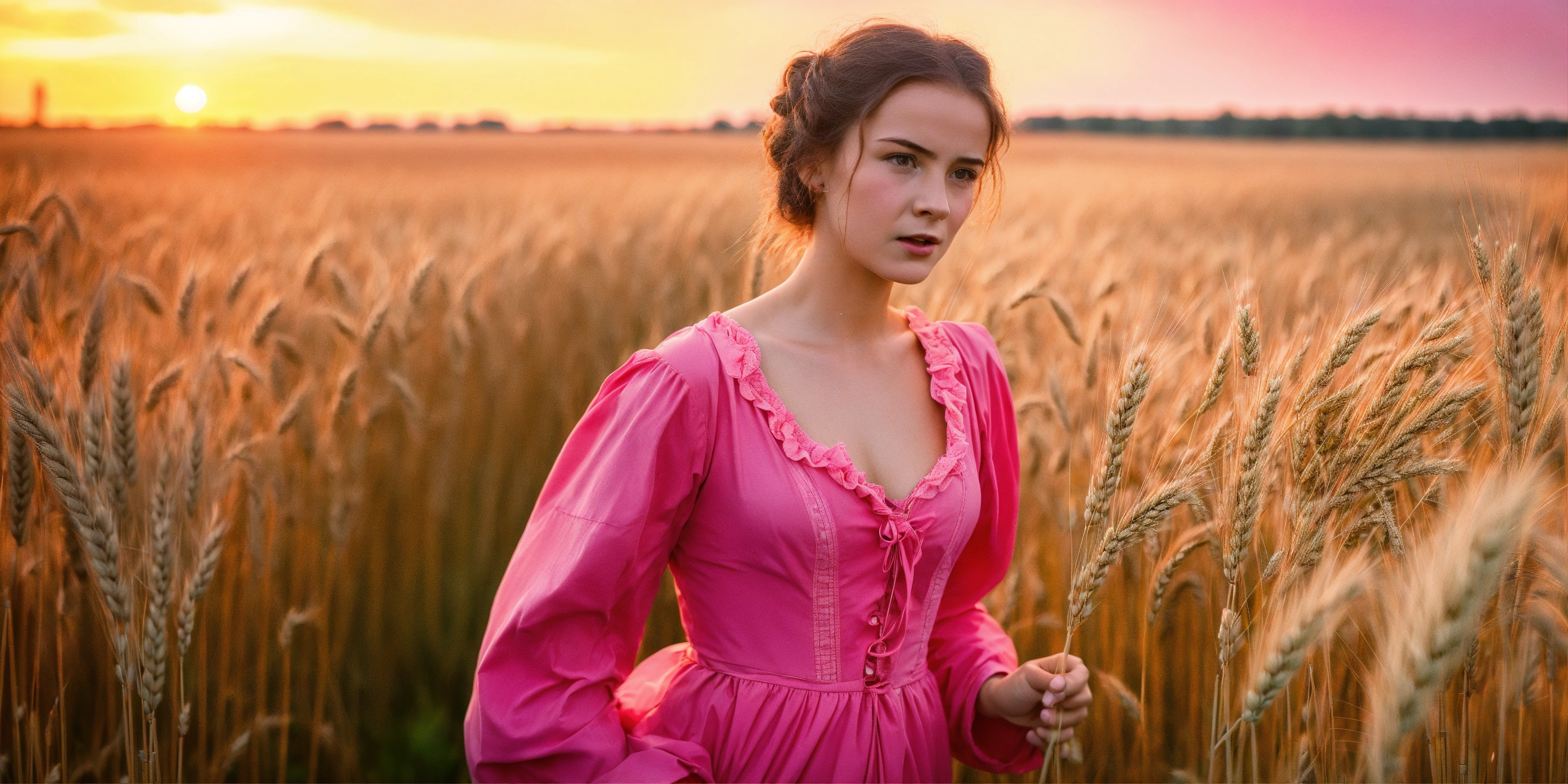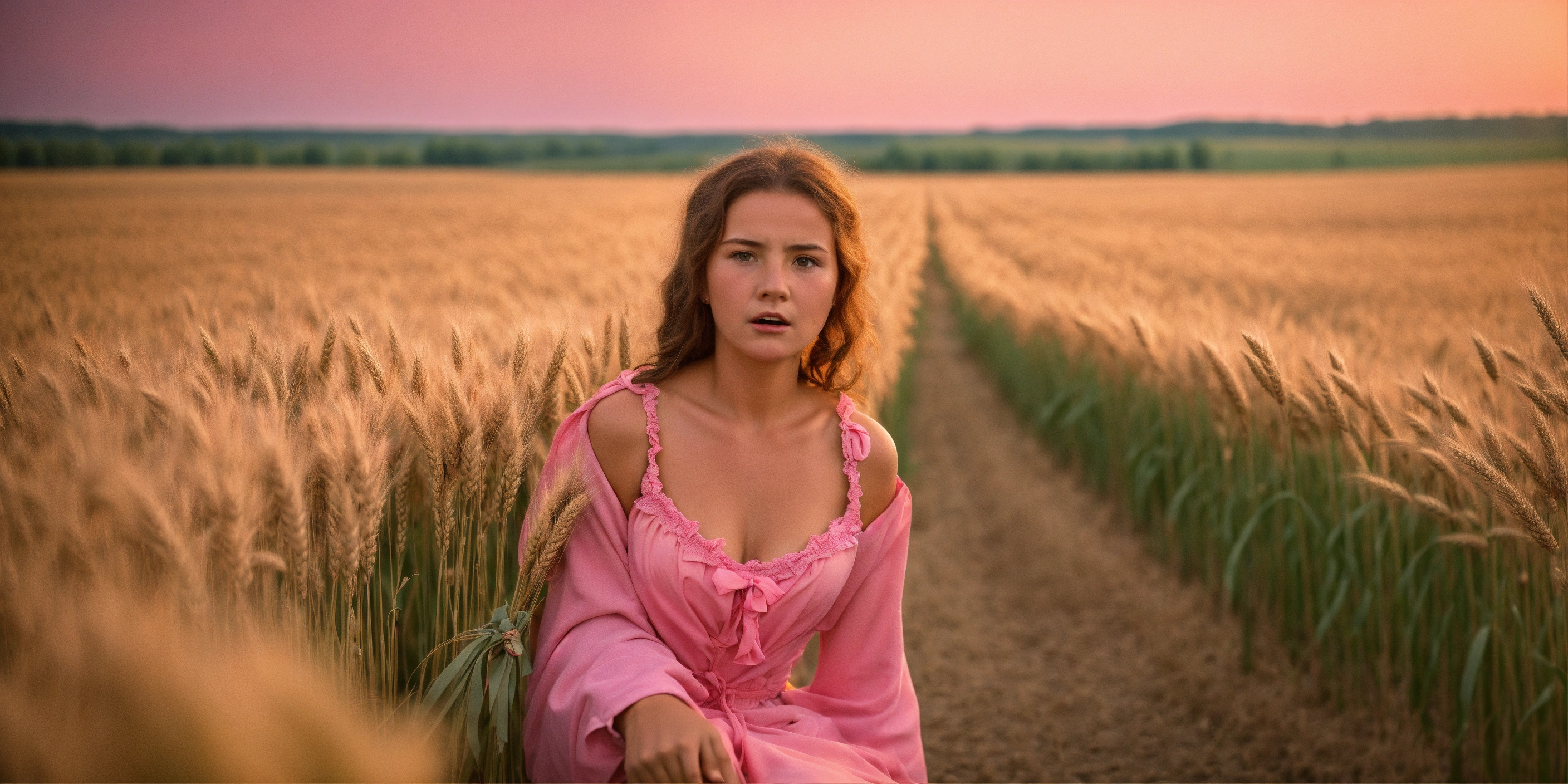 19th century young lady in a pink swimming suits waking up, field of wheat in ukraine, facial expression remember nothing, confused, stressed