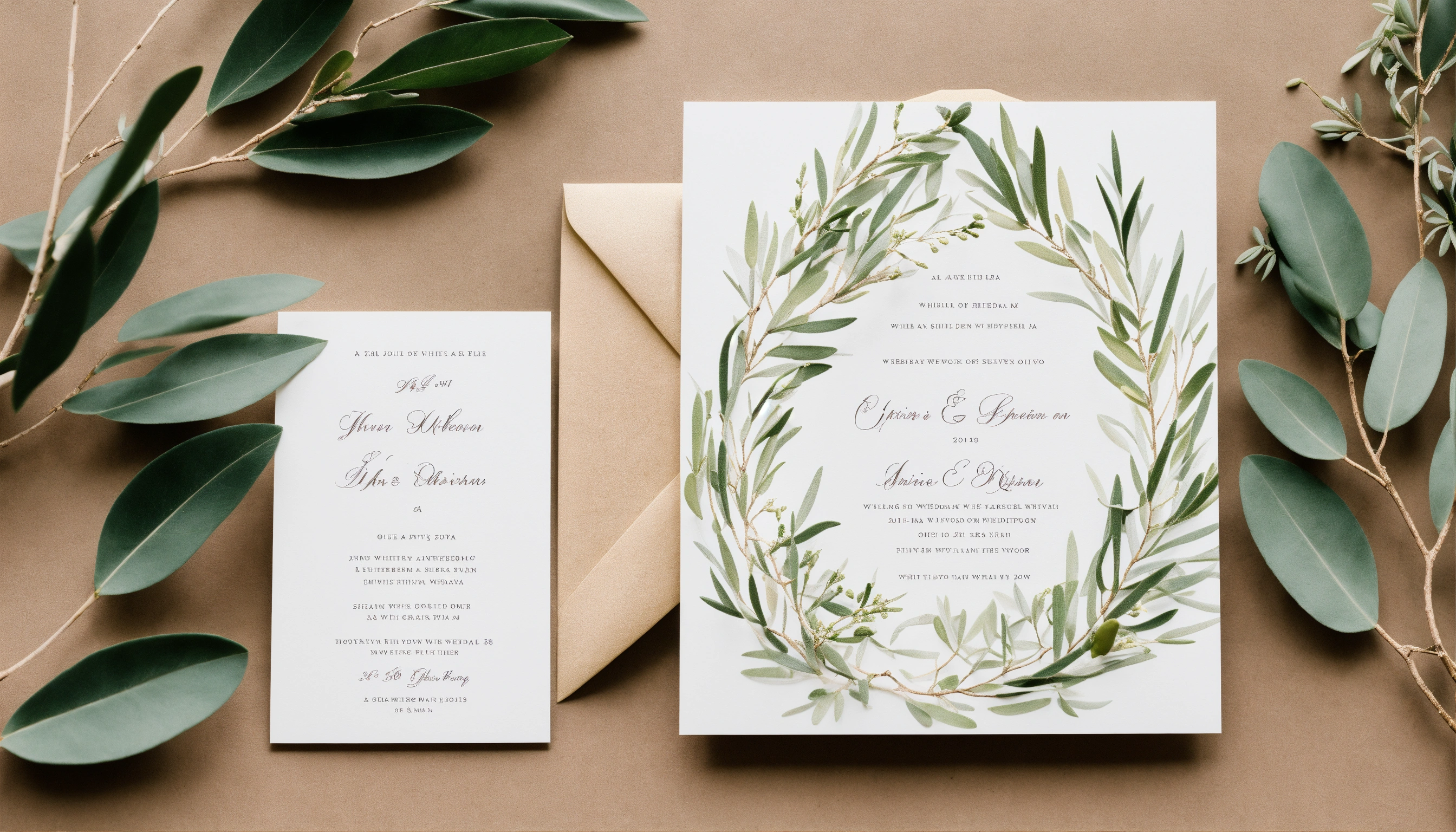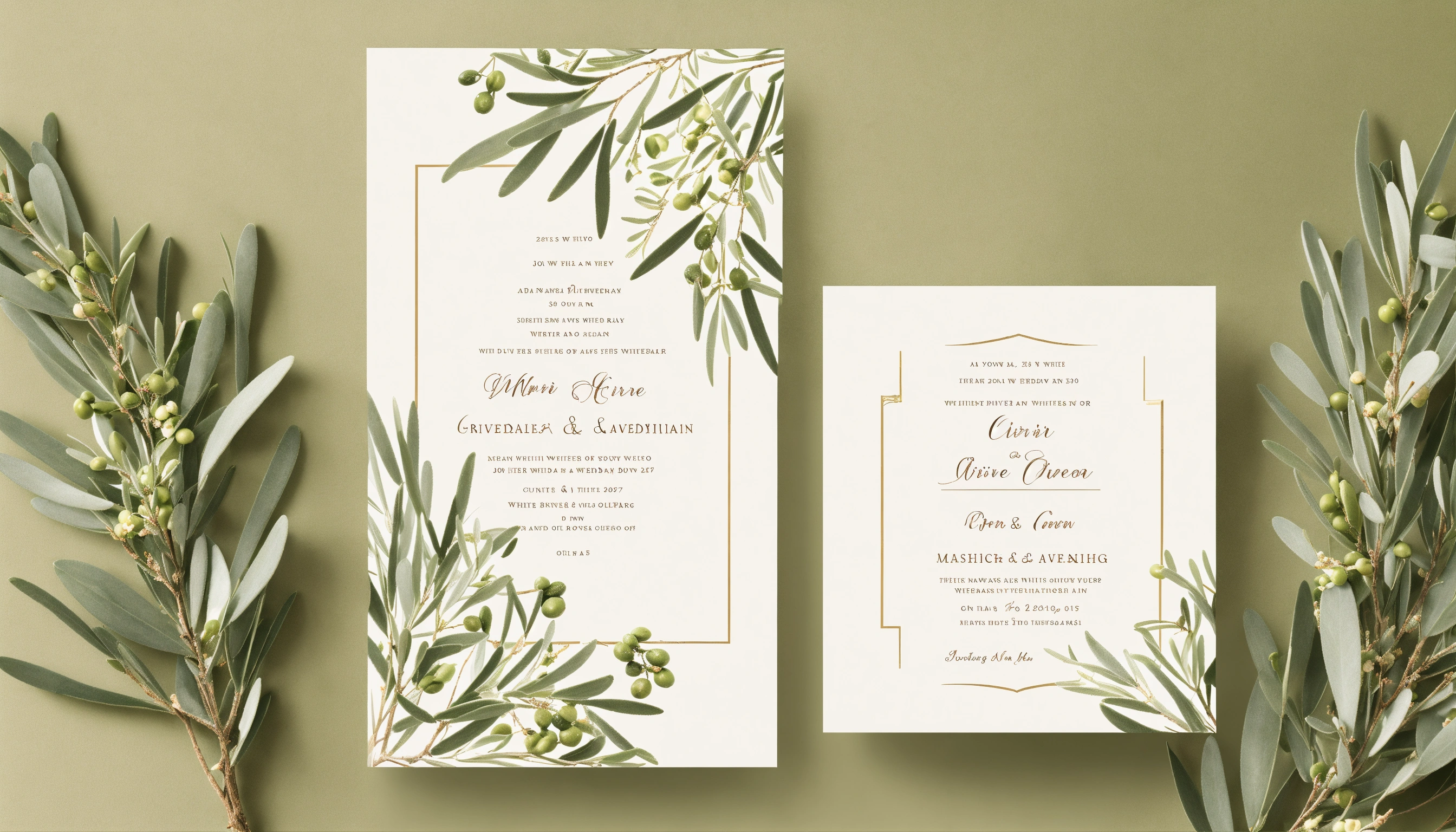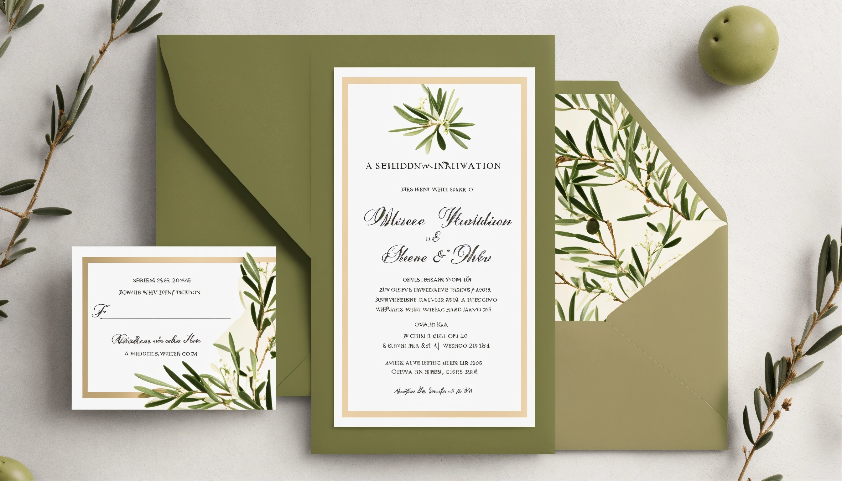 A white wedding invitation with a white background and with branches of an olive trees on it