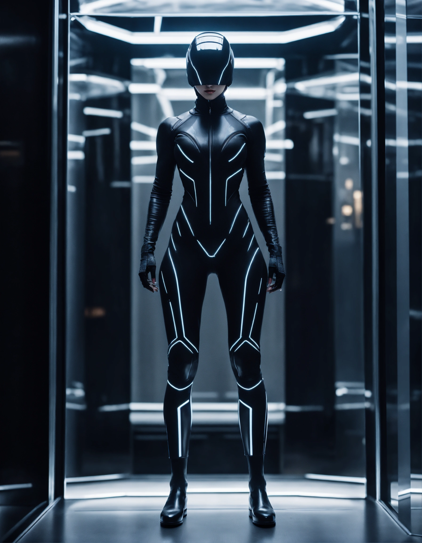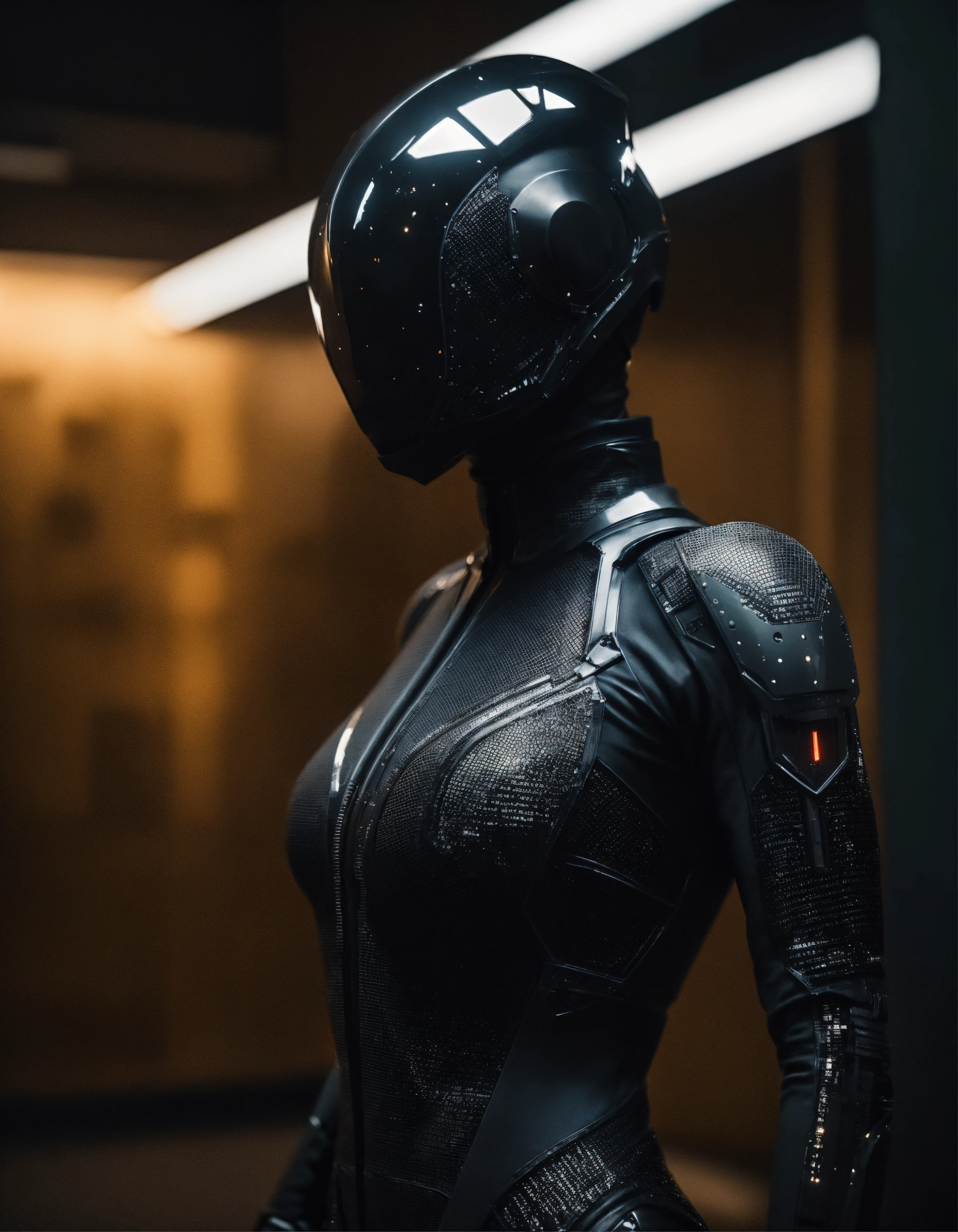 An ultrarealistic photograph of a minimalist futuristic full body power suit, without lights, made of black mate metal and polymer, full crystal hull, for a muscular strong woman, imposing, modern minimalism, elegant, dystopia, mysterious, godlike, scary, in a dark room, 8k