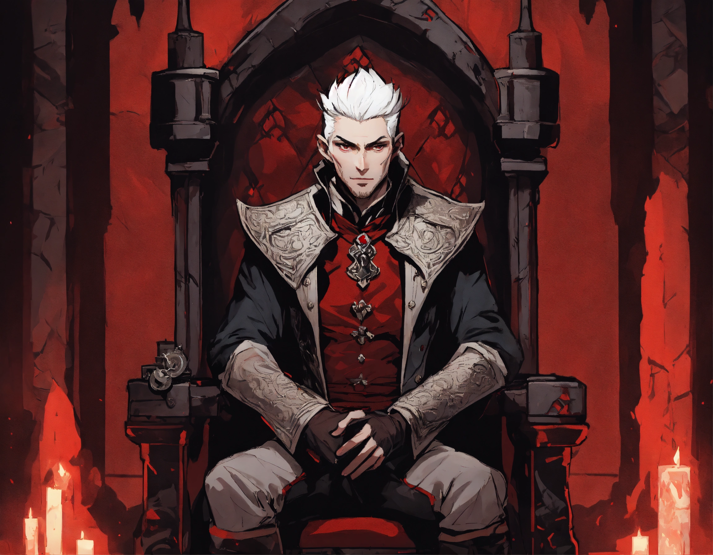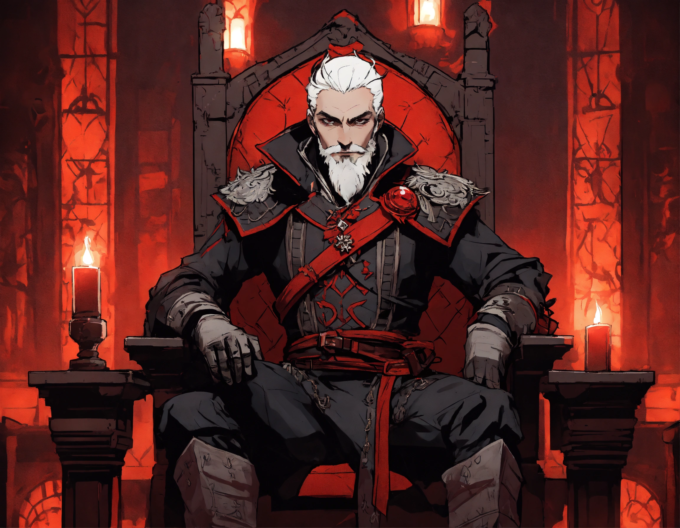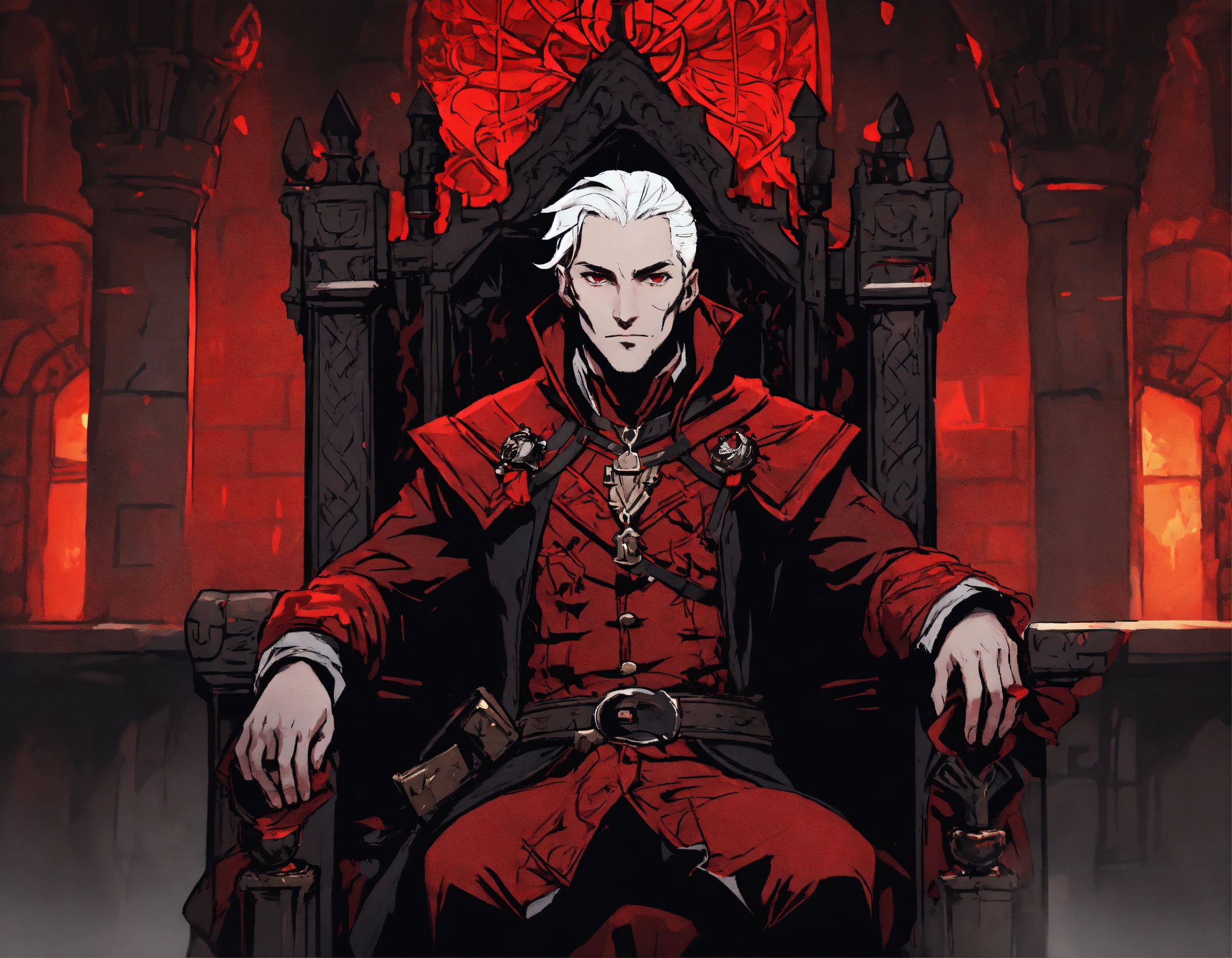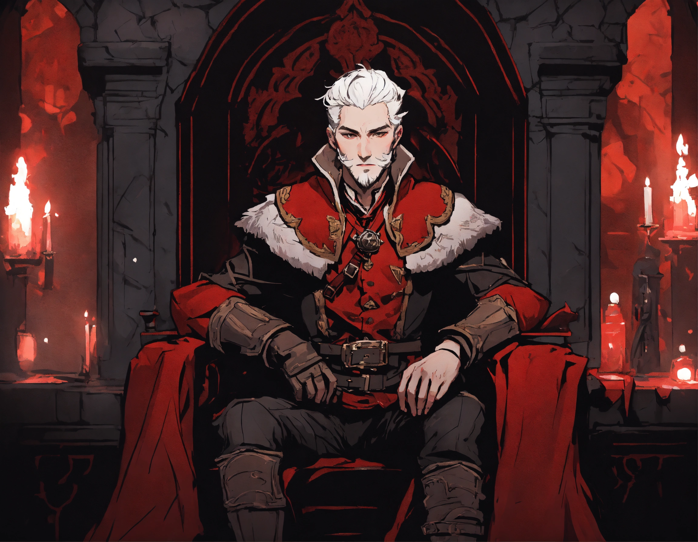 A pale male, thin face, paper white skin, white hair with red reflects, noble outfit. darkest dungeon style; sitting in a black throne, red light, no beard, white stones castle