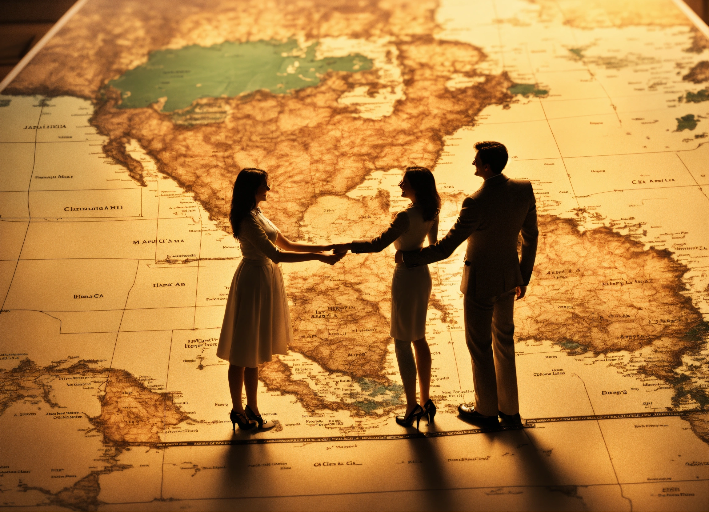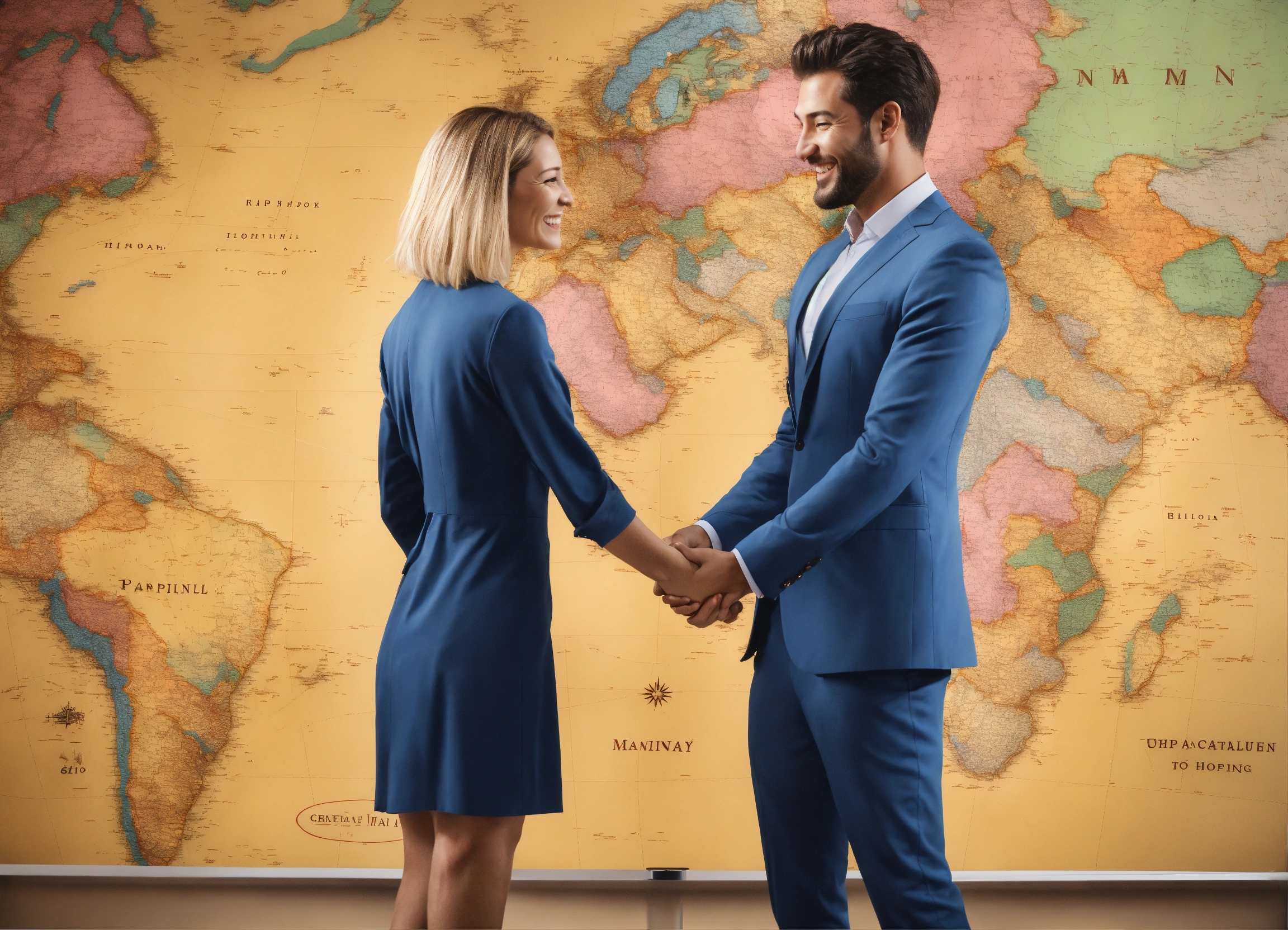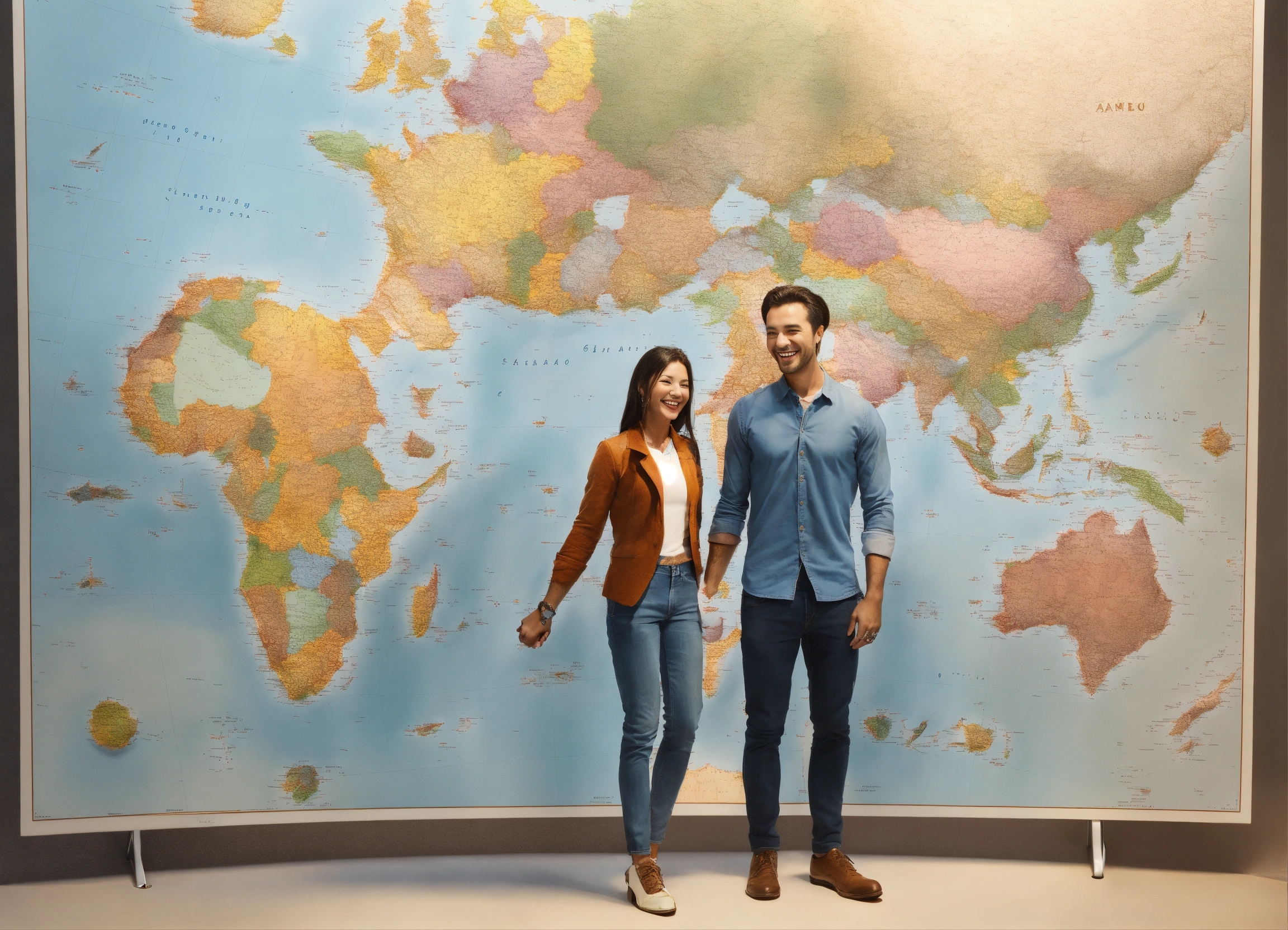 On a large card stand a beautiful full-length man and woman, they hold out their hands to each other. next to them on the map are happy people standing and smiling. realistic, 8k, super detail
