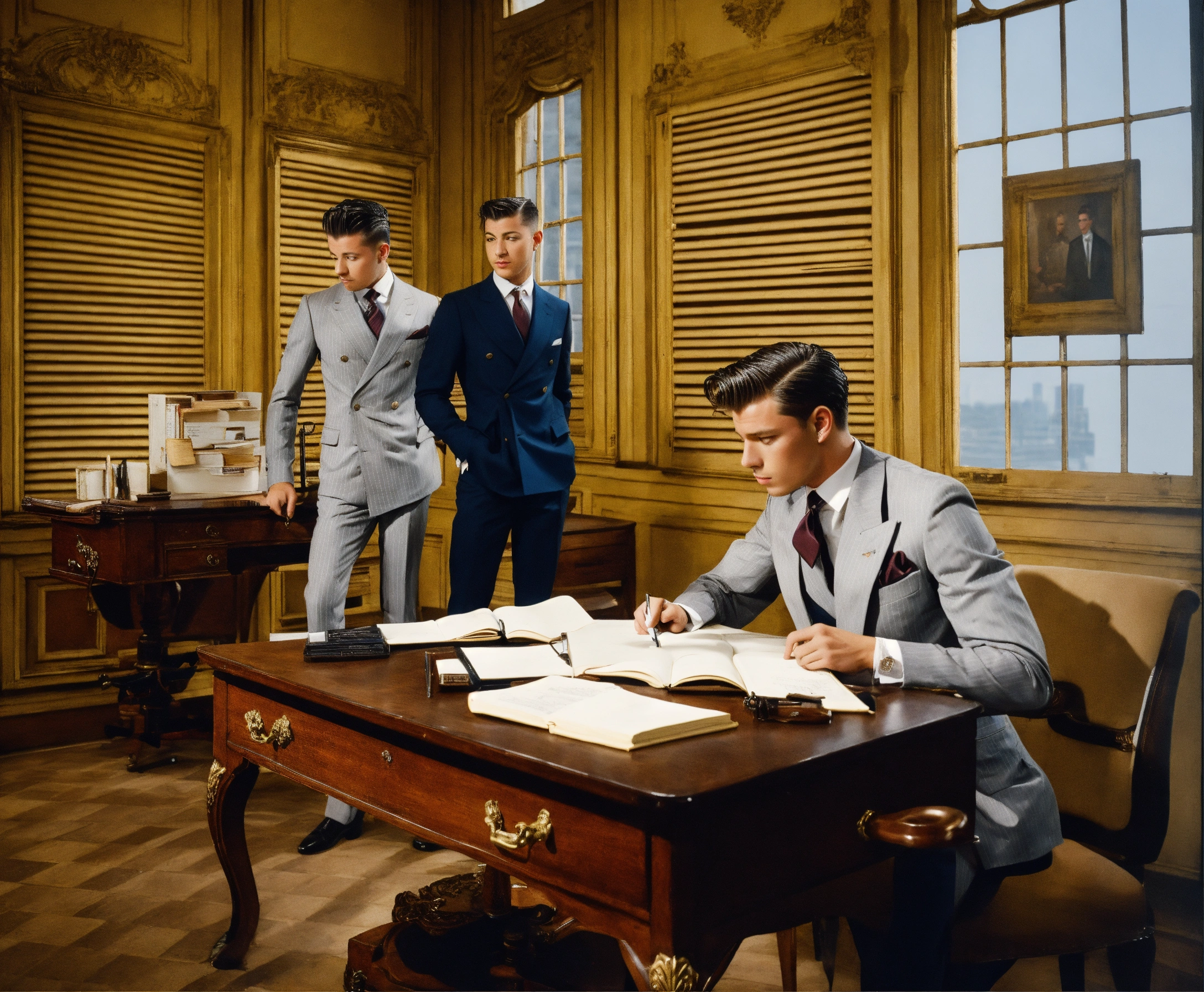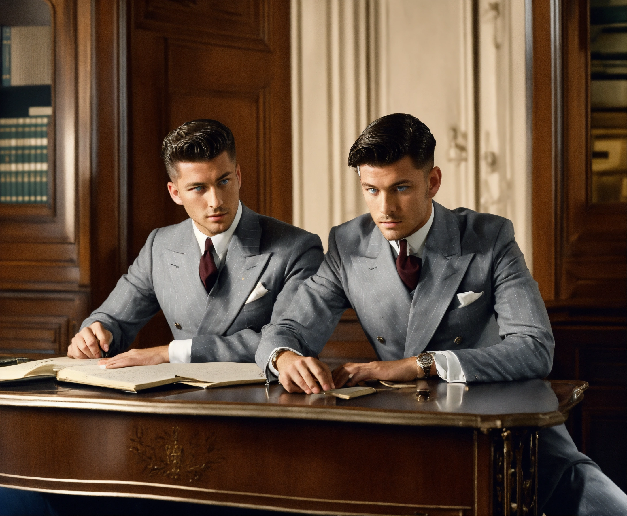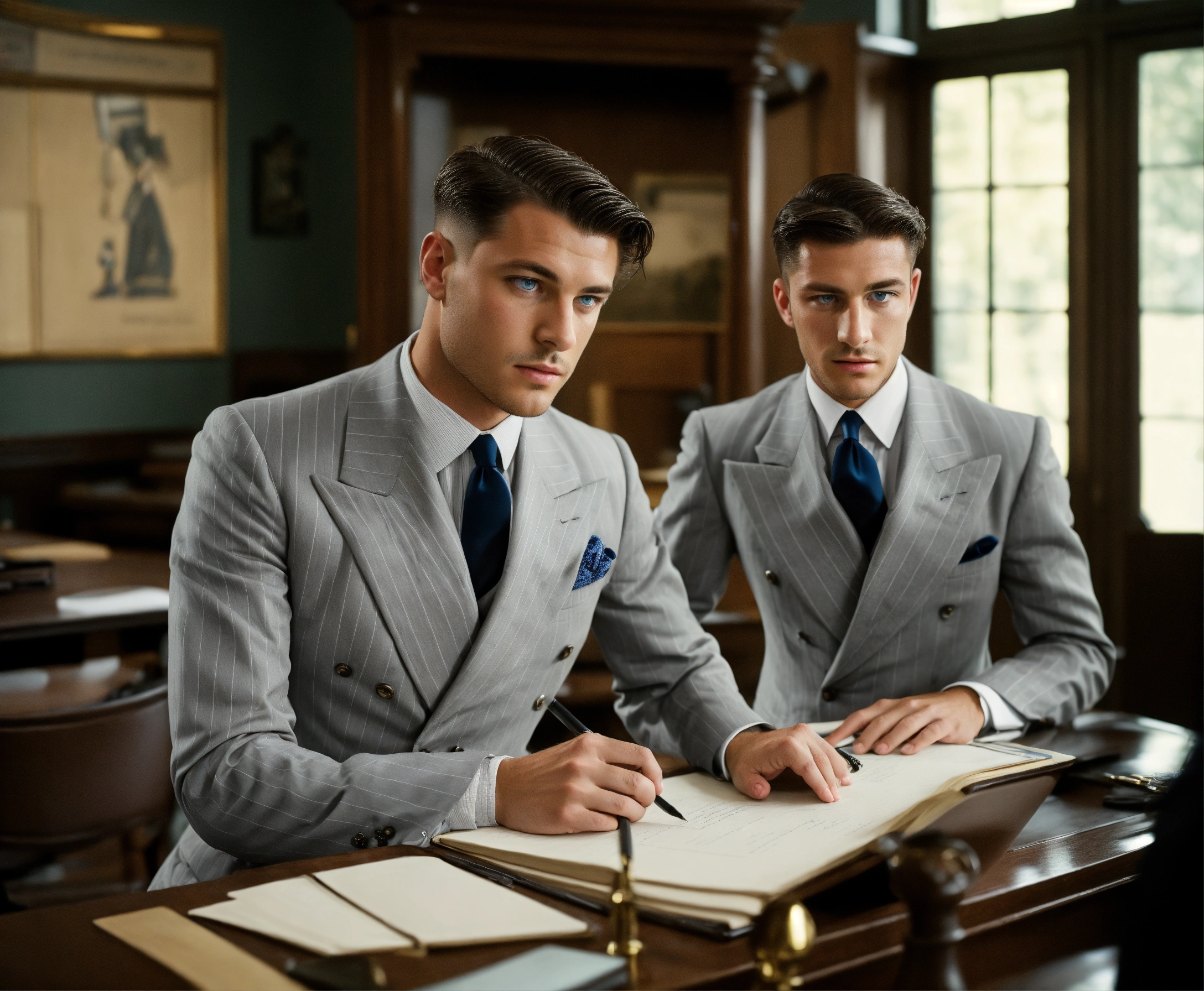 Two young french gentlemen in pale grey pinstripe double breasted suit and club tie, blue eyes and pompadour haircut, standing and bending over their desk