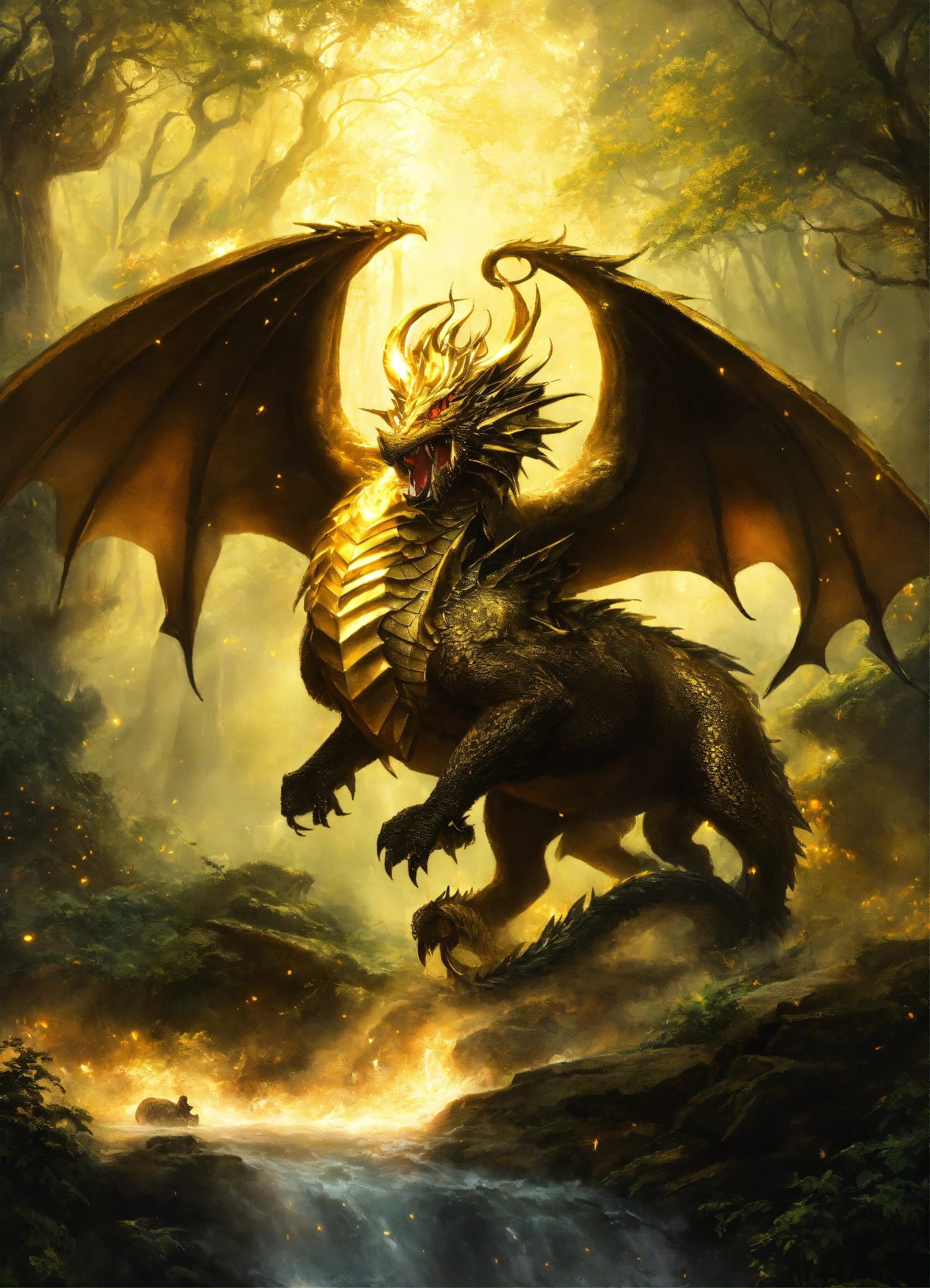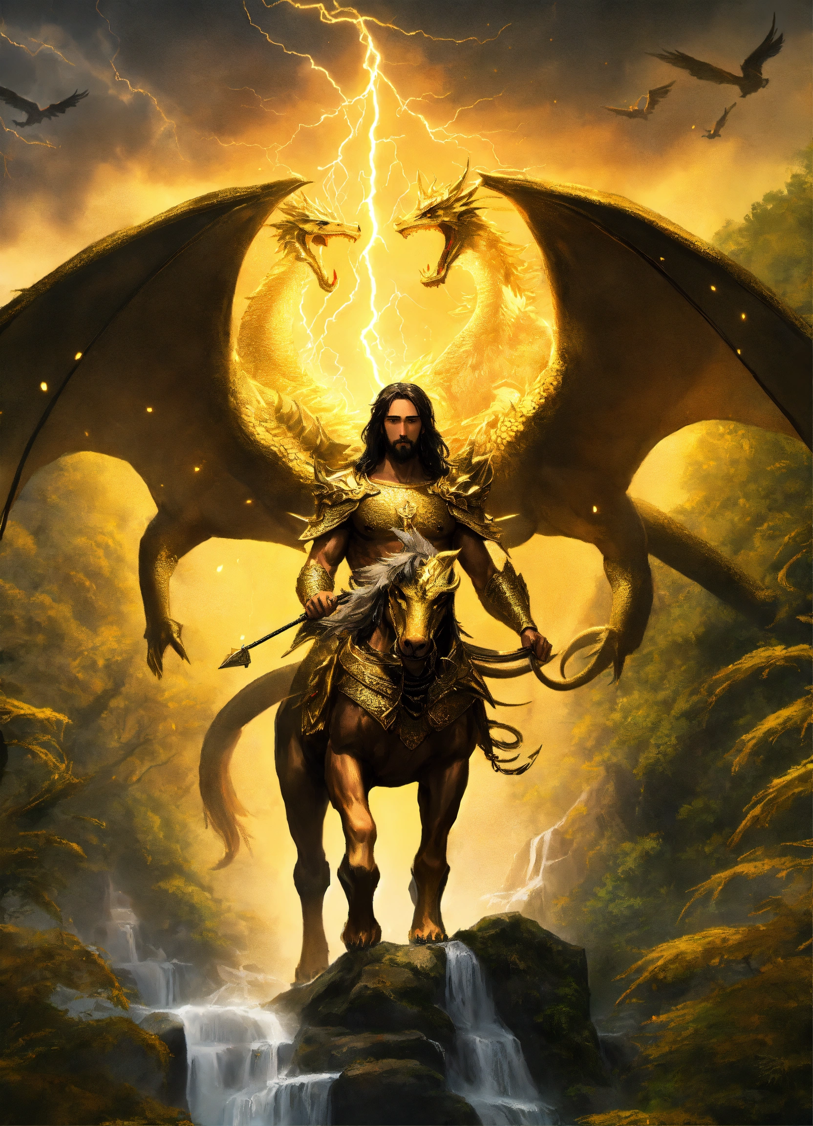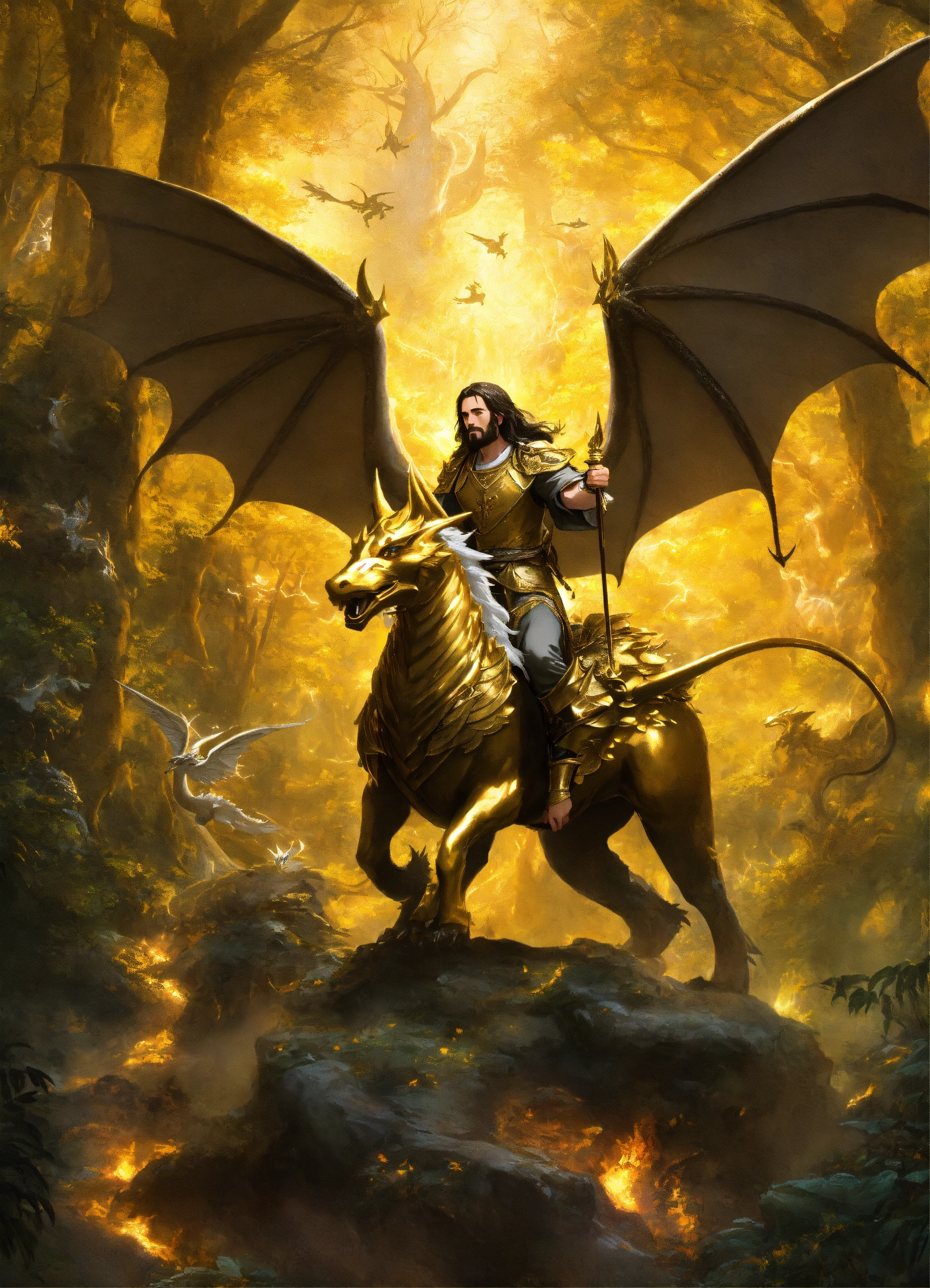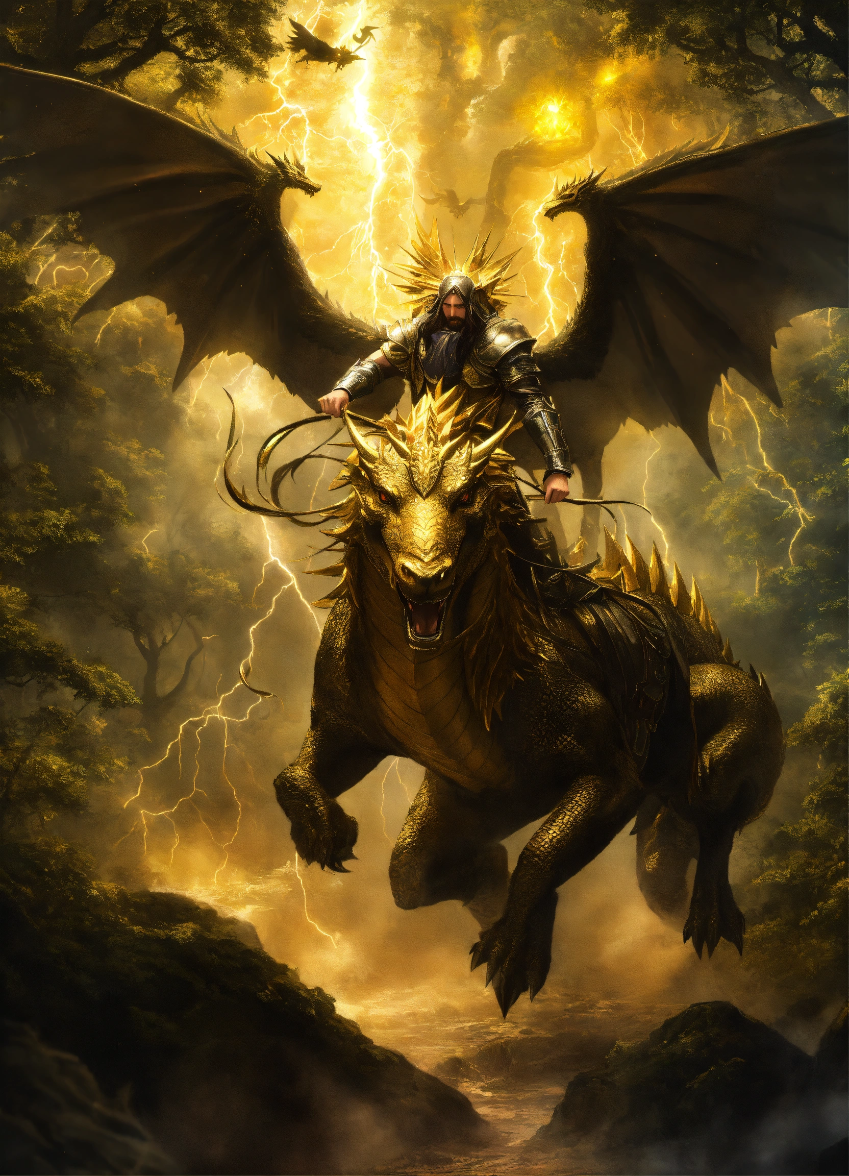 Jesus christ riding a golden and black dragon through a mystical forest