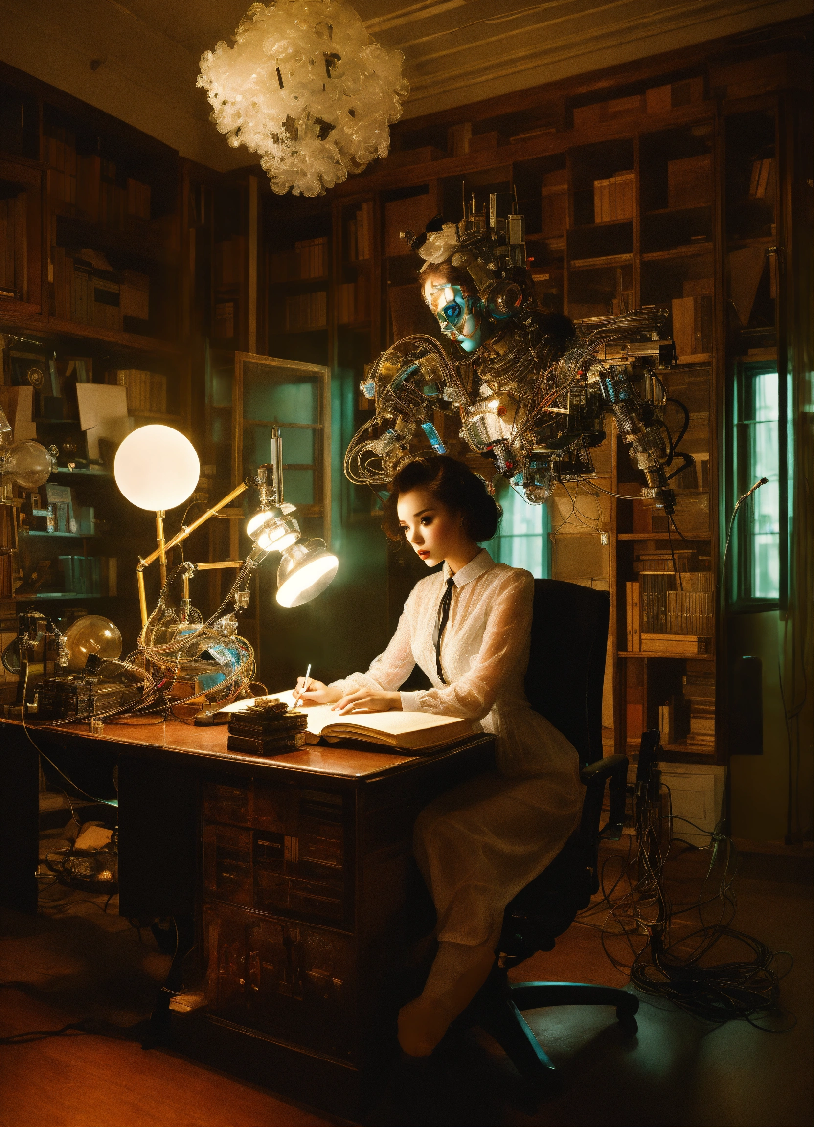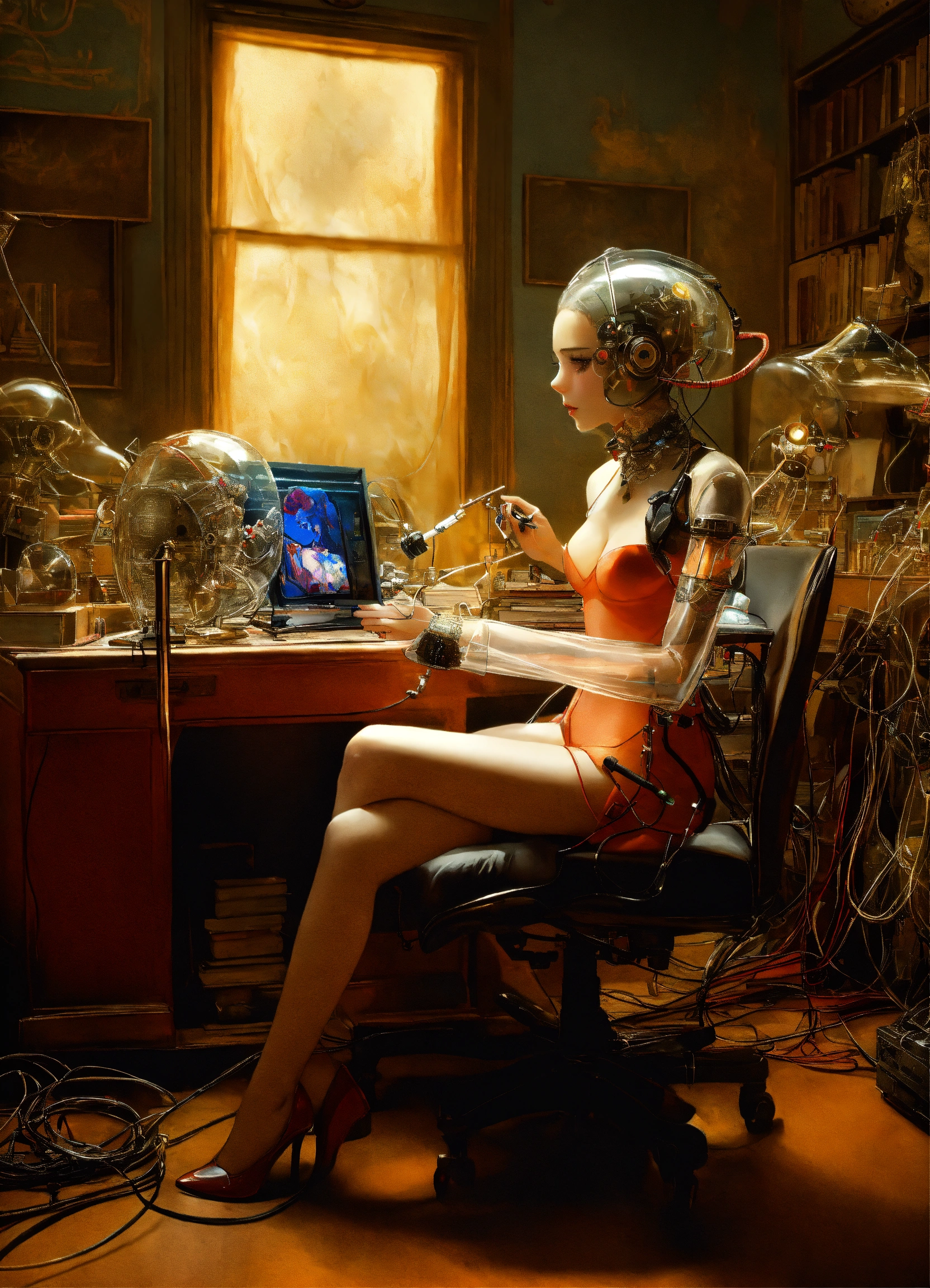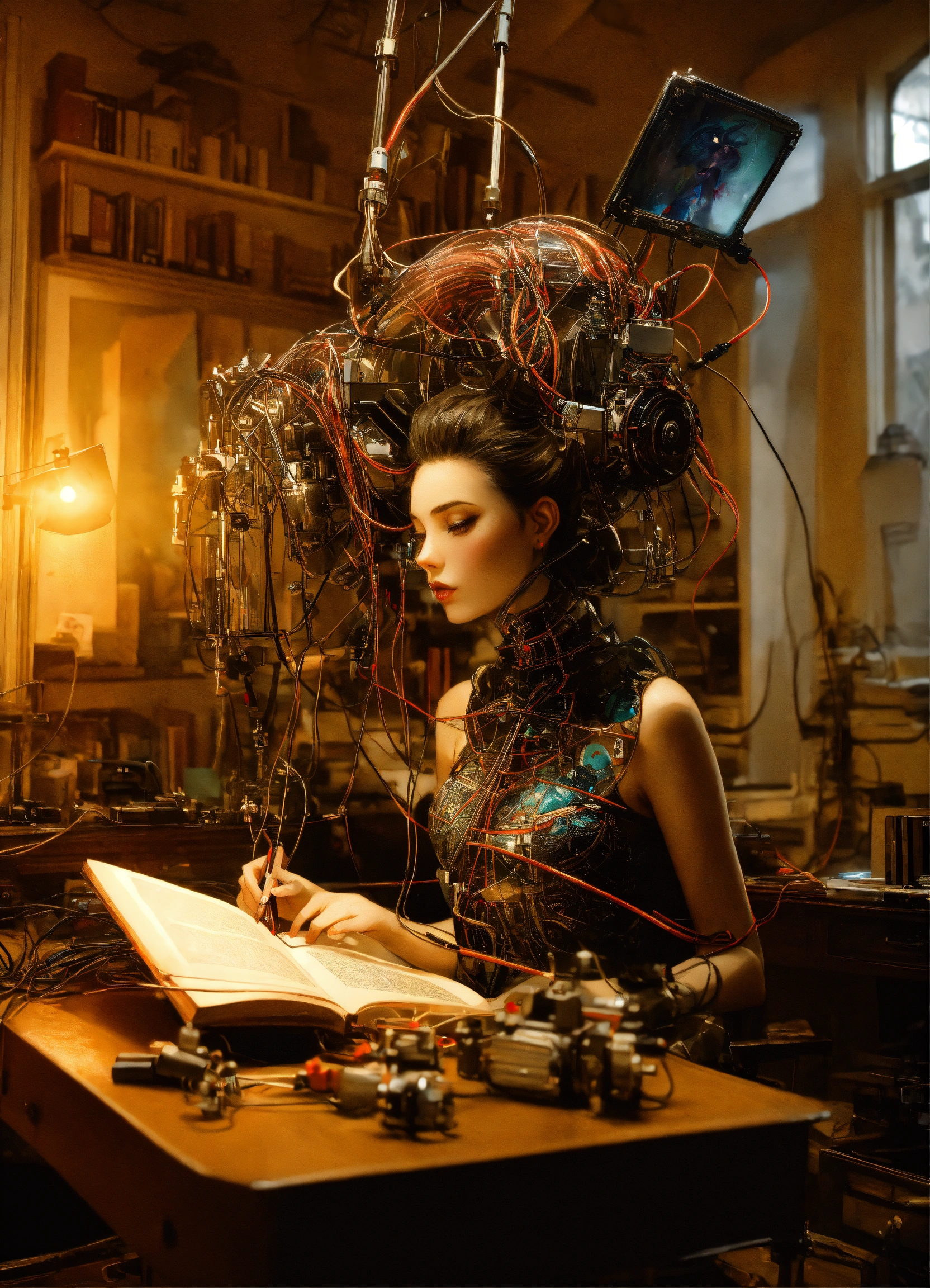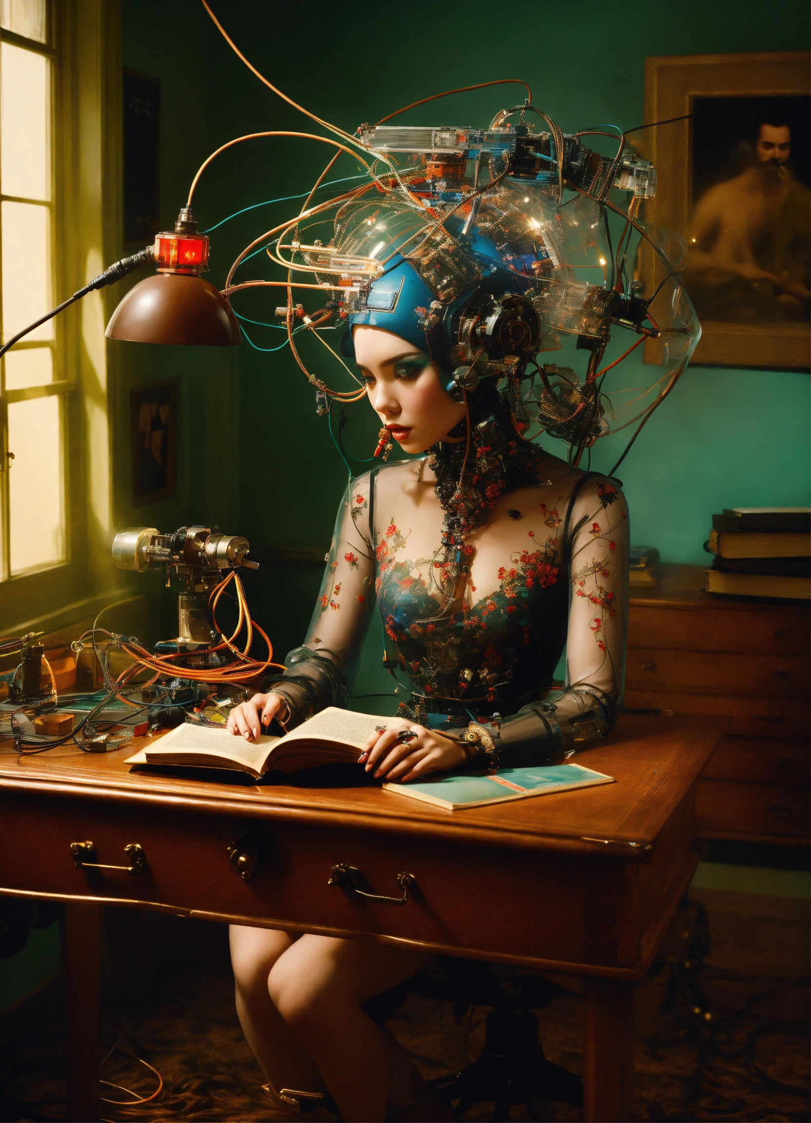 Body portrait photography, in a smoke-filled office full of cables and wires and led, driving a carbon motor head attractive transparent plexiglass secretary robots read an ancient book at her desk, 80 degree view, art by sergio lopez, natalie shau, james jean and salvador dali