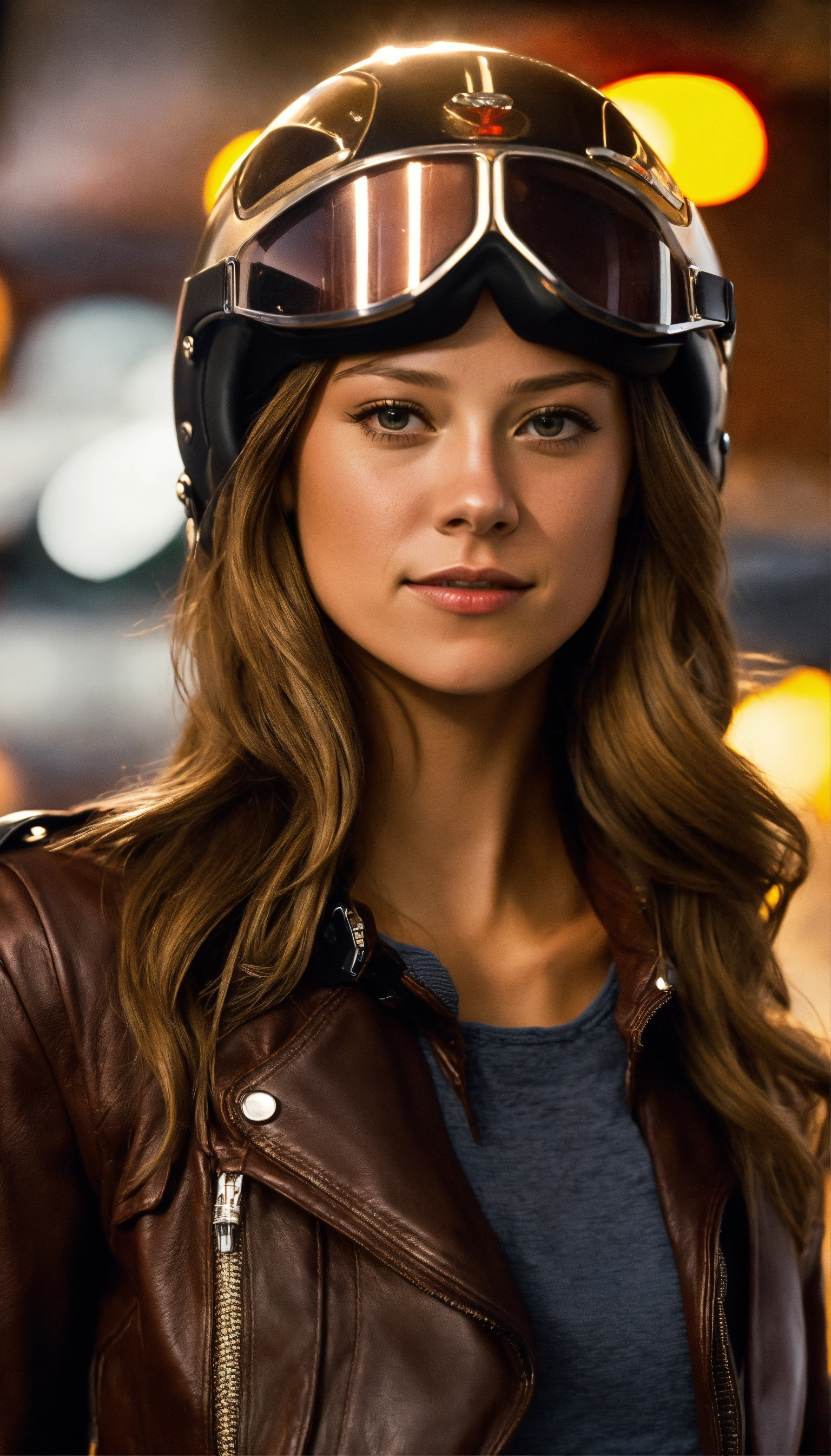 "generate images of the actress melissa benoist dressed as a motorcyclist with a motor-touring style. the outfit should include a leather or cordura jacket, typical of motorcycle travelers or tourers. show variations of this style with different poses and backgrounds."