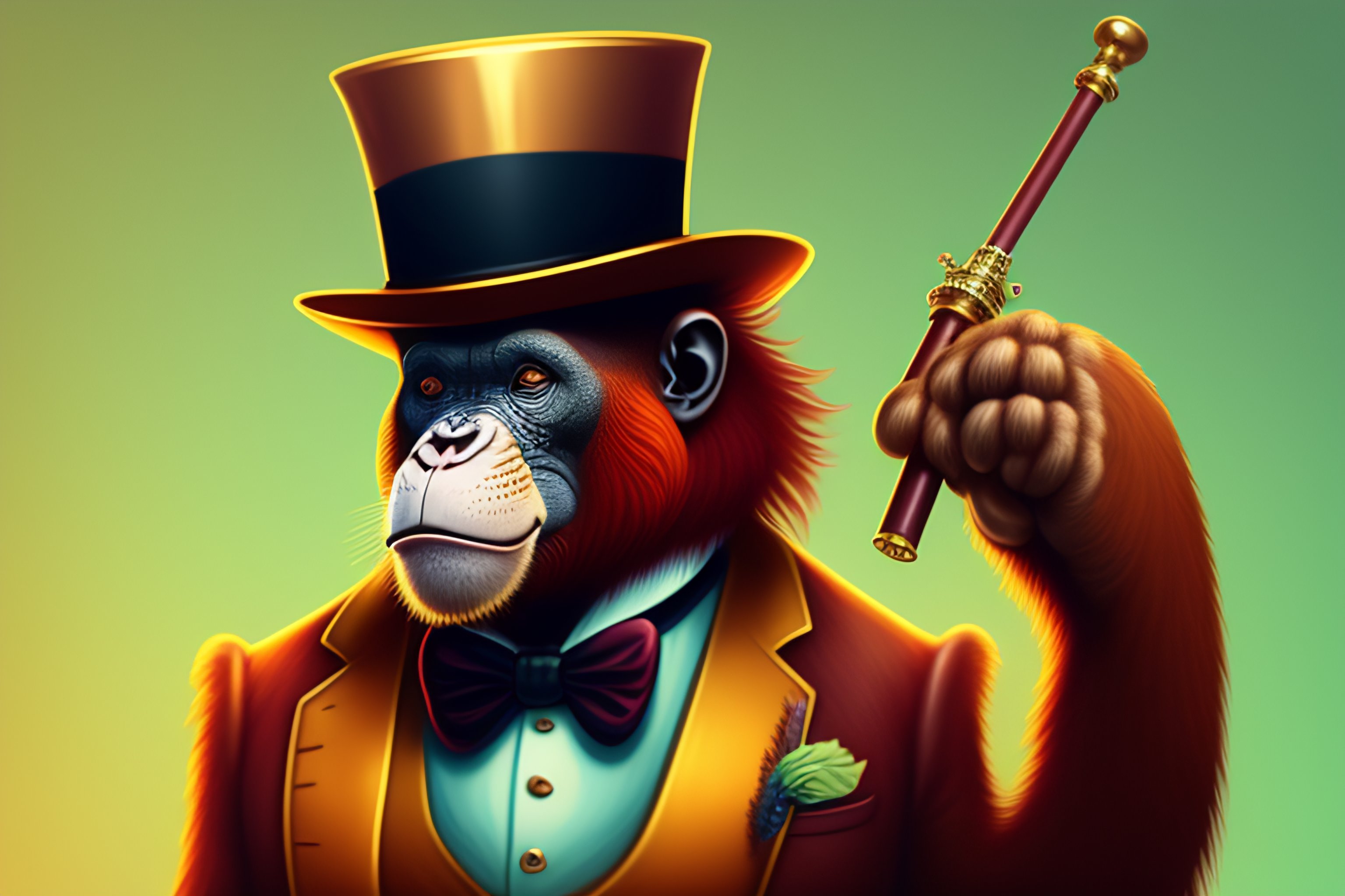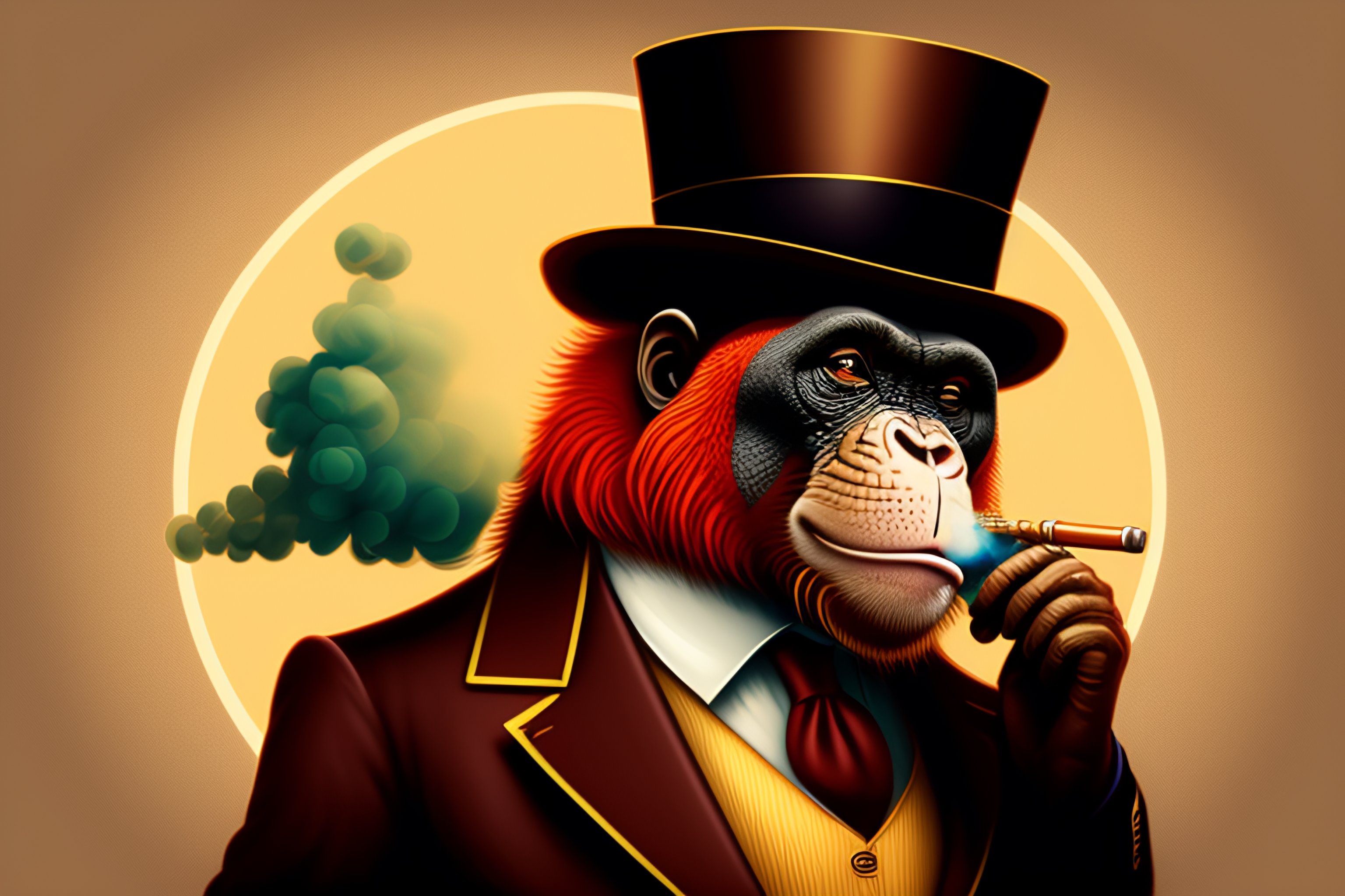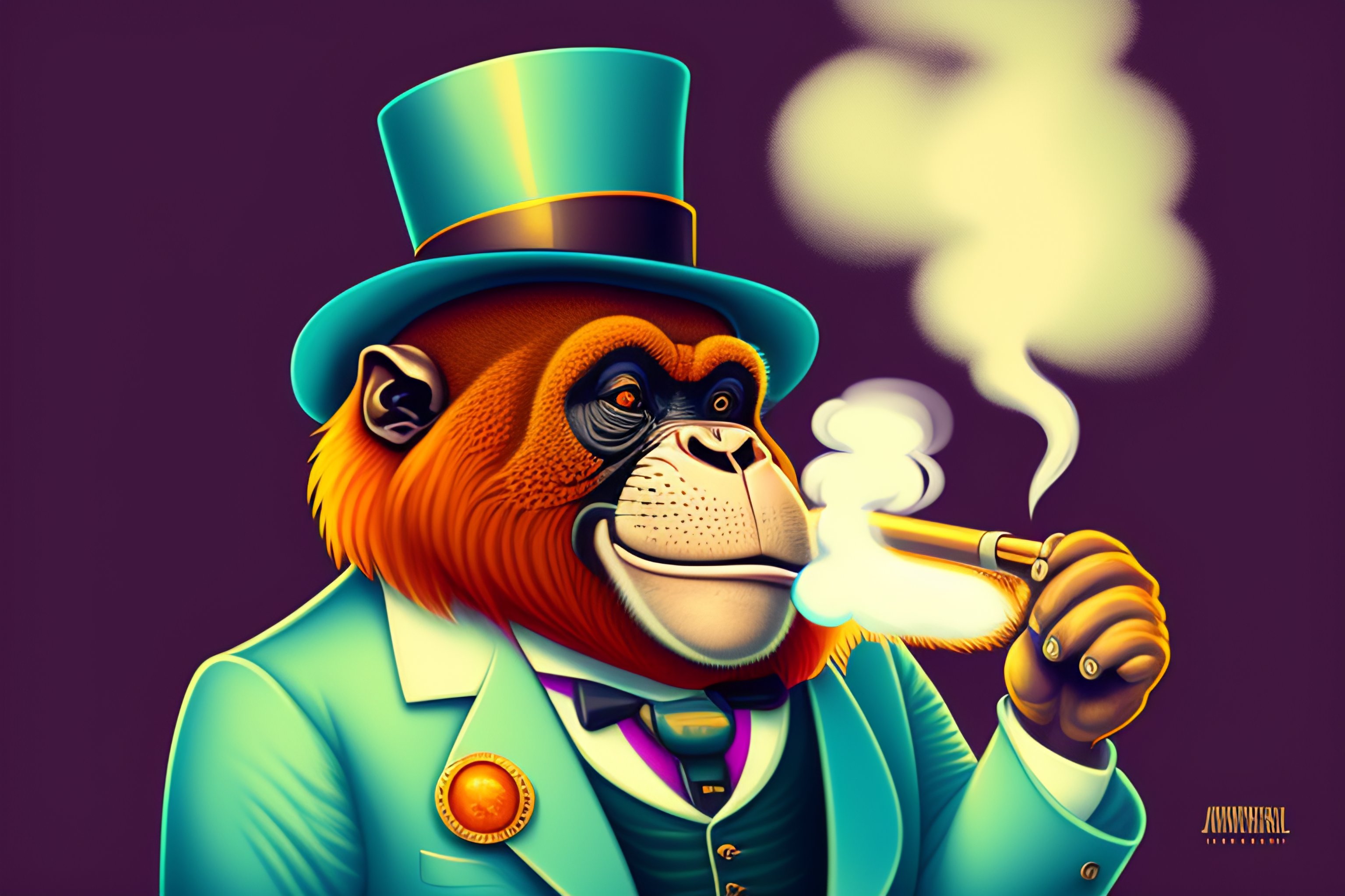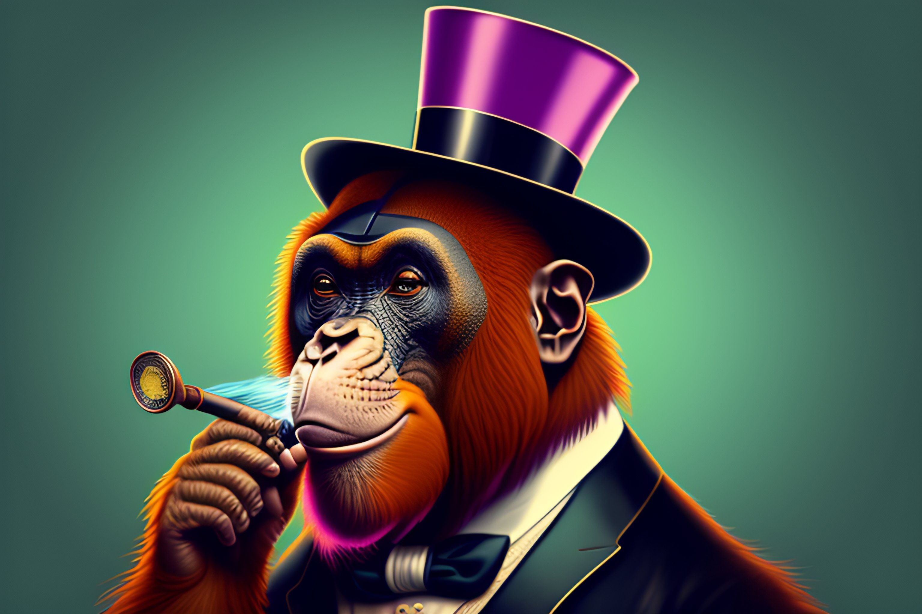 A tshirt design of a orangutan wearing a monocle and a top hat and smoking a pipe, low details, digital art, solid colors, sharp focus, trending on art station, pastel collors, print art, vector illustration, white background