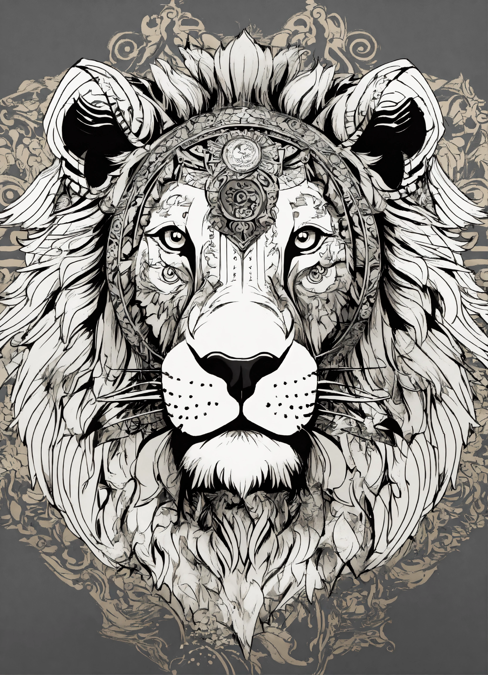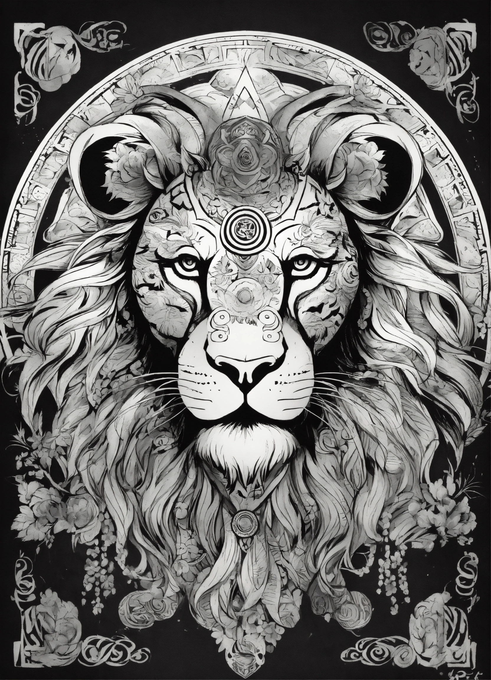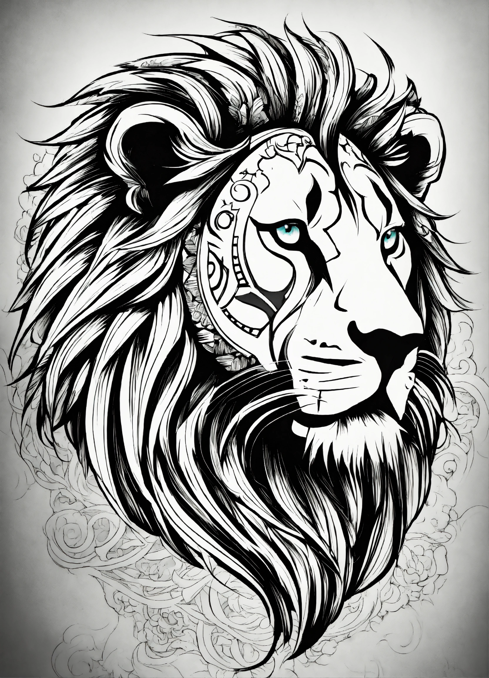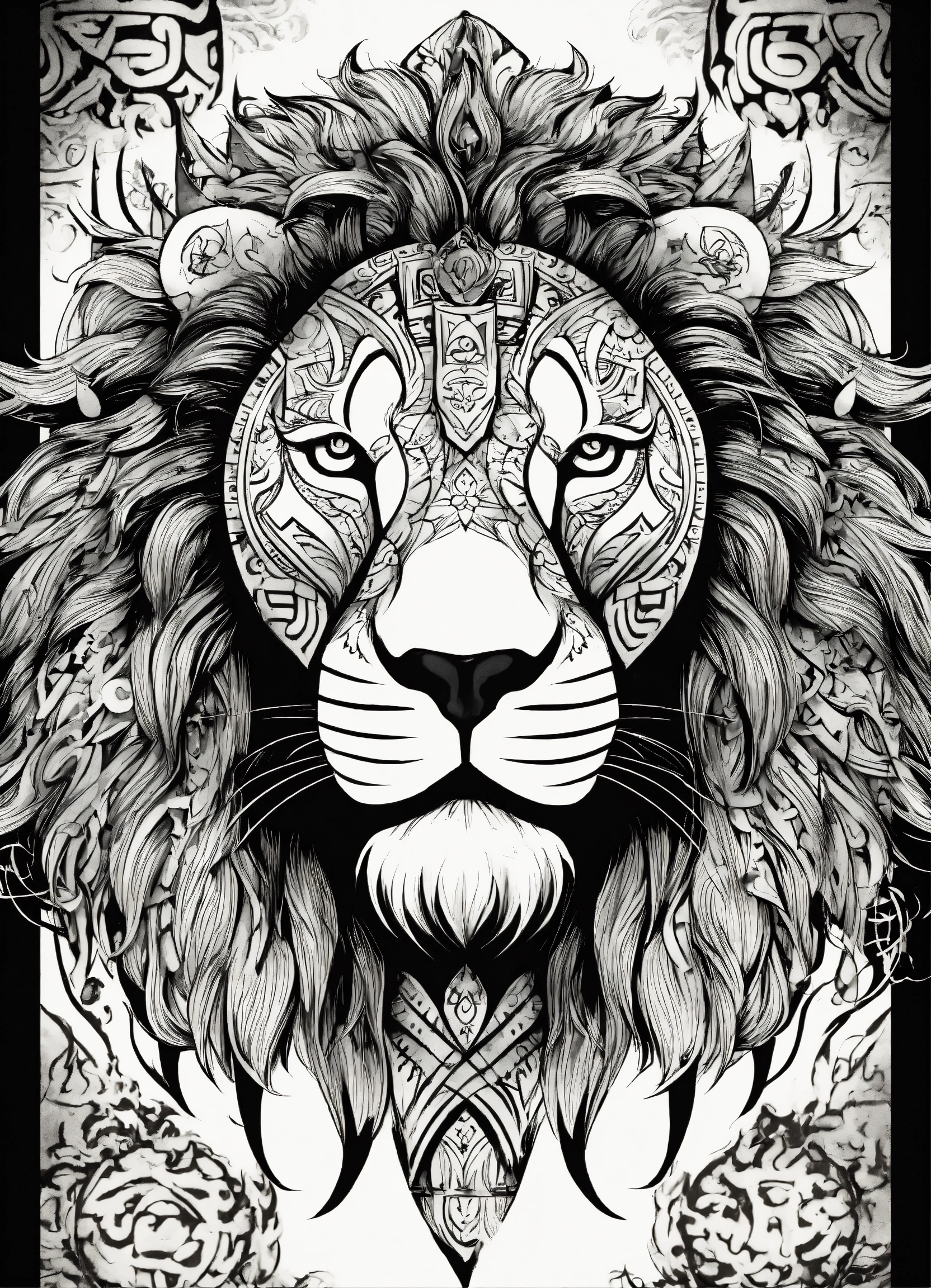 Tribal head lion, black and white, detailed, elaborate, profile, tattoo like, face towards the sun, compas background, japanese signs