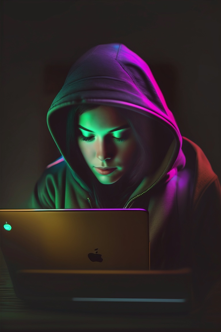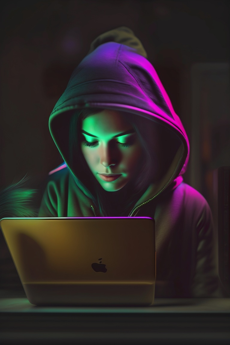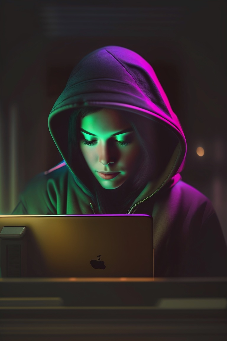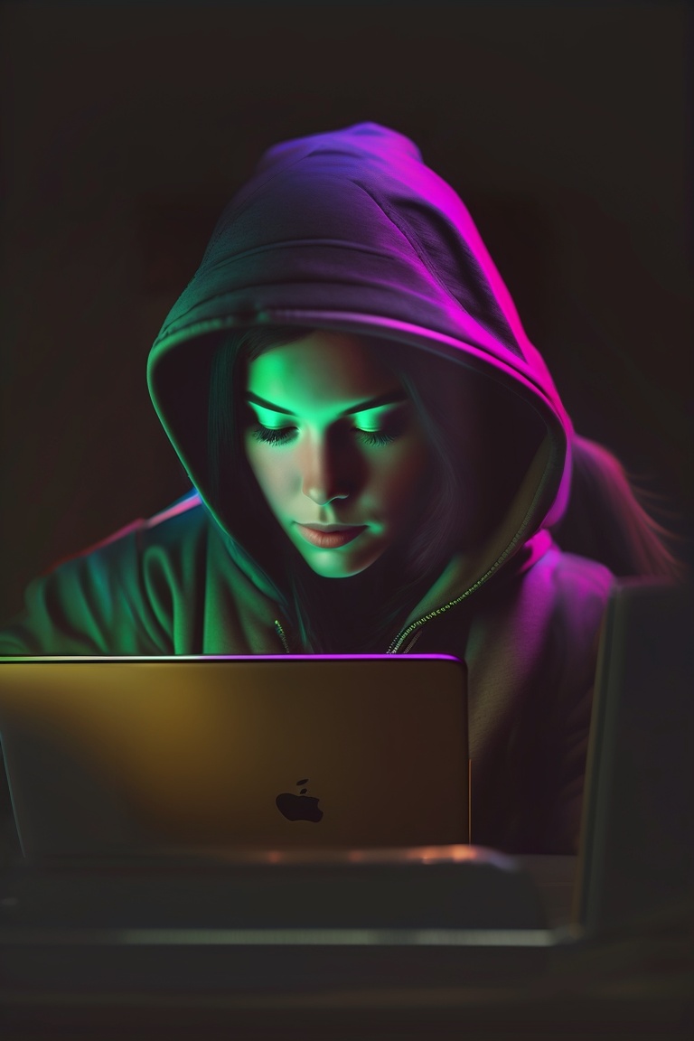 Female hacker, low light hacker, half face down, dark, wearing hoodie, hacking, macbook pc, dark face, facing straight