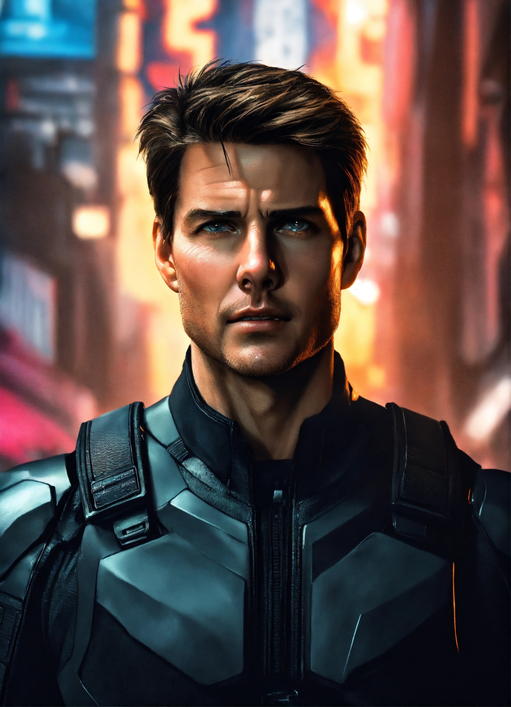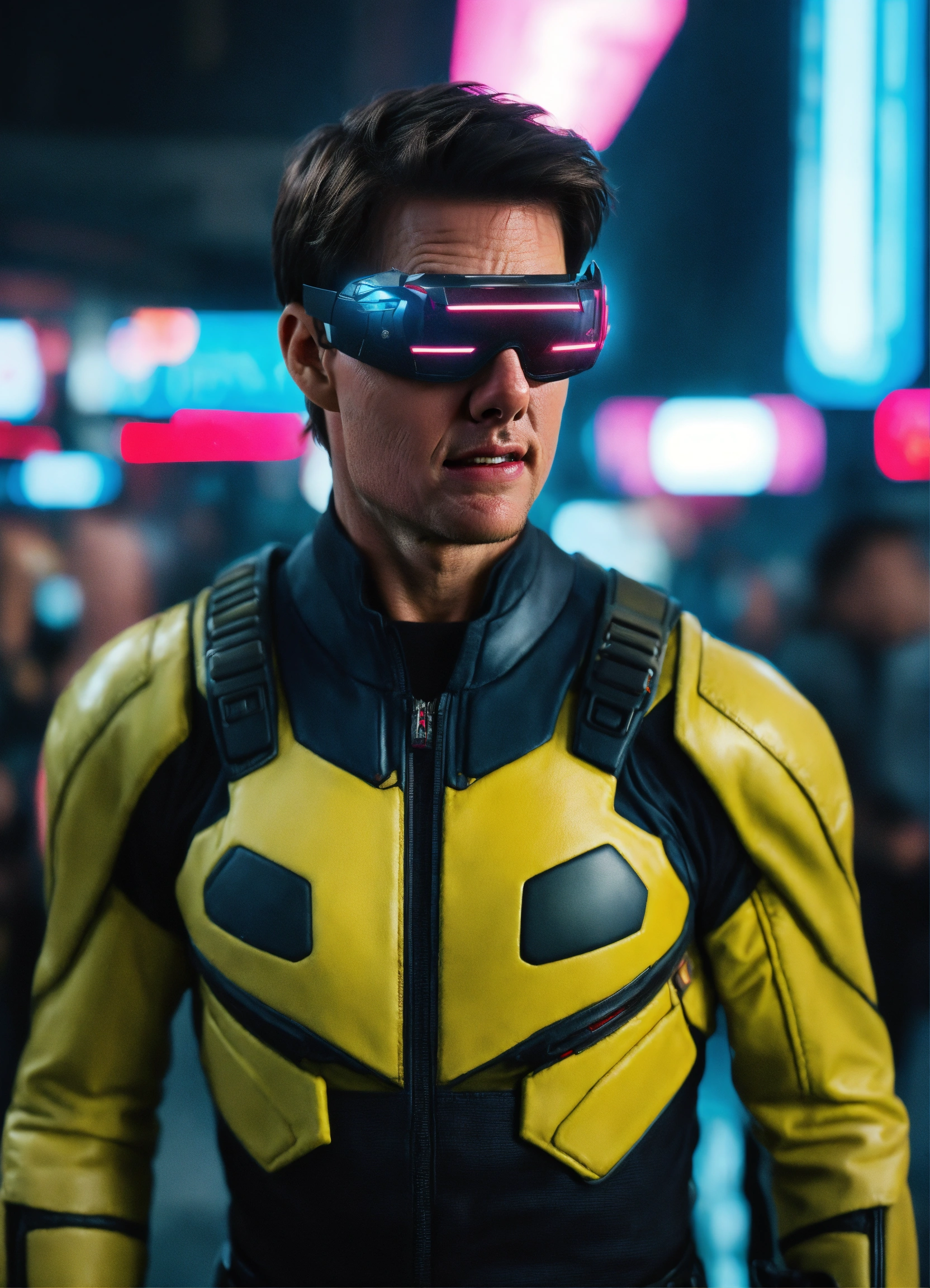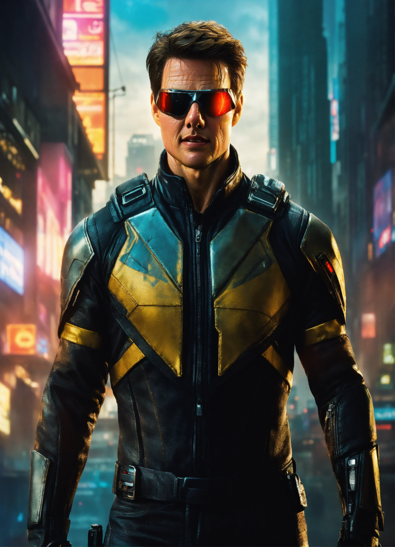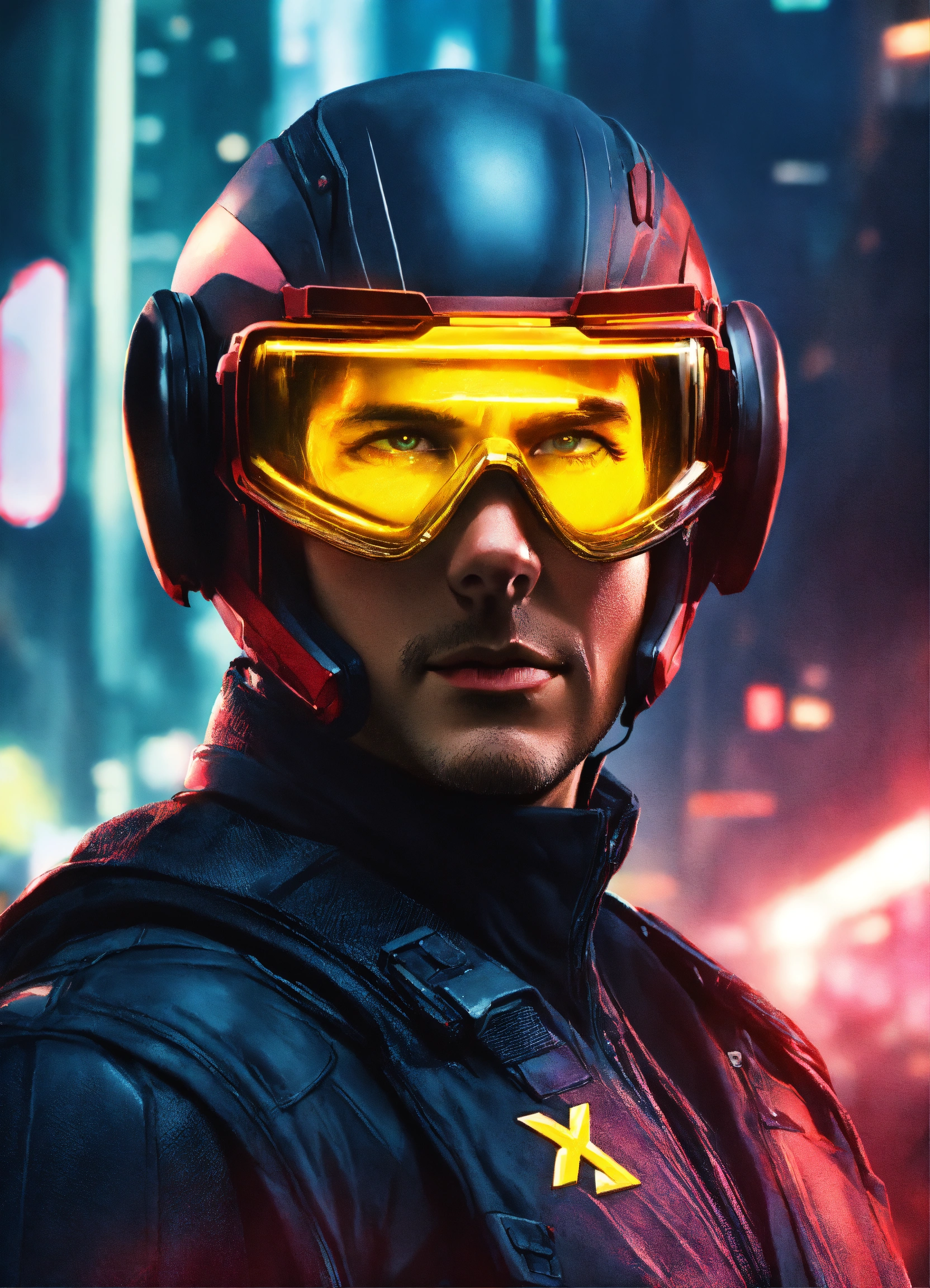 Tom cruise, 40 years old with cyclops visor, is cyclops of x-men in a cyberpunk metropolis, photorealistic, 8k resolution, hyper detailed