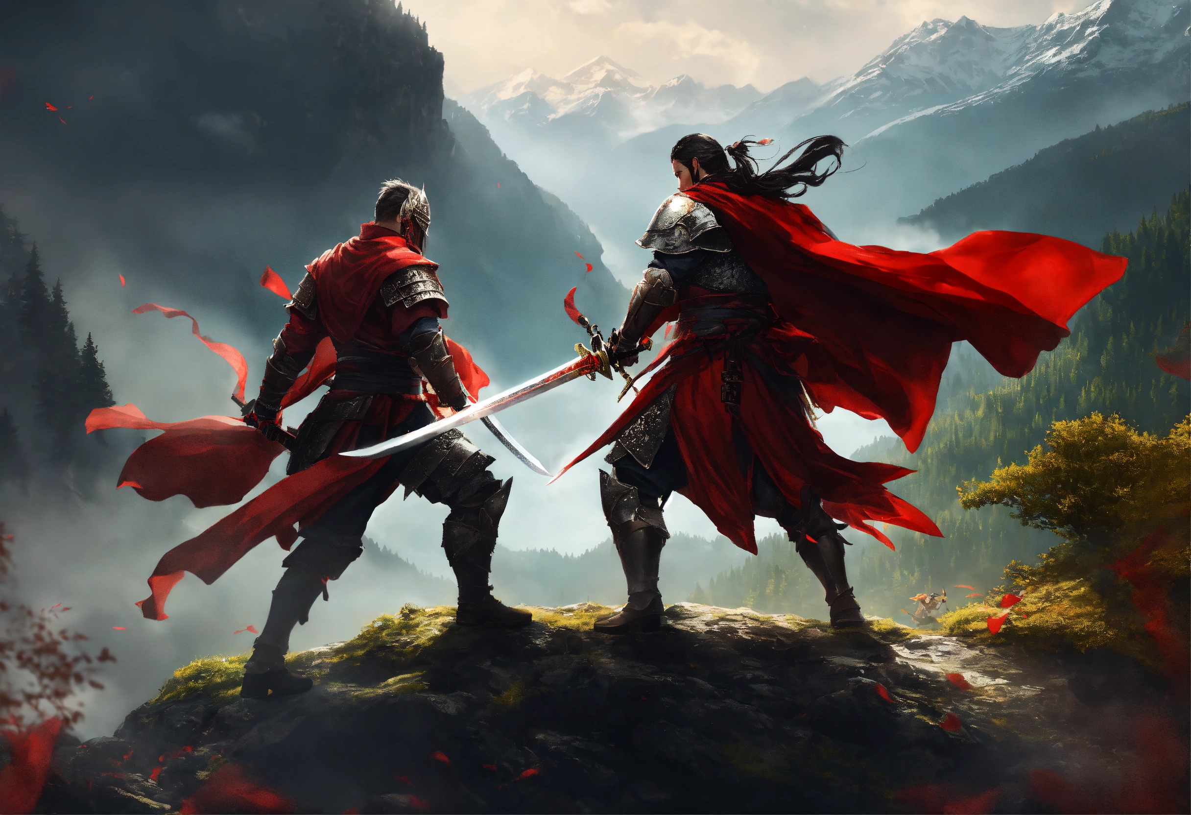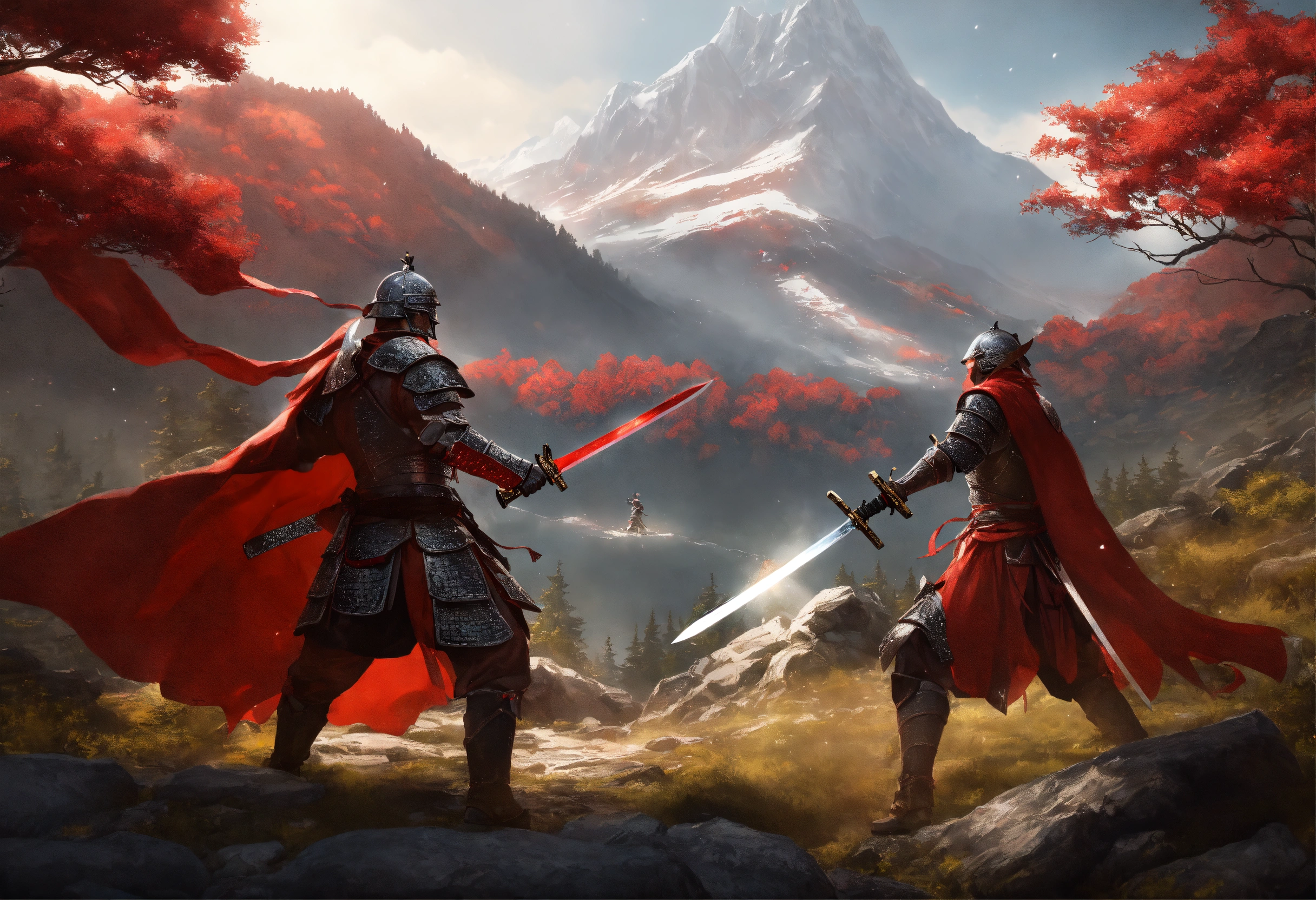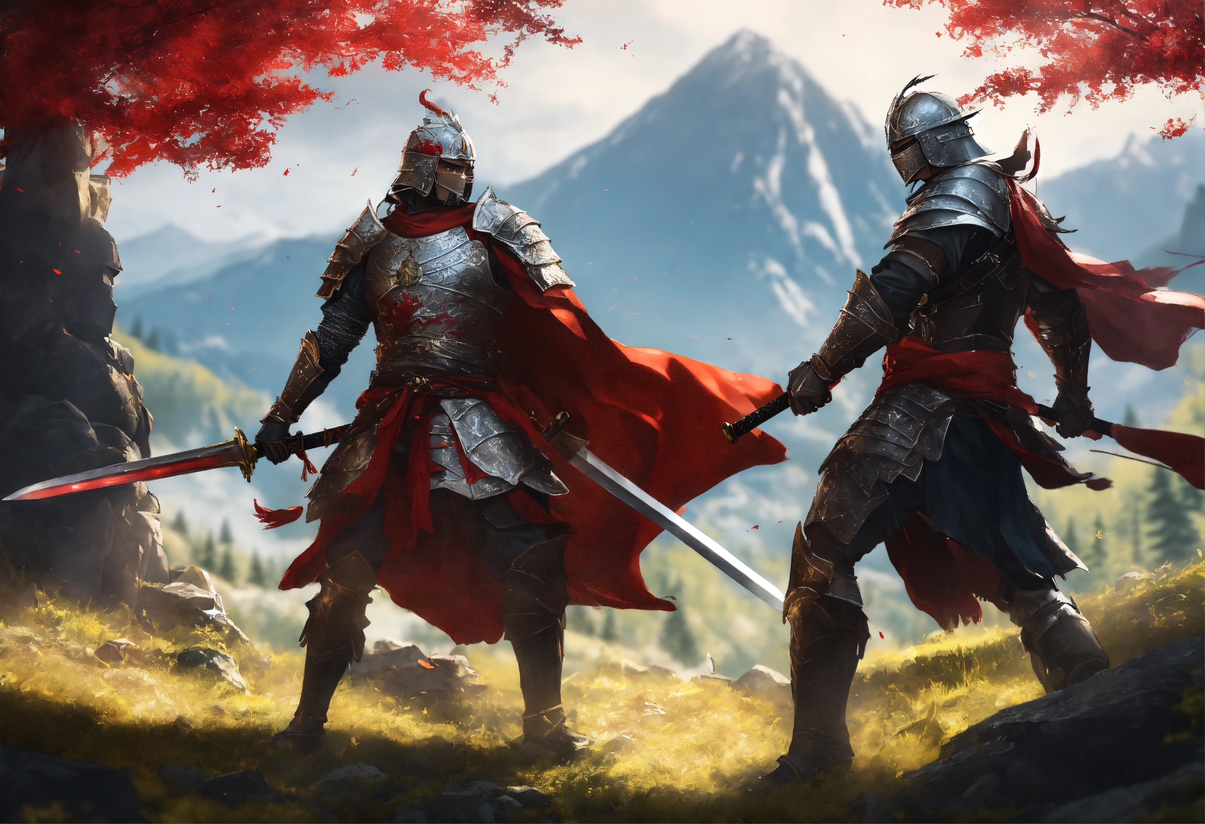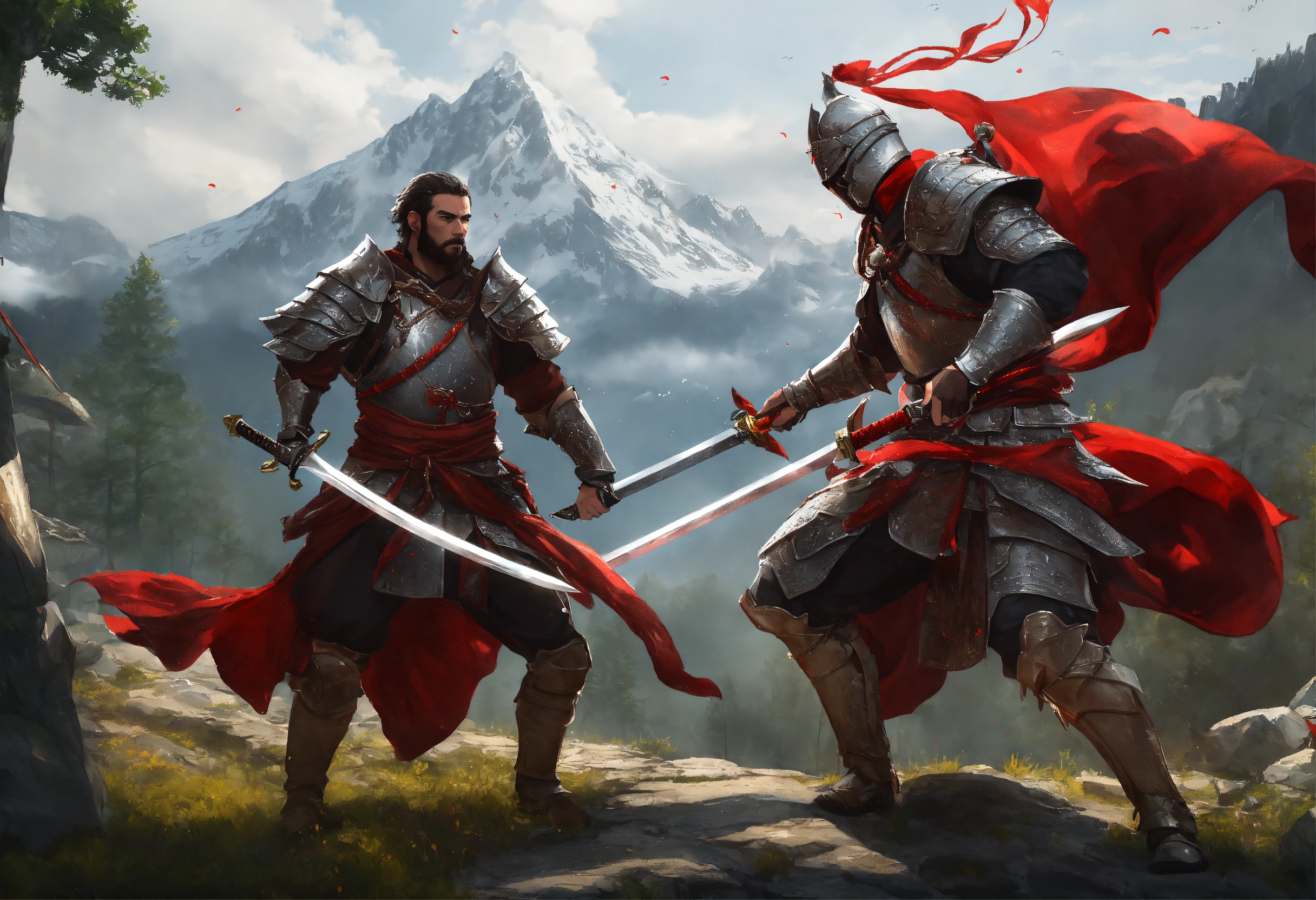 Two fantasy warriors fighting against each other in seid view, a one fighter with a big sword and old armour with red cloth with a slight hint of samurai, the other one i white and silver armor, holding two short swords, mountain in the background, near a forest, trending on artstation