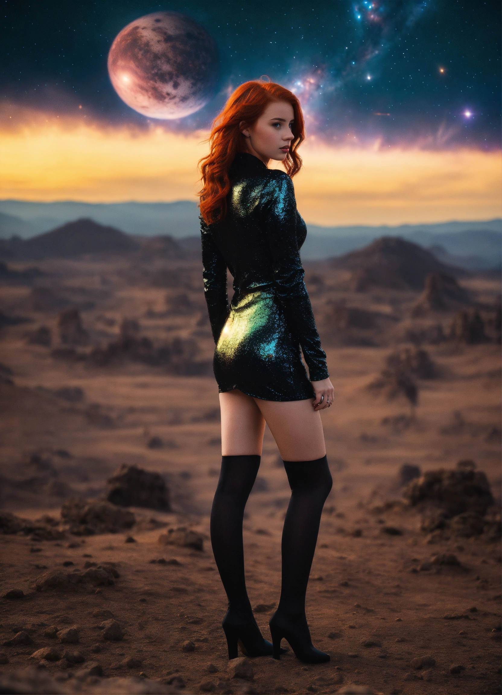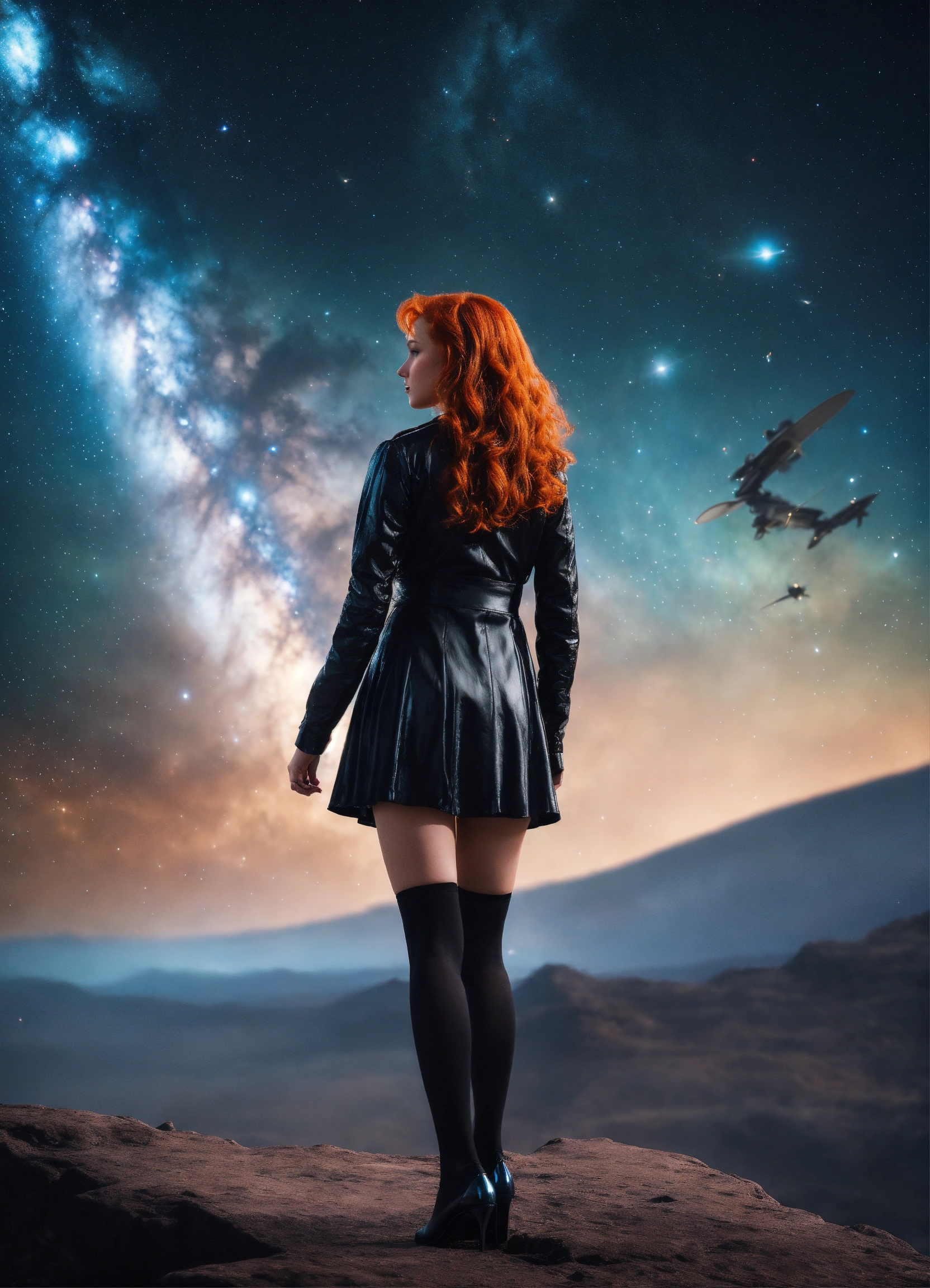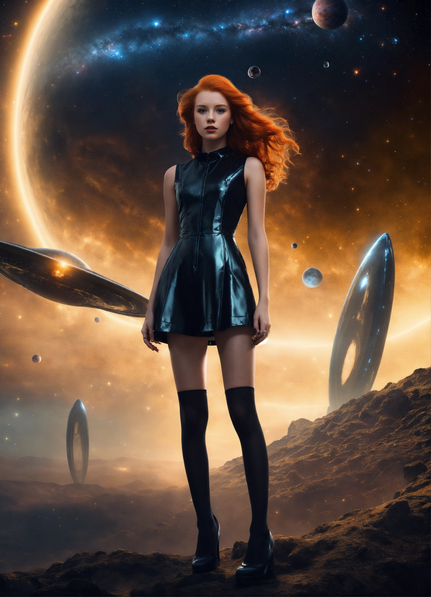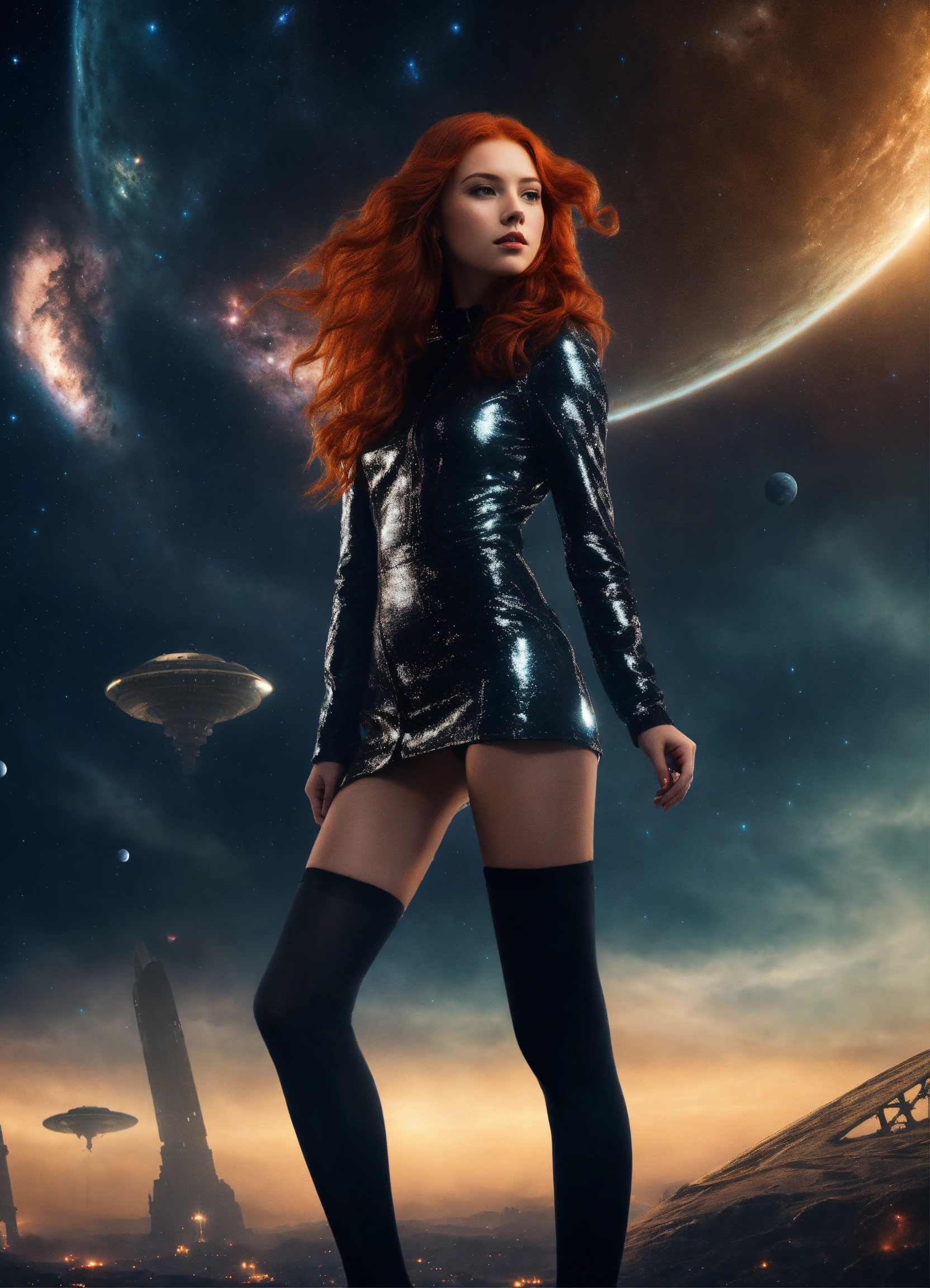 A real photo of a 23 year old redhead princess girl, wearing shiny black stockings standing very strong against aliens. in the sky we see the galaxy