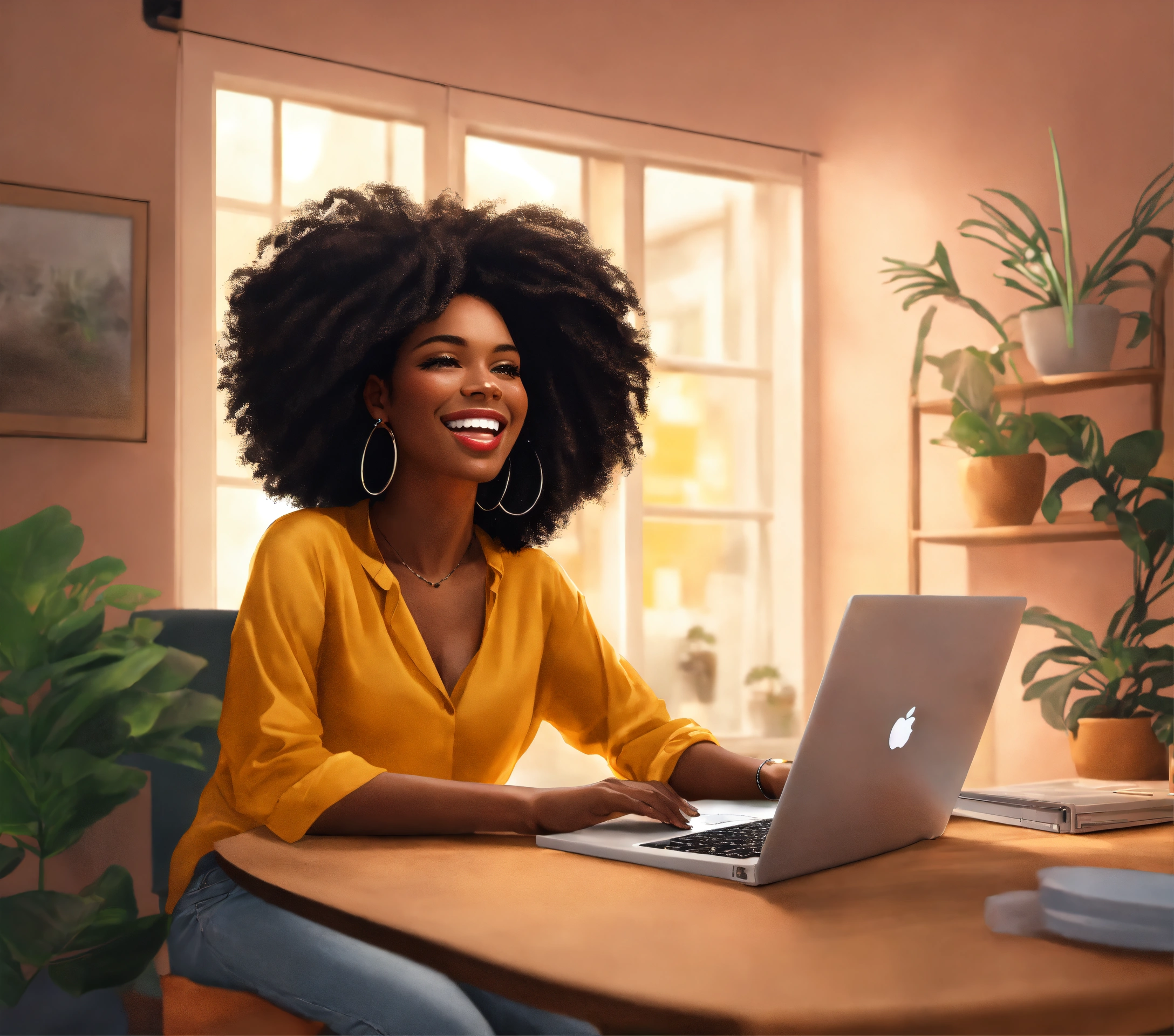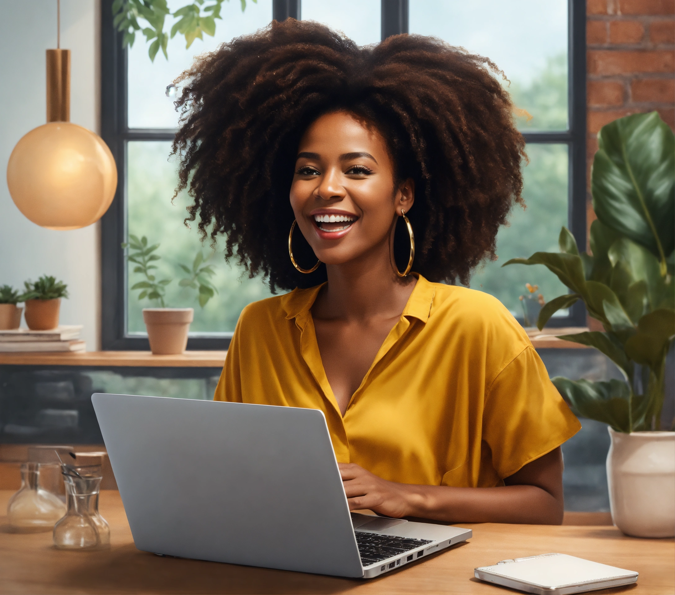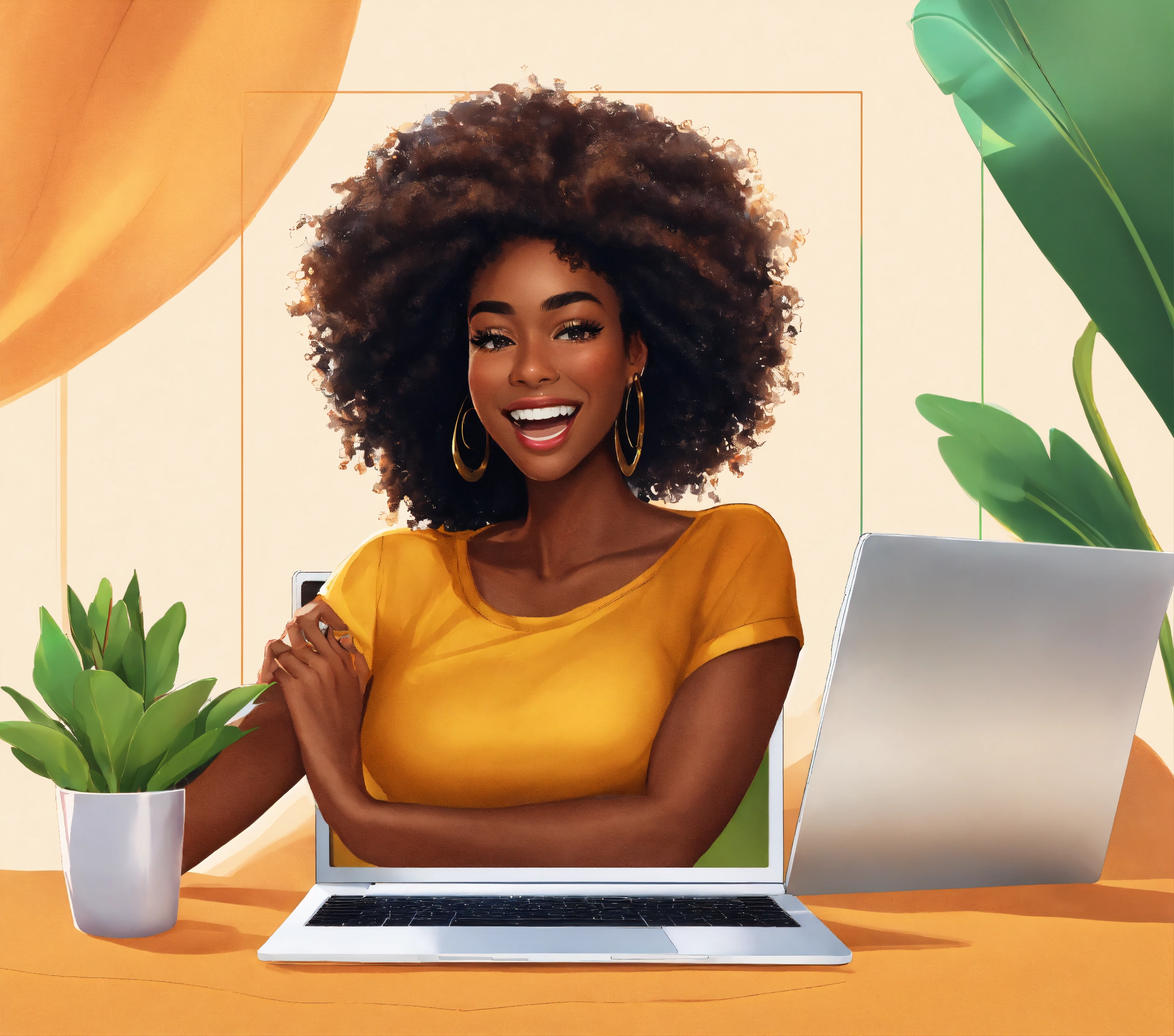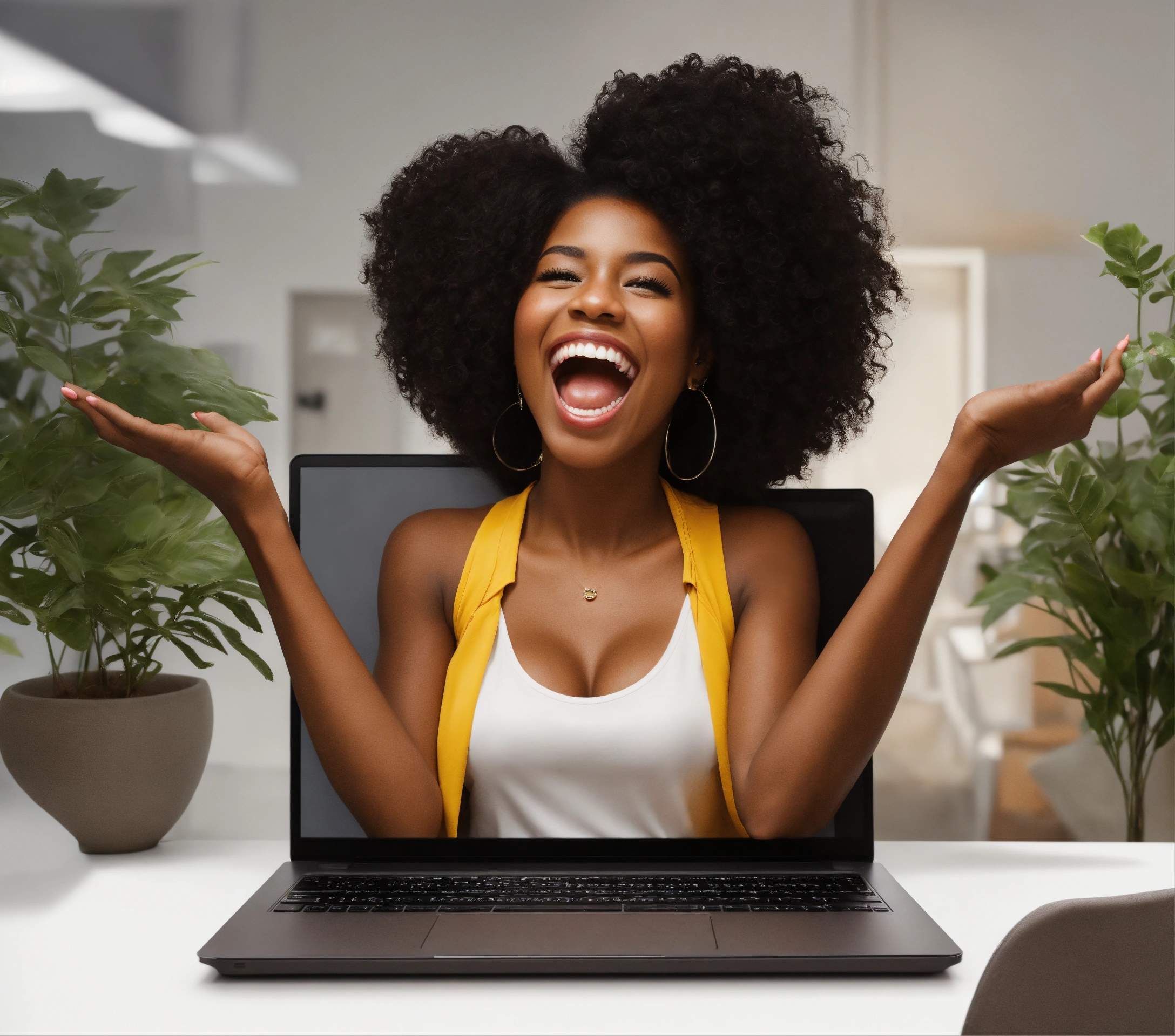 Realistic black woman, very happy, coming out of a laptop screen. suggesting the idea of a video call. the background is white.