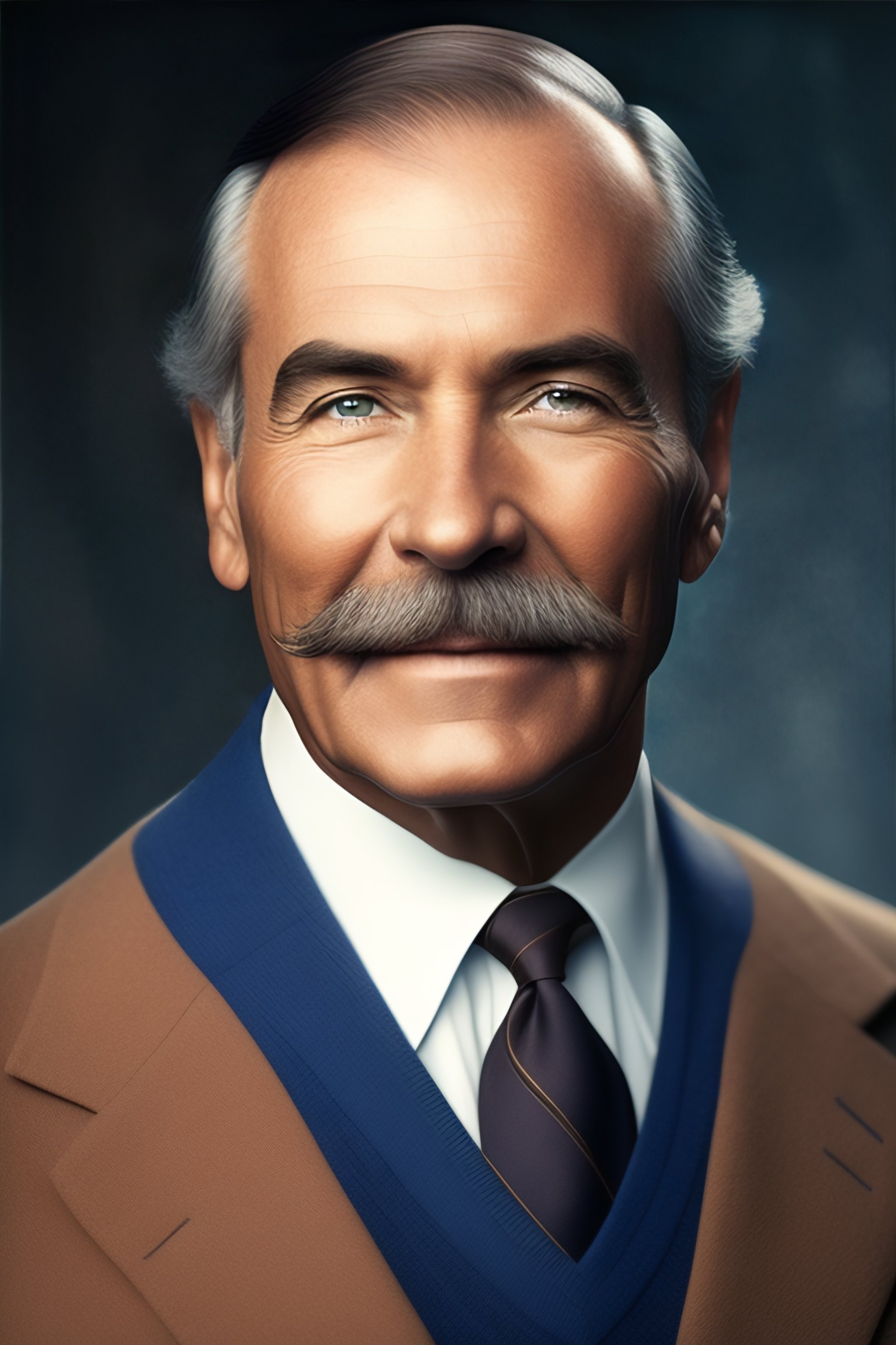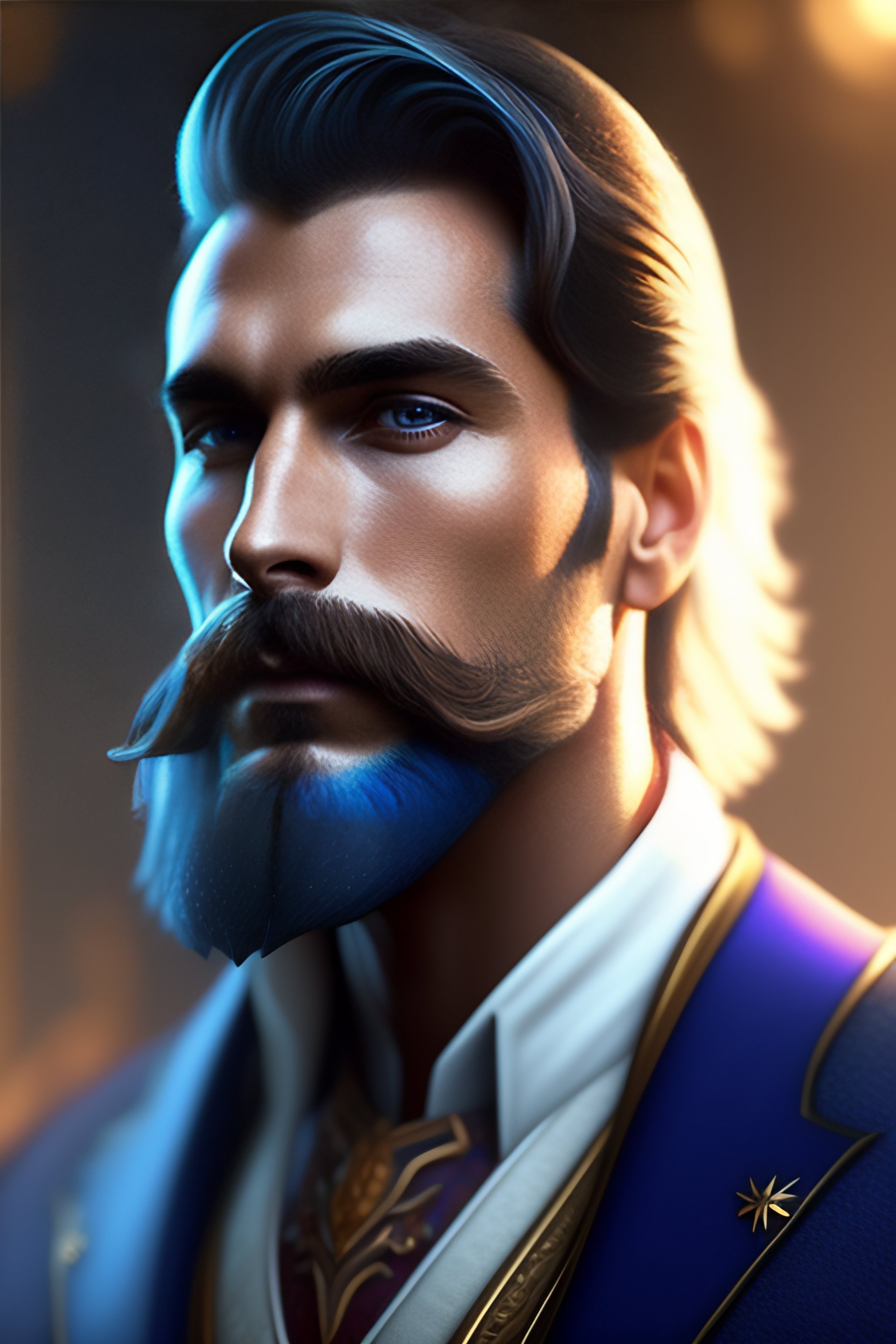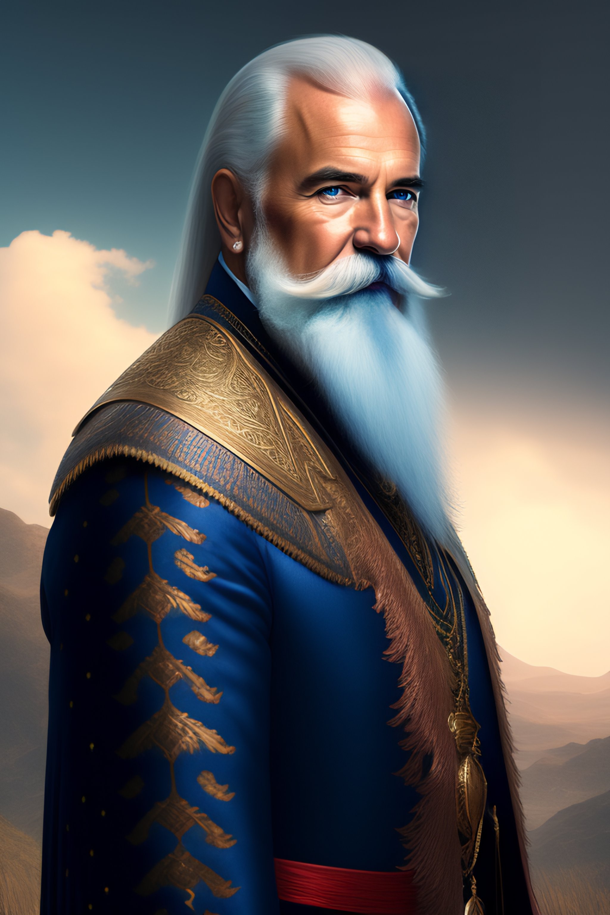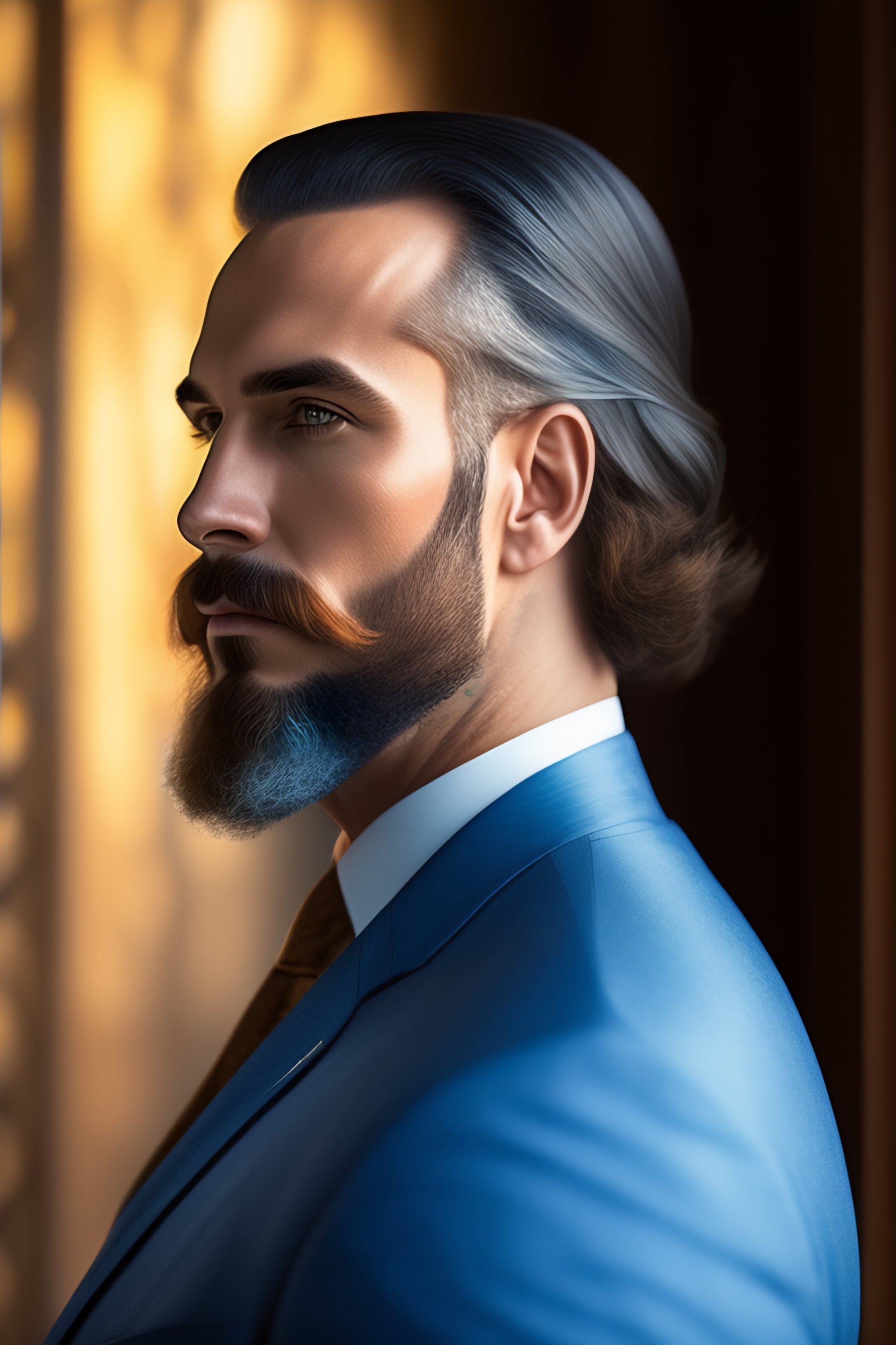 60 year fantasy noble, blue clothes, male, balding, with long brown hair, short mustache and short beard