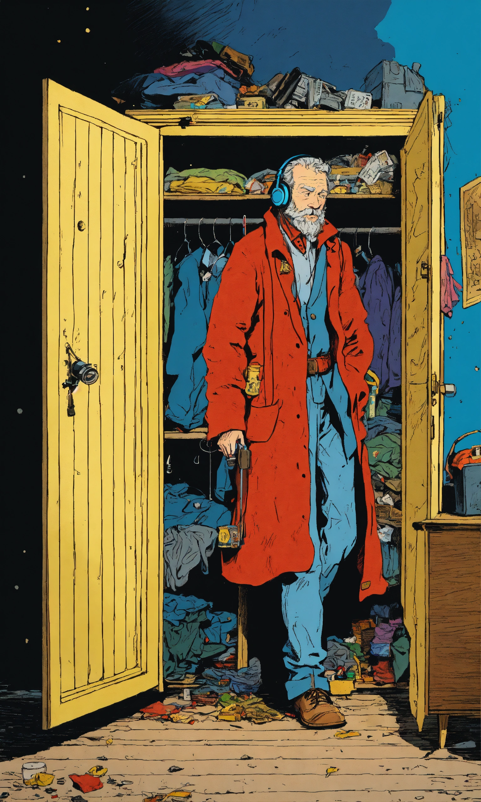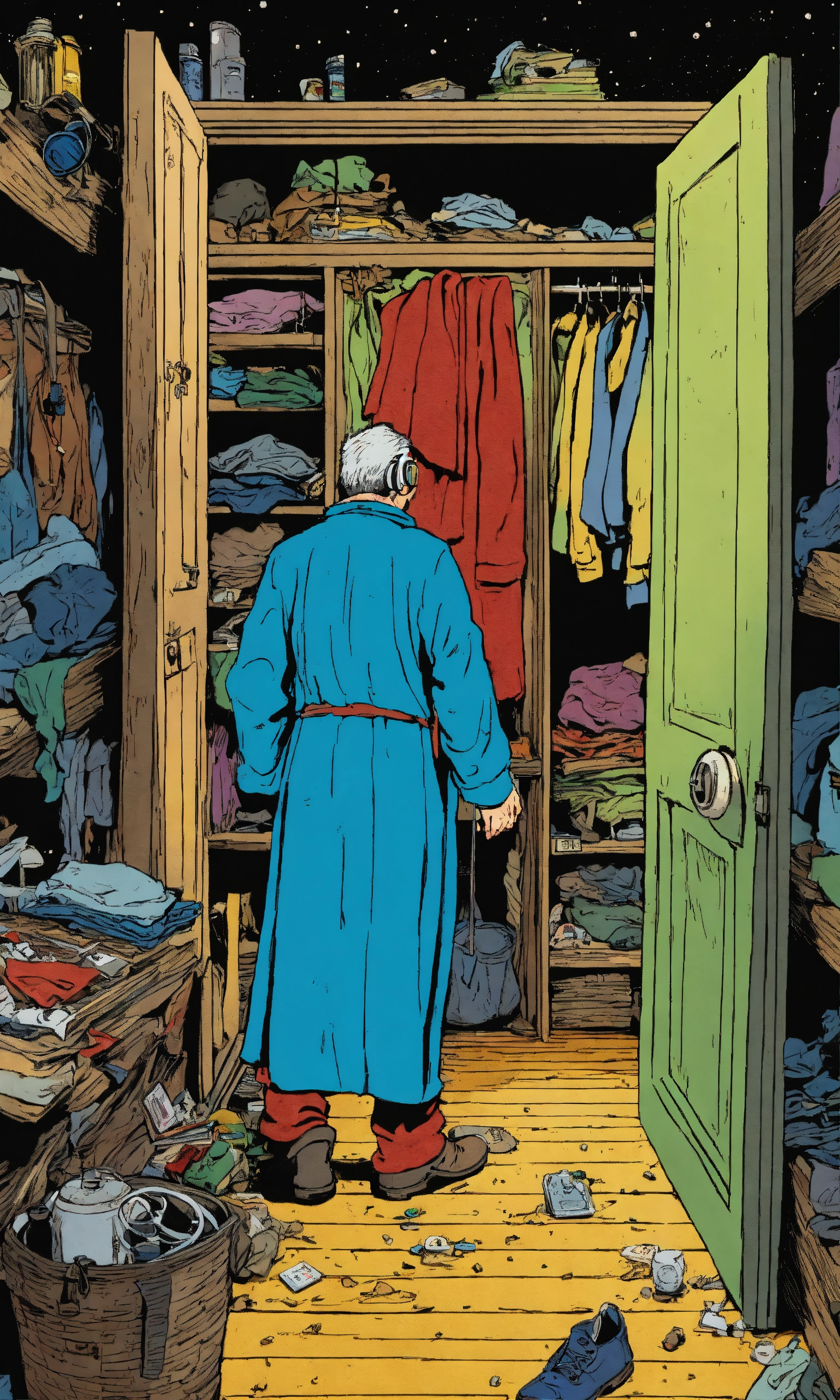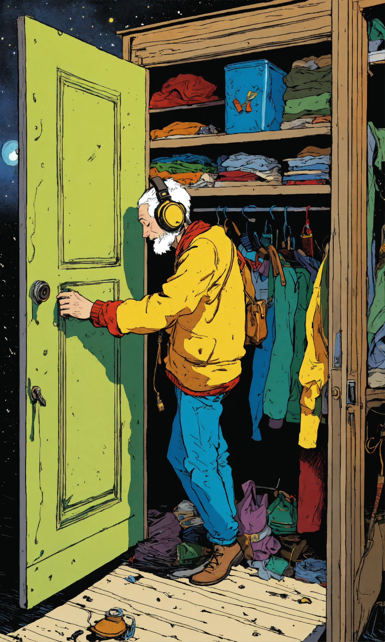 Detailed pen and ink illustration of a wizard man wearing headphones leaving a messy closet, by herge, in the style of tin-tin comics, vibrant colors, detailed, night time, dramatic lighting