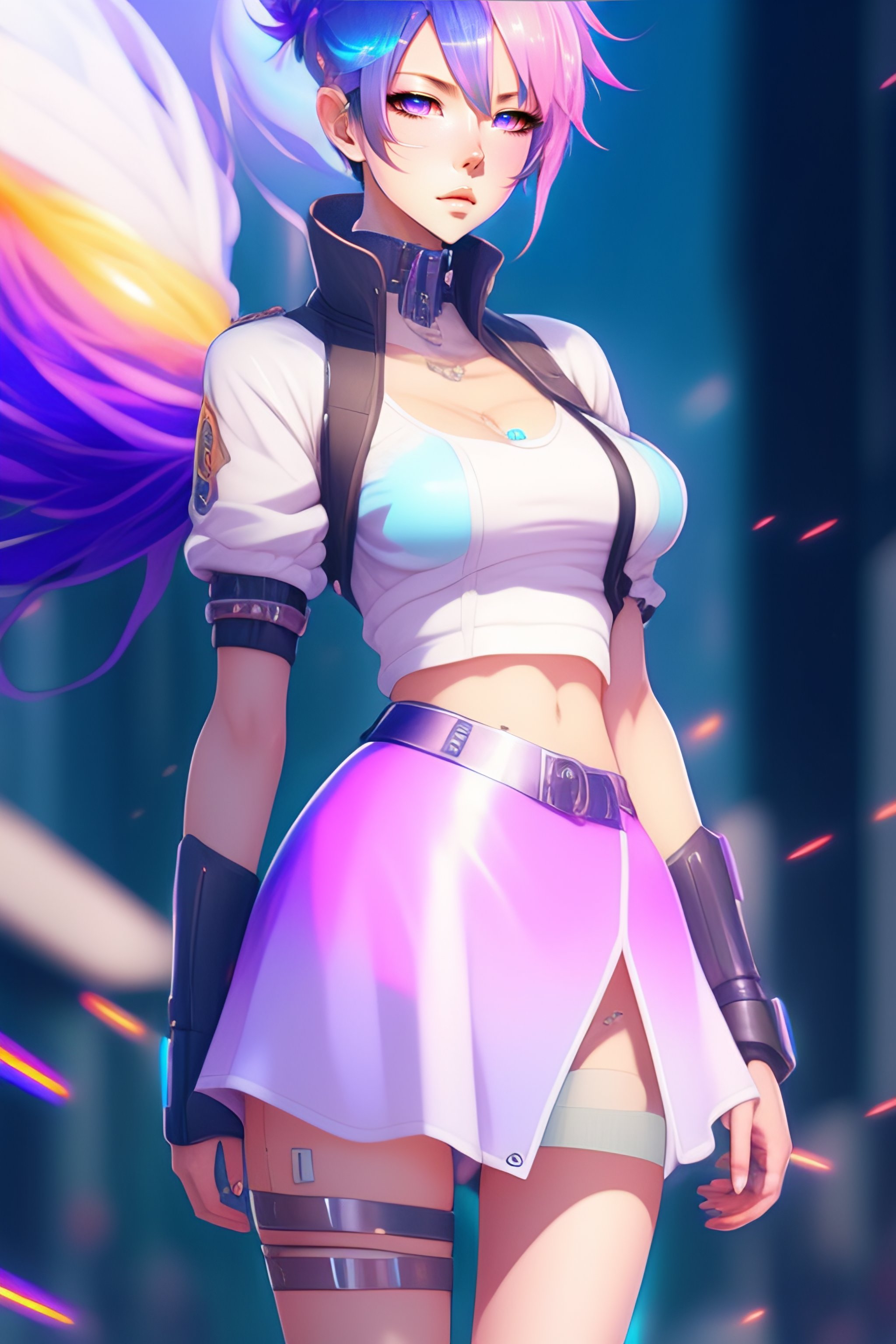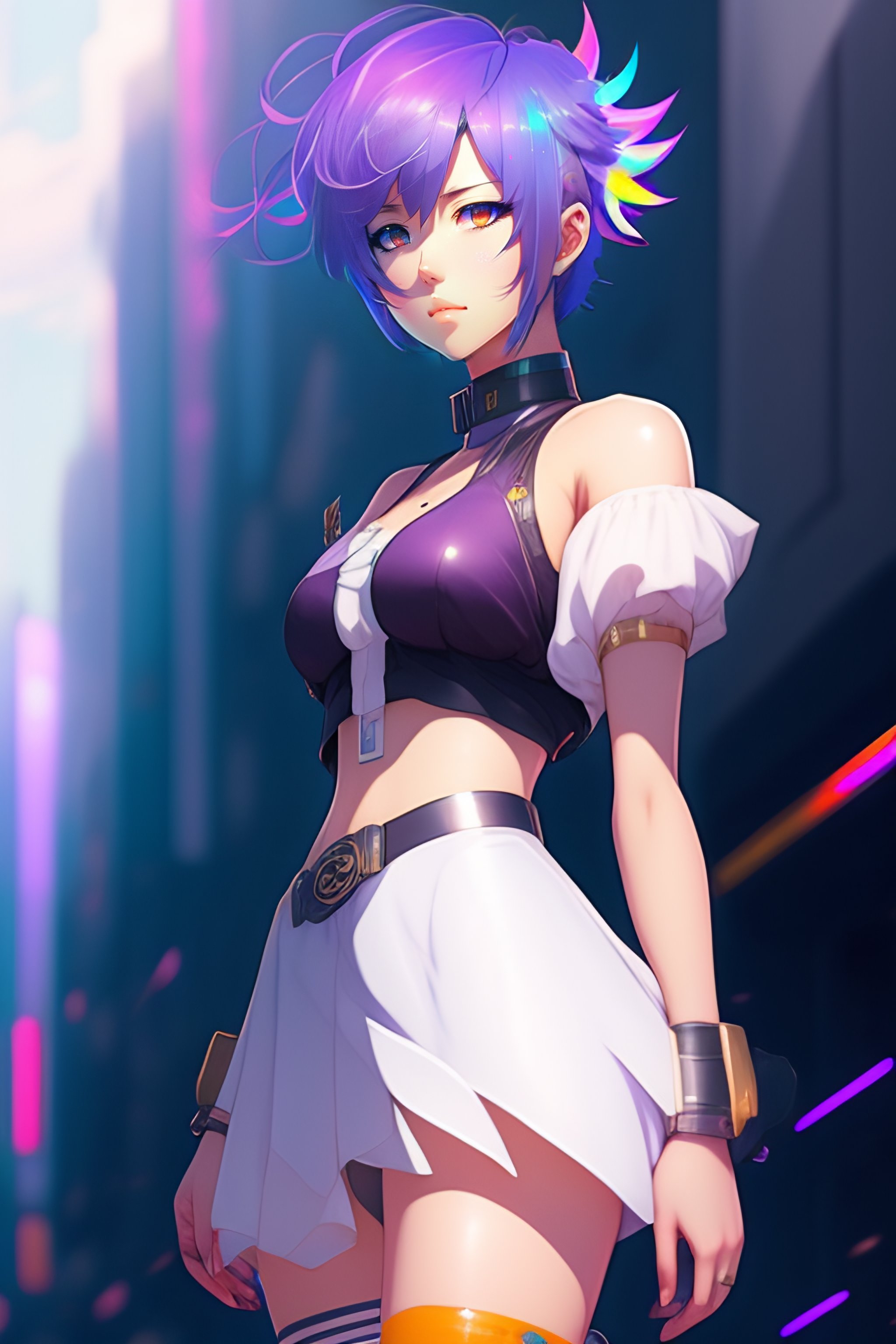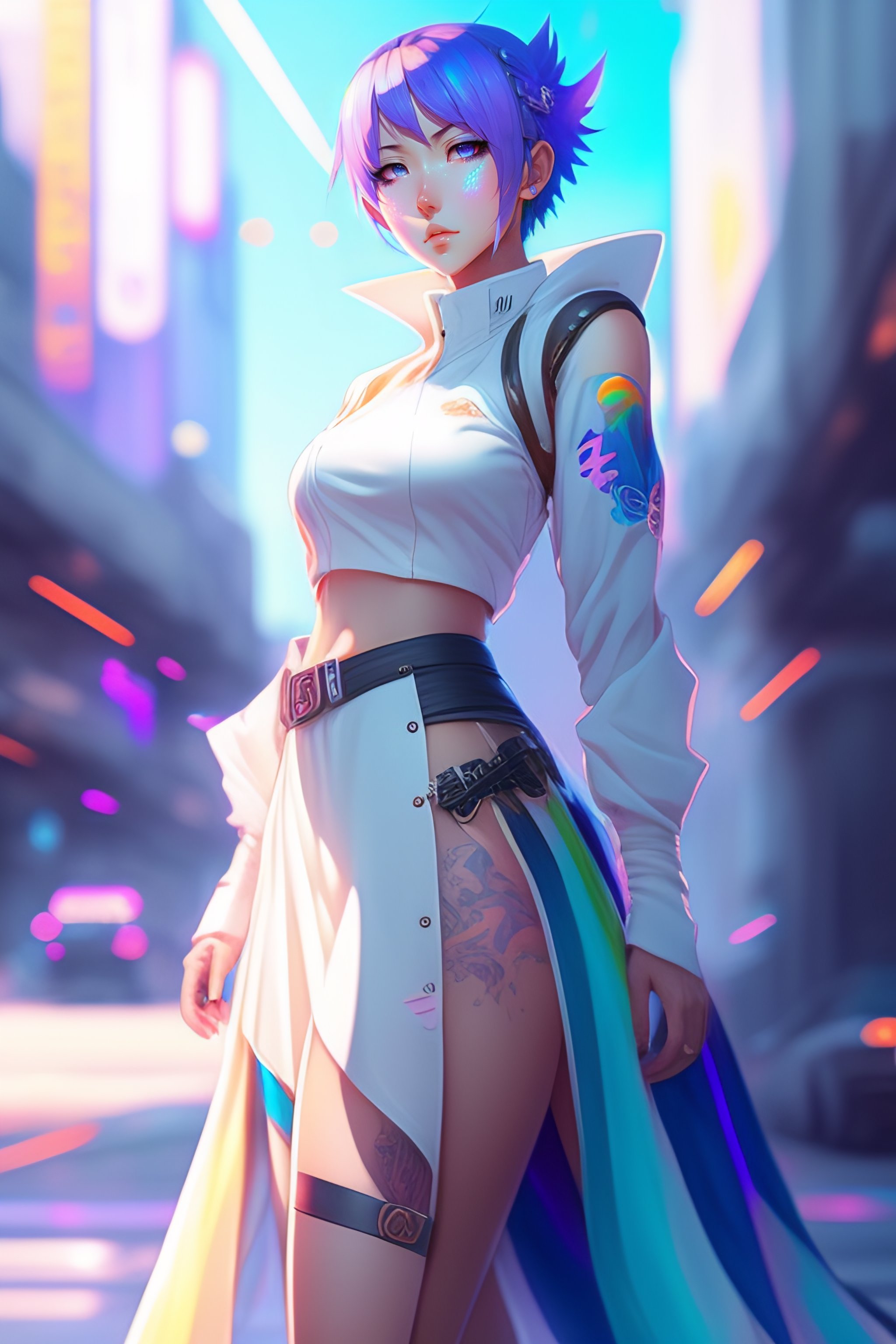 Anime cyberpunk woman with pastel rainbow white blue short hair, full body, skin the sample, bold skirt, bold clothes, light purple eyes, 20 years old, by makoto shinkai, stanley artgerm lau, wlop, rossdraws