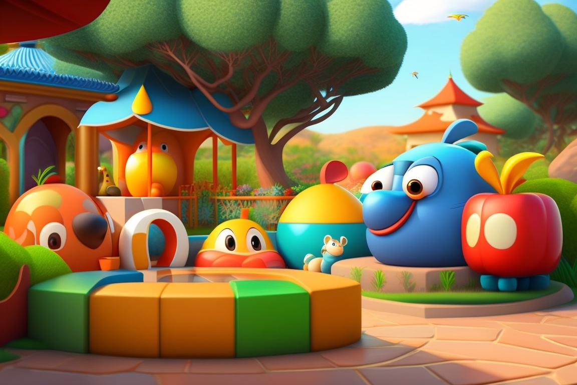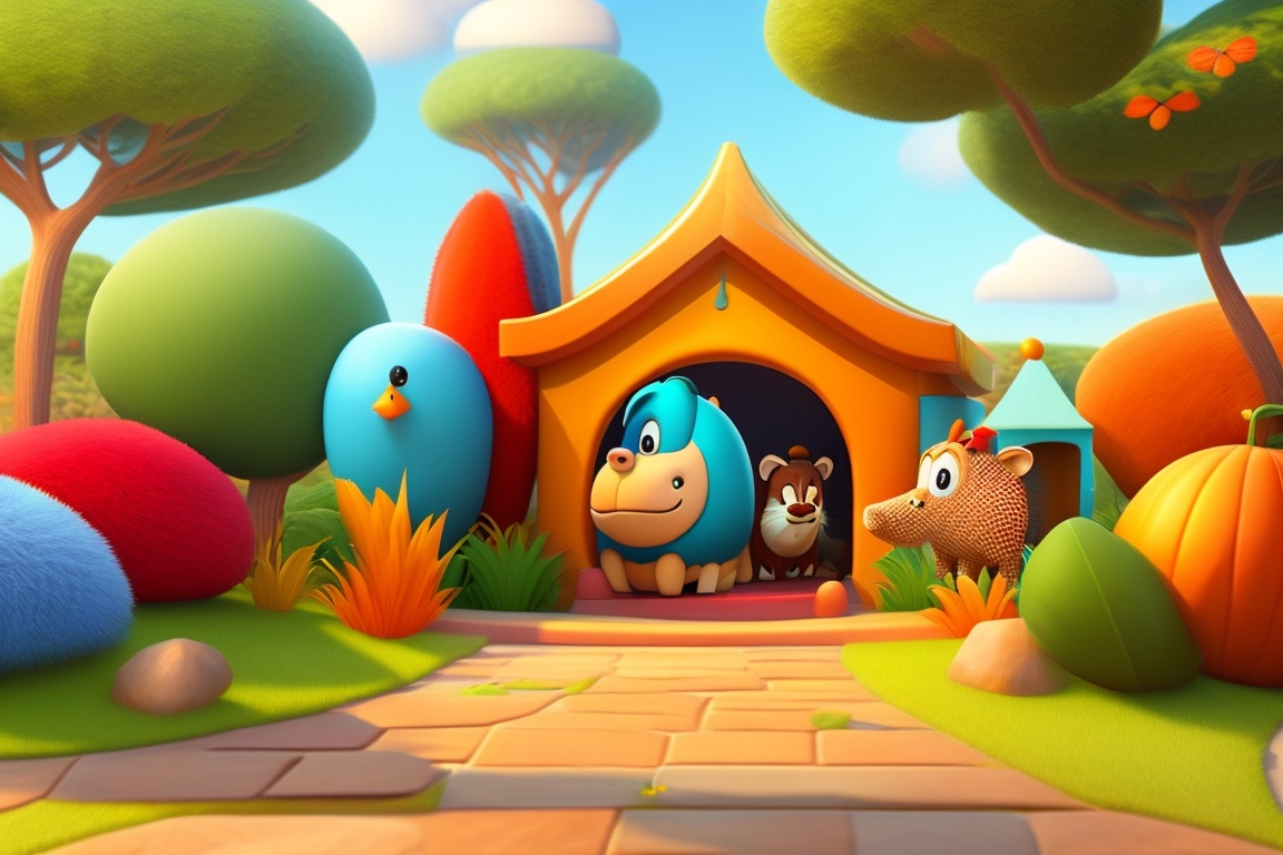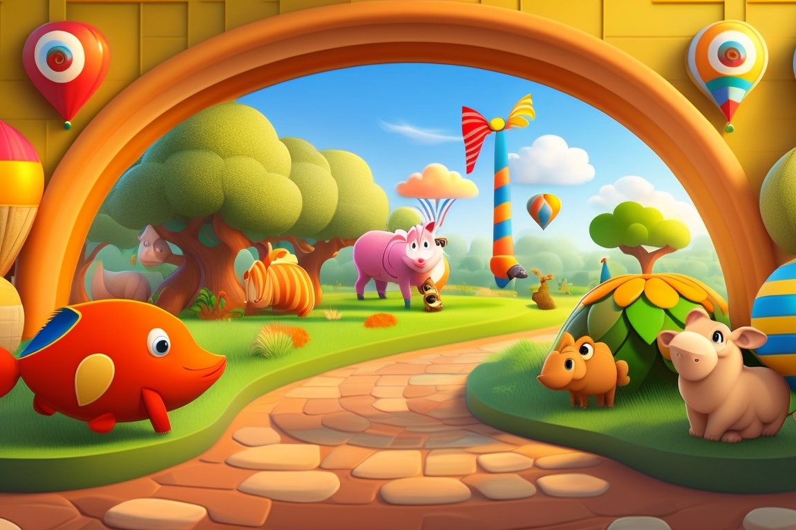 A cartoon background zoo with animals clear picture, eye catching colours, pixar art style 3d, with zoo animals