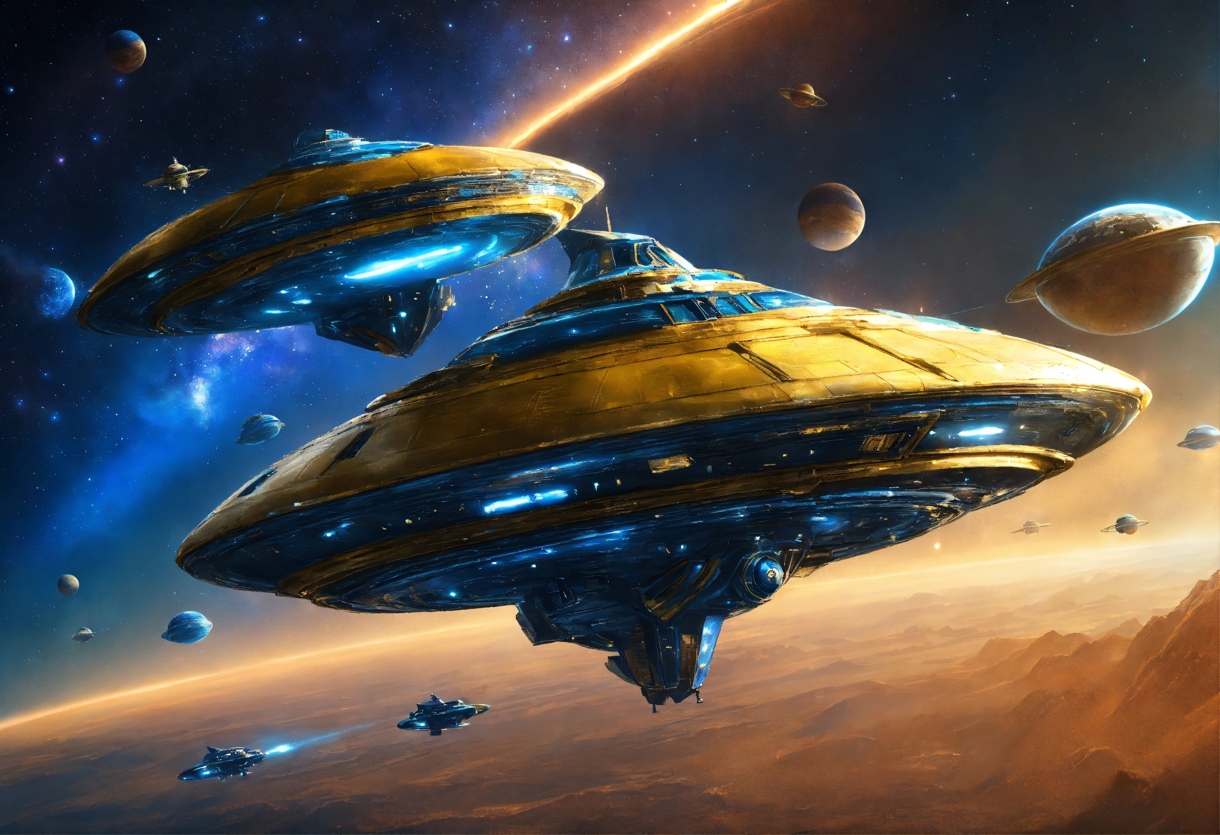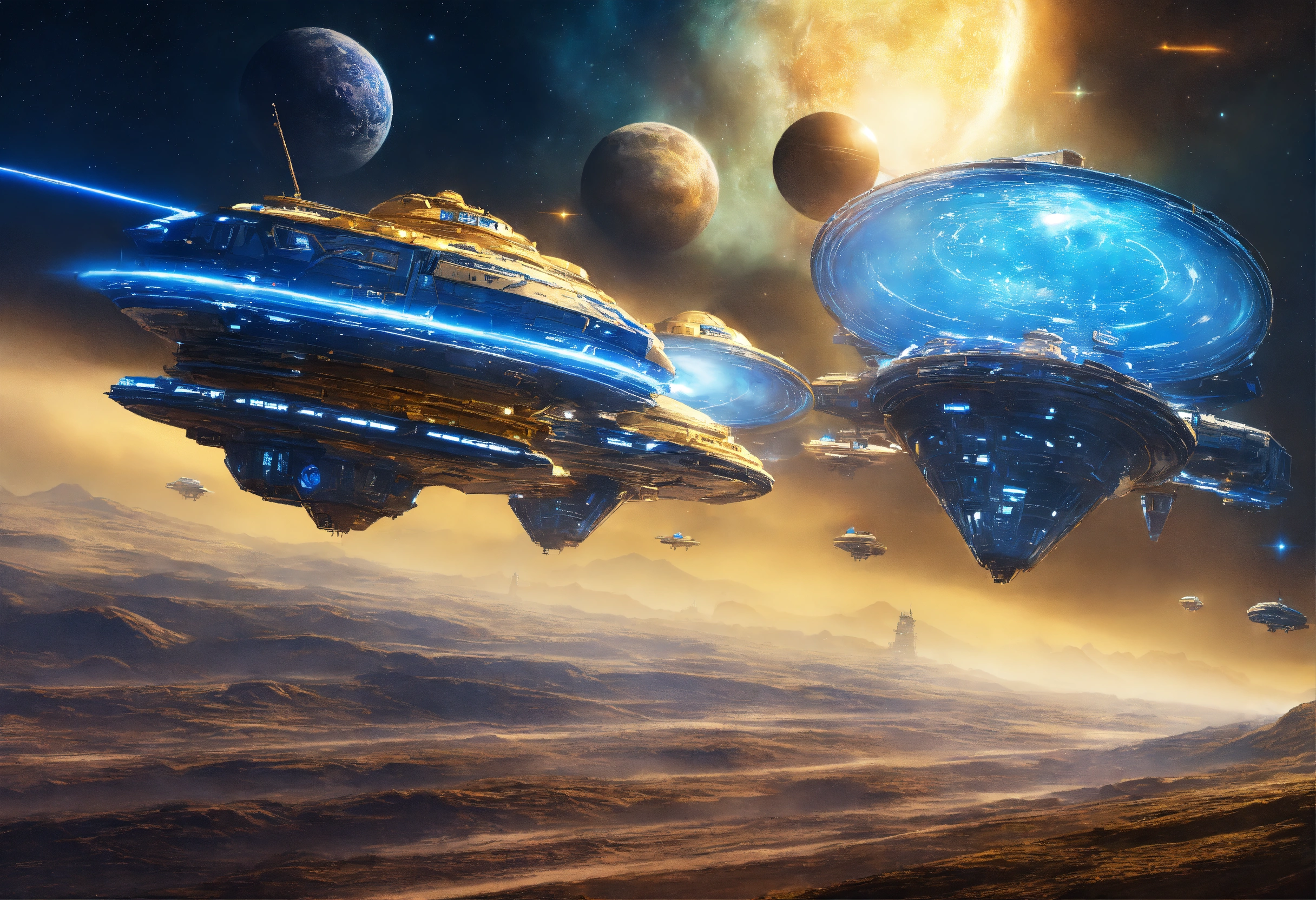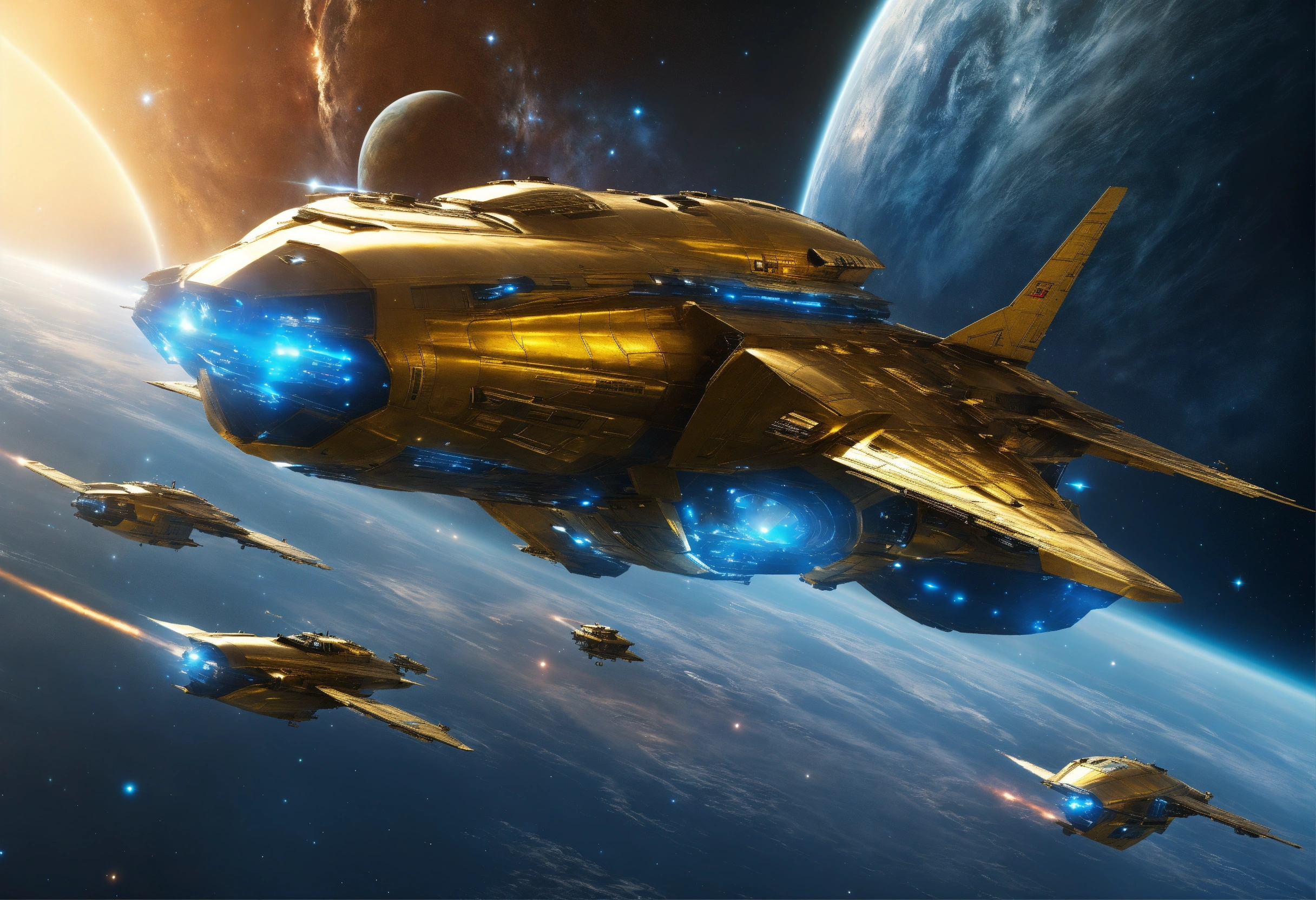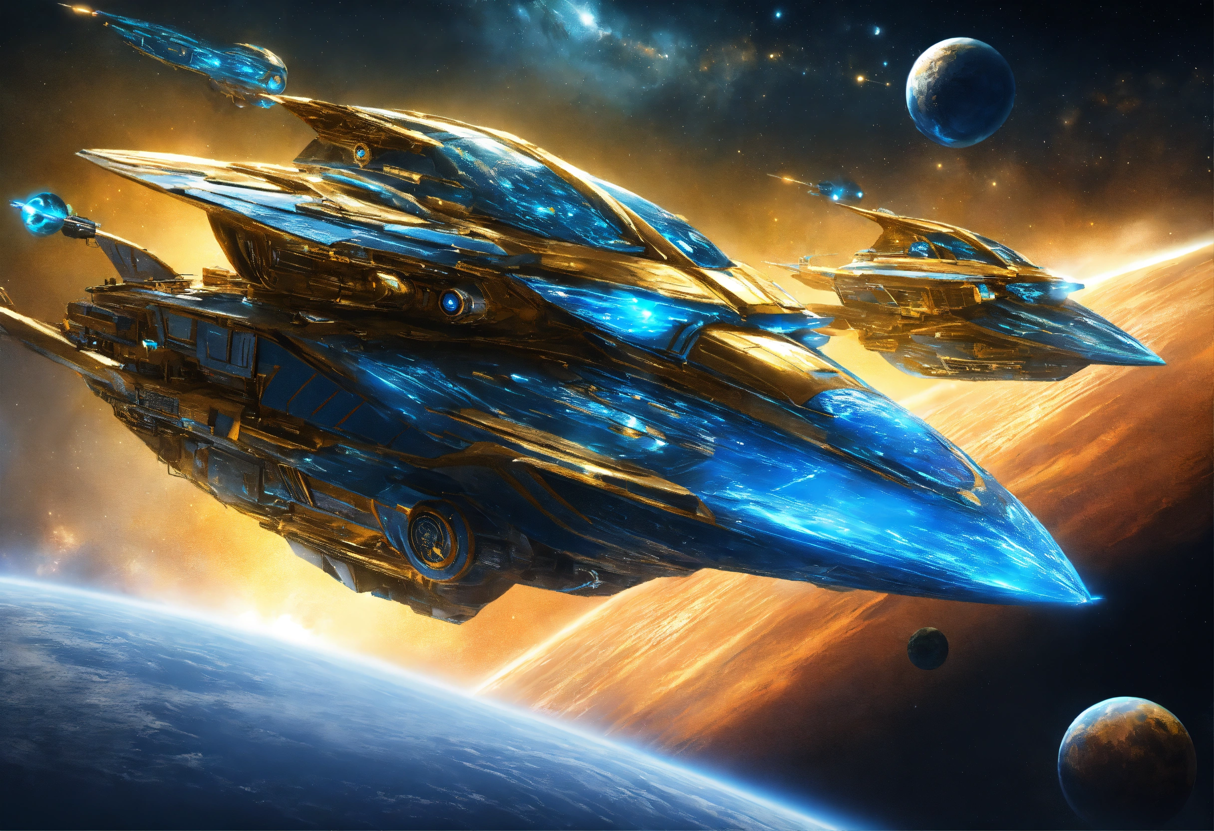 Epic gigantic blue golden and blue silber spaceships moving in unknown space
