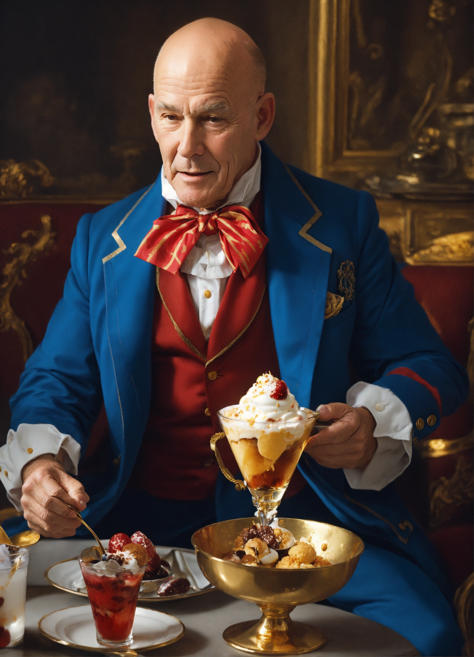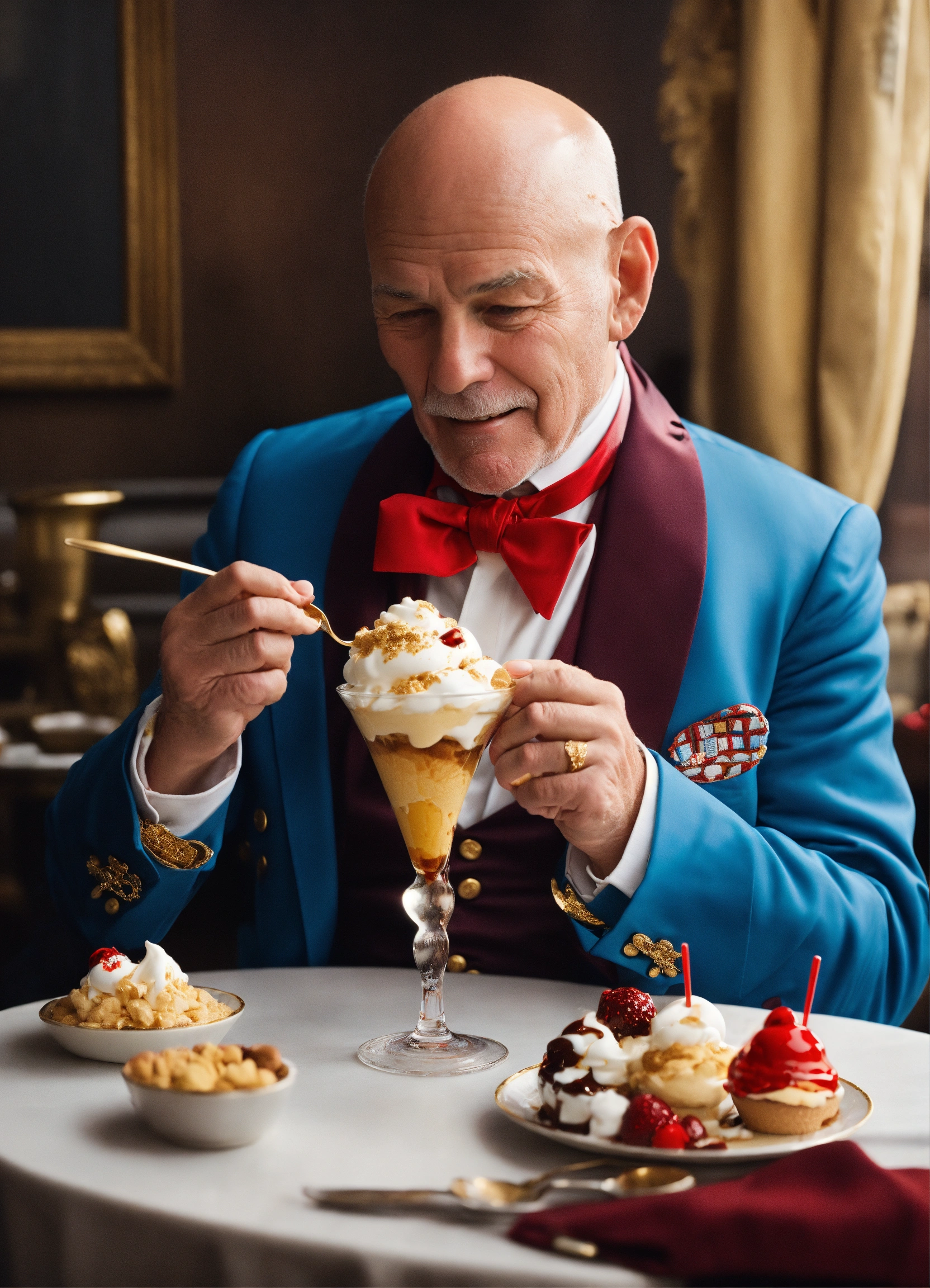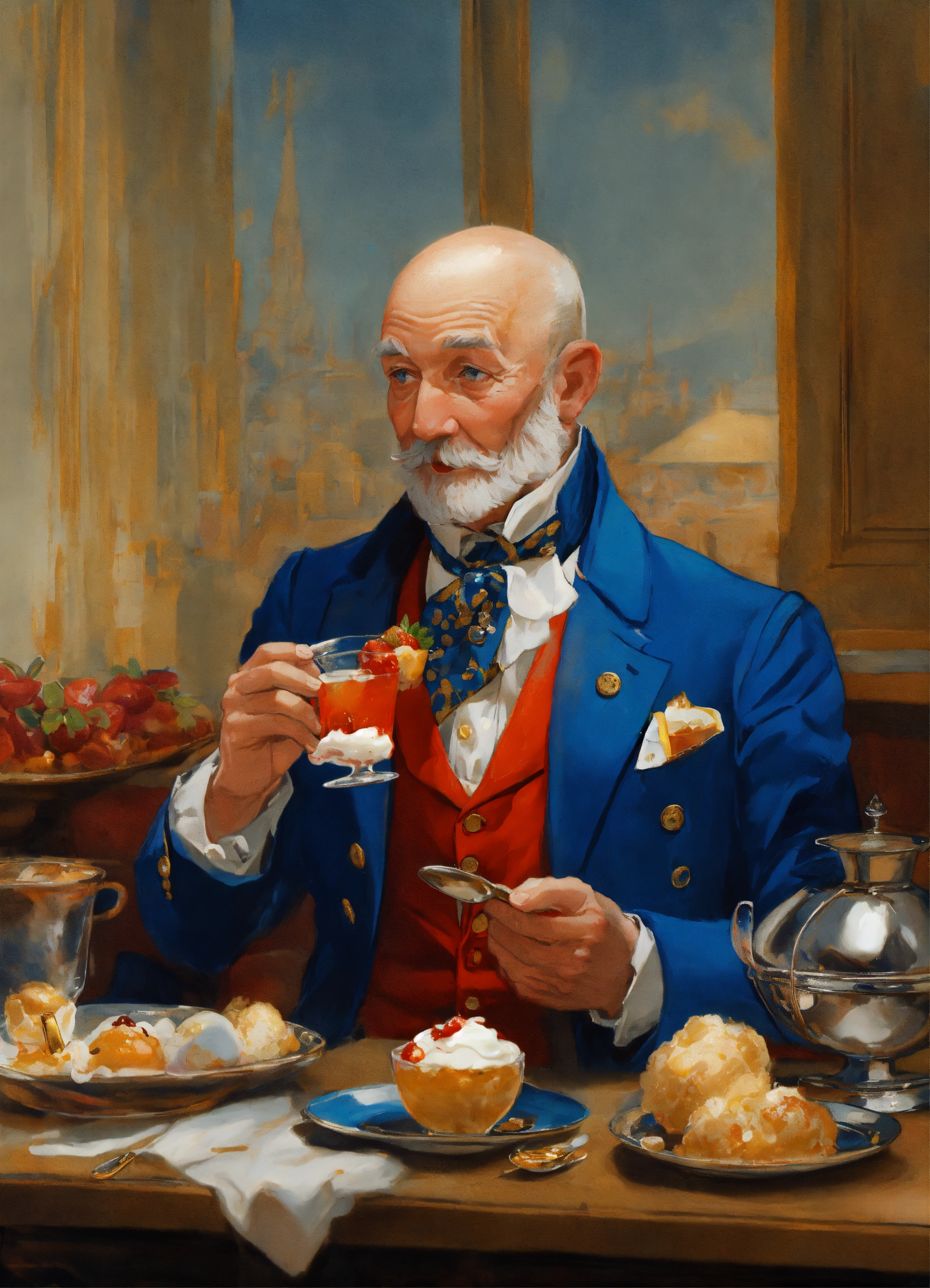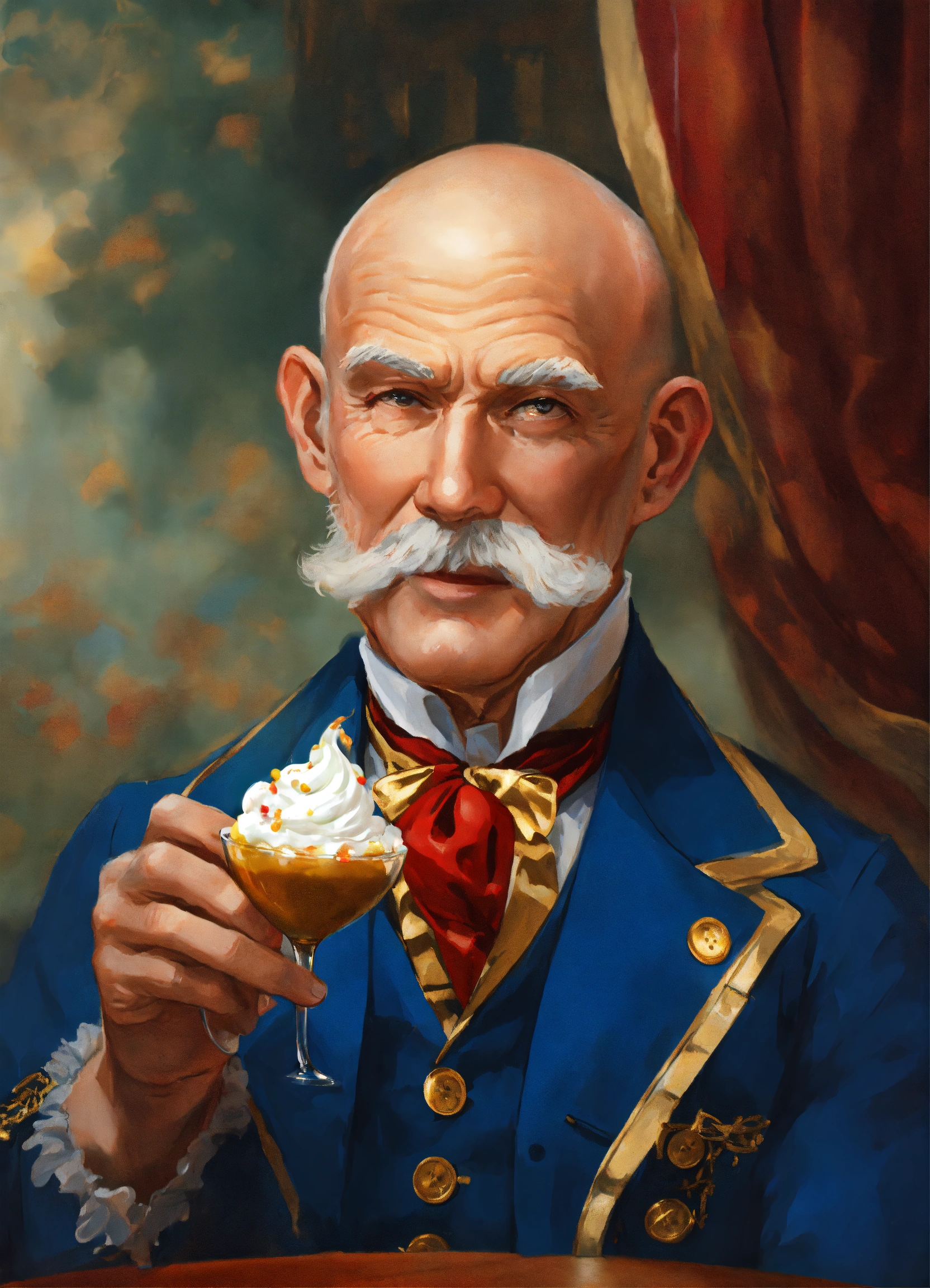 Old man. bald head. white wispy hair. blue blazer with gold buttons. cravat. jolly, red-faced. eating a sundae.
