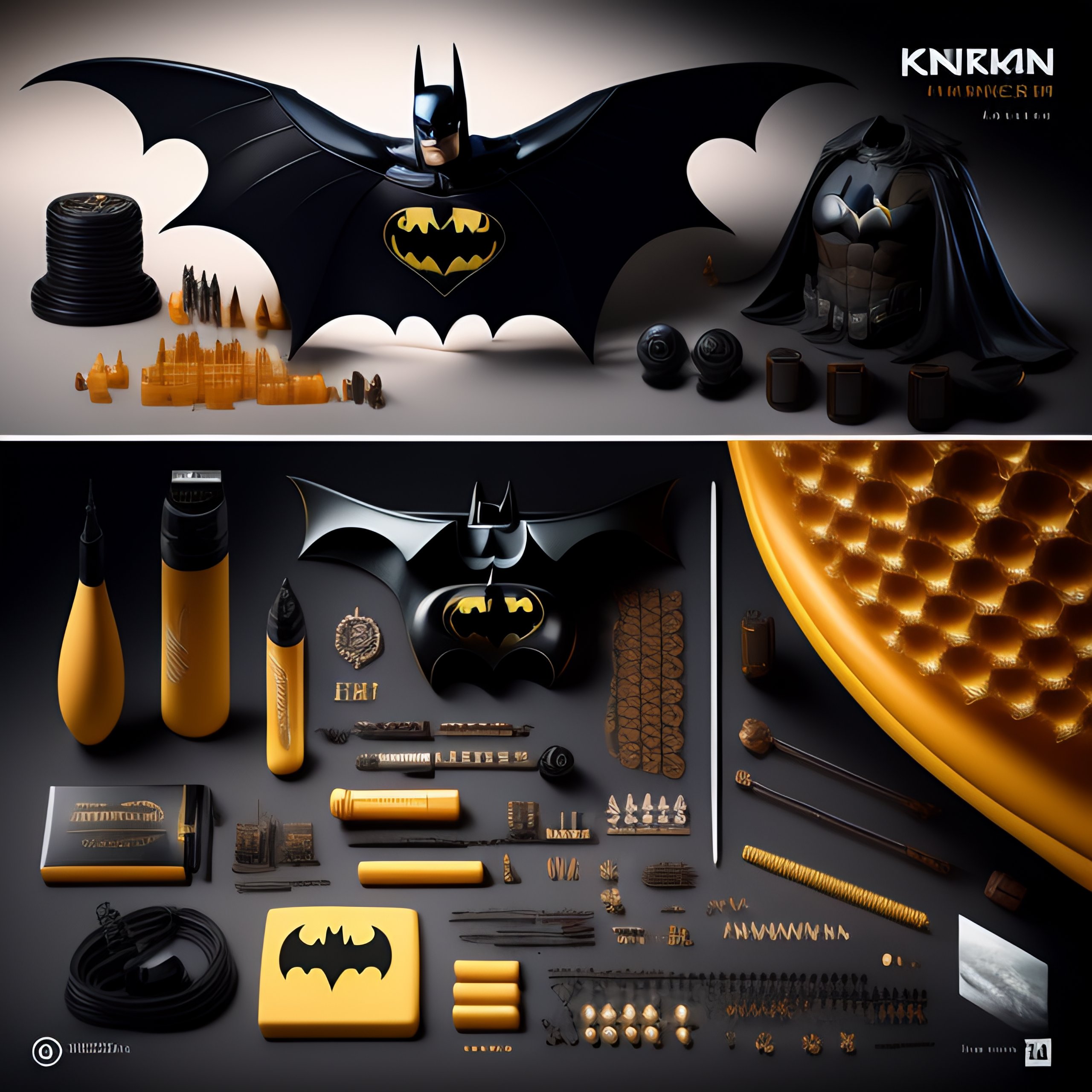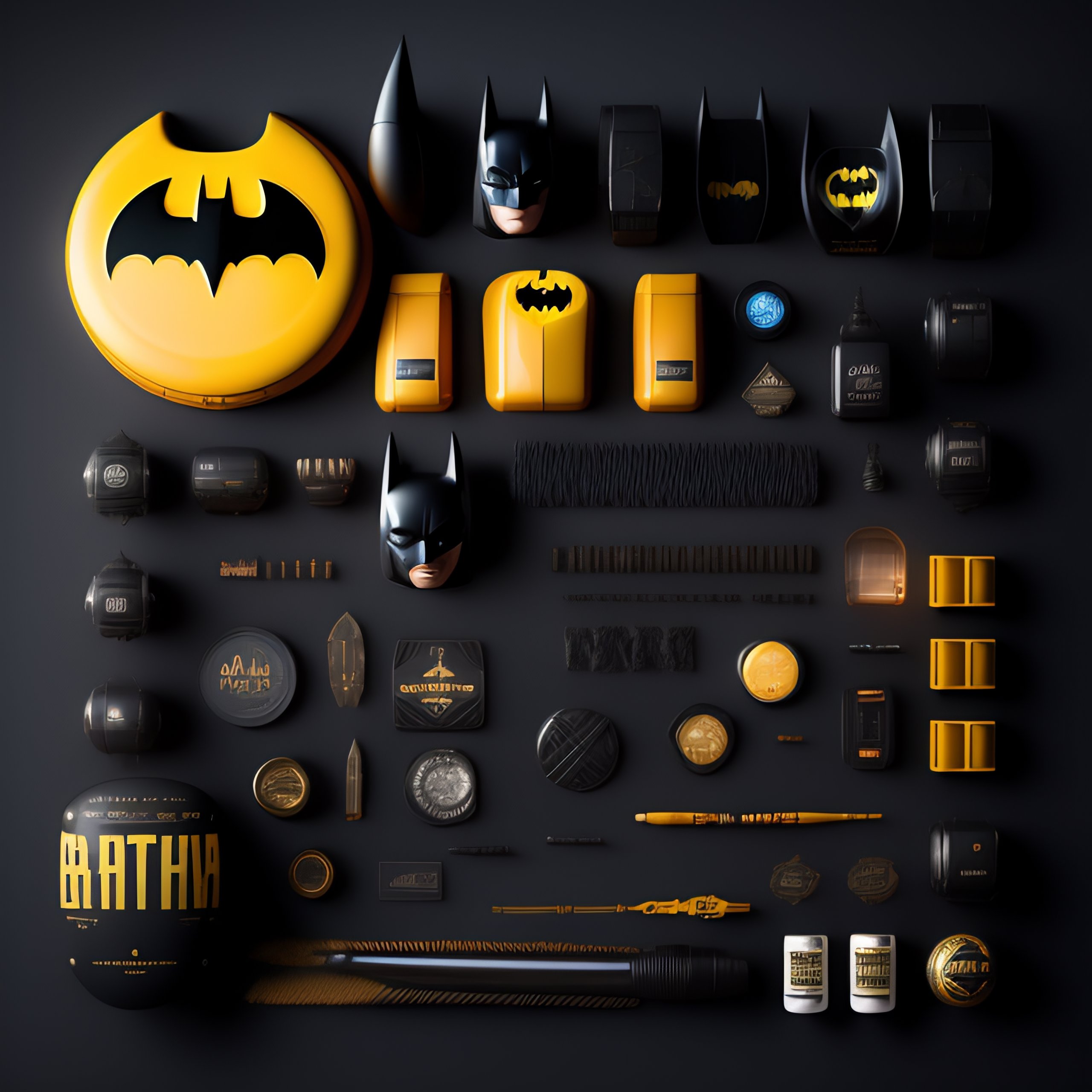 Batman, costumes and props, knolling, knolling layout, deconstruction, highly detailed, depth, many parts, lumen render, 8k