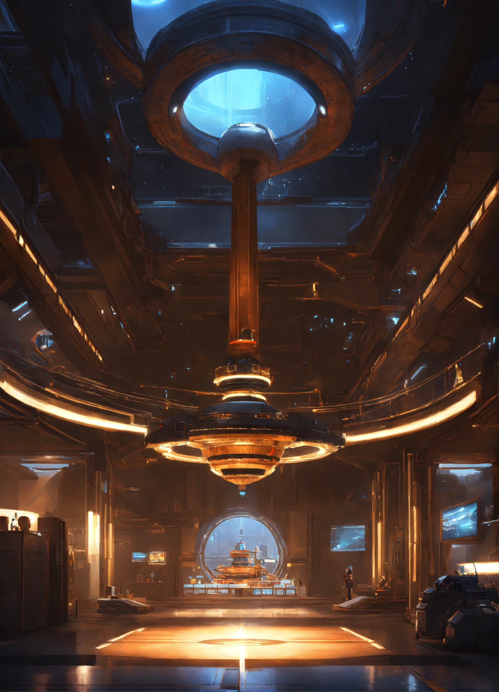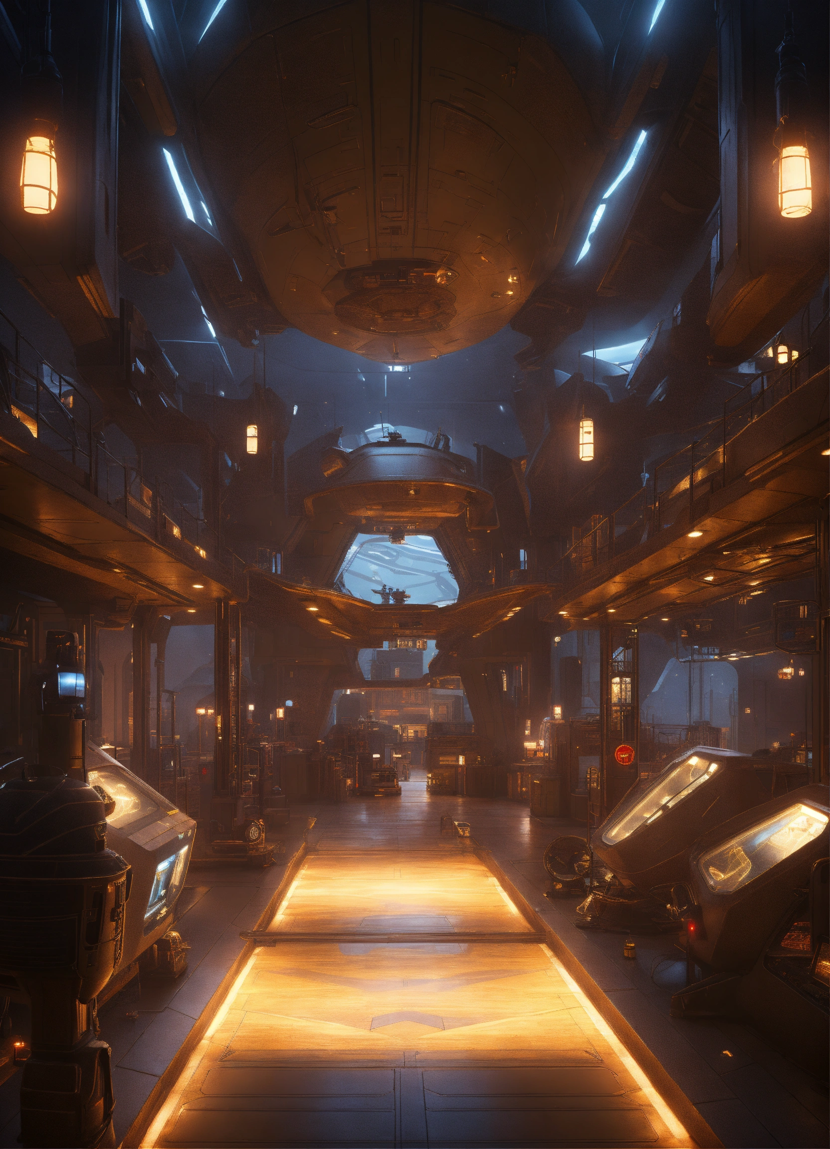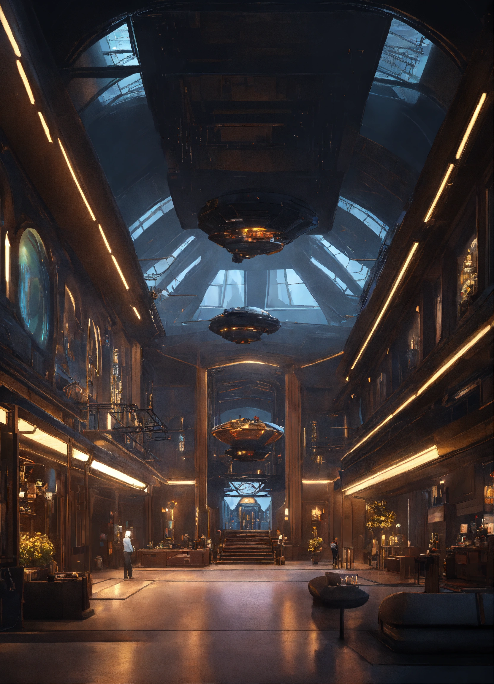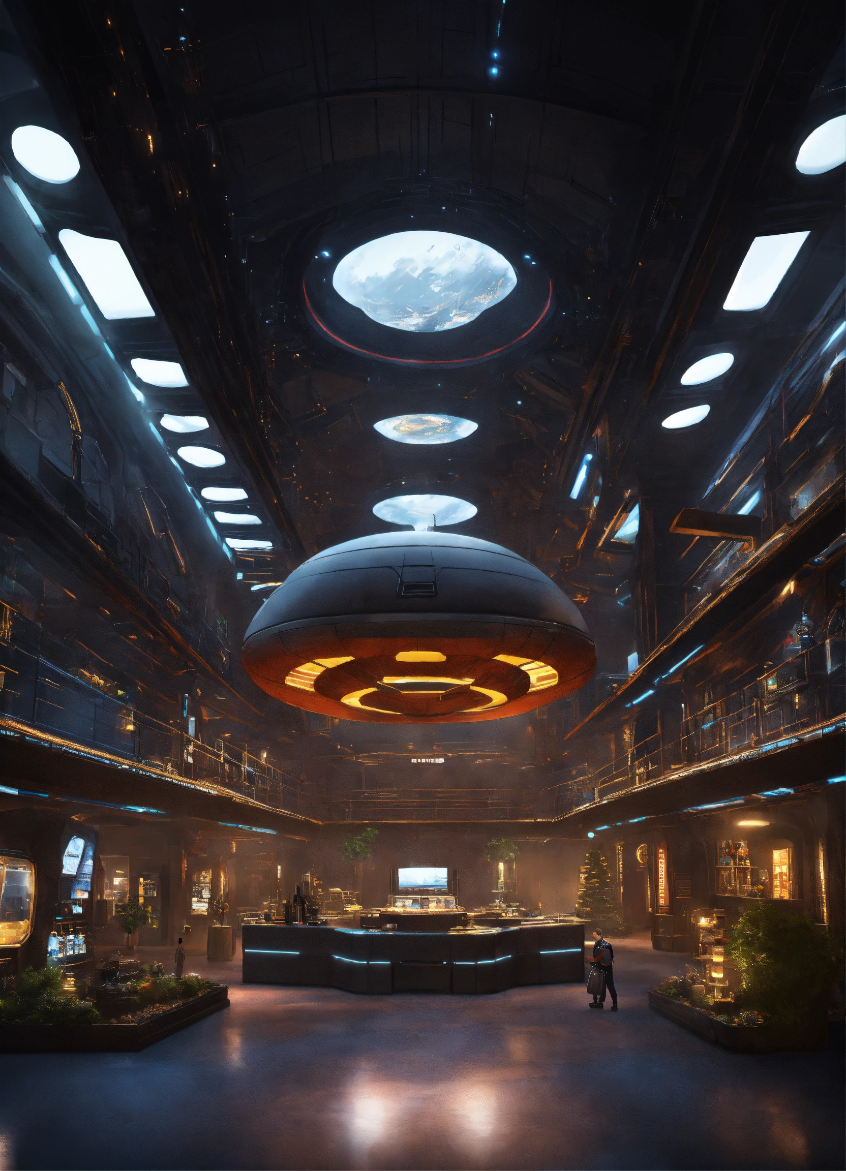 Large spaceship lobby, modern design, classic artifact decor, small-size in height, concept art, dark, mini-ship hangar stations, a shop, festive light decor