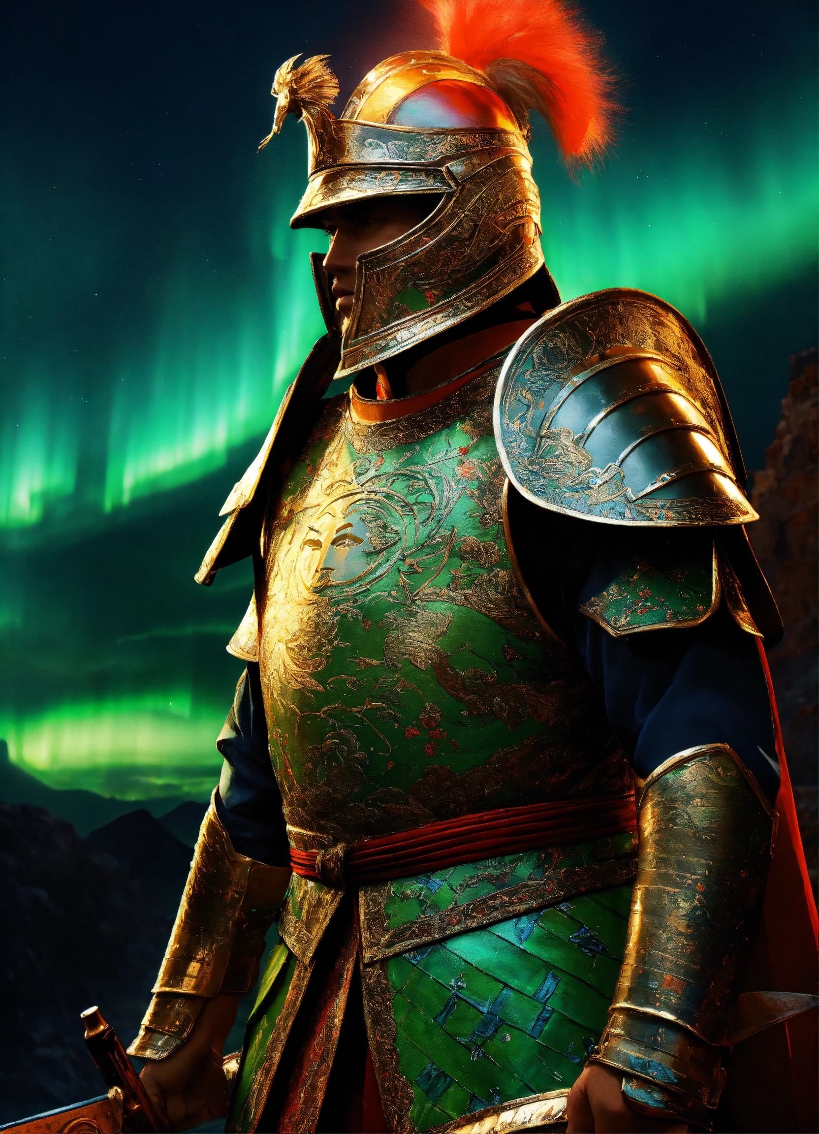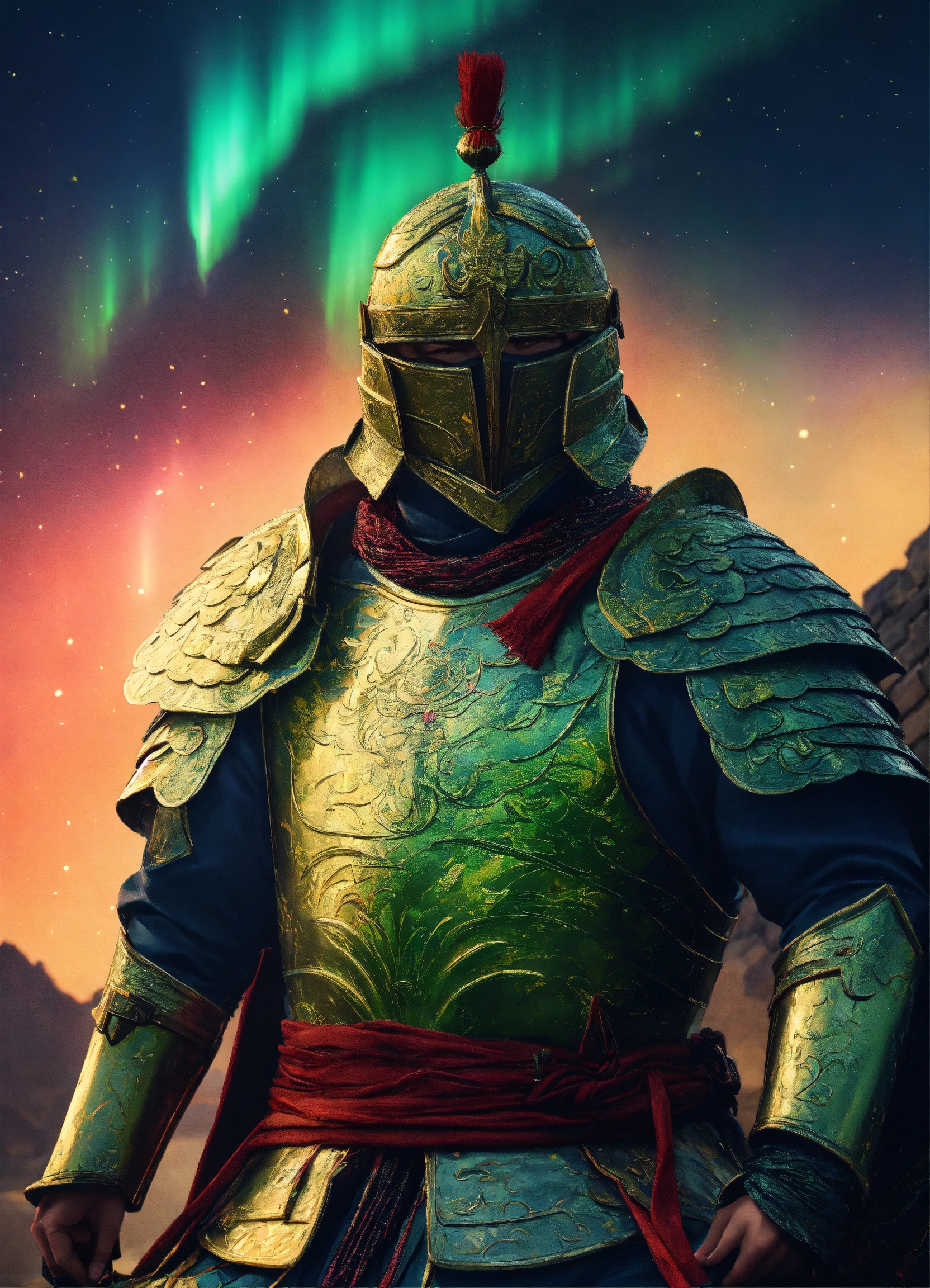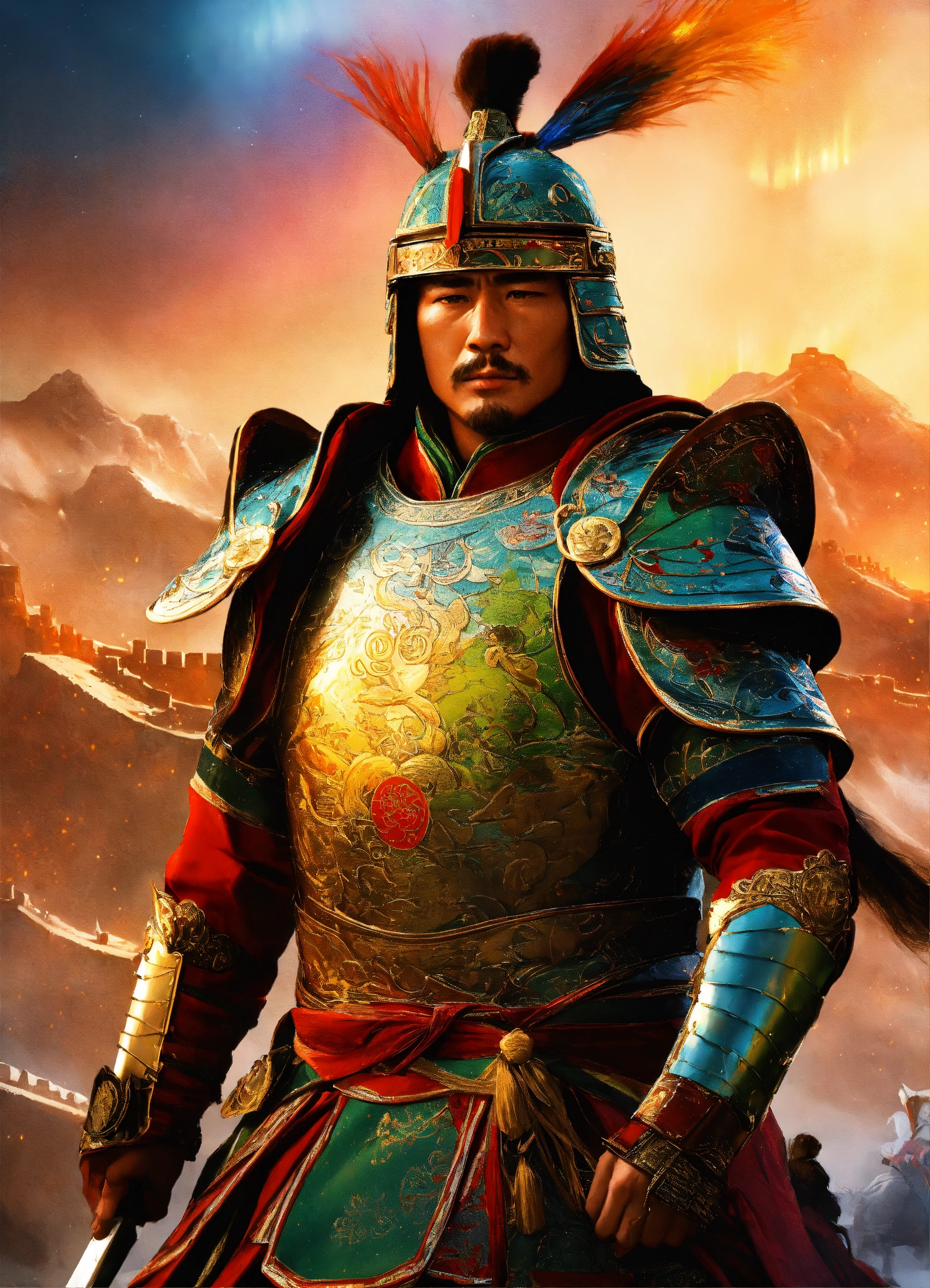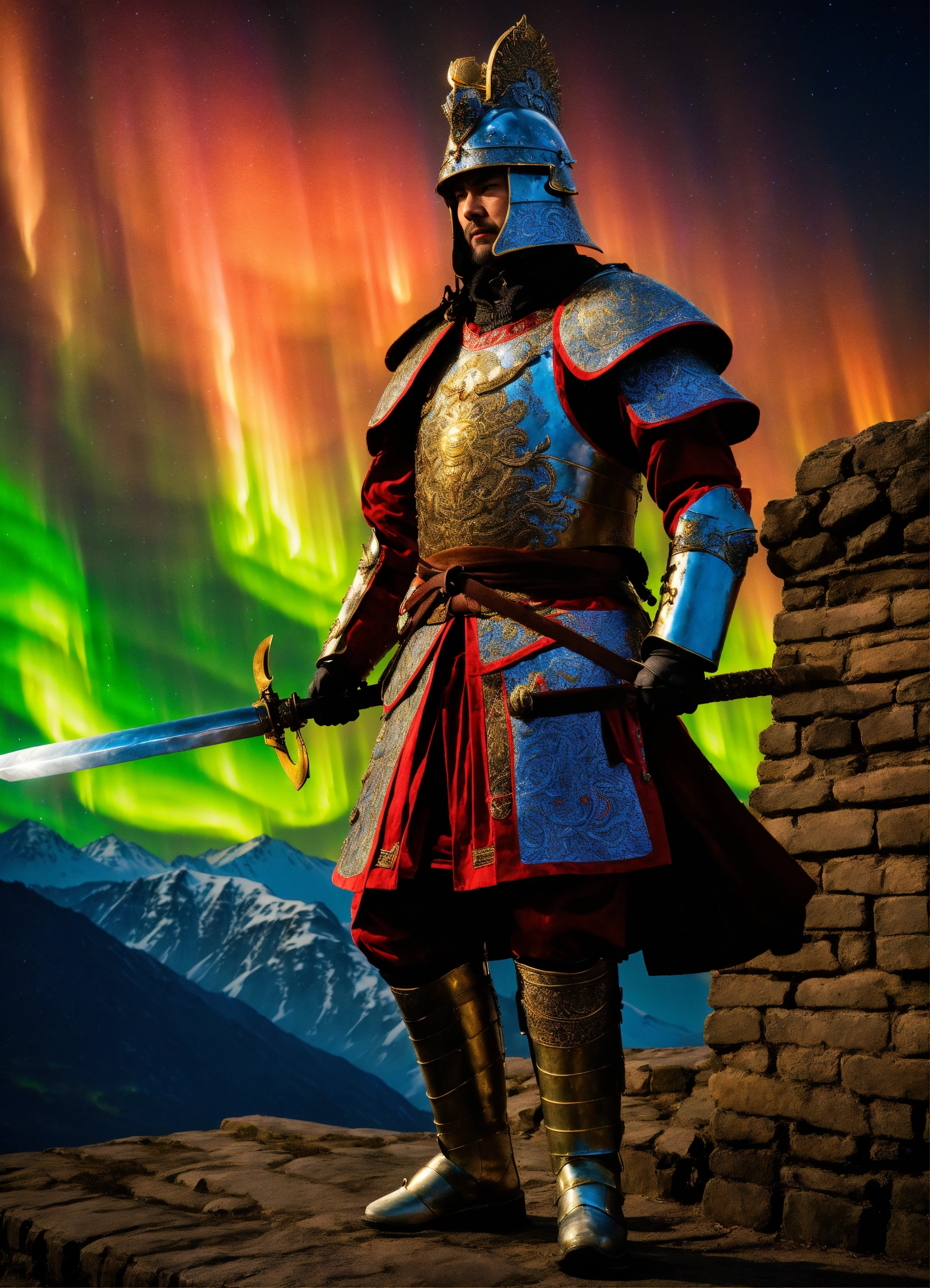 Battle-hardened general, ready for war, mythical asia, armor adorned with patterns of the northern lights, atop the great wall, rallying troops with the dazzling spectacle of the aurora behind, dynamic stance, hyper-realistic, photo realism, cinematography --ar 916."