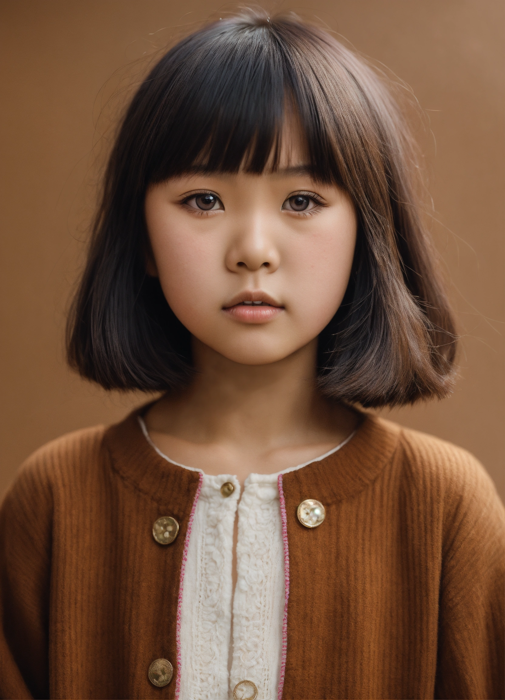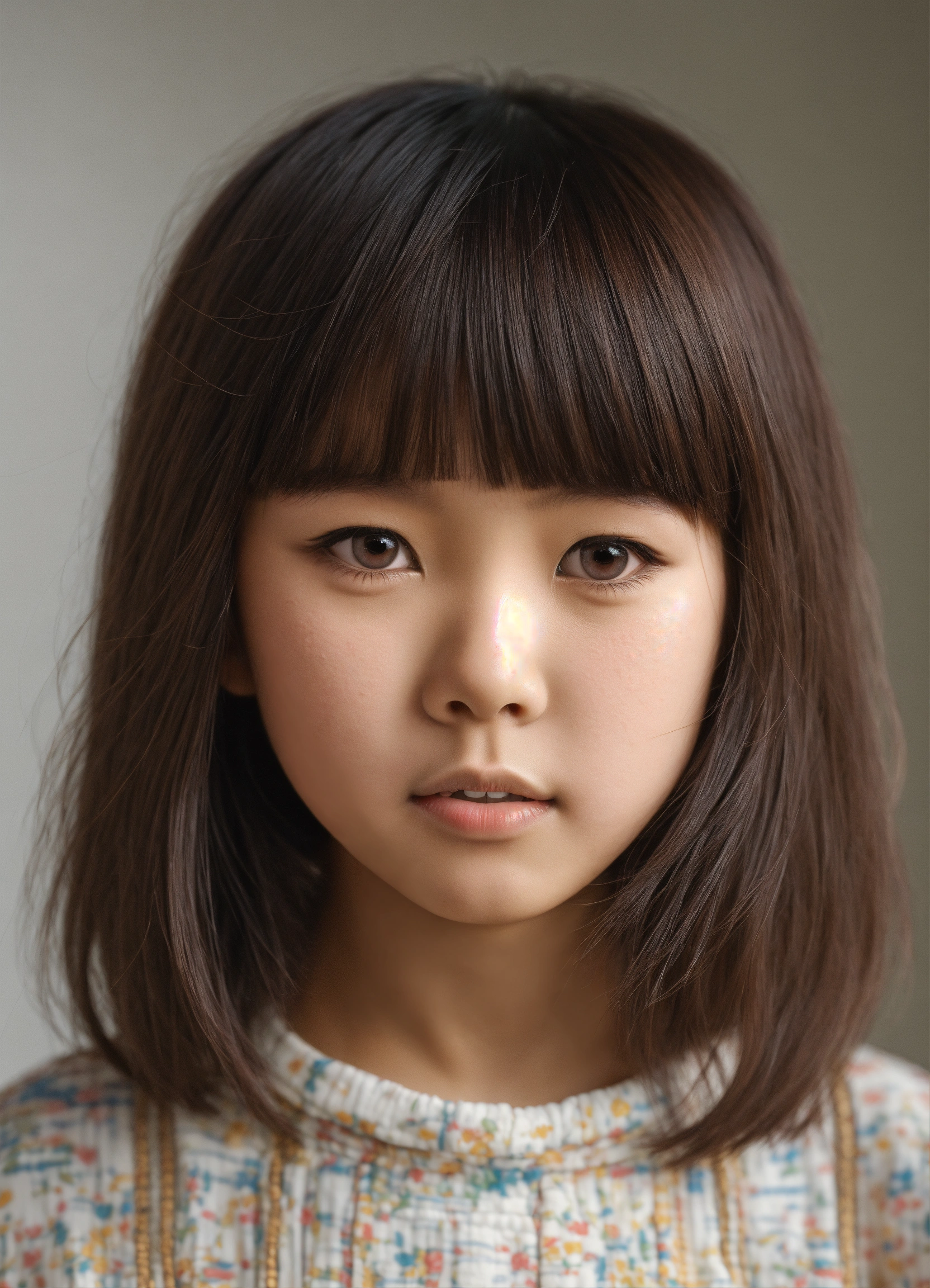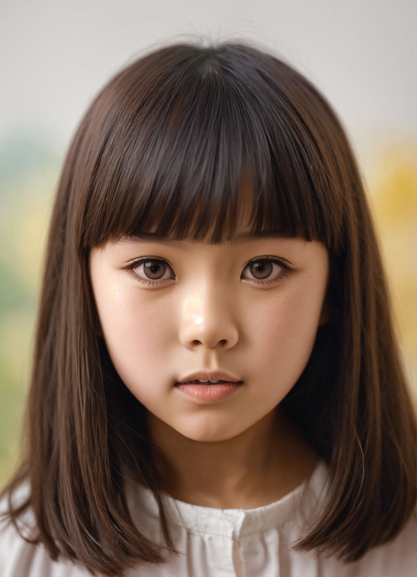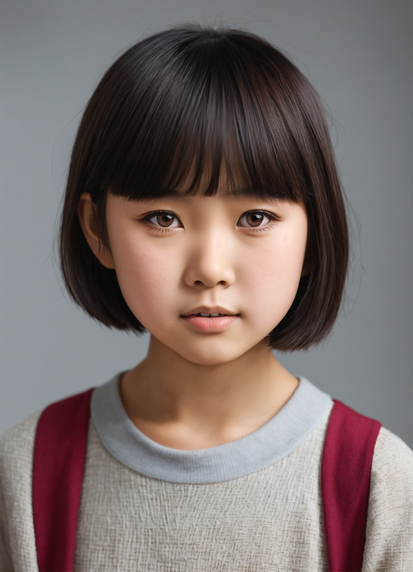 Young asian girl short hair like 8 years old, blunt bangs photo realistic, big brown eyes white background
