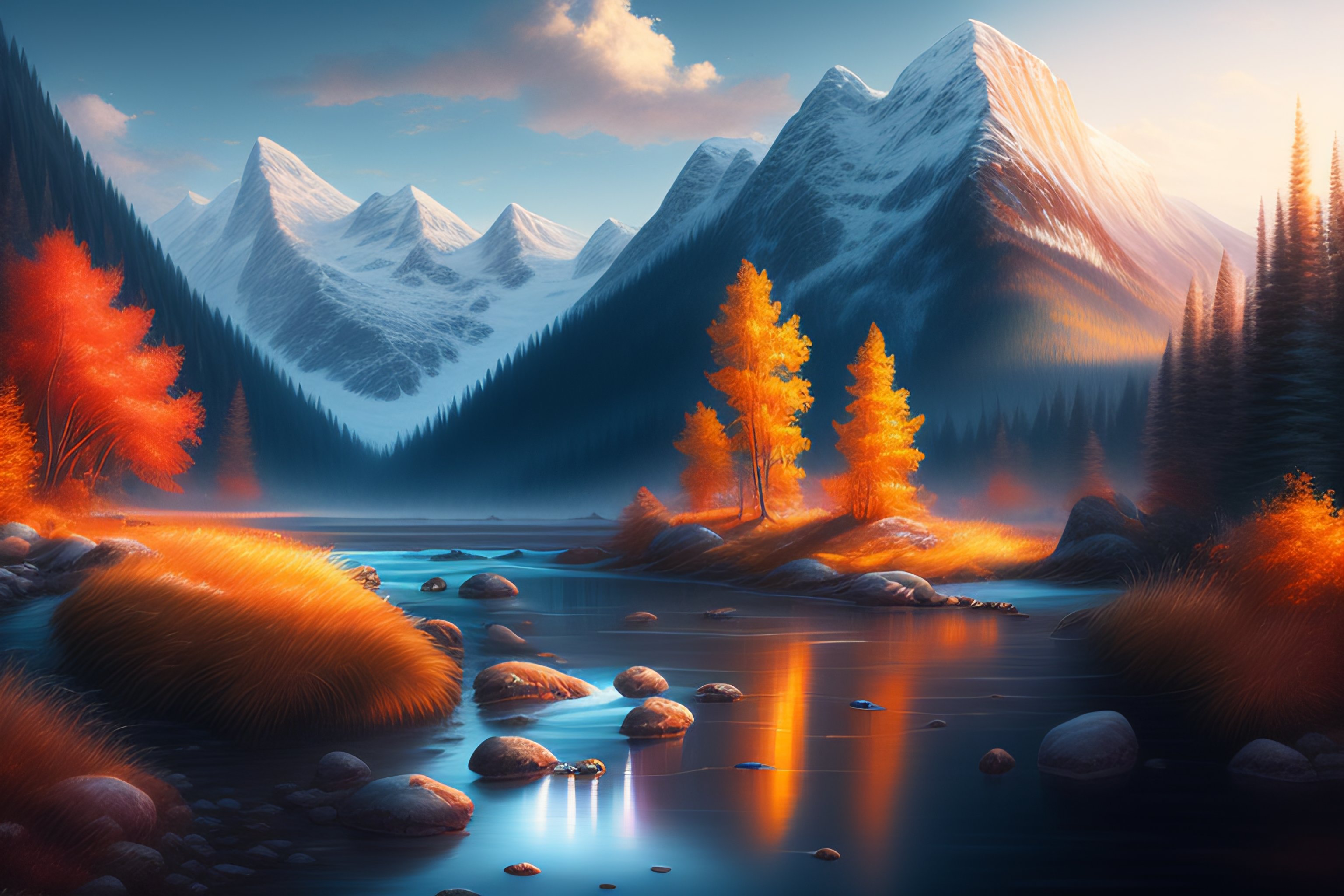 Mountain river landscape, highly detailed, digital painting, sharp focus, cinematic lighting, diffuse lighting, intricate, lifelike, photorealistic