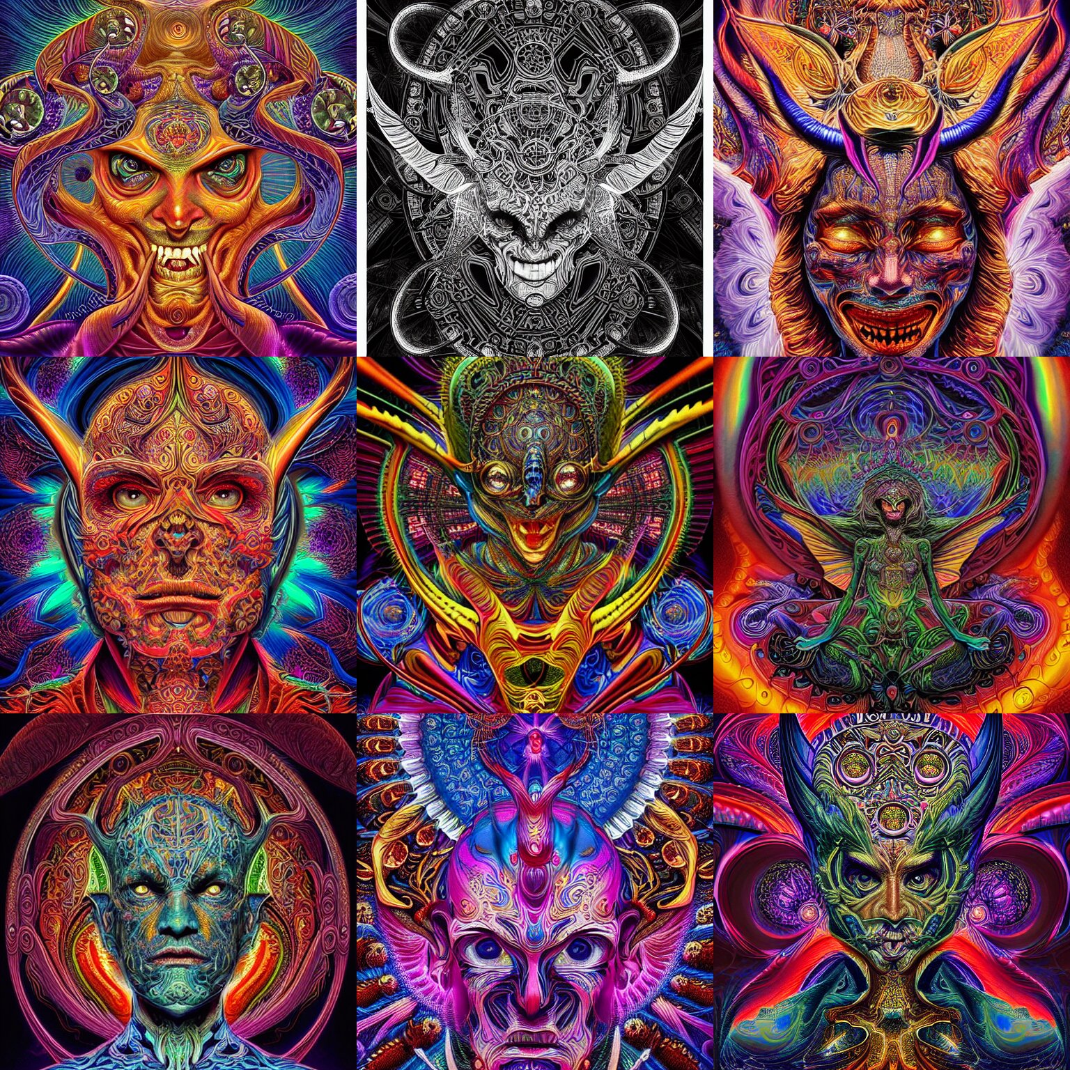 A intricate ornate psychedelic image of a devil, digital art by felix kelly, alex grey, dan mumford, artgerm, psychedelic art, psychedelic, fractalism, fractals, sacred geometry, artstation, detailed, art, hyper realism, hyper detailed, cgsociety, ue 5, hd, 3 d