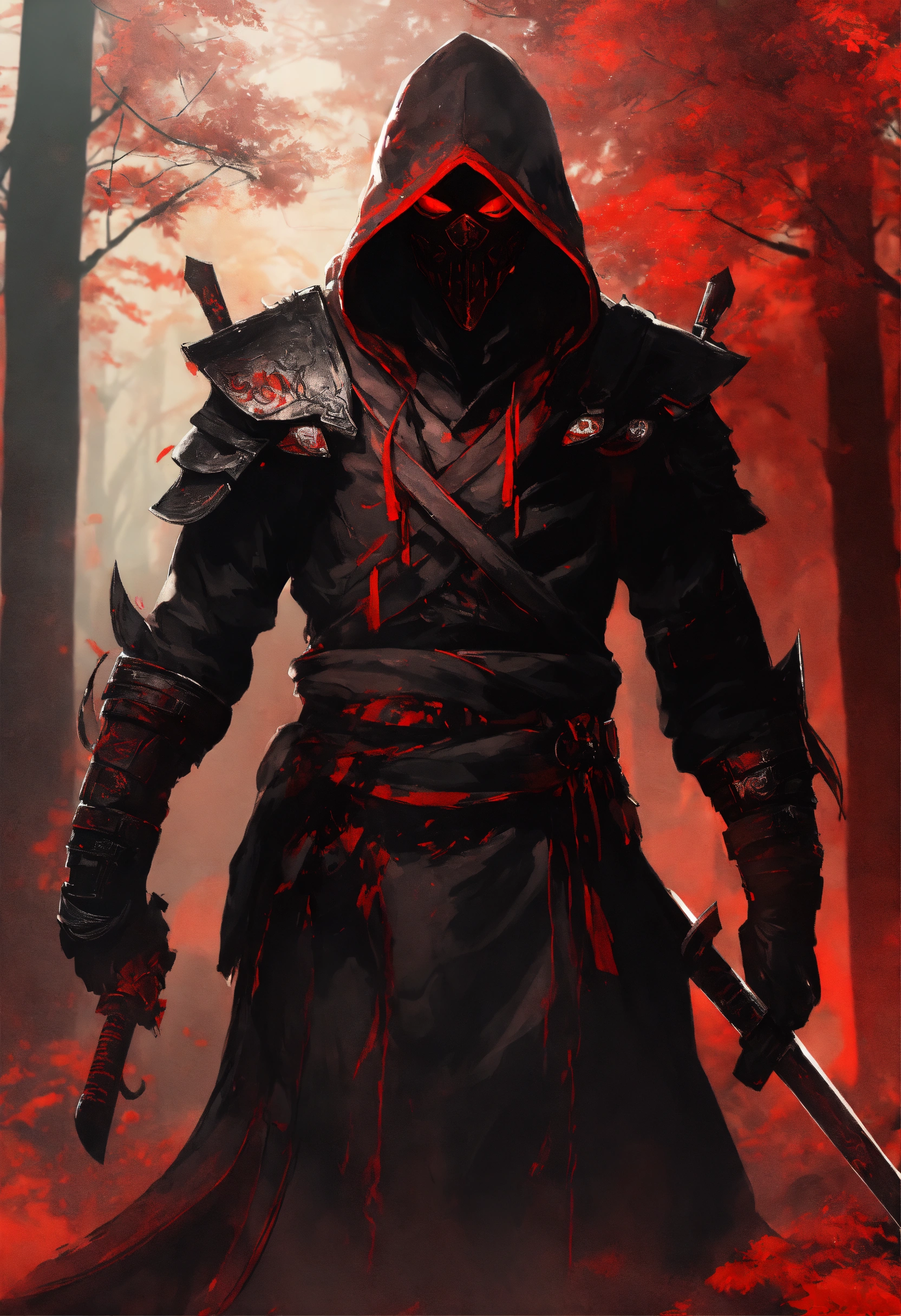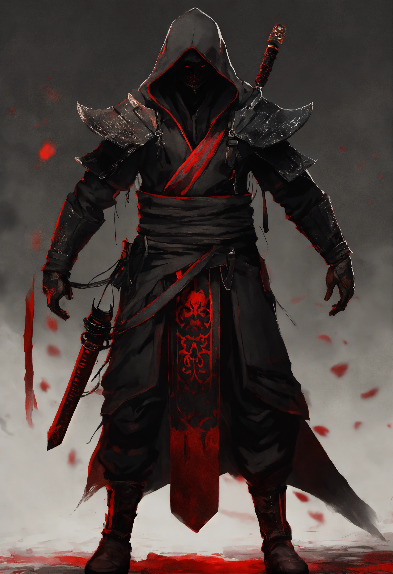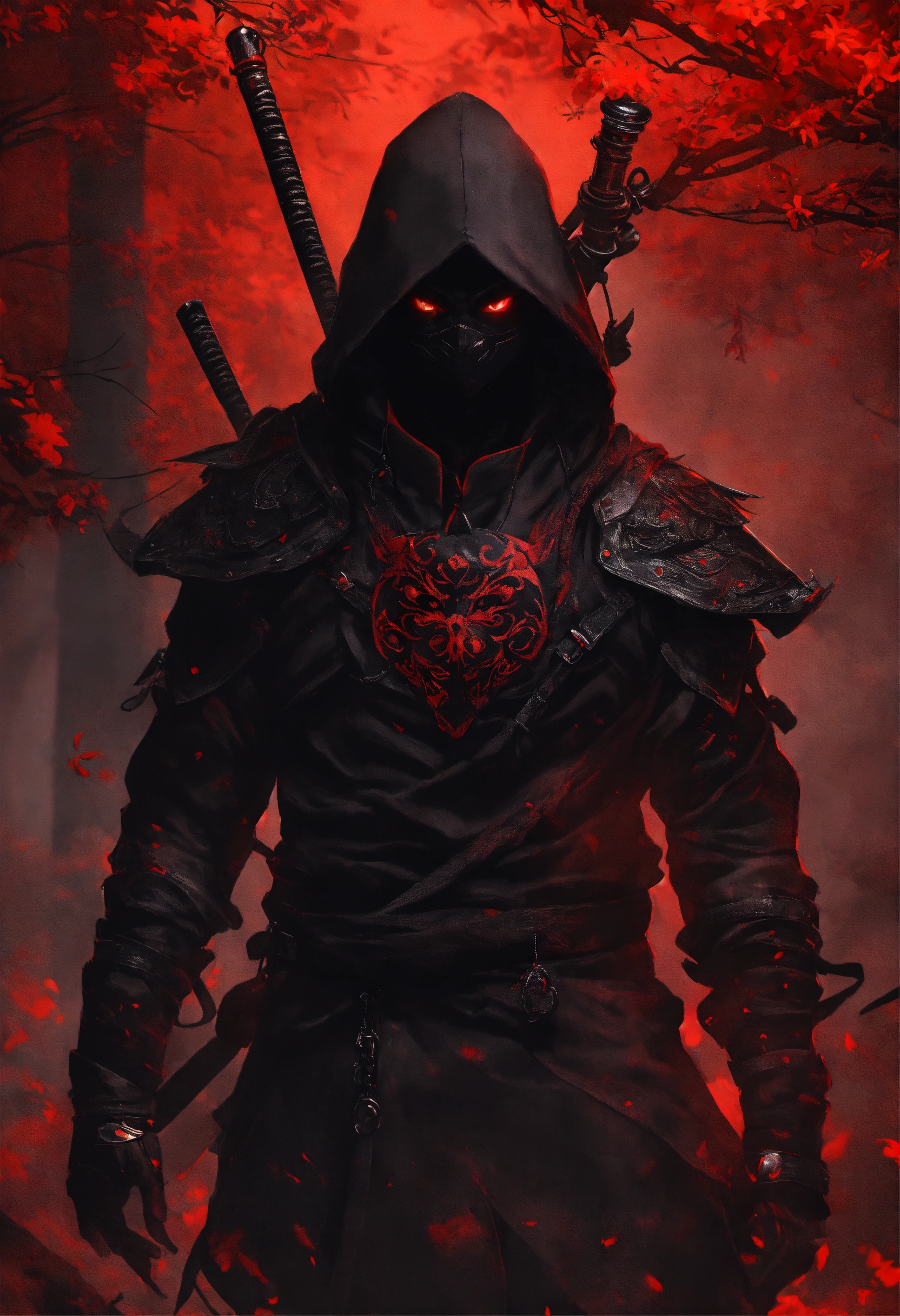 Shadow warrior, hooded, black clothes with red accents, character's eyes will be red. a mask where it will cover your face, it will be macabre. he be full body