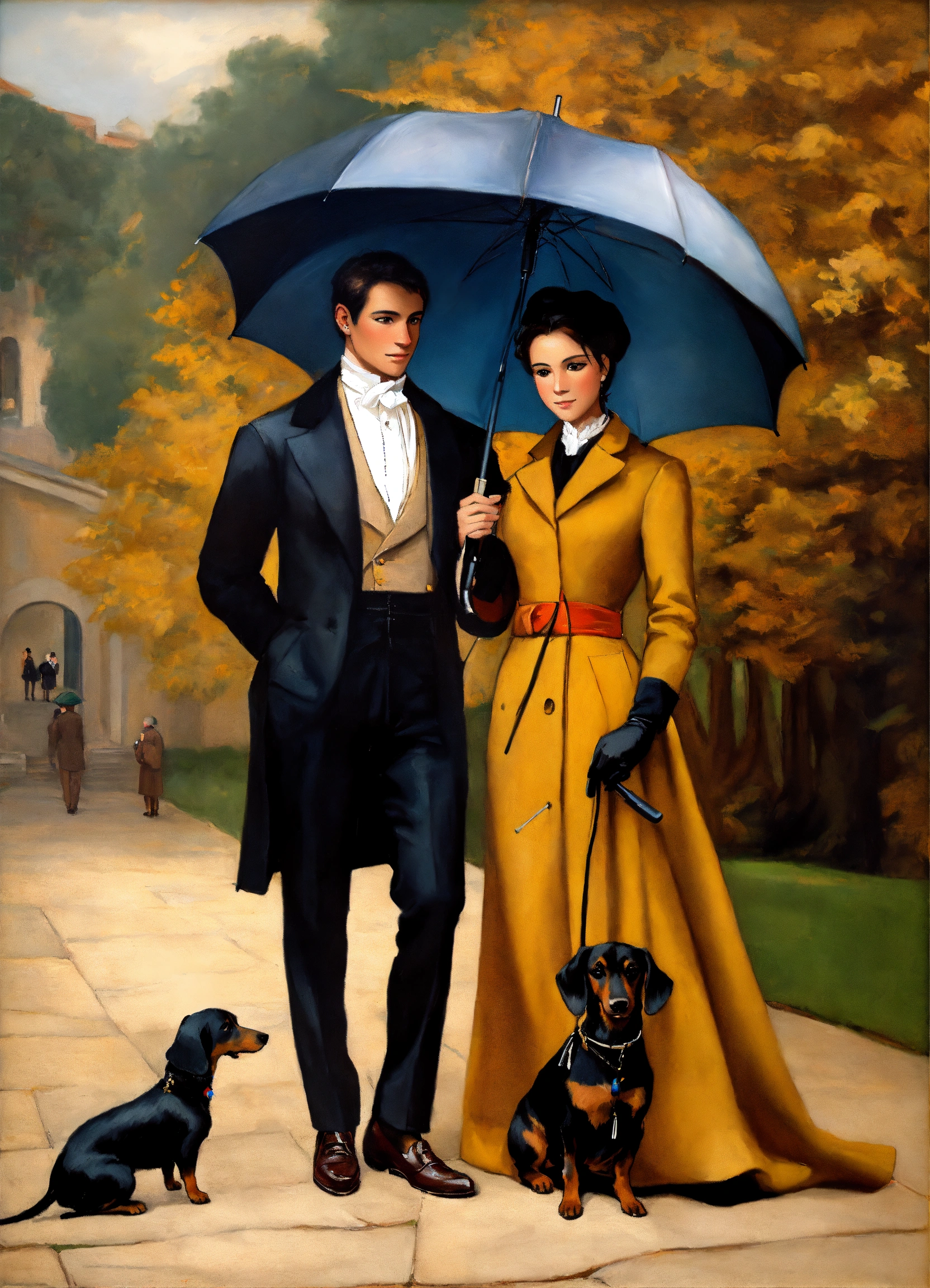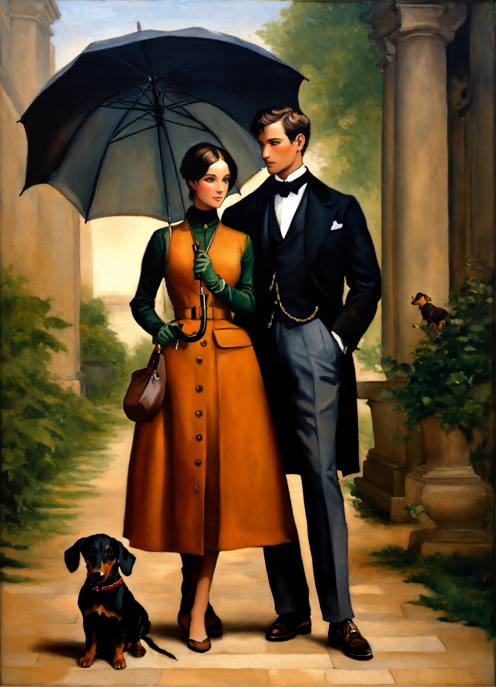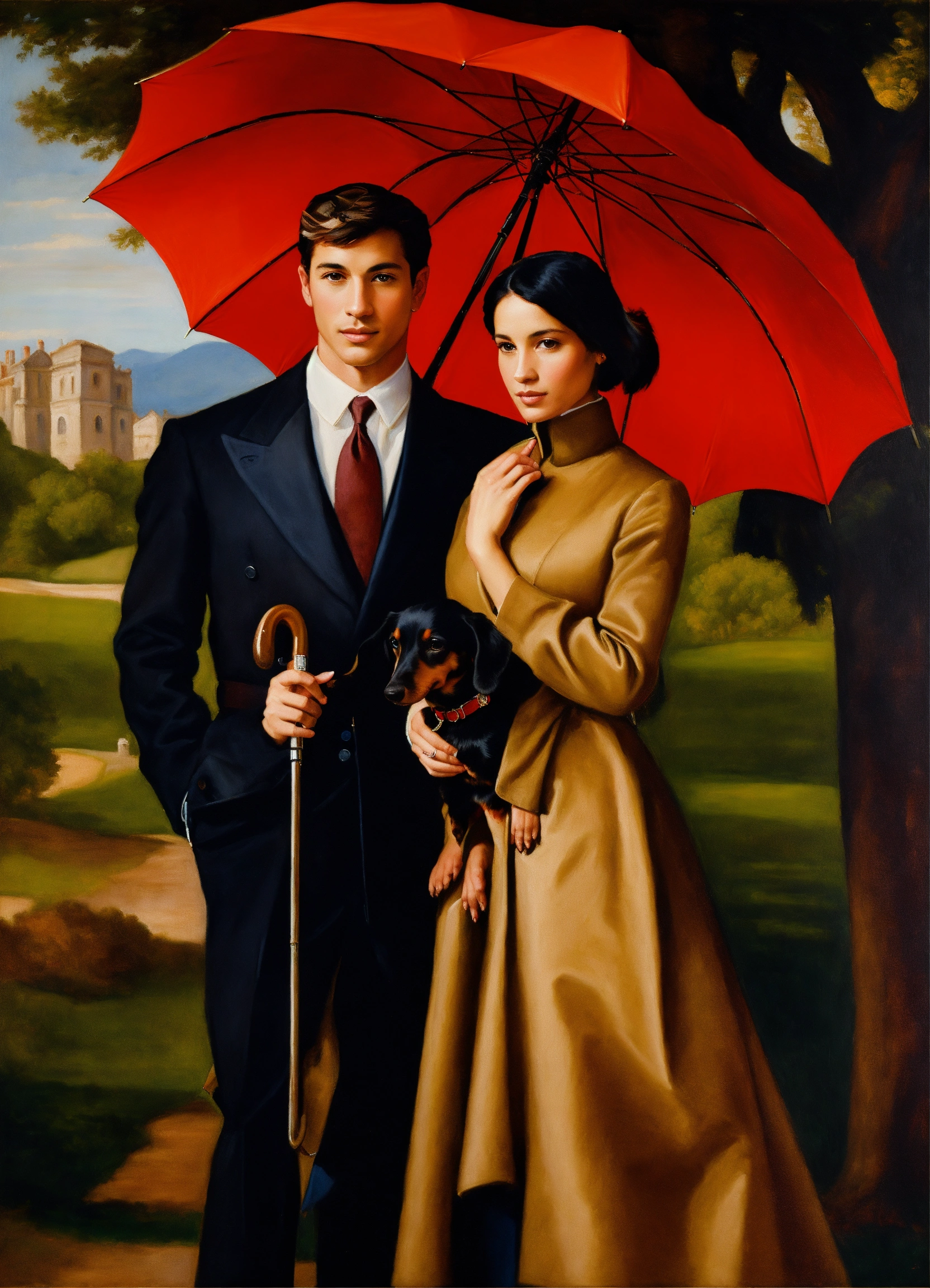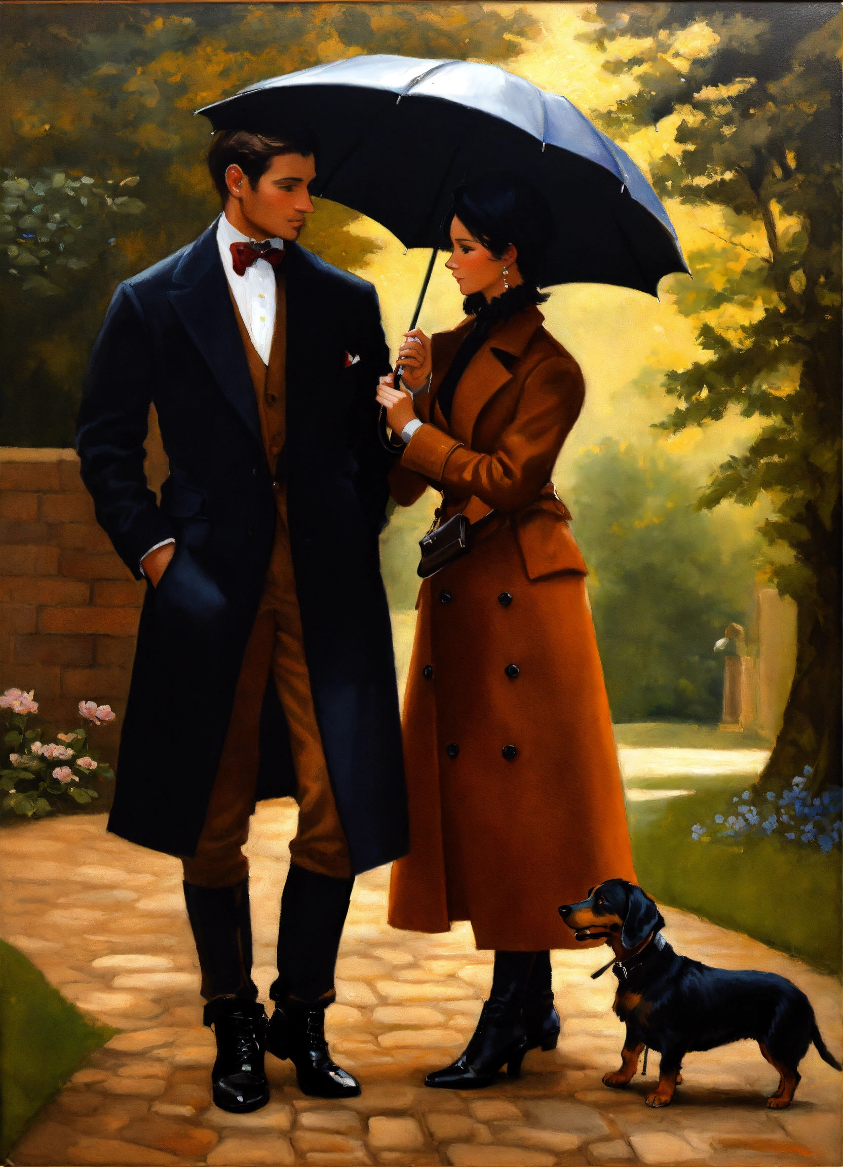 Oil painting of a romantic husband and wife, wearing ralph lauren attire, with an umbrella and a black mini dachshund, art by michelangelo