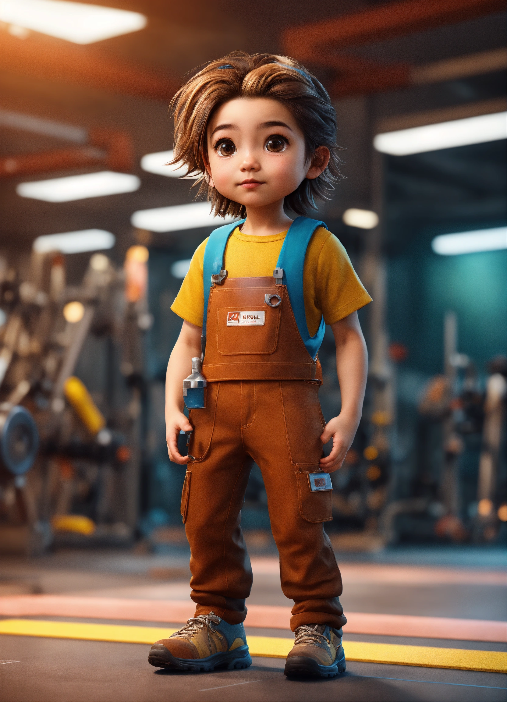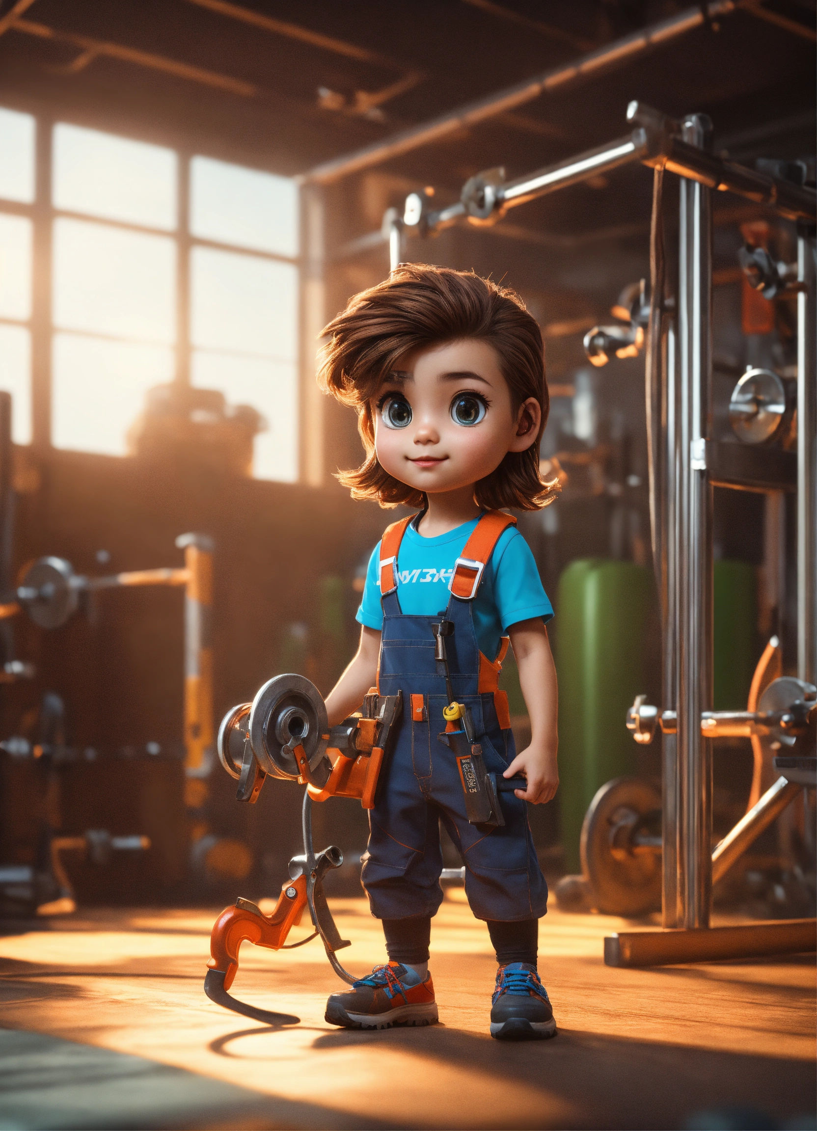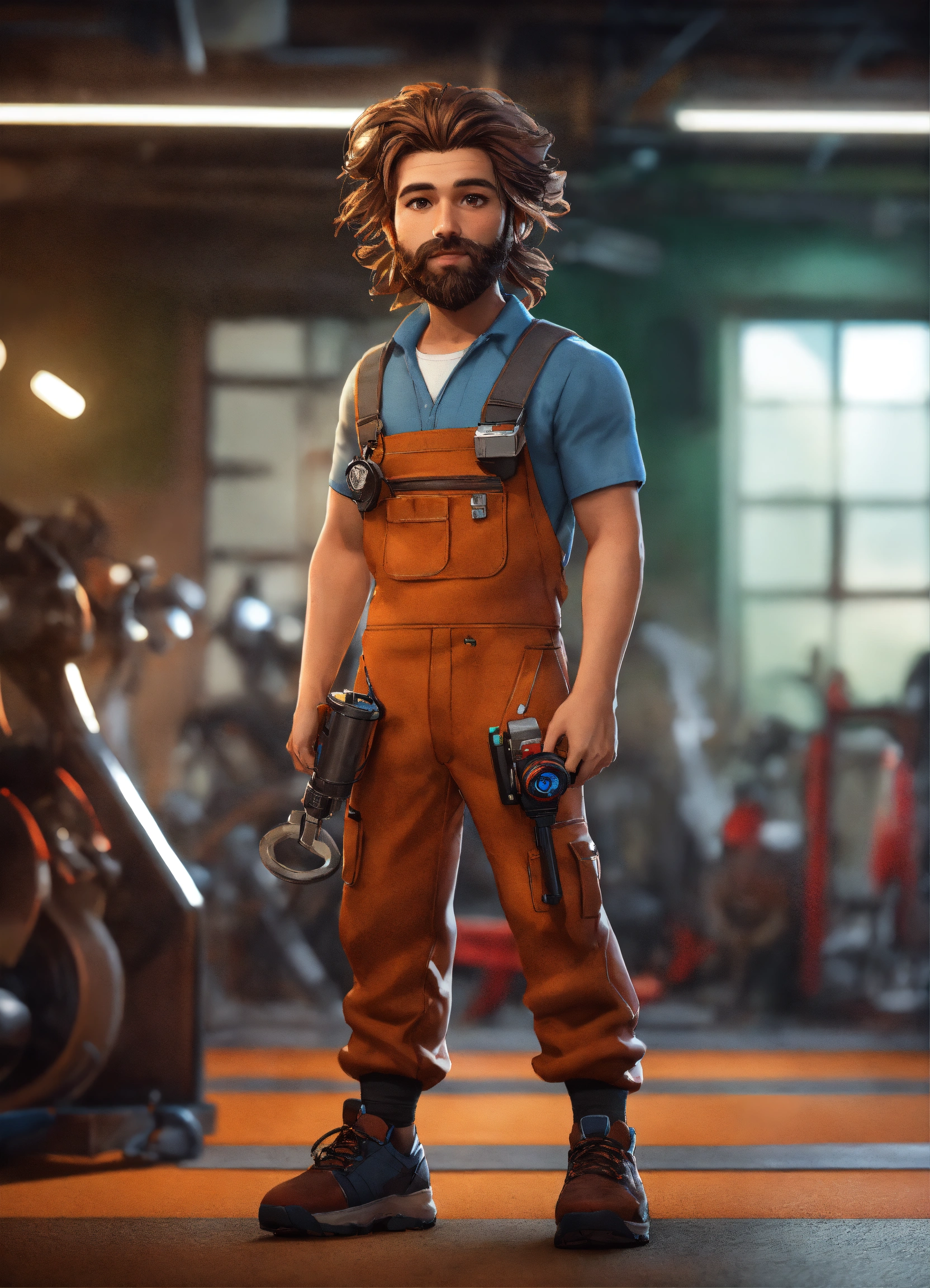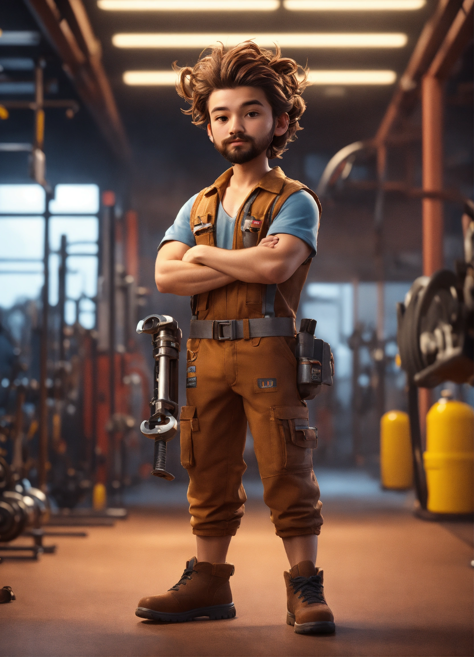 Full-body 4d photographic image dressed as a mechanic, holding a wrench, of a cute male chibi boy with very long hair, a bun, and a beard, brown hair color, realistic and vivid colors, rendered in octane, standing out on artstation, artistic photography, hyperrealistic concept art, soft, natural, and perfect volumetric cinematic light, in ultra-high definition (uhd) with a background in a gym